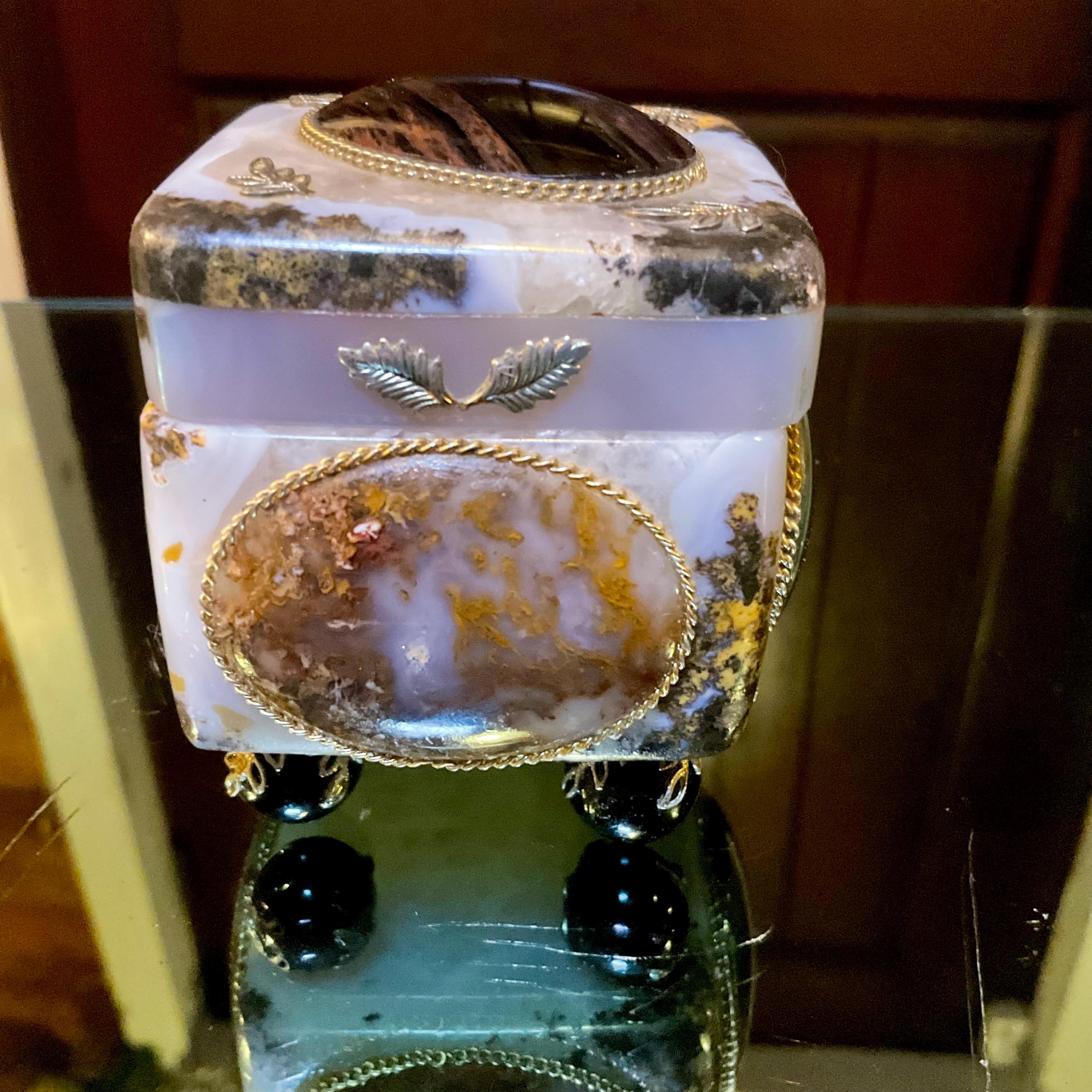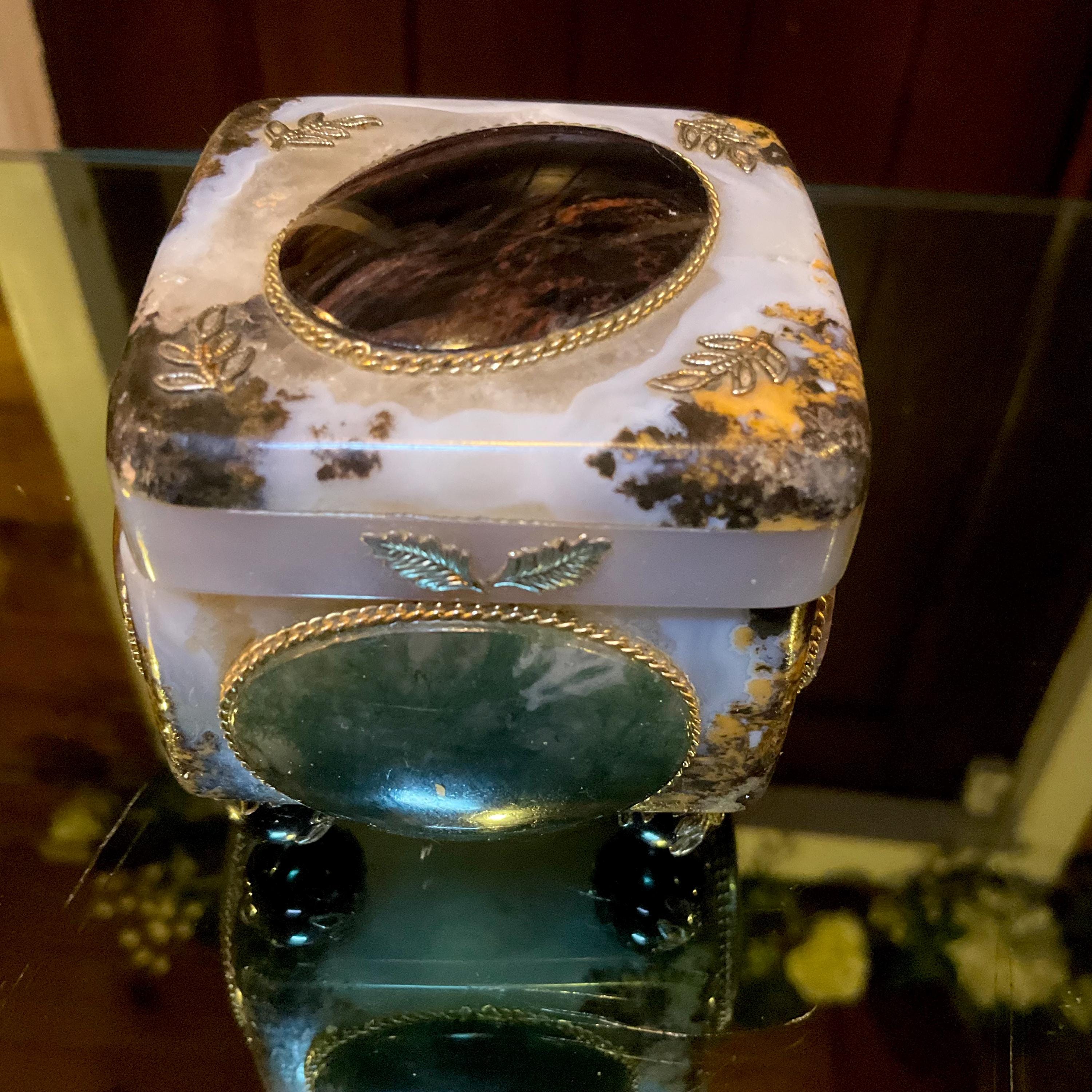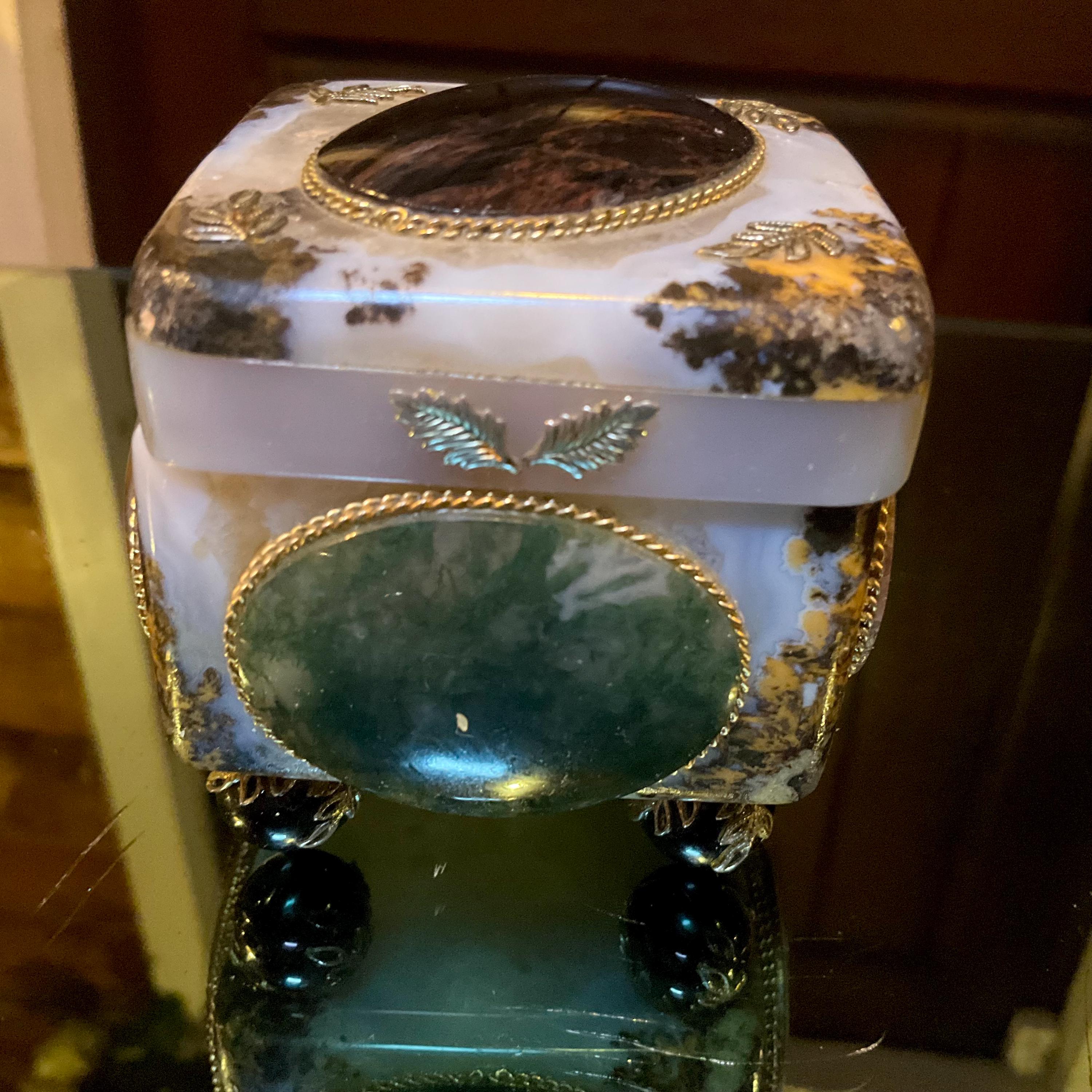 The Vintage French 19th Century Dendritic Jasper Jewelry Box weighs, 13 ounces and it is beautifully hand crafted and has five Agate gilded Cabochon ovals exquisitely displayed on all four sides with one mounted on the top.