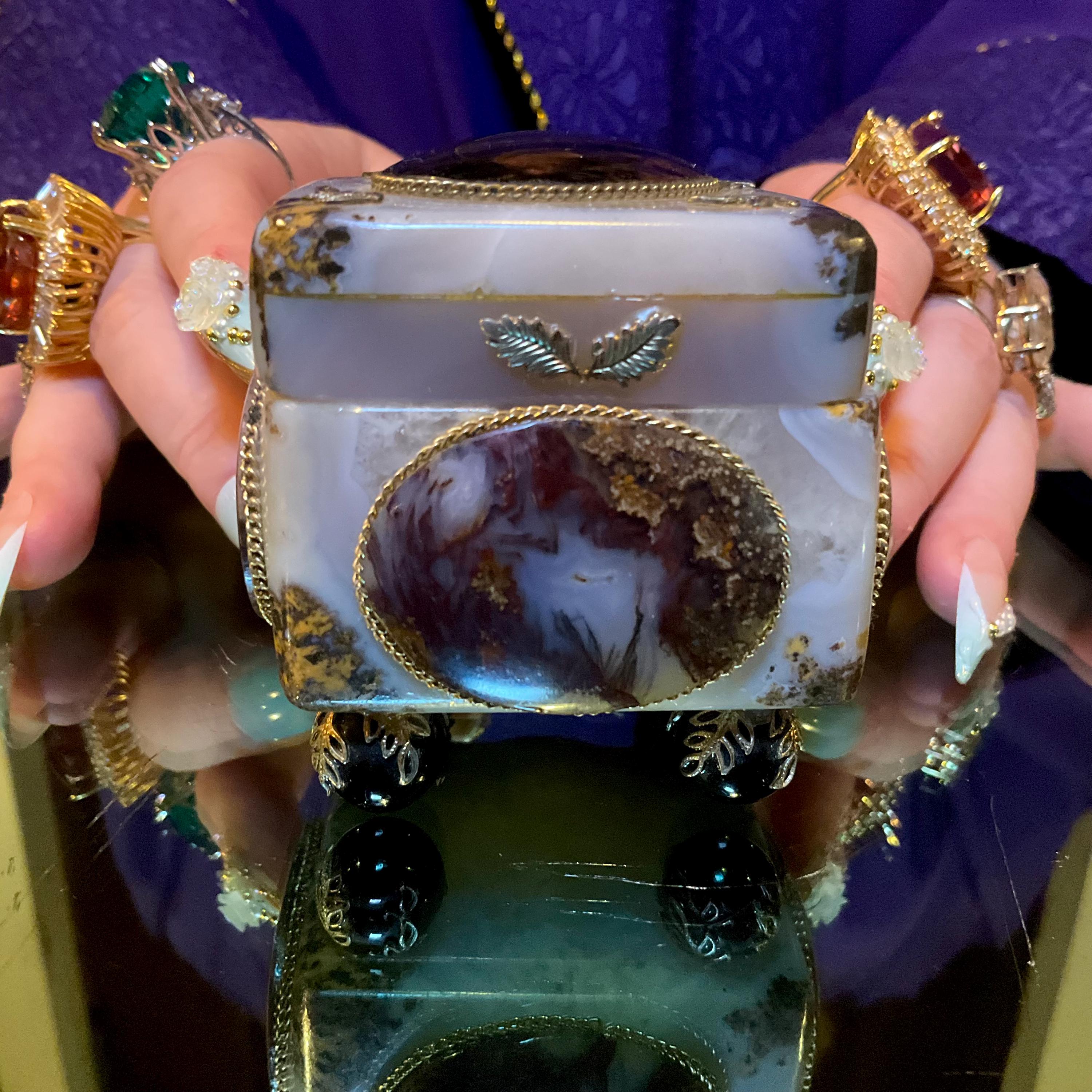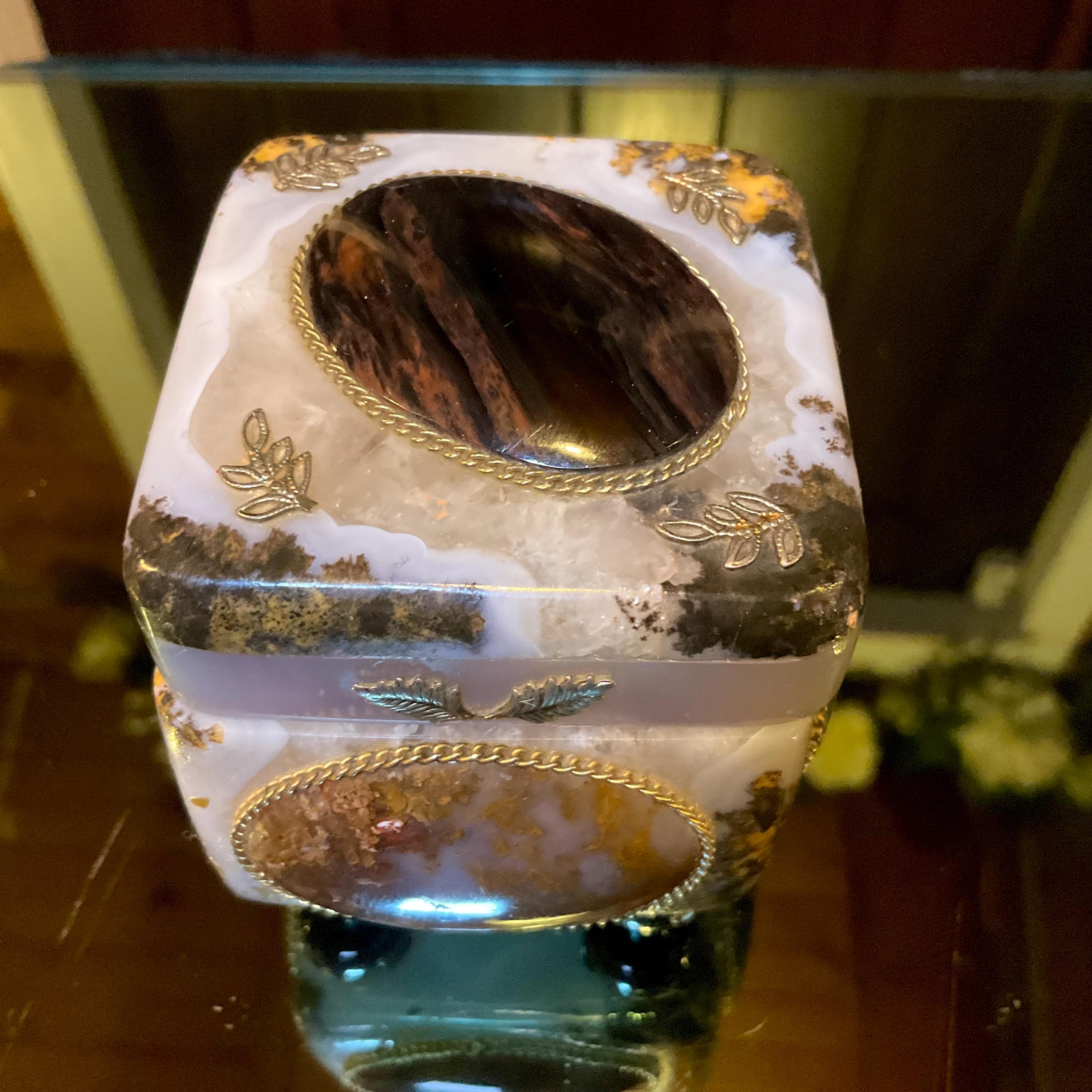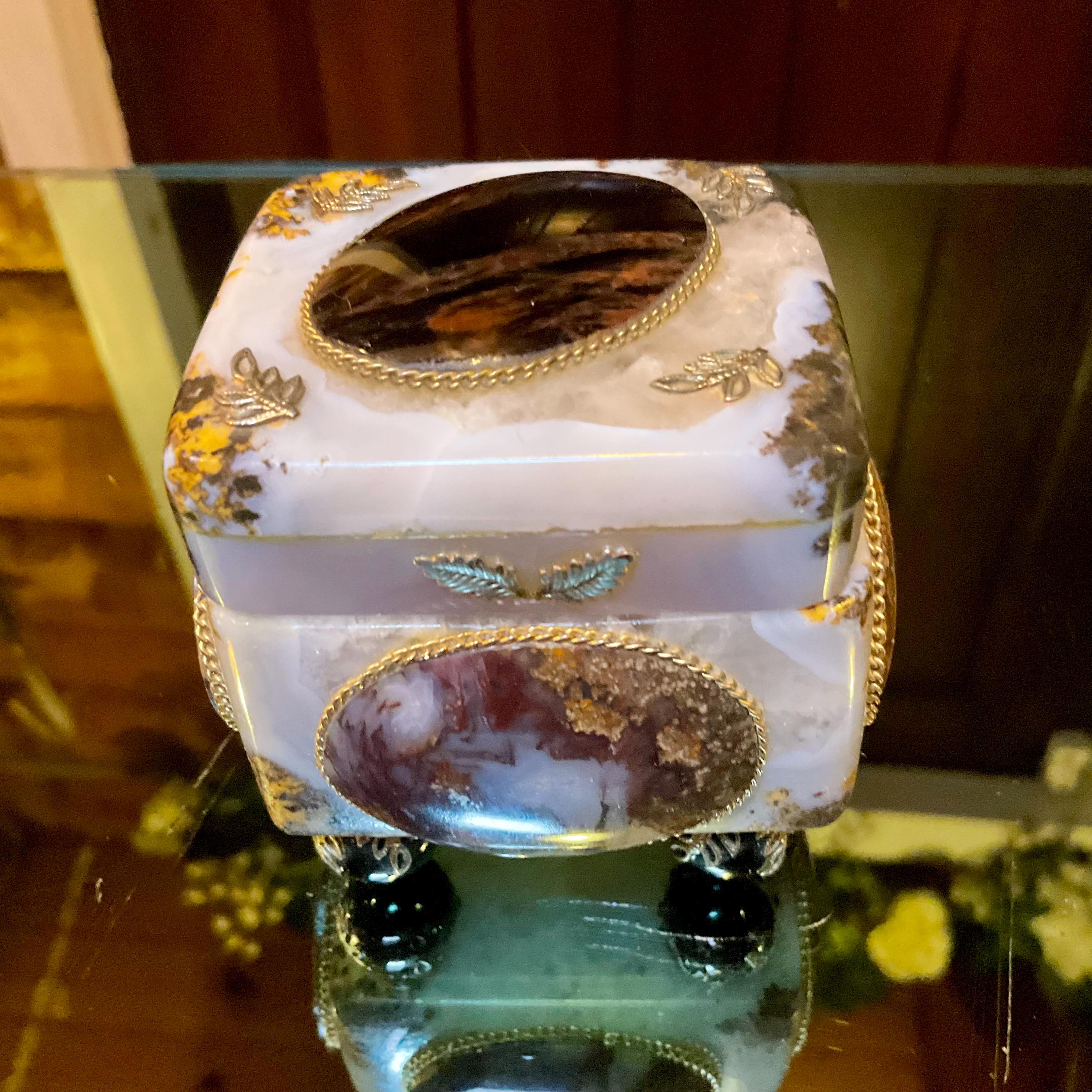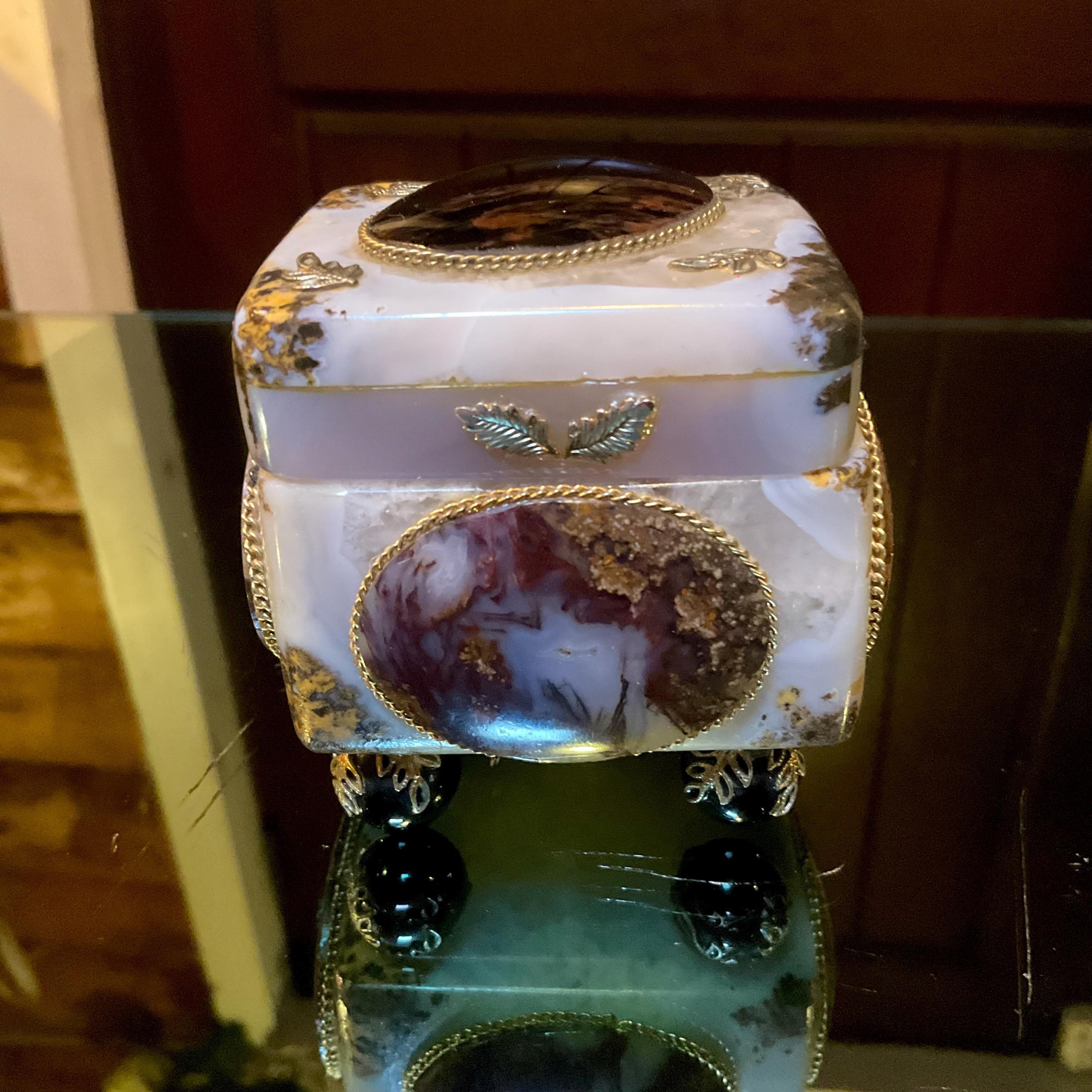 The Vintage French 19th Century Dendritic Jasper Jewelry Box weighs, 13 ounces and it is beautifully hand crafted and has five Agate gilded Cabochon ovals exquisitely displayed on all four sides with one mounted on the top.