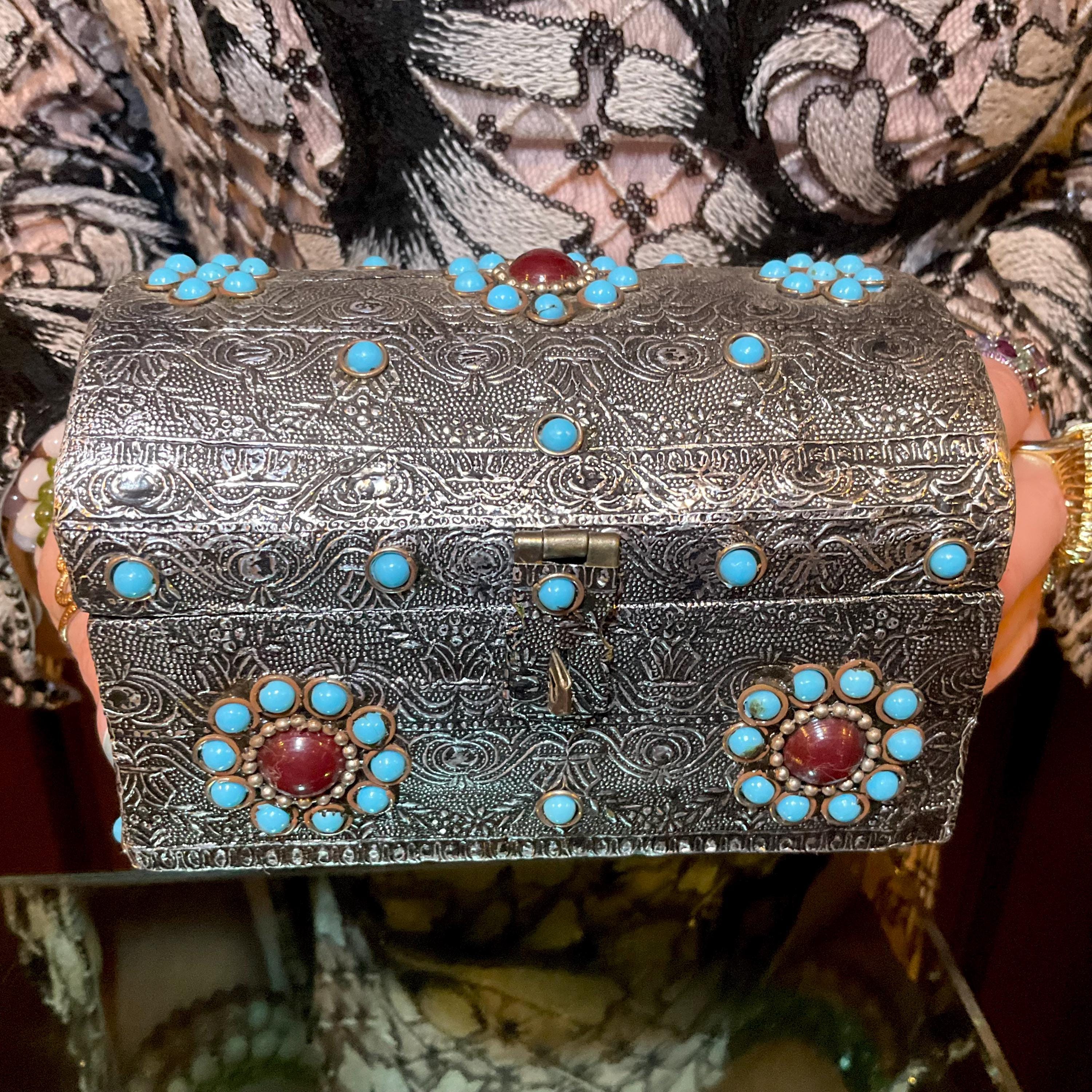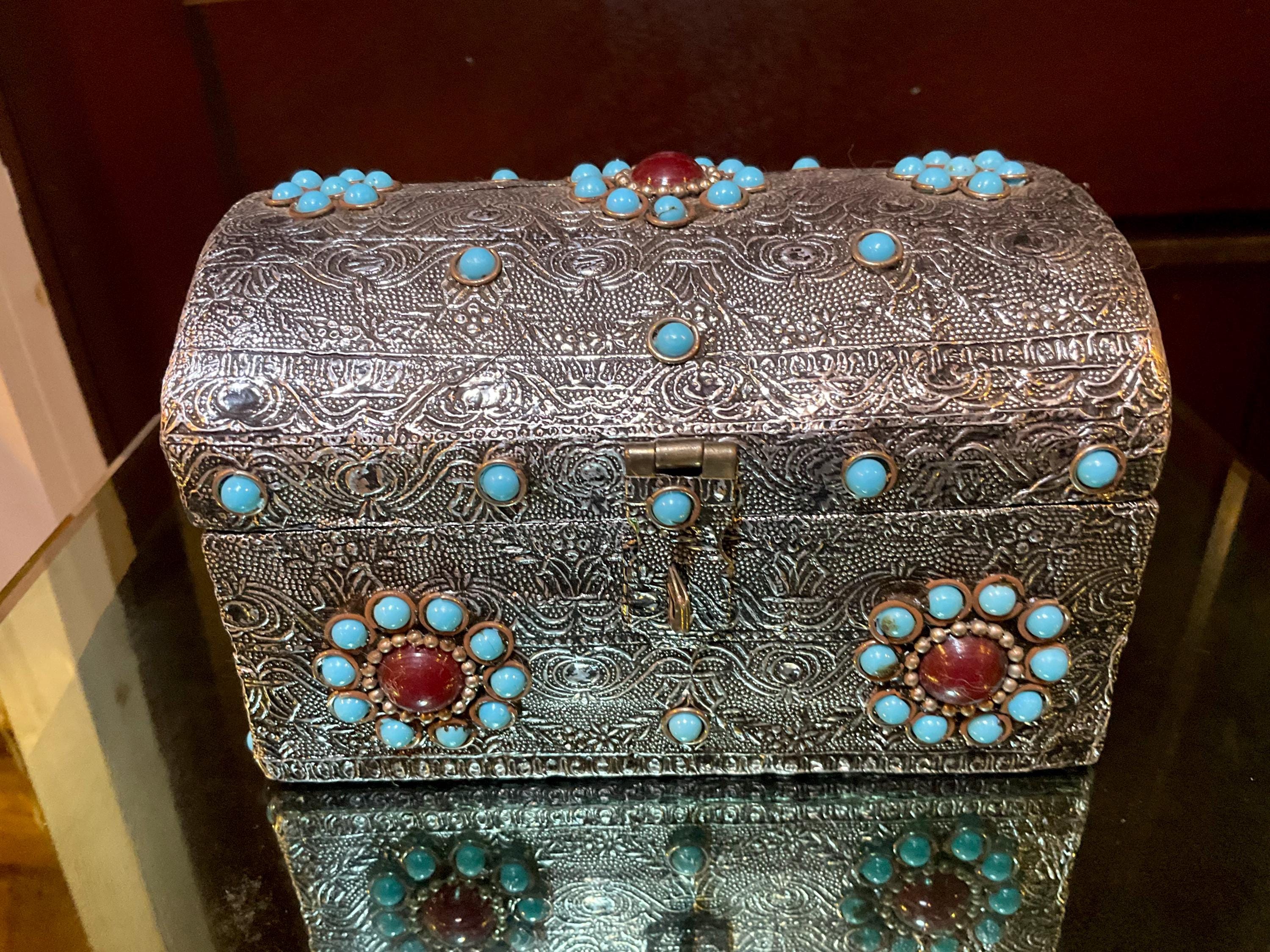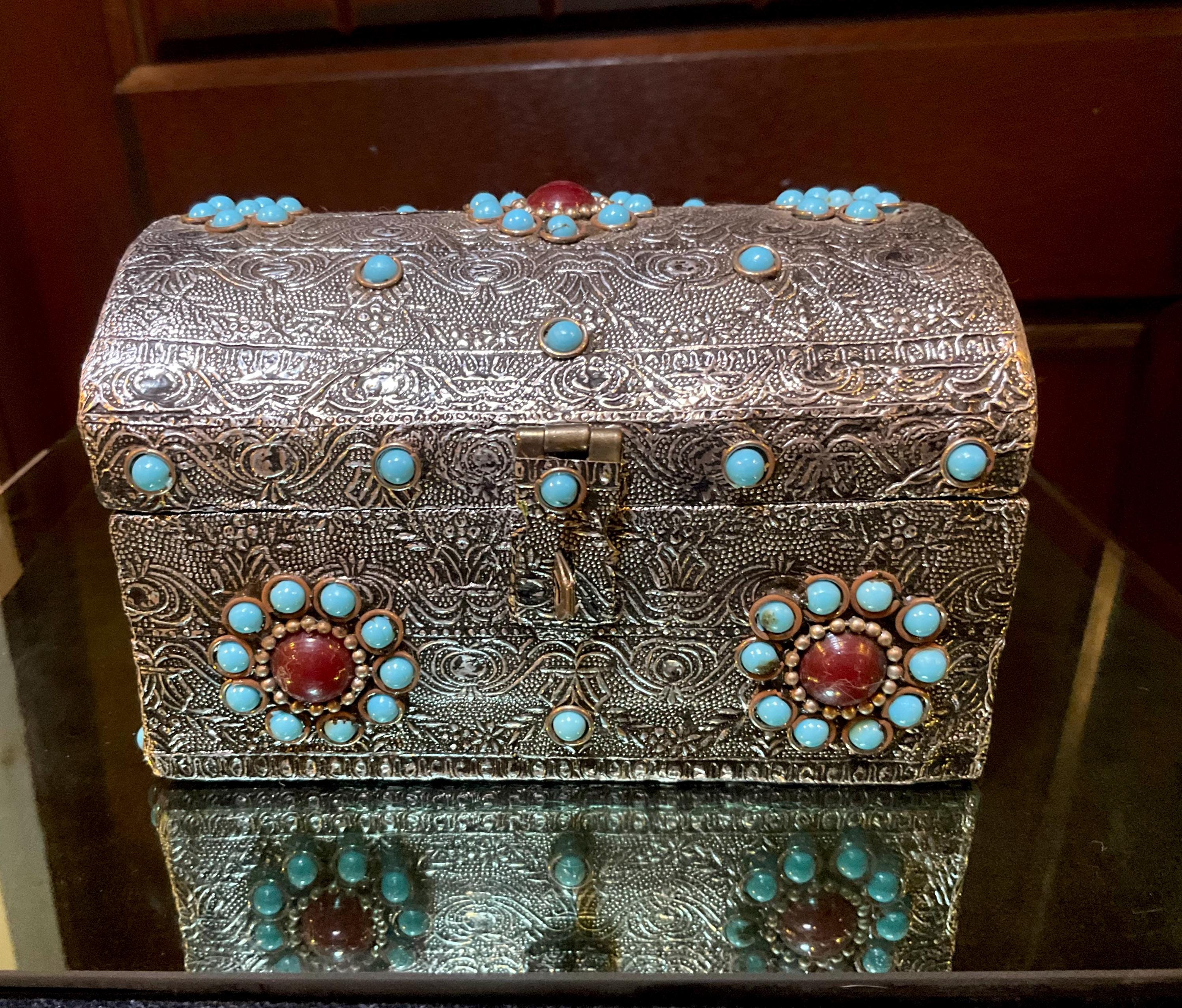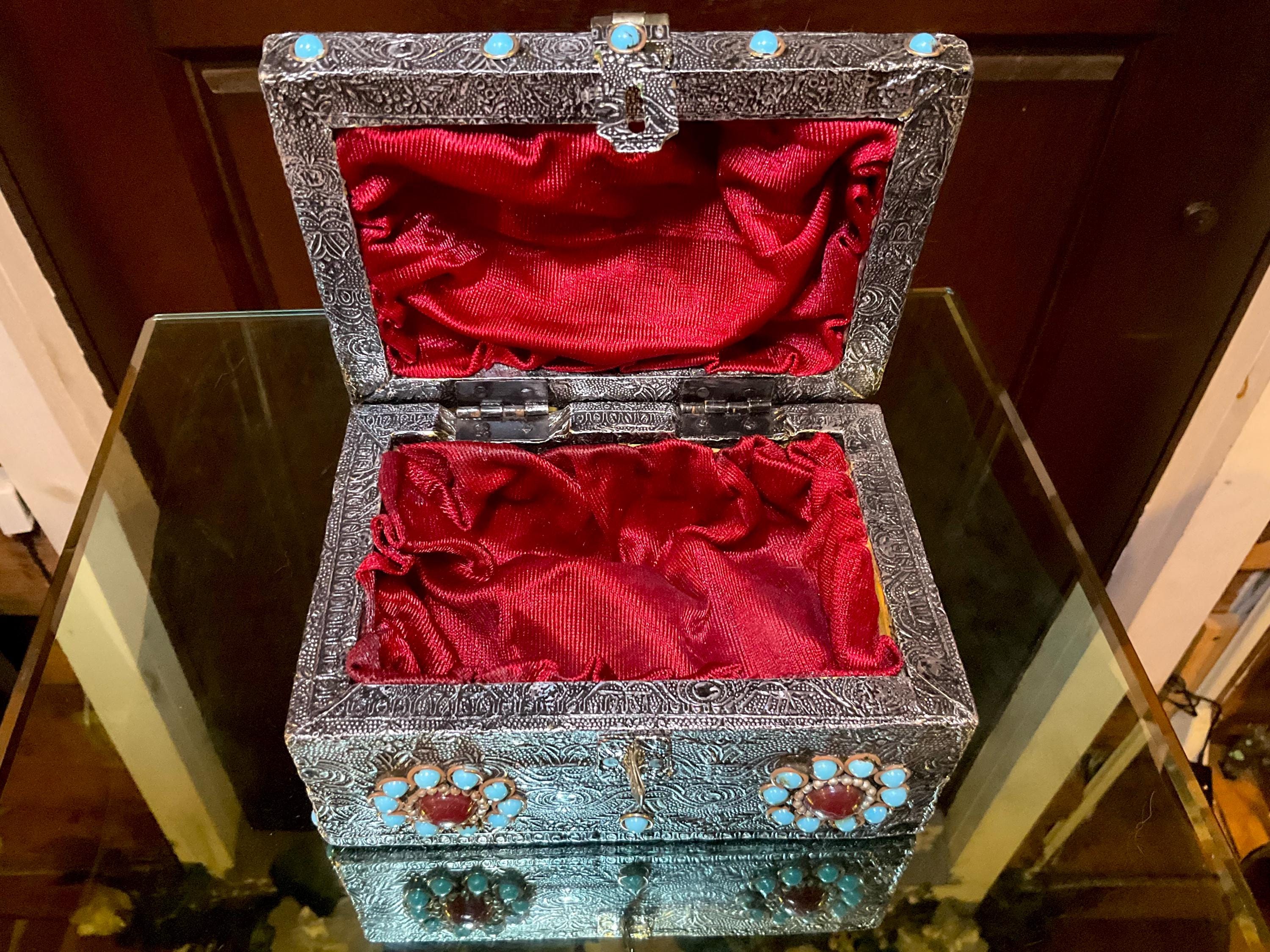 This jewelry box was purchased from a family collection, and you can imagine how rare it is to get a Tibetan Nepalese jewelry box handmade with a hinged lid and opens like a true treasure chest making this a true treasure.