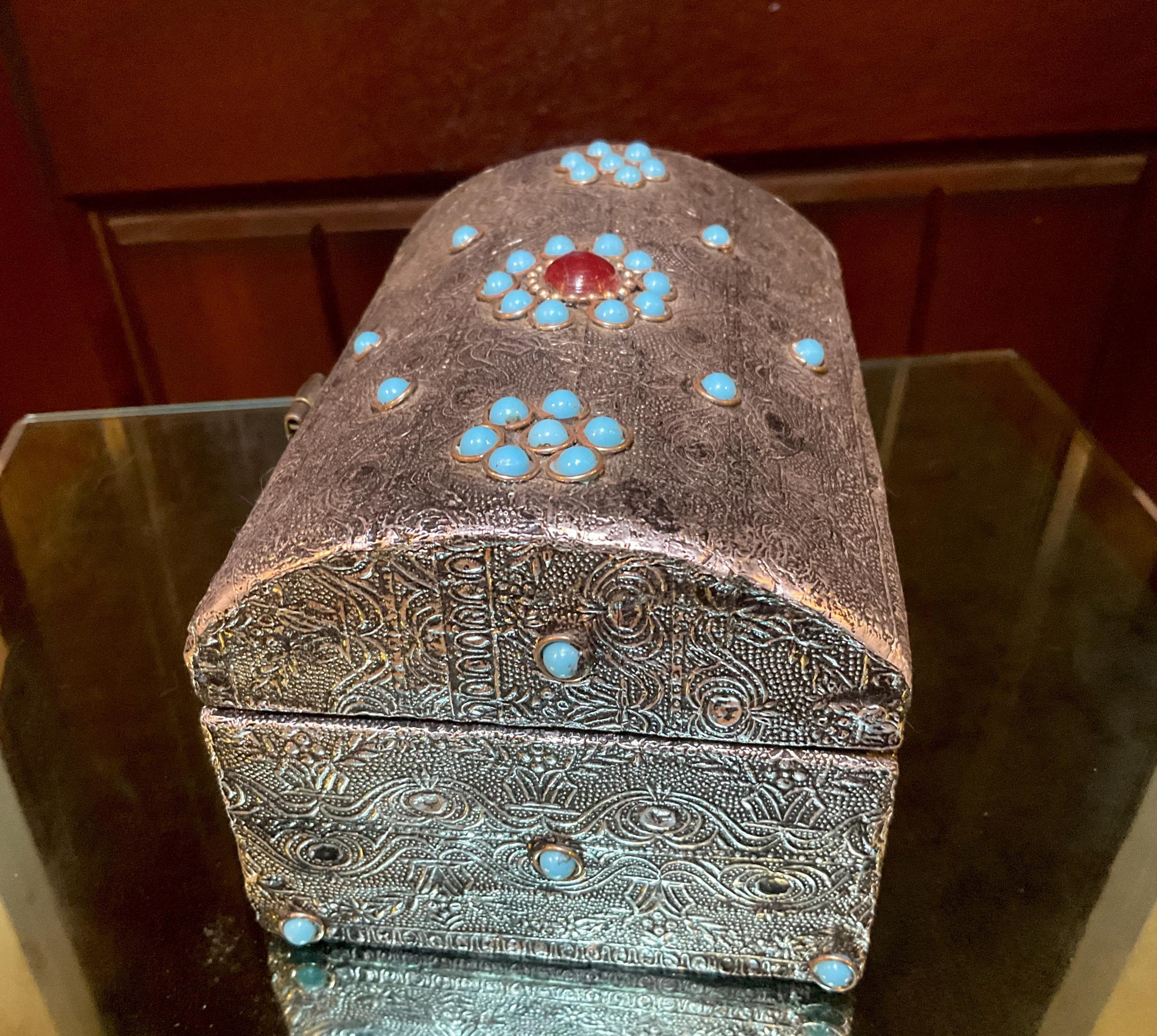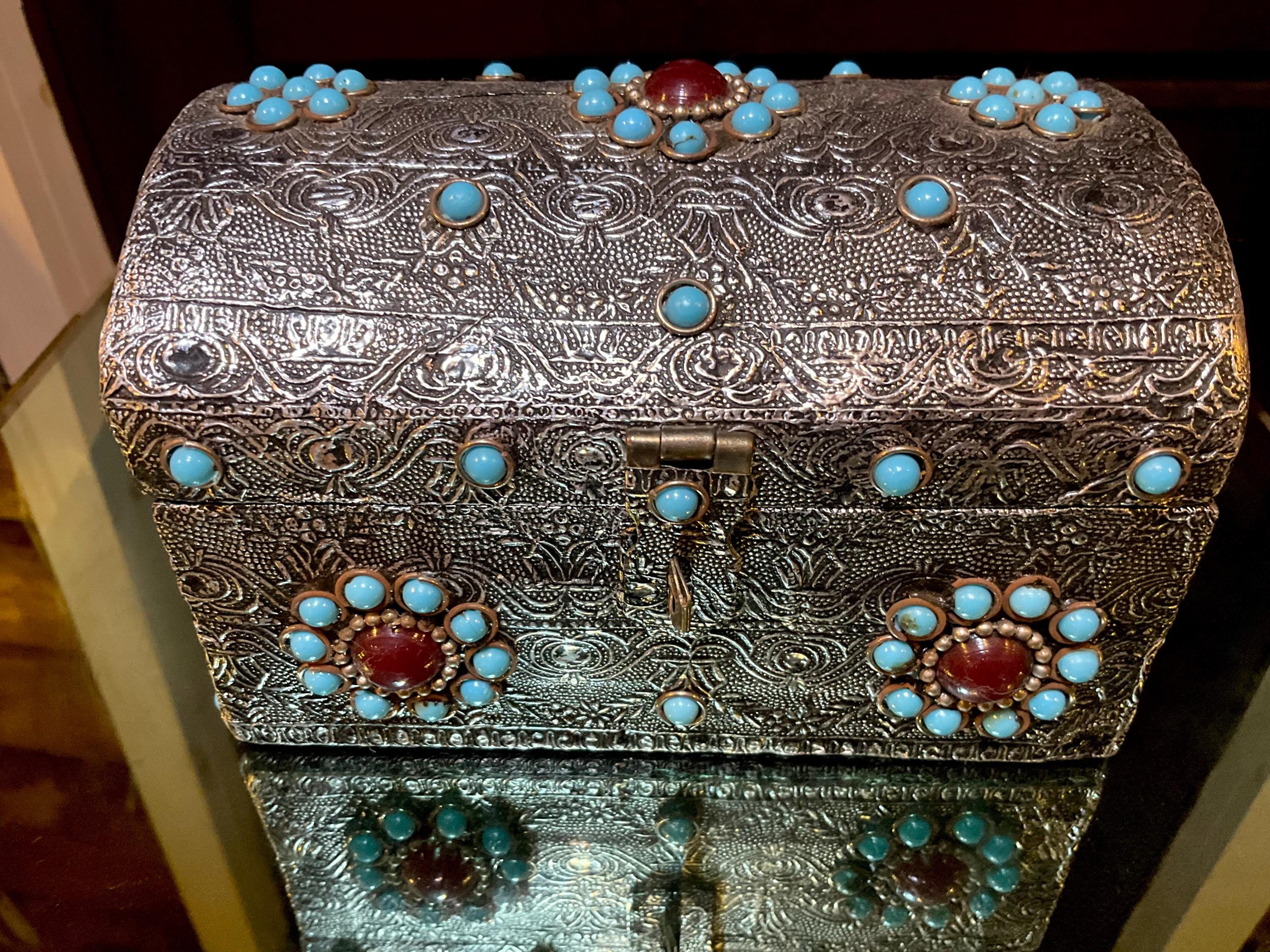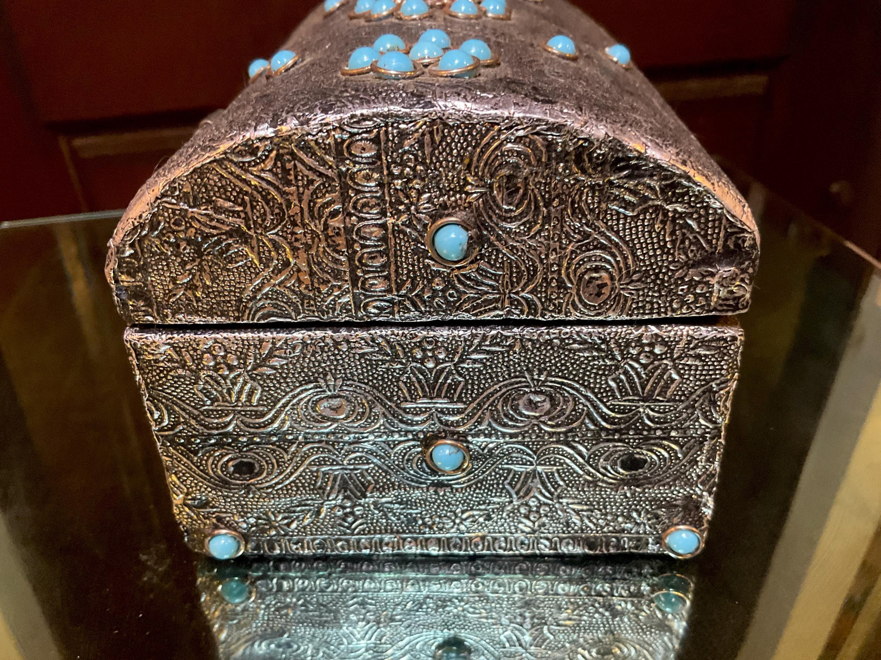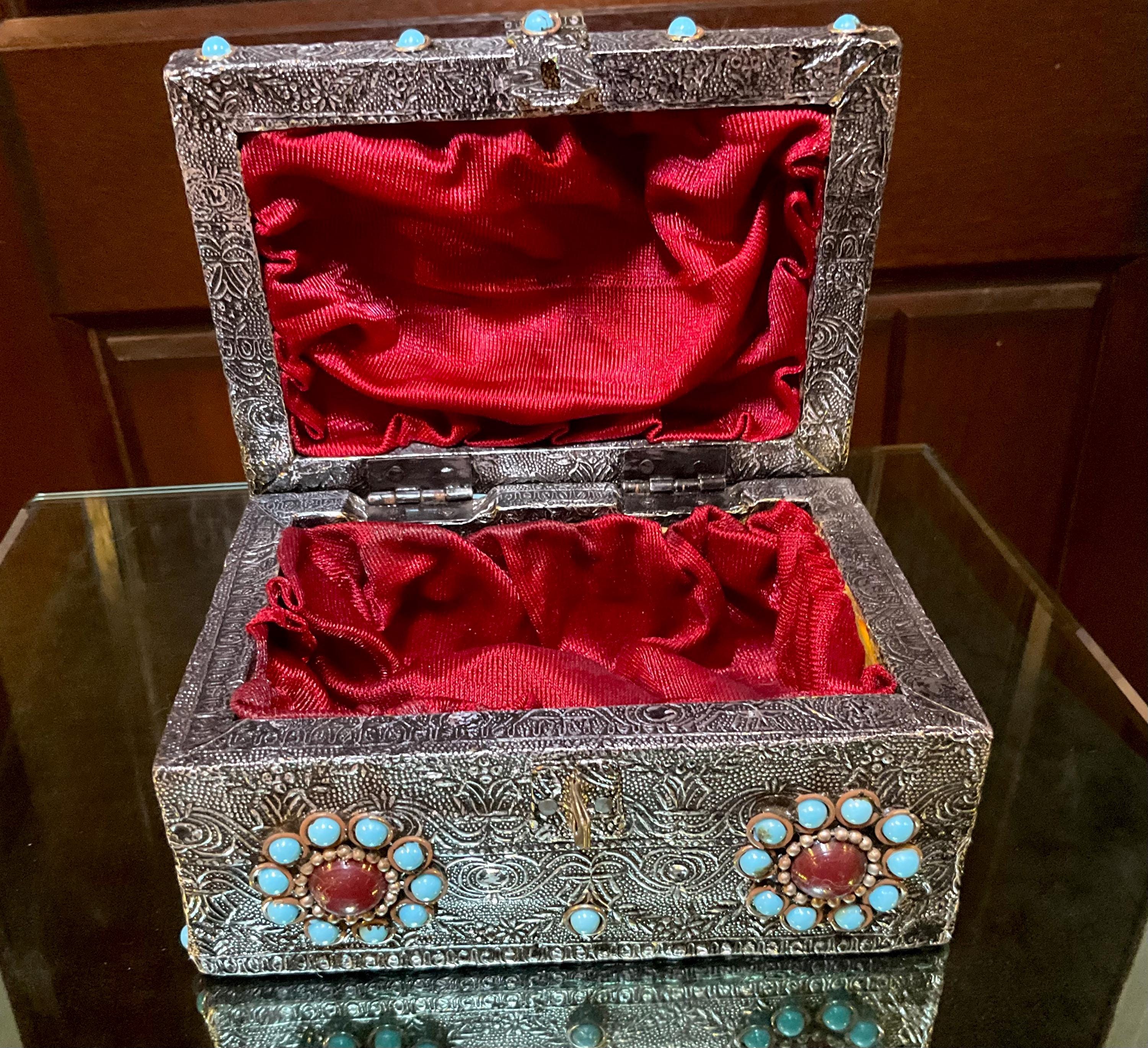 This jewelry box was purchased from a family collection, and you can imagine how rare it is to get a Tibetan Nepalese jewelry box handmade with a hinged lid and opens like a true treasure chest making this a true treasure.