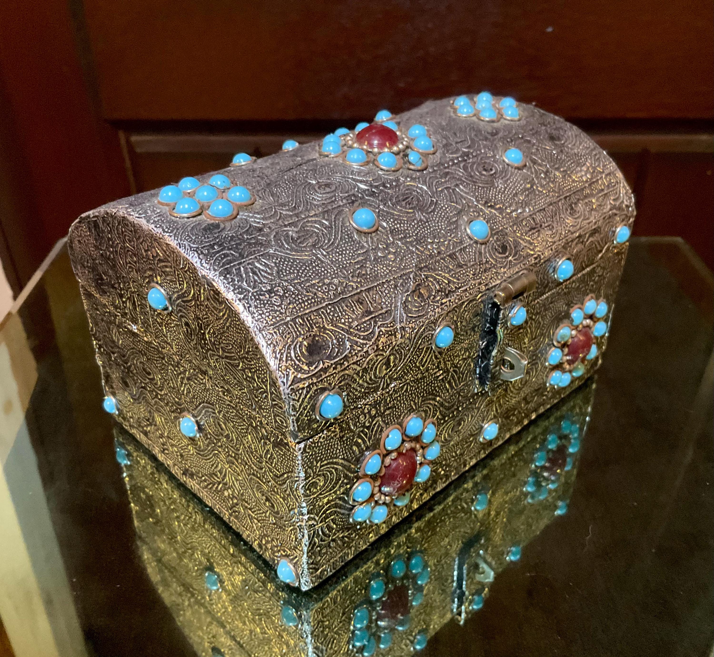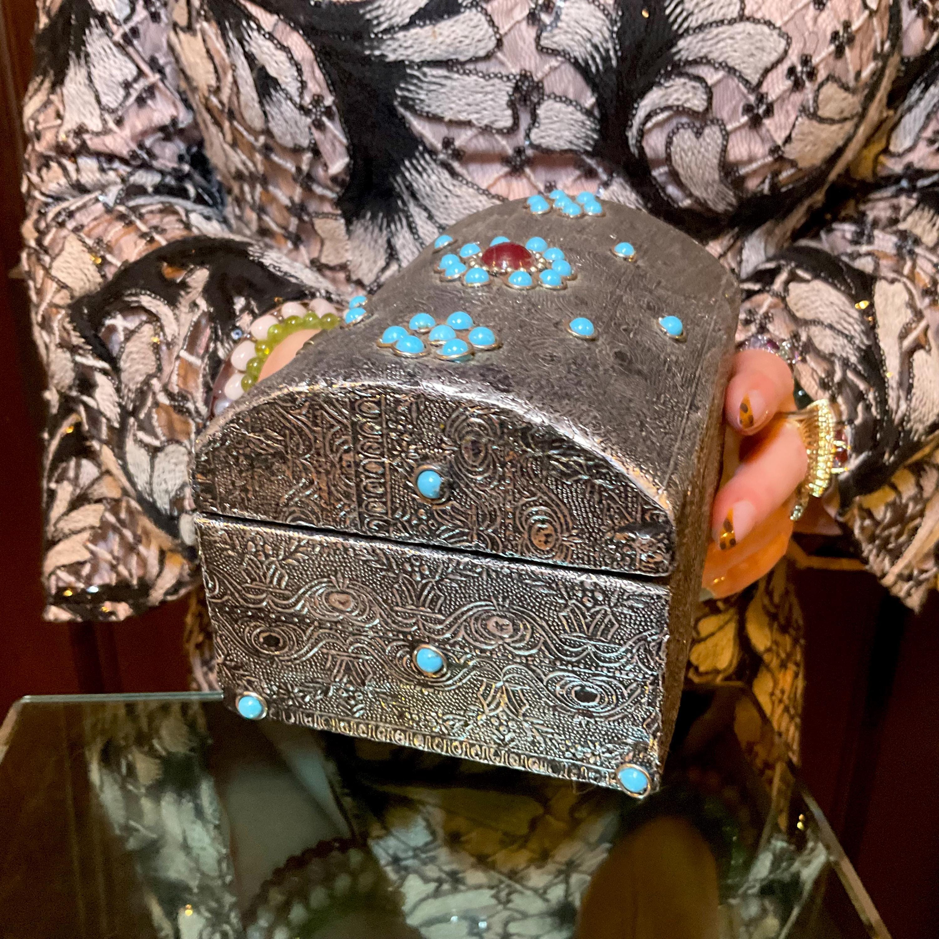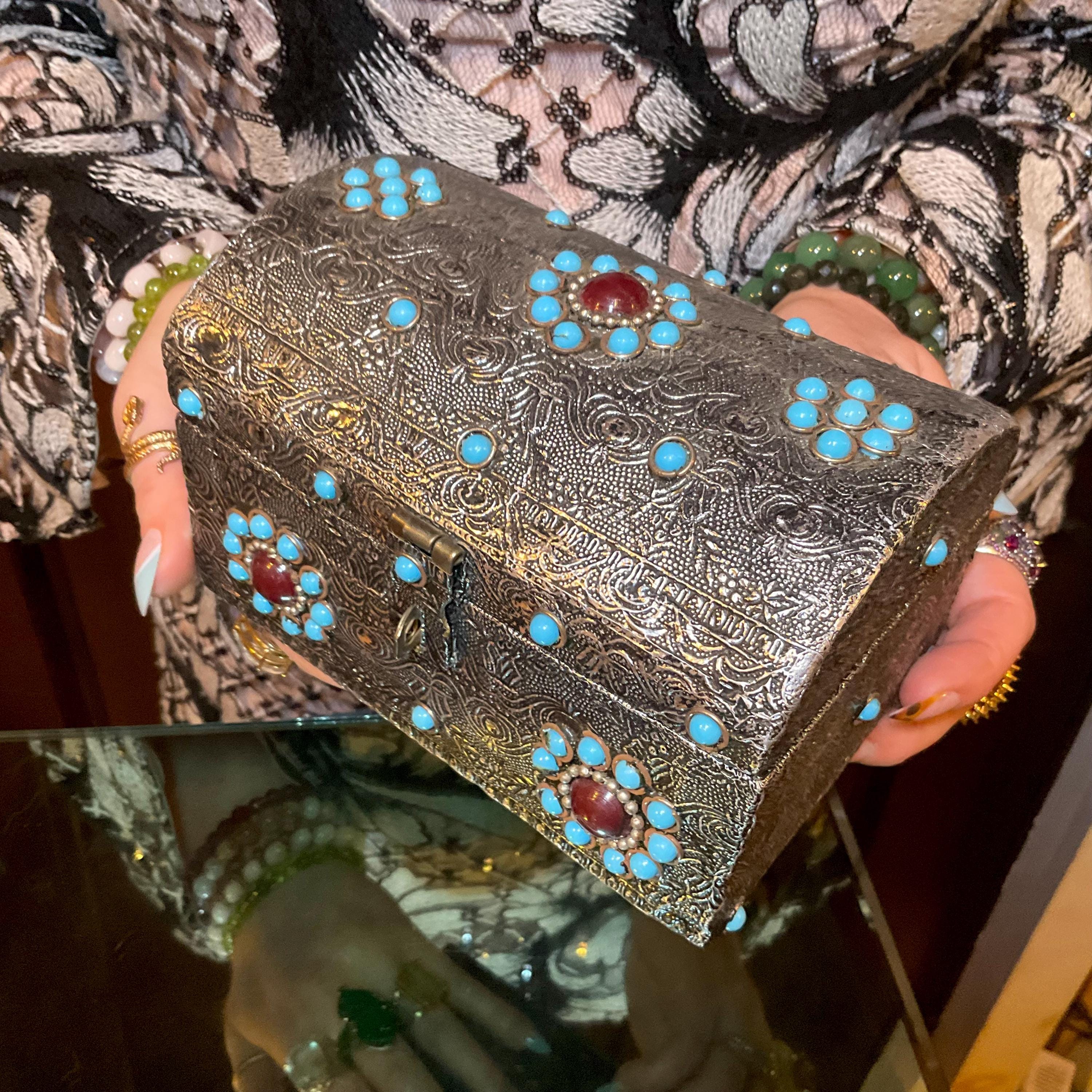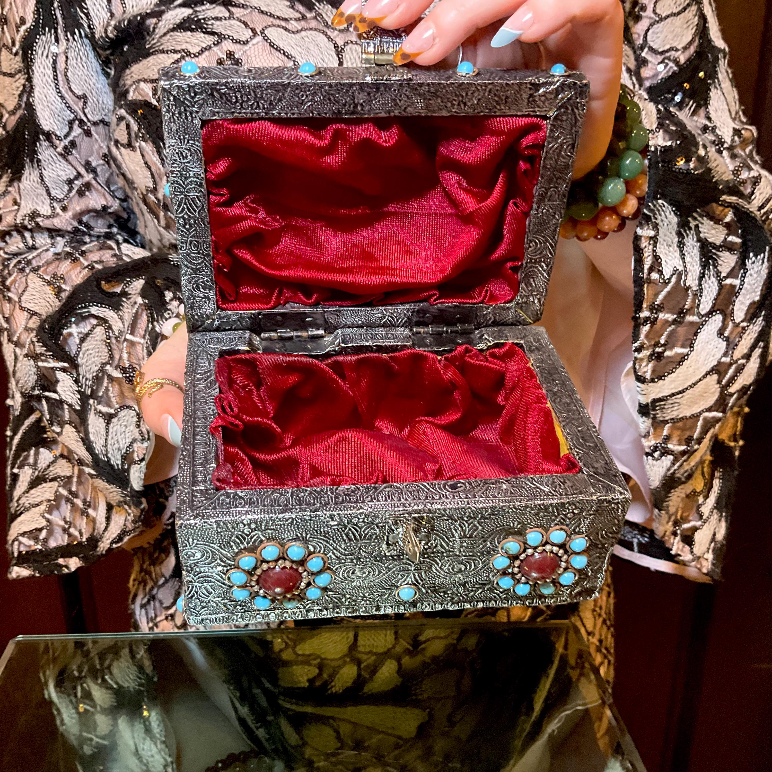 This jewelry box was purchased from a family collection, and you can imagine how rare it is to get a Tibetan Nepalese jewelry box handmade with a hinged lid and opens like a true treasure chest making this a true treasure.