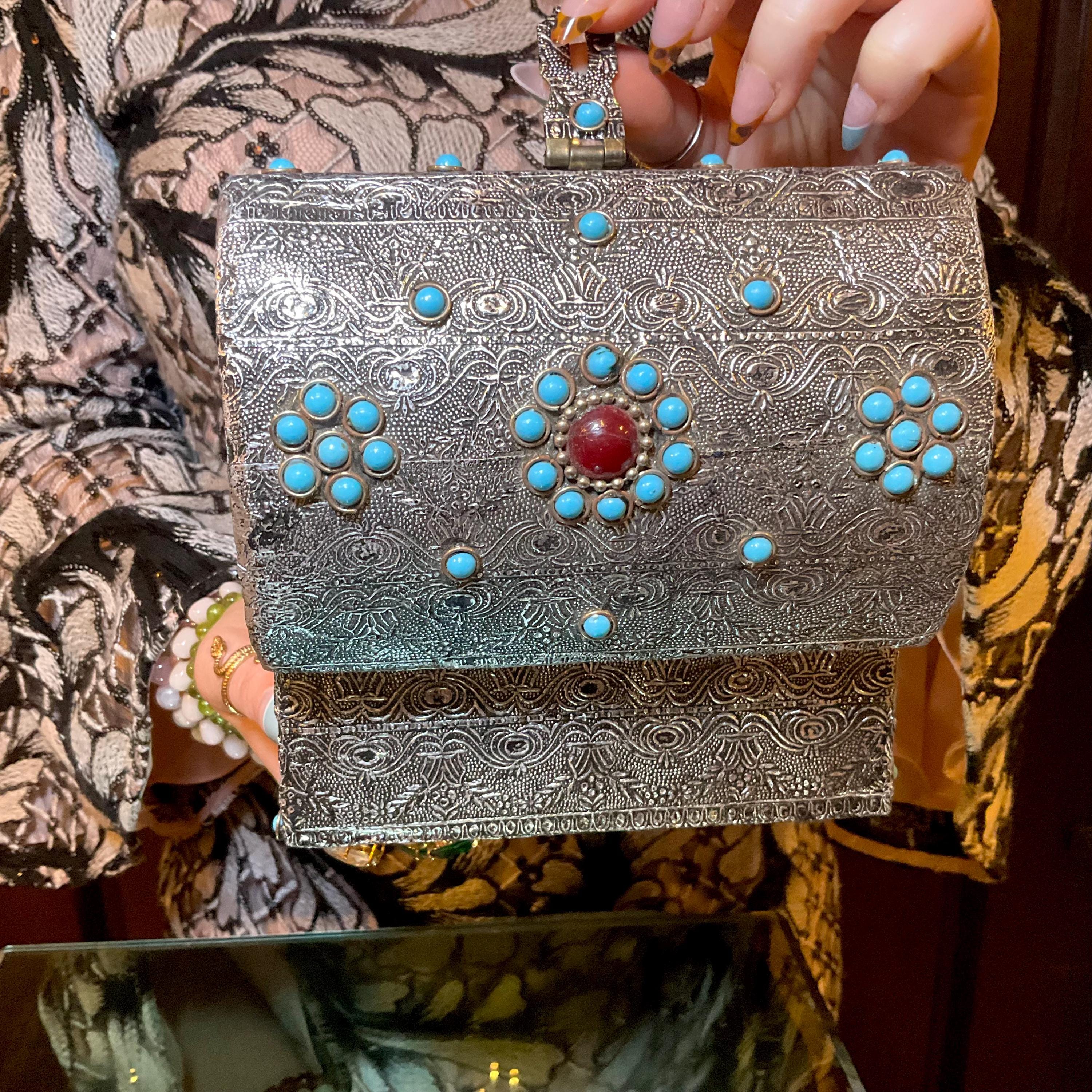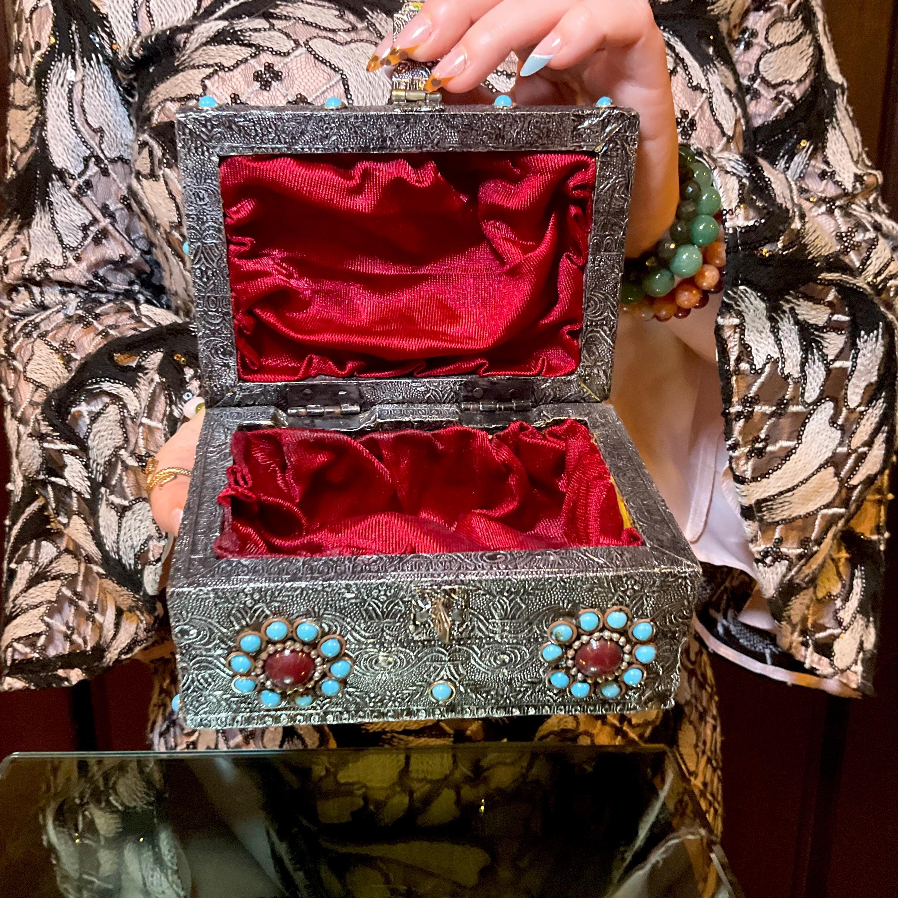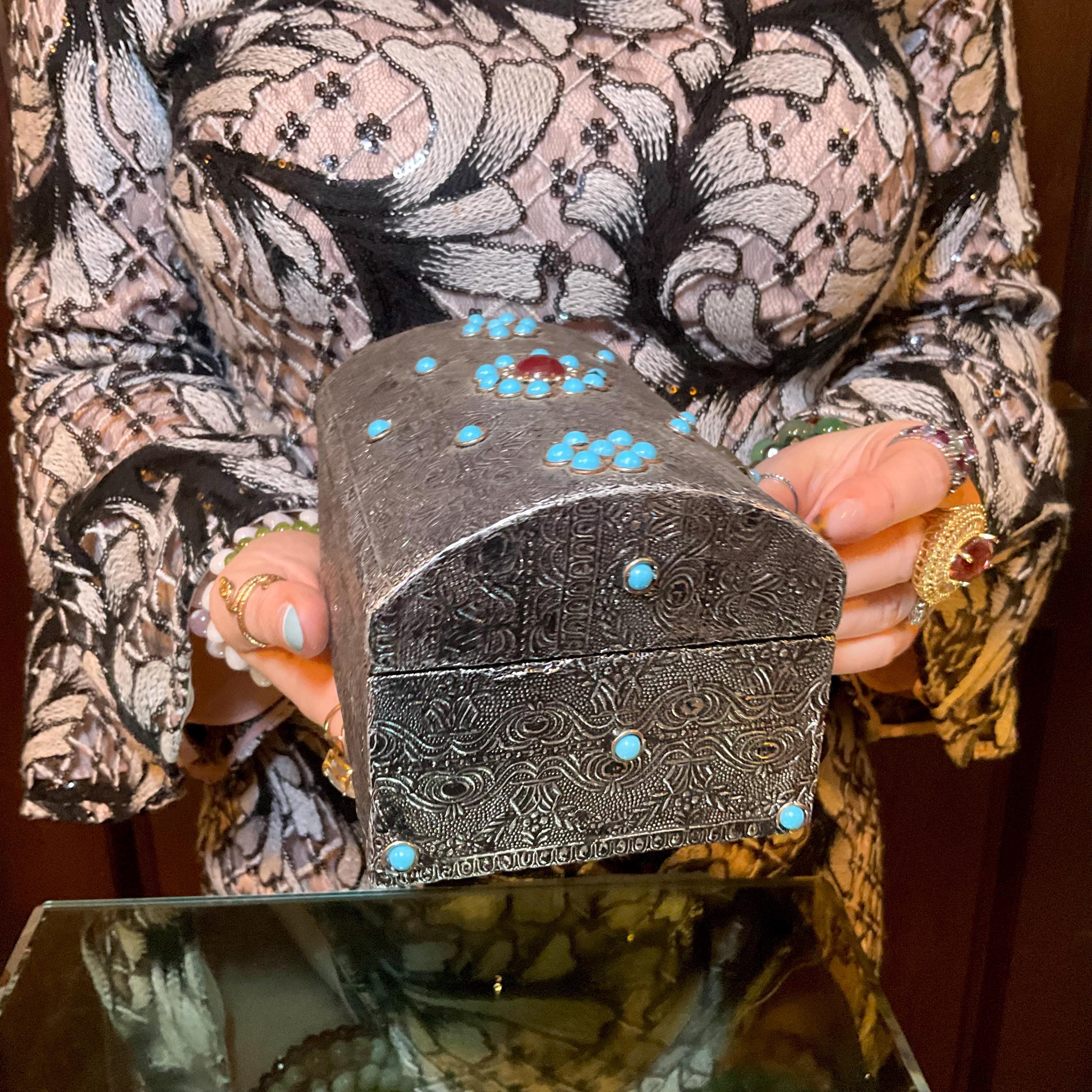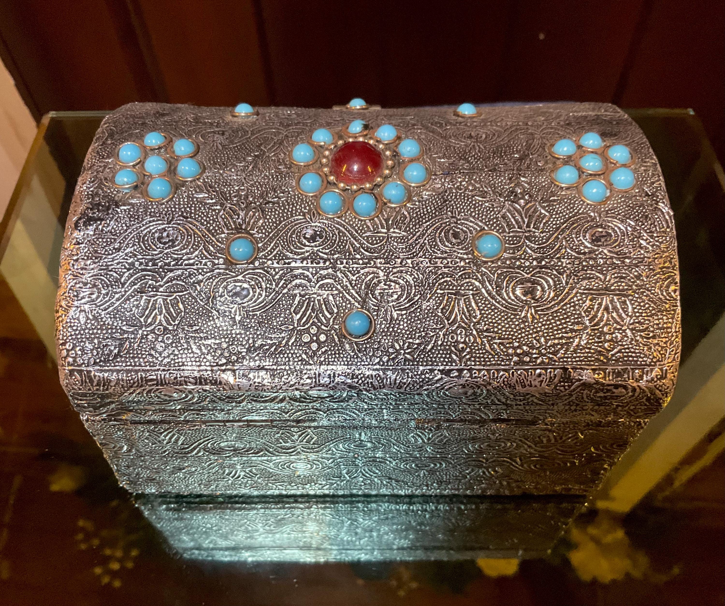 This jewelry box was purchased from a family collection, and you can imagine how rare it is to get a Tibetan Nepalese jewelry box handmade with a hinged lid and opens like a true treasure chest making this a true treasure.