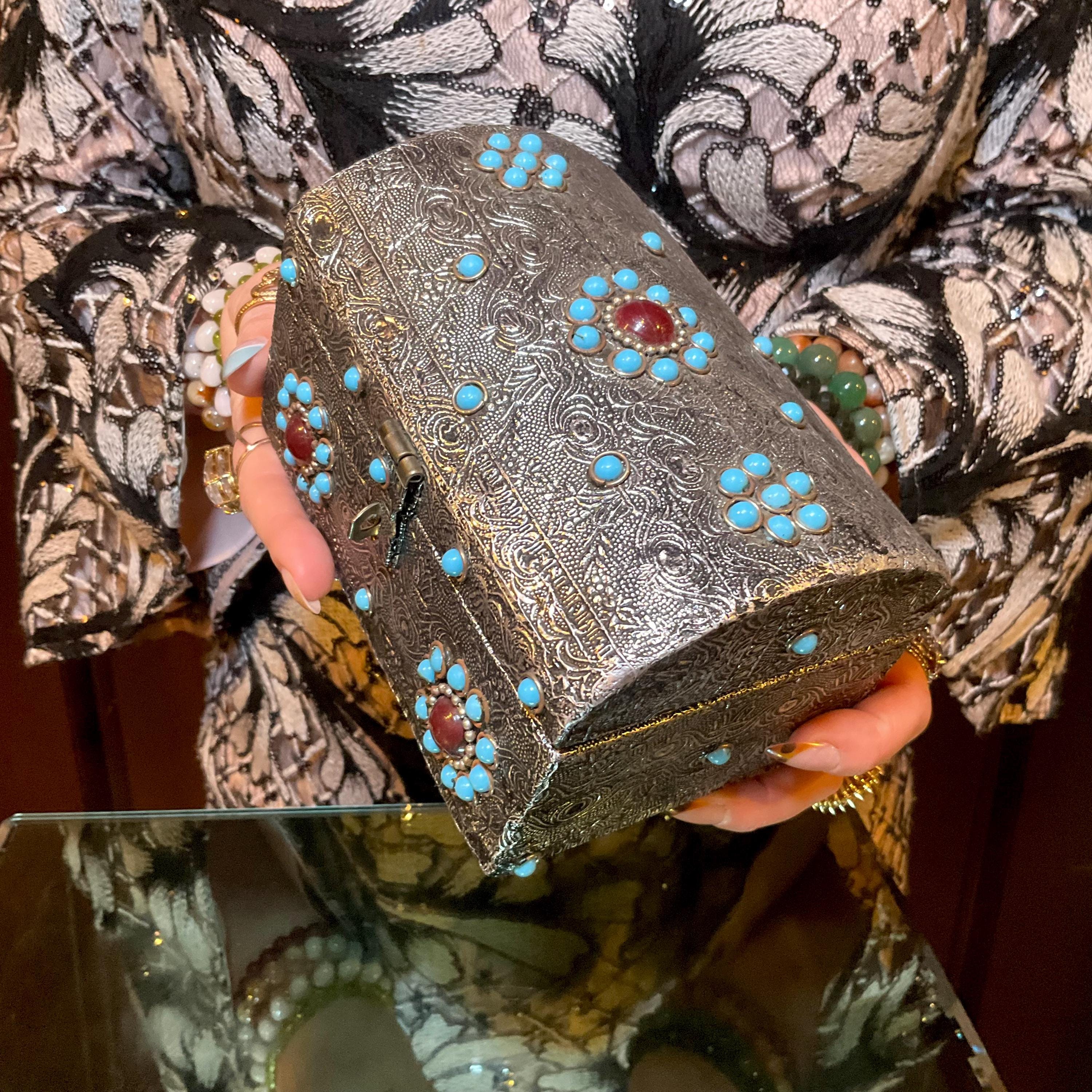 The top and front have a large central red carnelian cabochon framed by turquois beads, surrounded by detailed scrollwork and additional turquoise stones. All four sides are decorated with matching turquoise inlays.