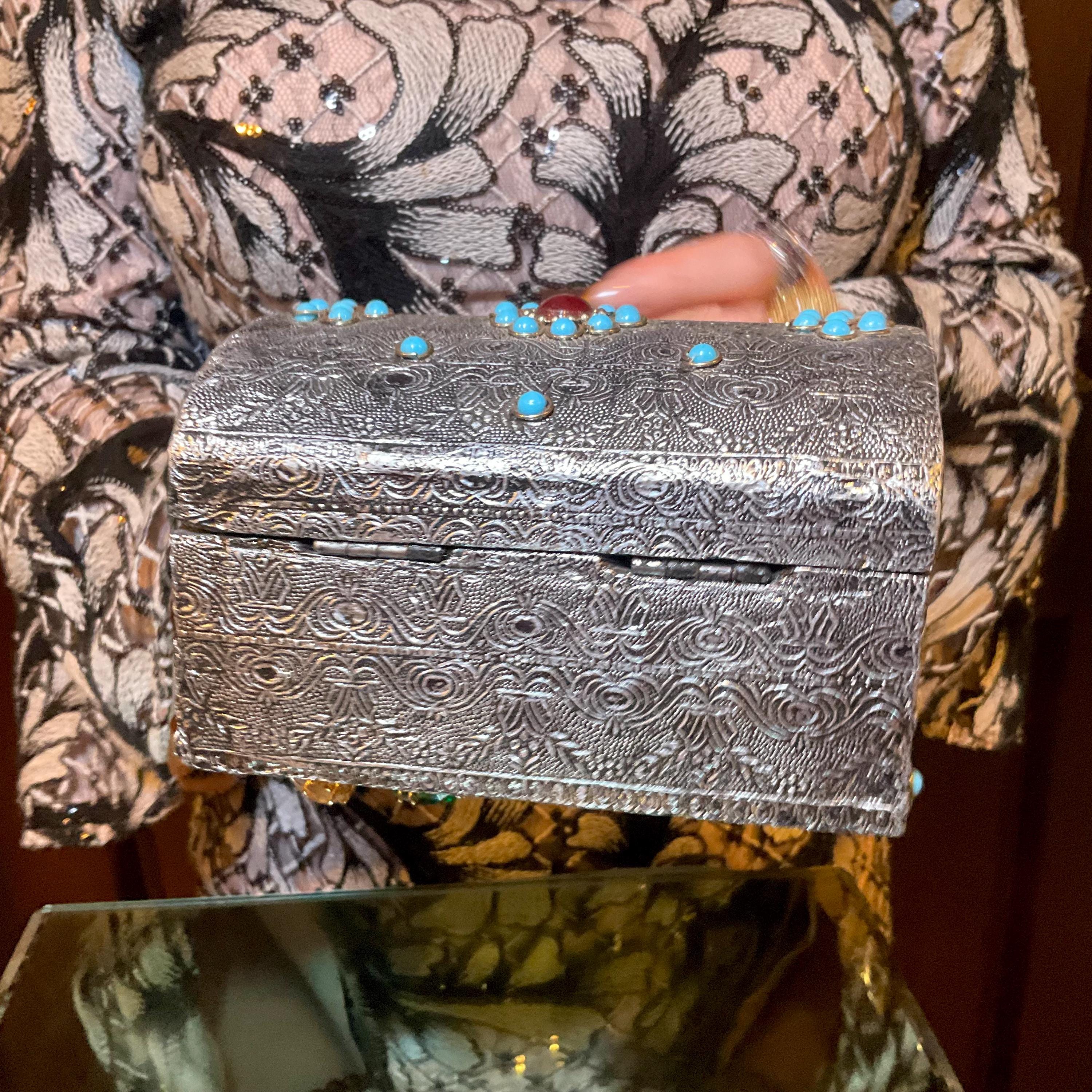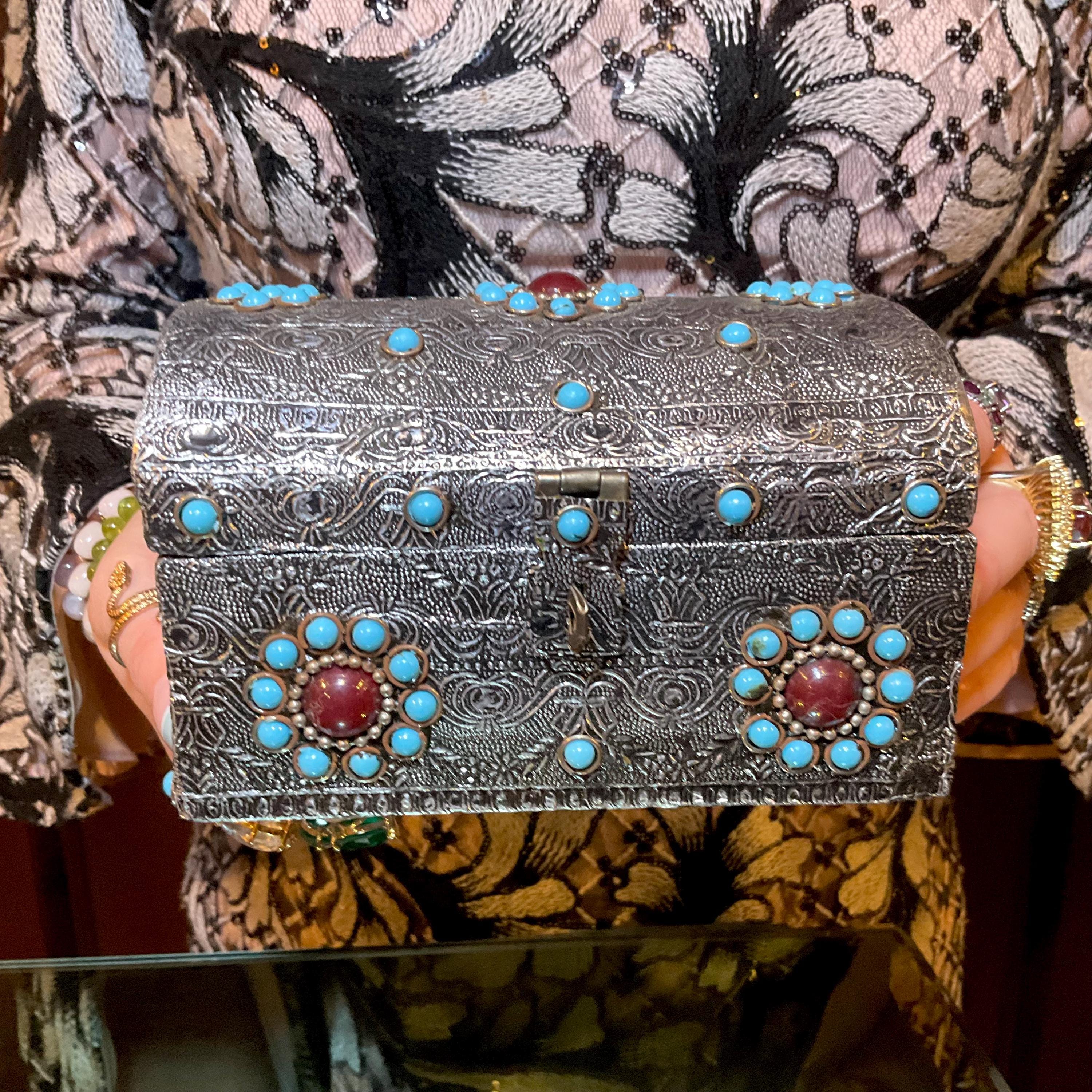 Tibetan Nepalese Jewelry Box ~ 6" Long ~ Inlayed Turquoise & Red Carnelian~ Ornate Silver Filigree ~ Expertly Hand Crafted