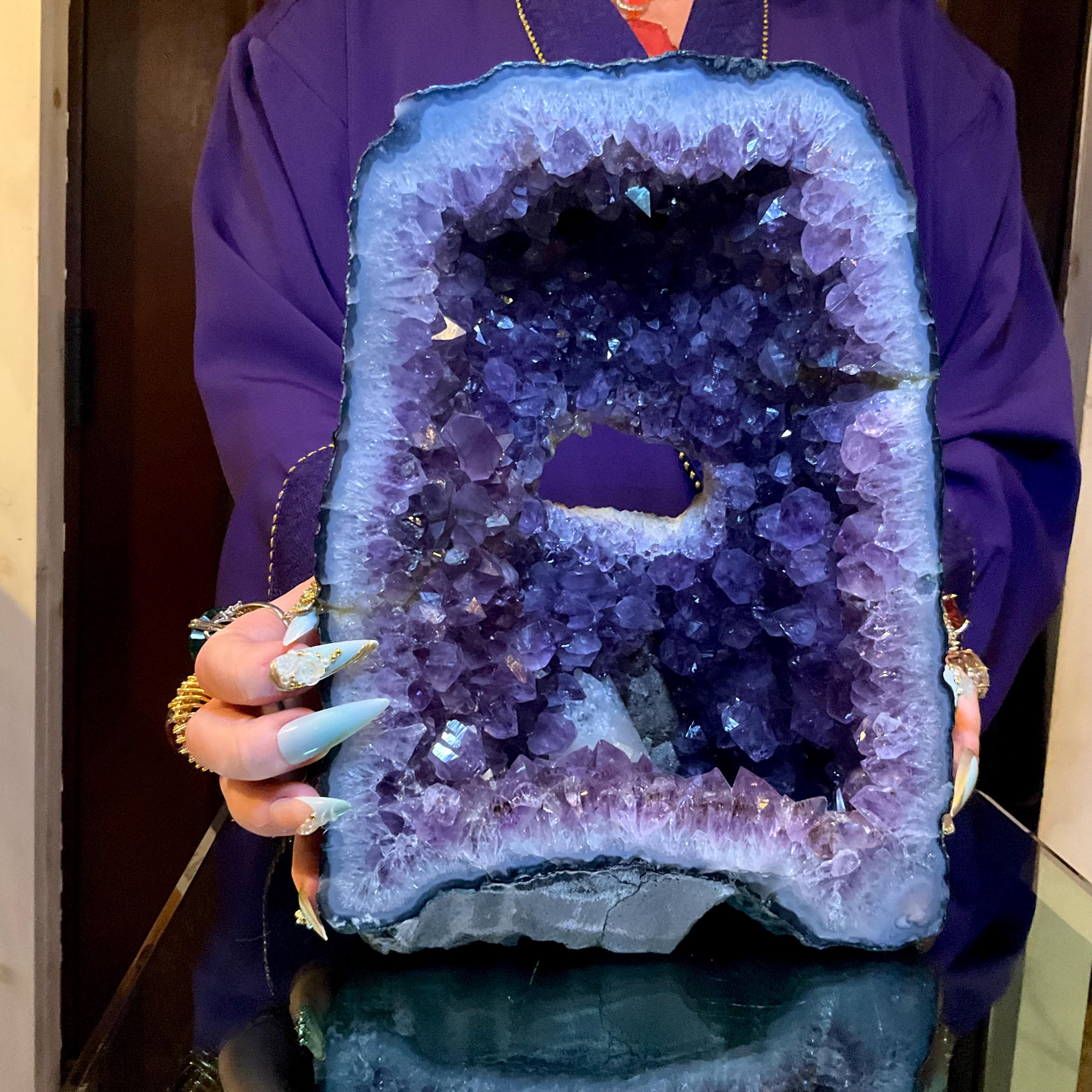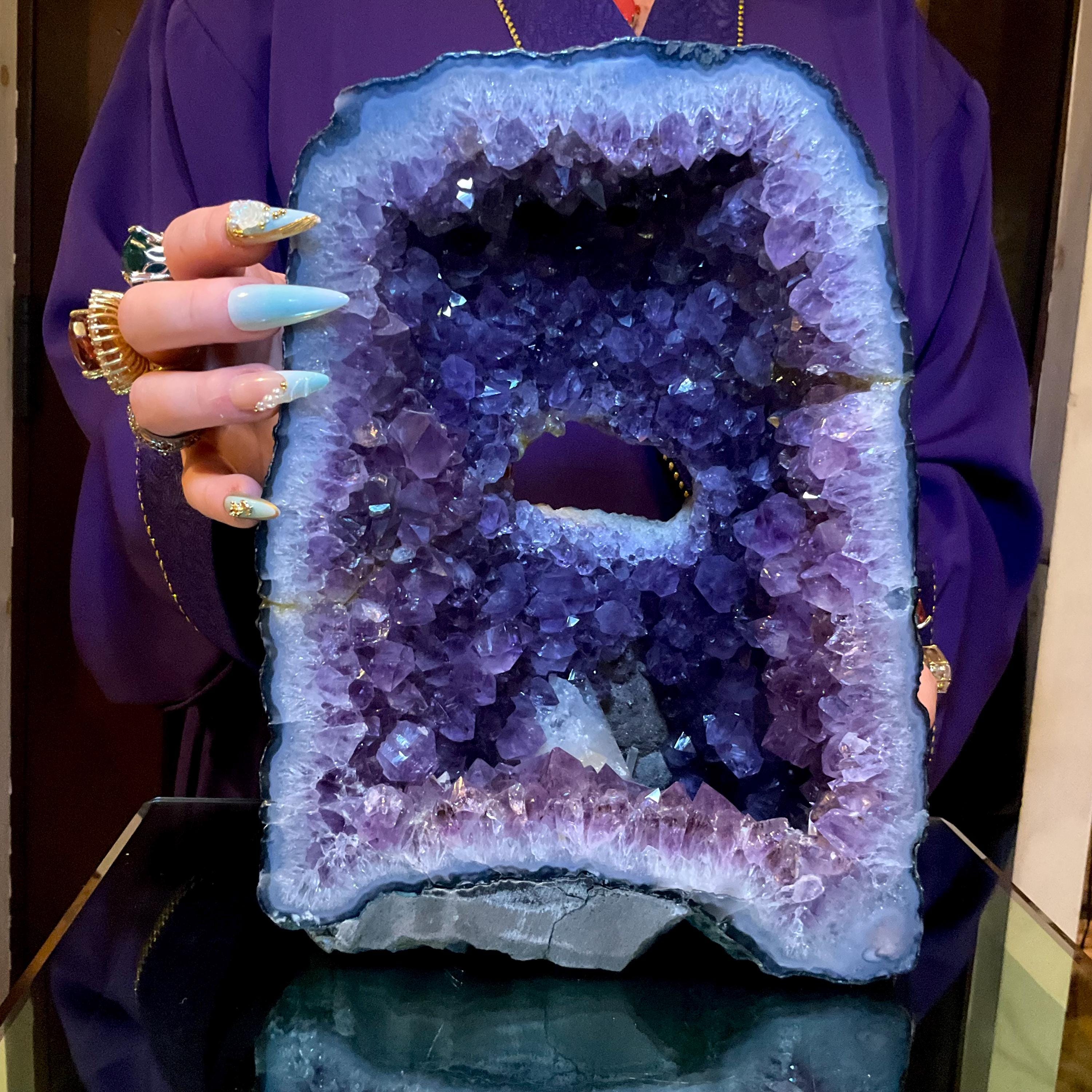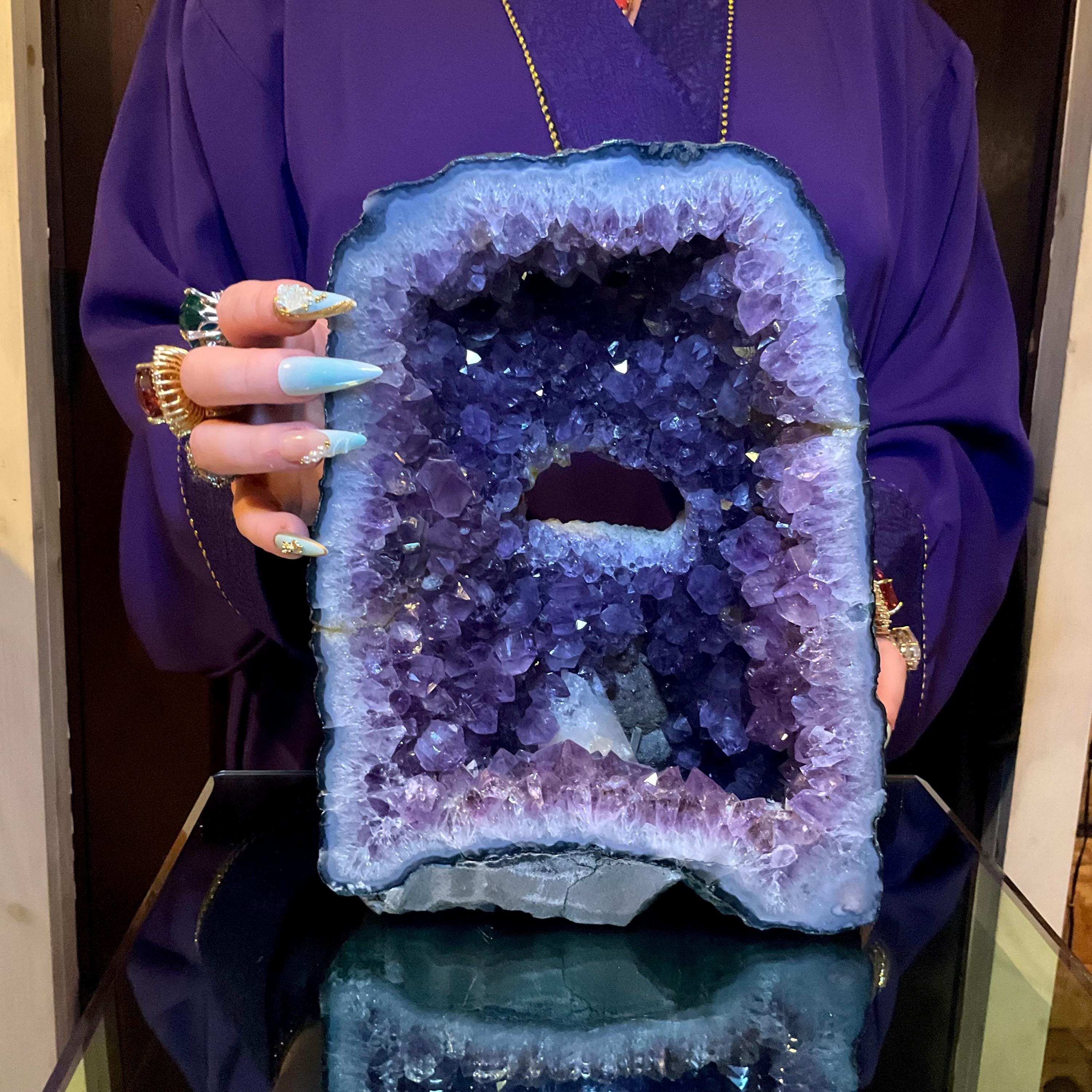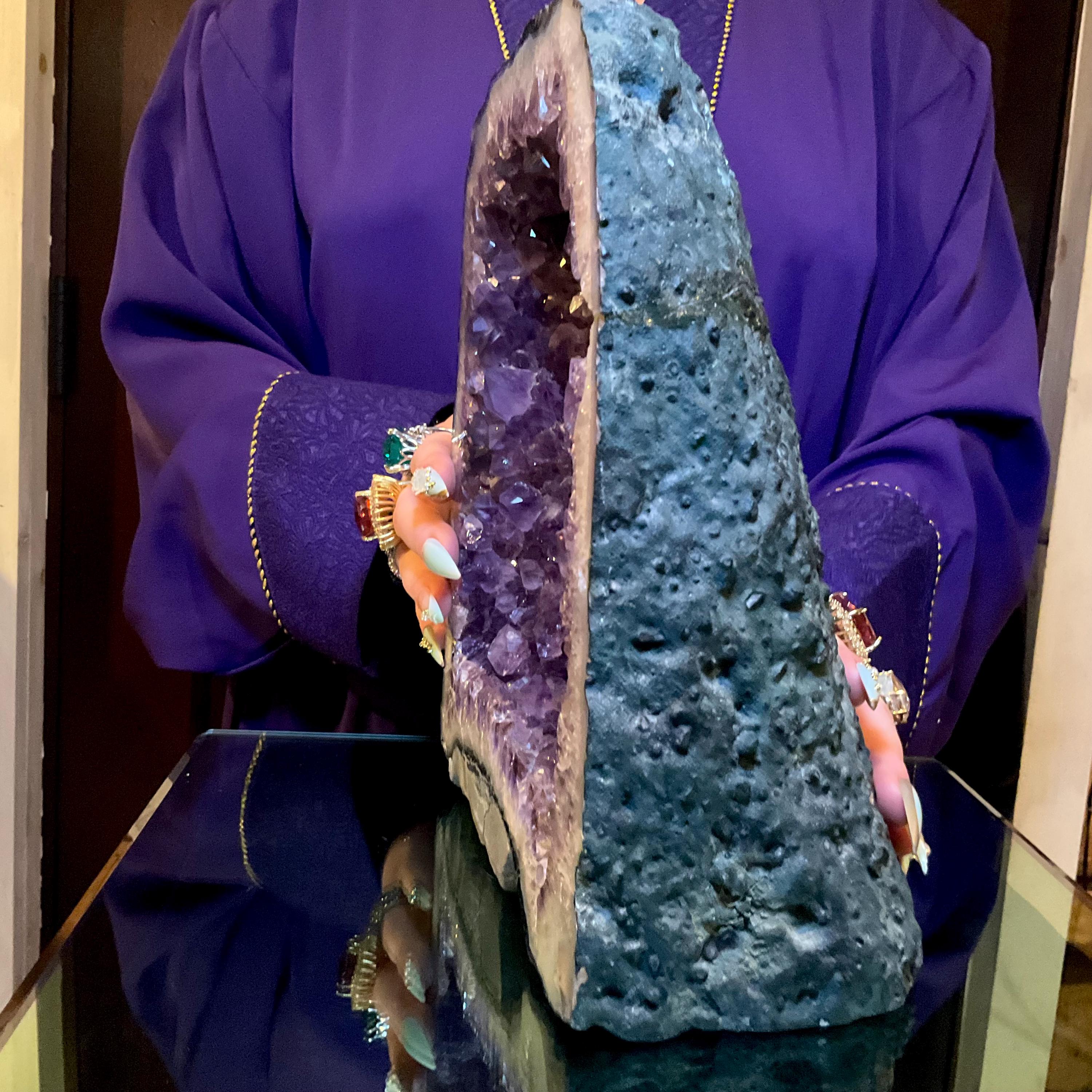This one-of-a-kind Amethyst crystal Cathedral cluster it is amazing, and it measures 7 inches wide and 10 inches tall weighing at 9 pounds 7 ounces.