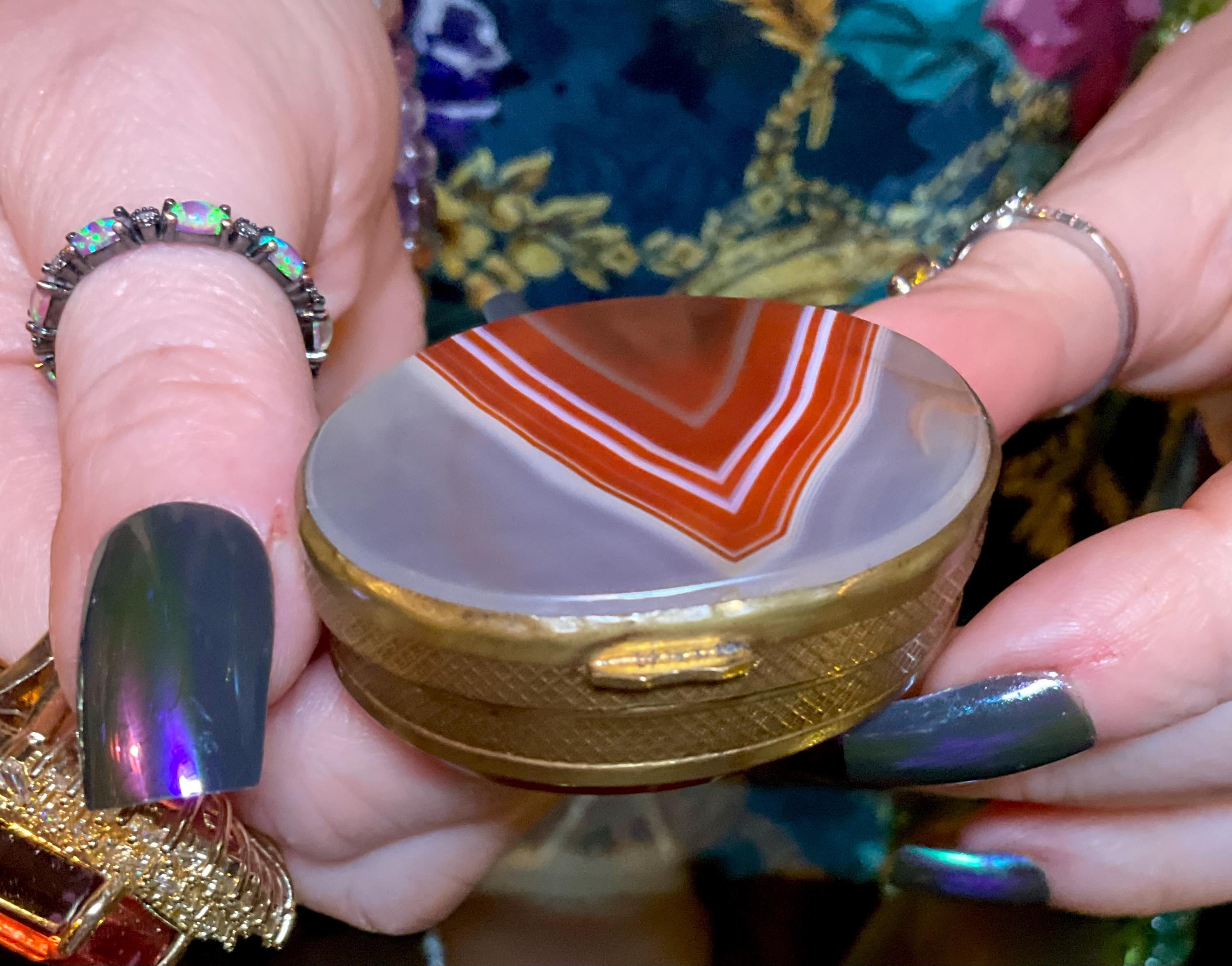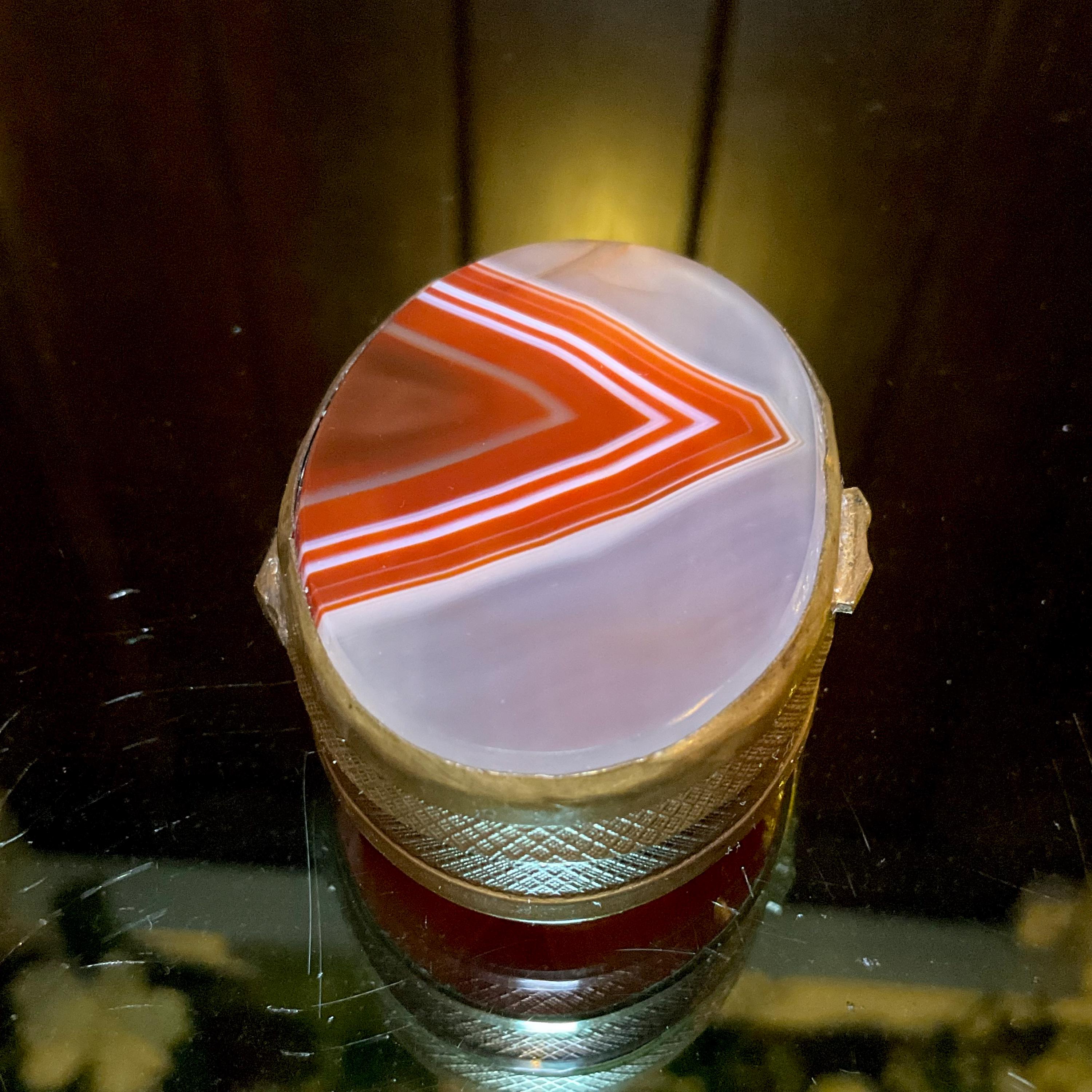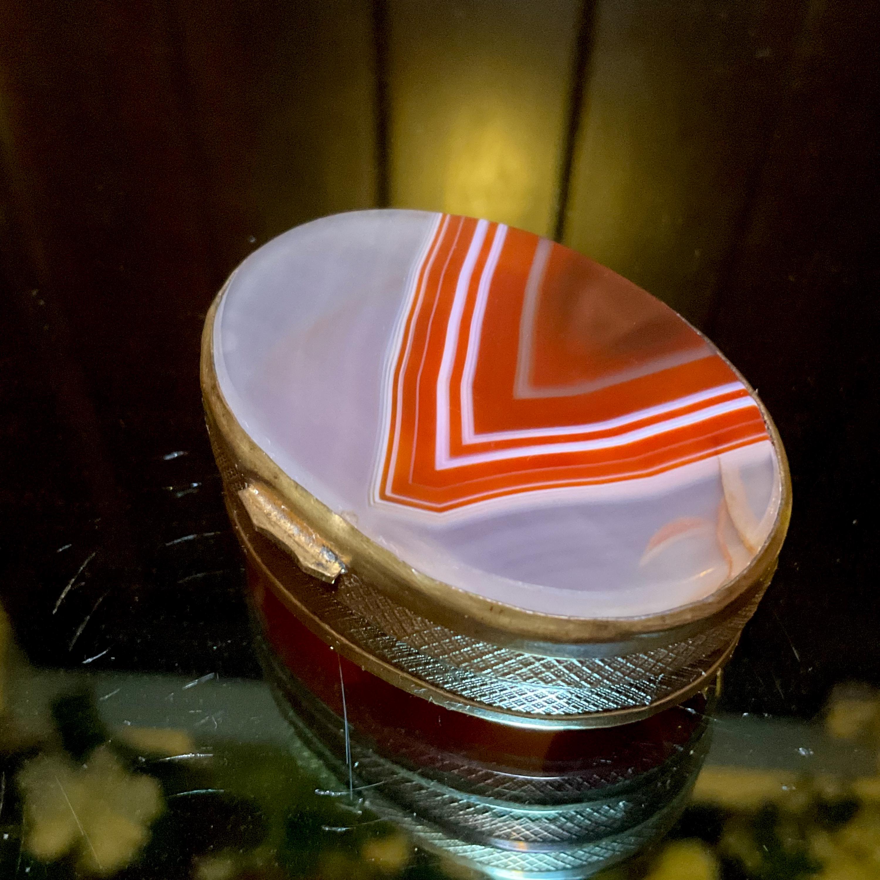 Banded Agate Carnelian Sided Pill Box / Snuff Box France 1880's ~ 2" Long ~ Beautiful Natural Color, Luminosity, And Transparency