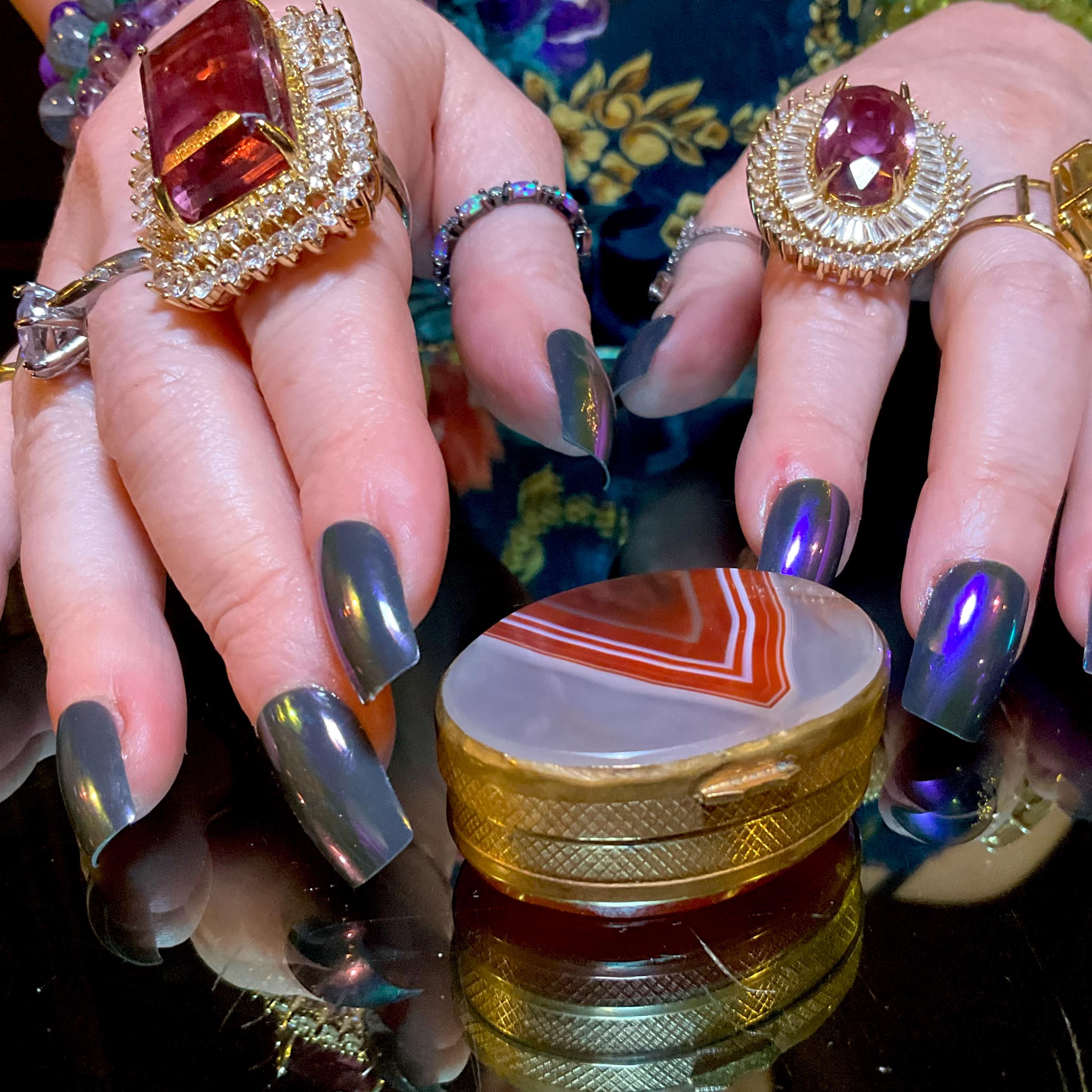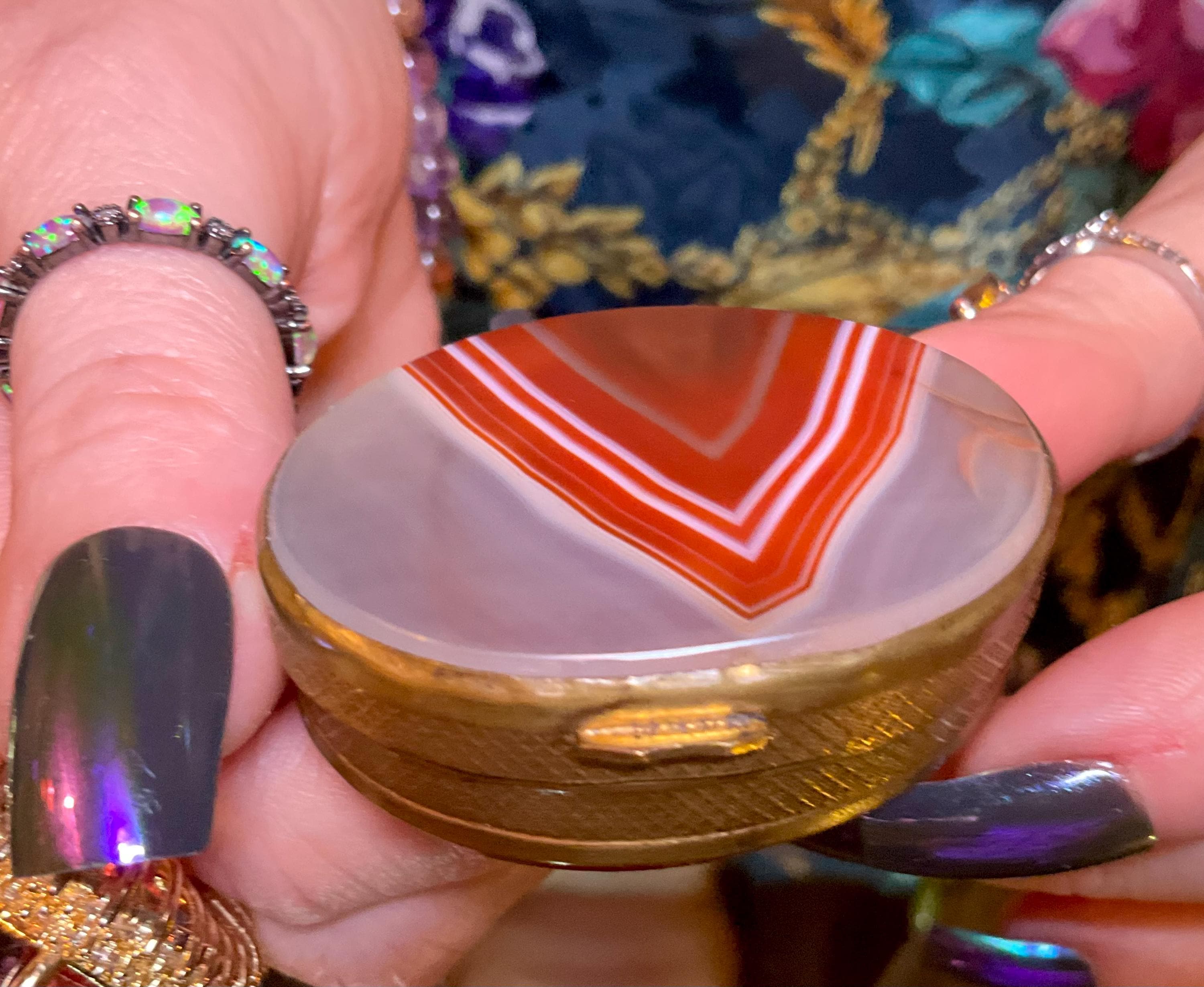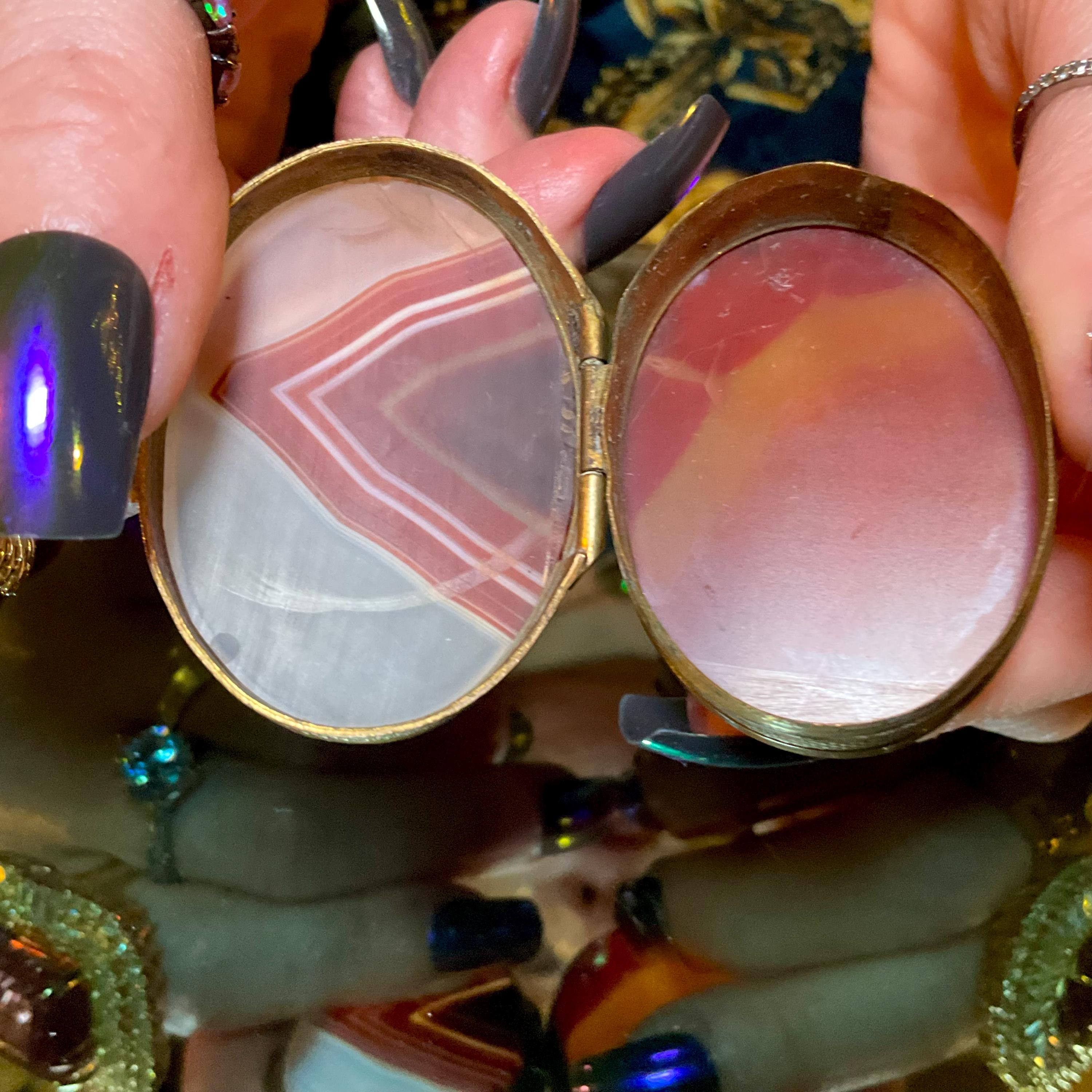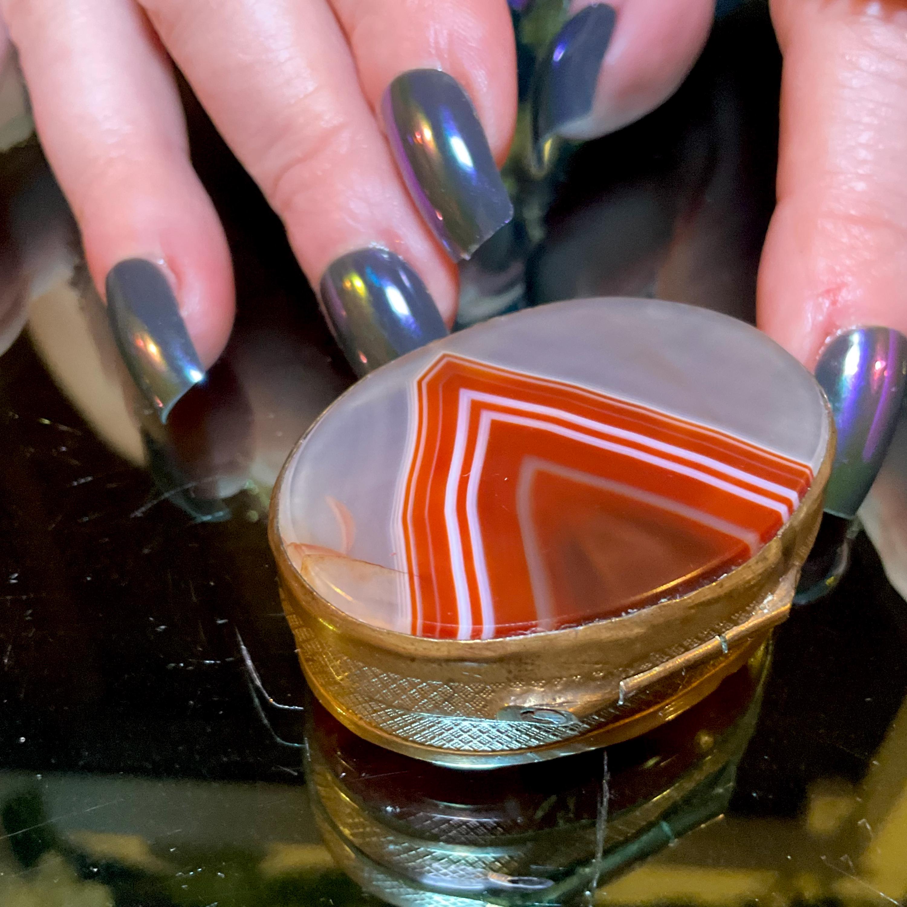 The Vintage Banded Agate Carnelian Double Sided Snuff/Pill Box weighs, 1 ounce and it is beautifully hand-crafted.