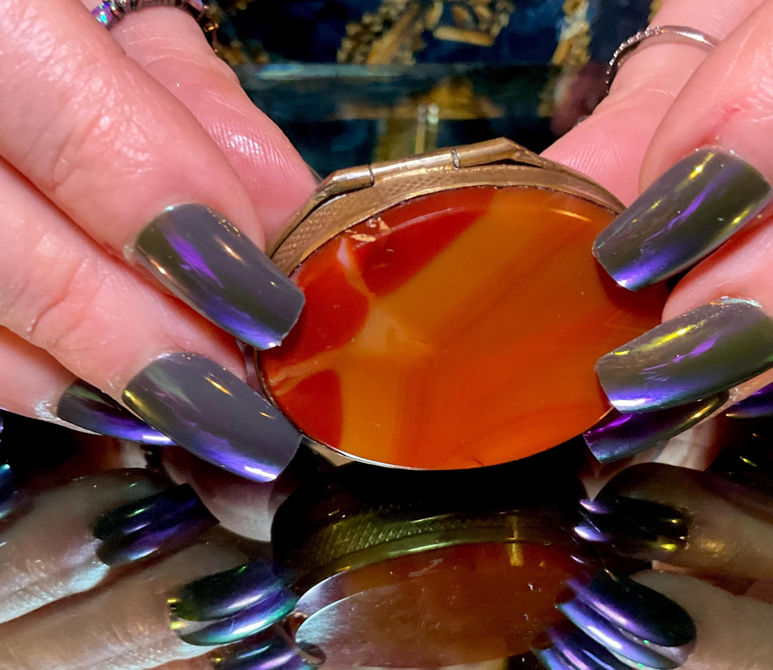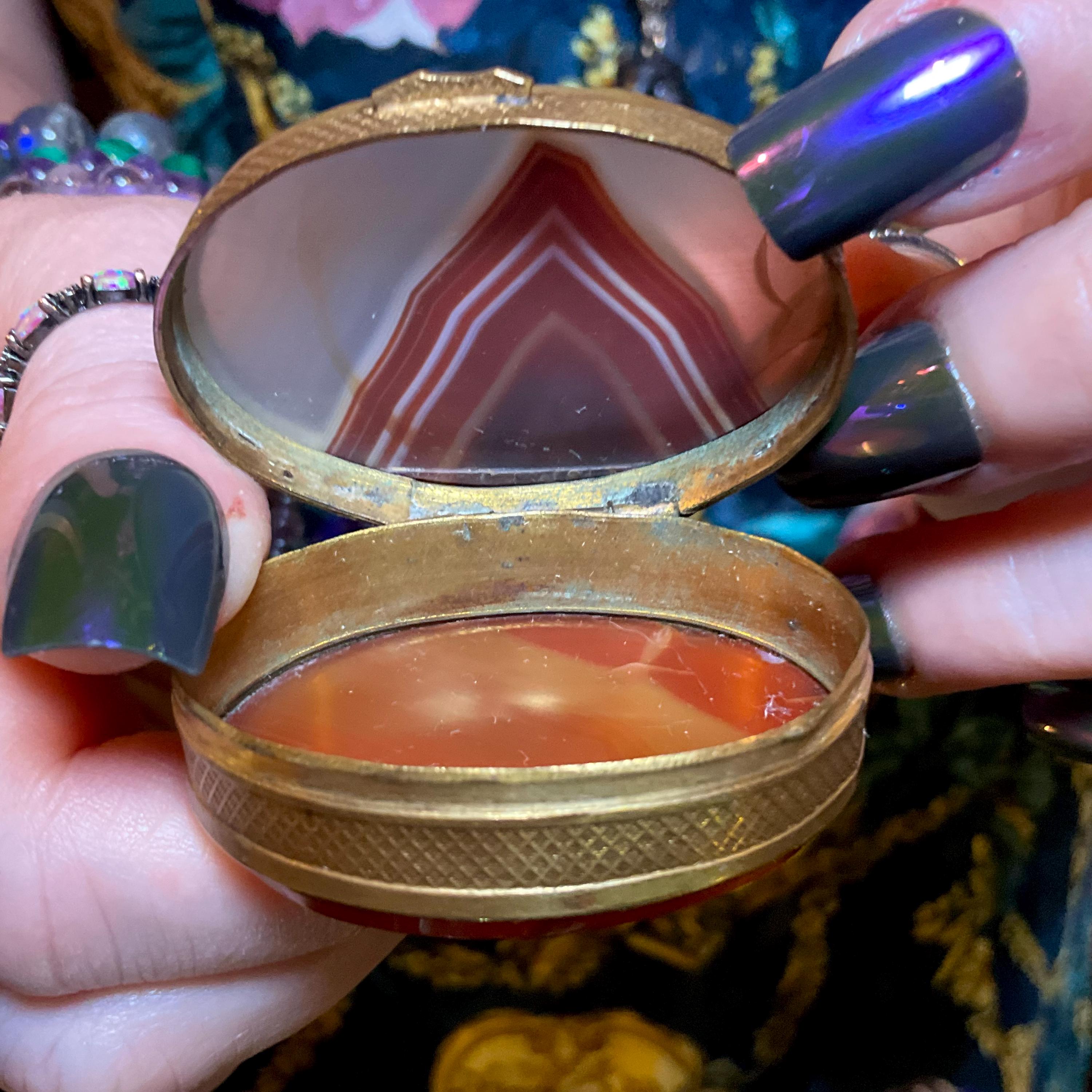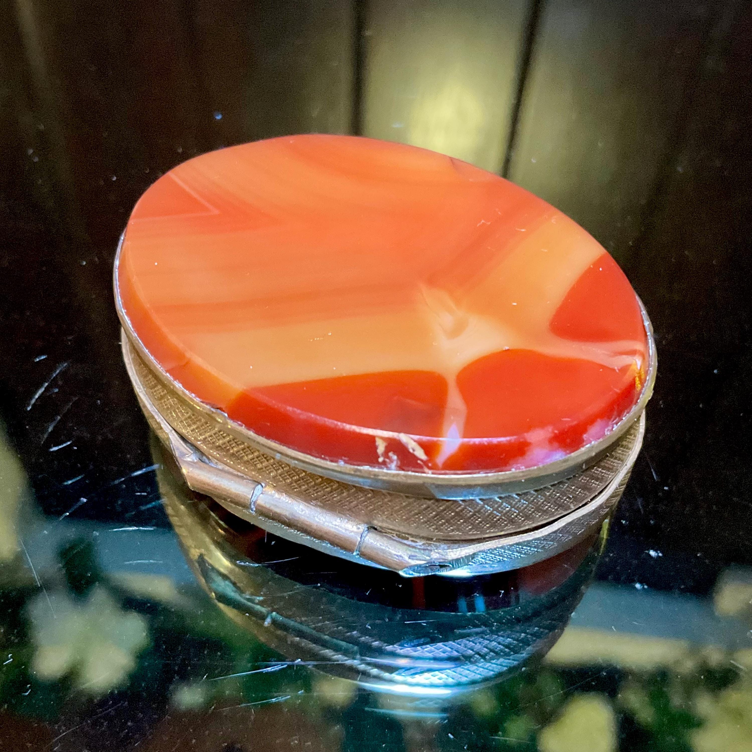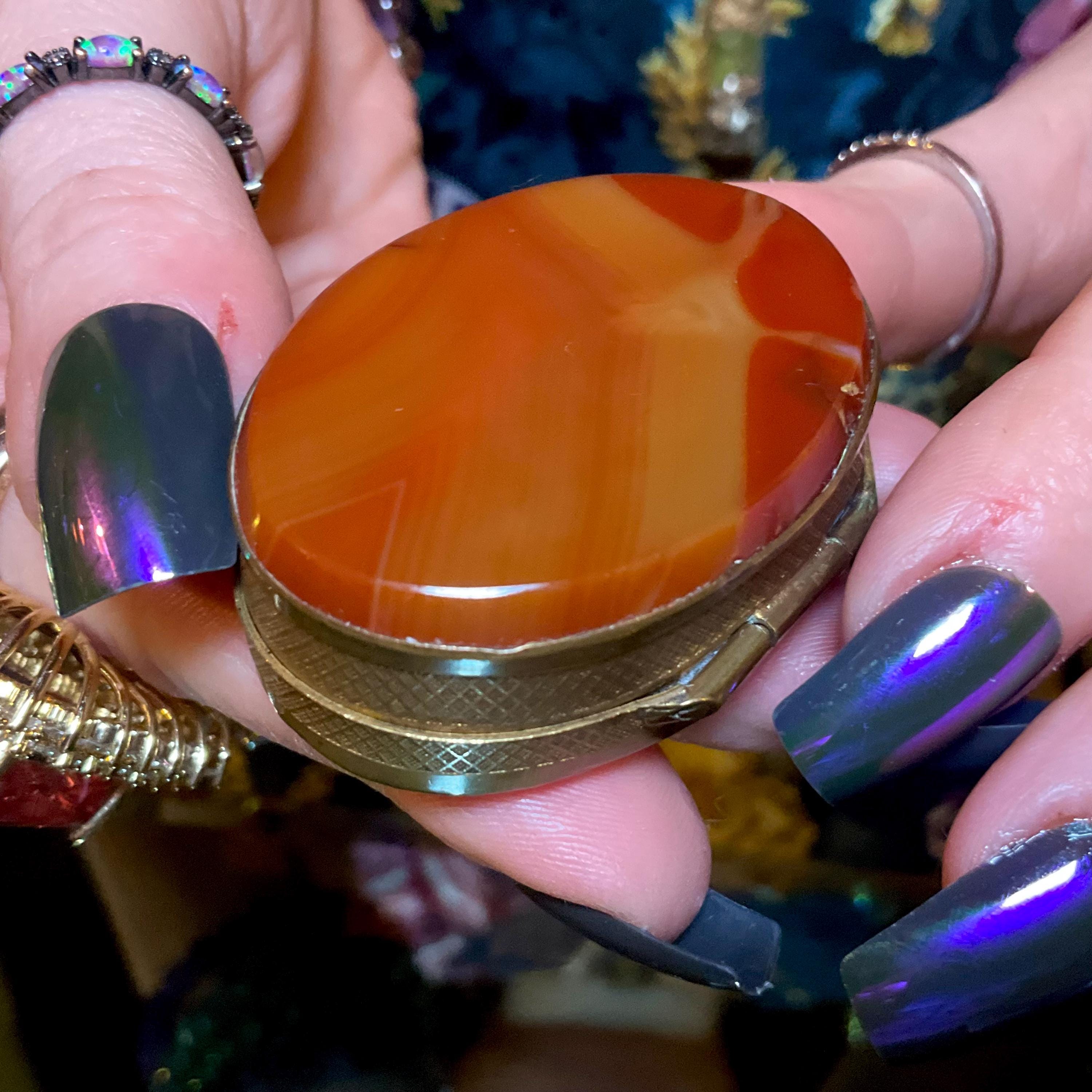 If you love vintage hand carved Banded Agate Carnelian, then this beautiful double-sided Snuff/Pill Box is for you.