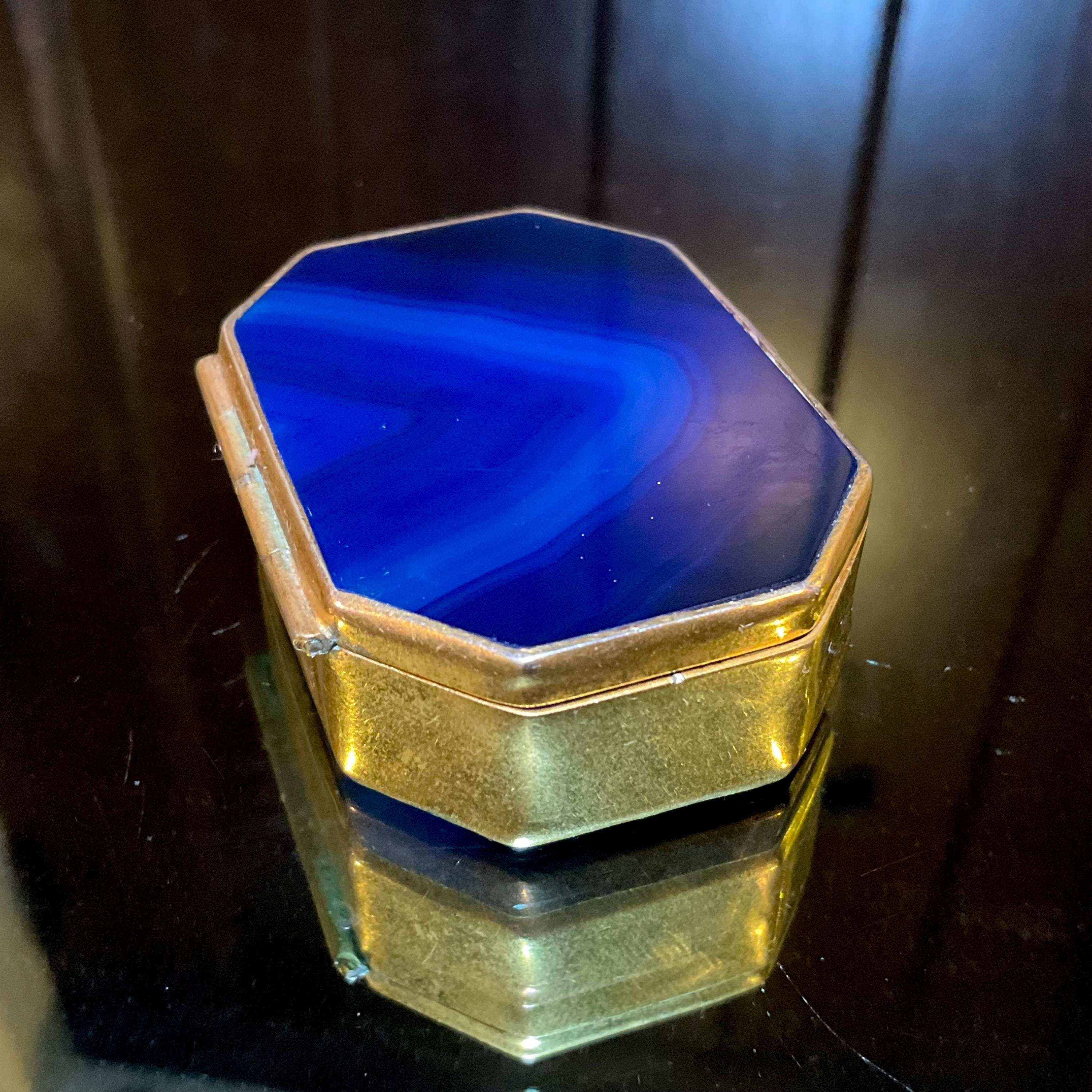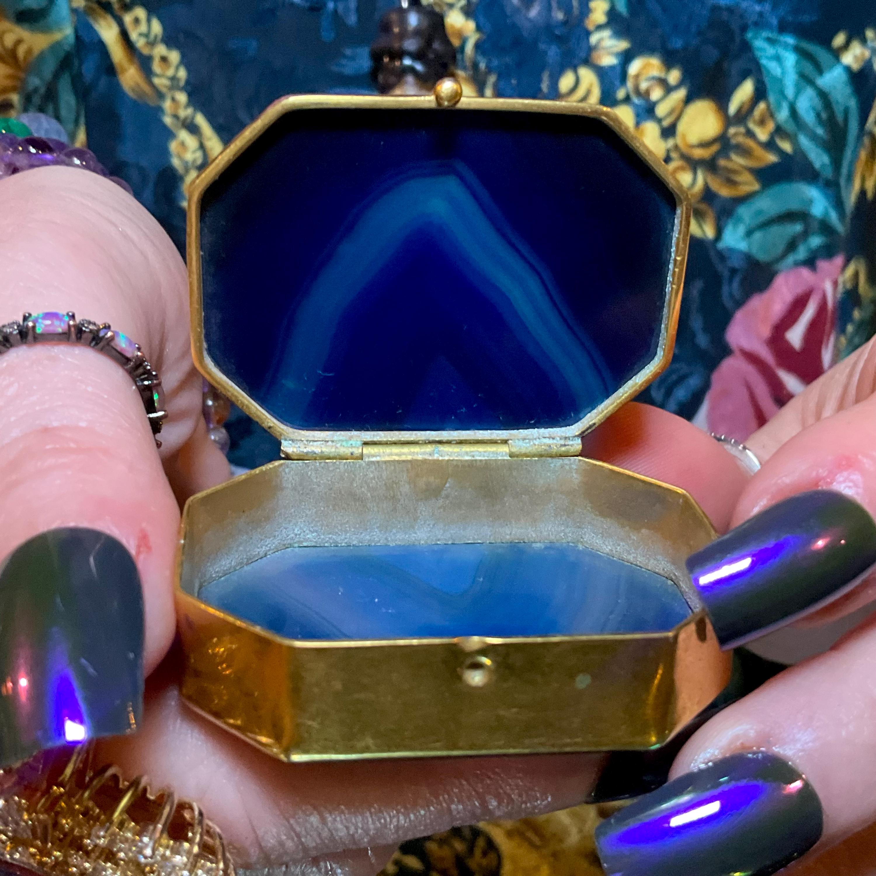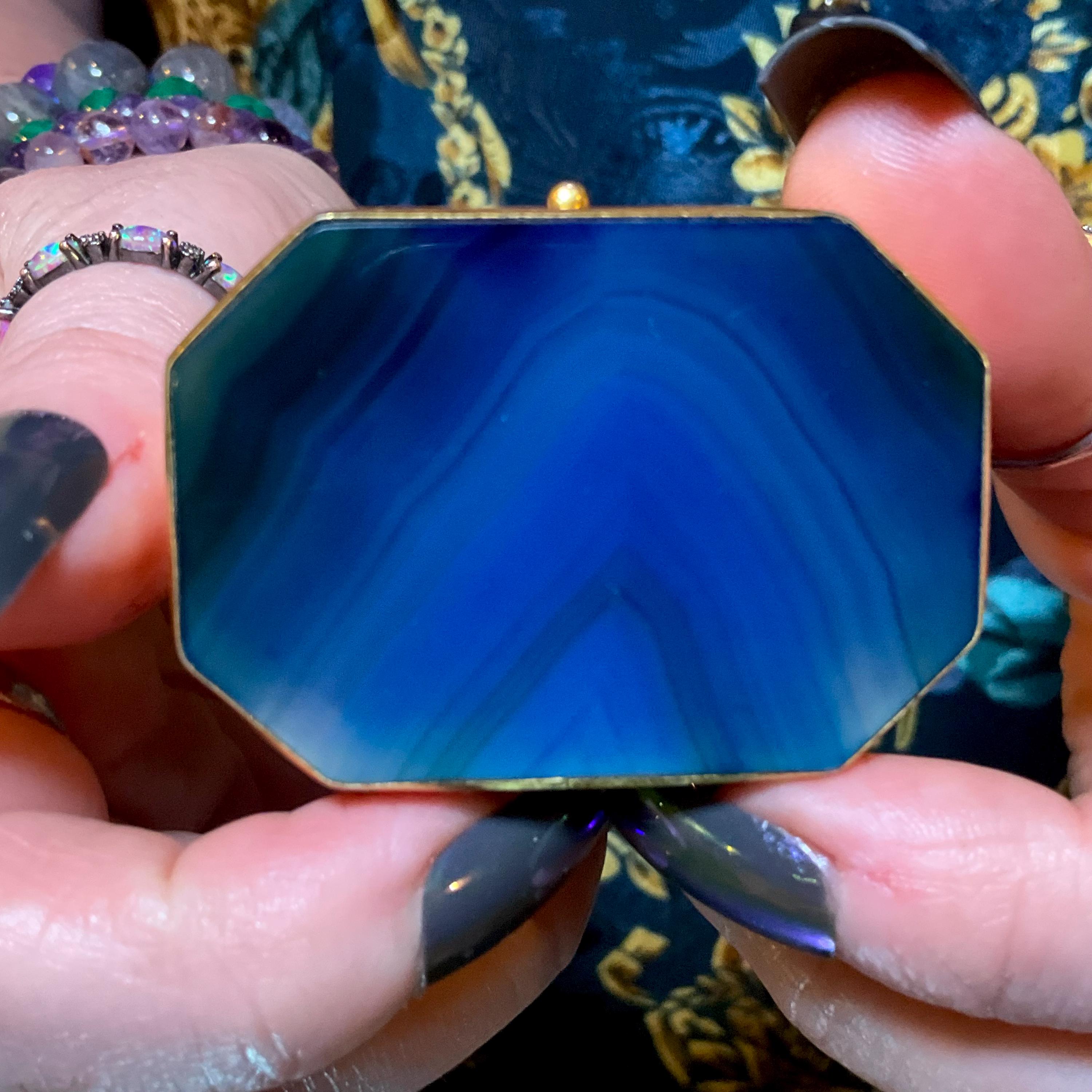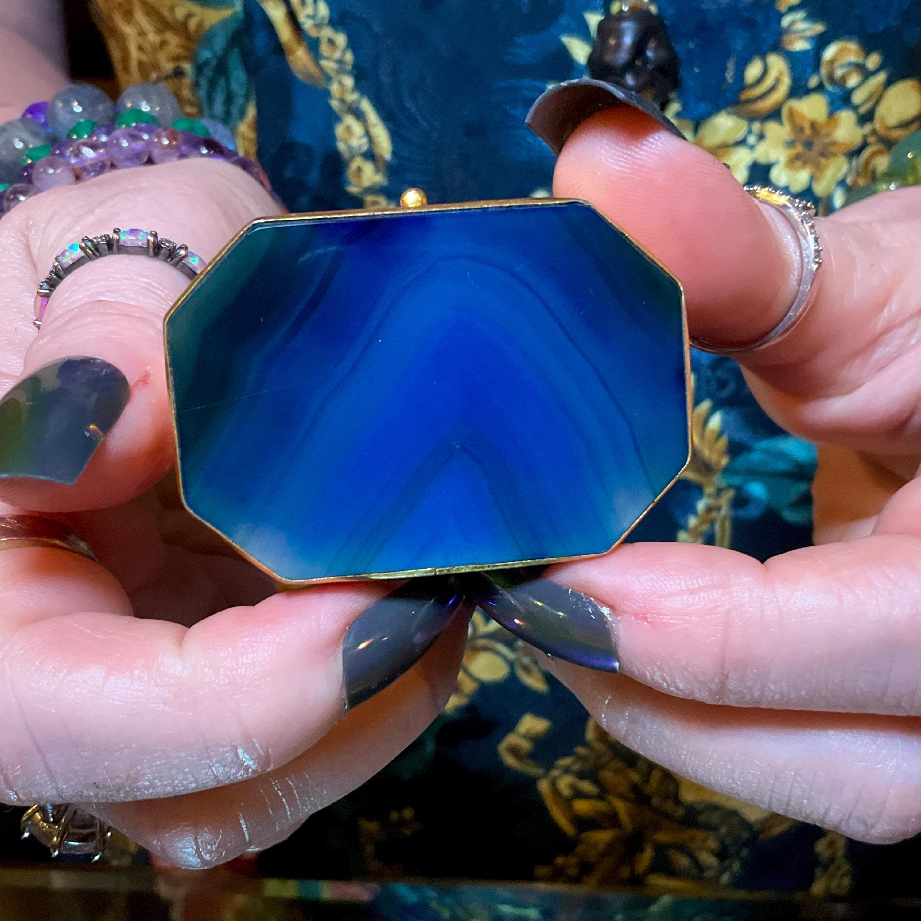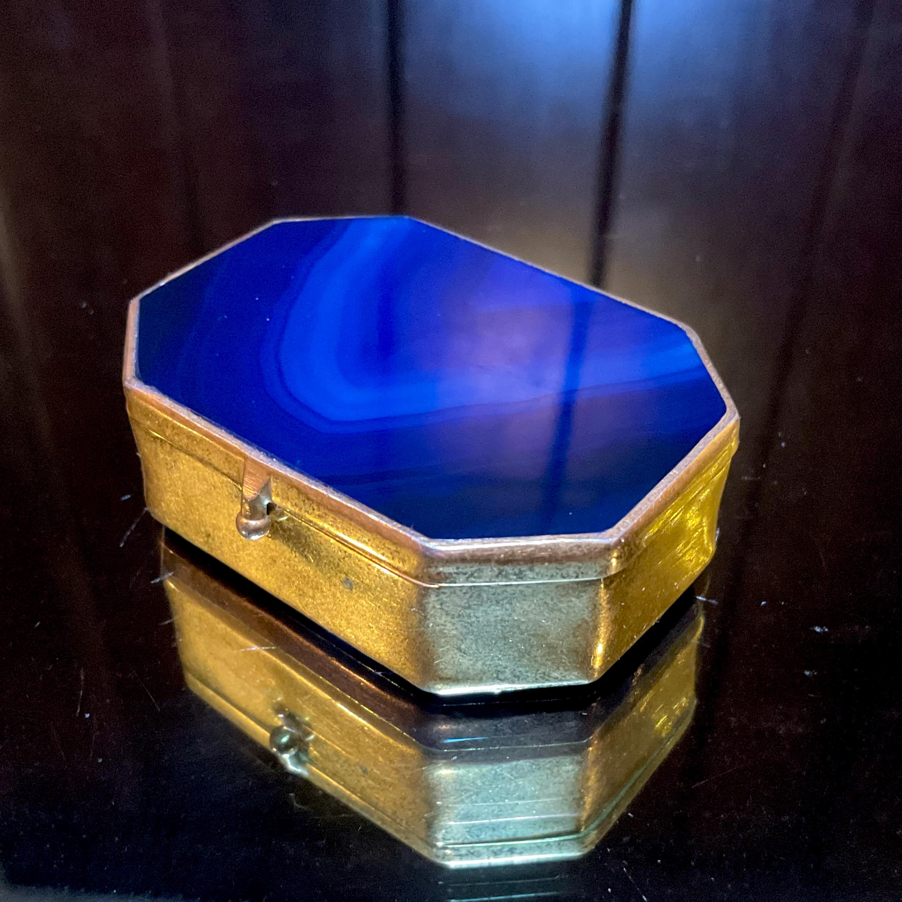 A fantastic and wonderfully designed antique gold metal mounted blue agate Agate Pill/Trinket Box is charming, finished with superior quality and detail, no obvious cracks or damage.