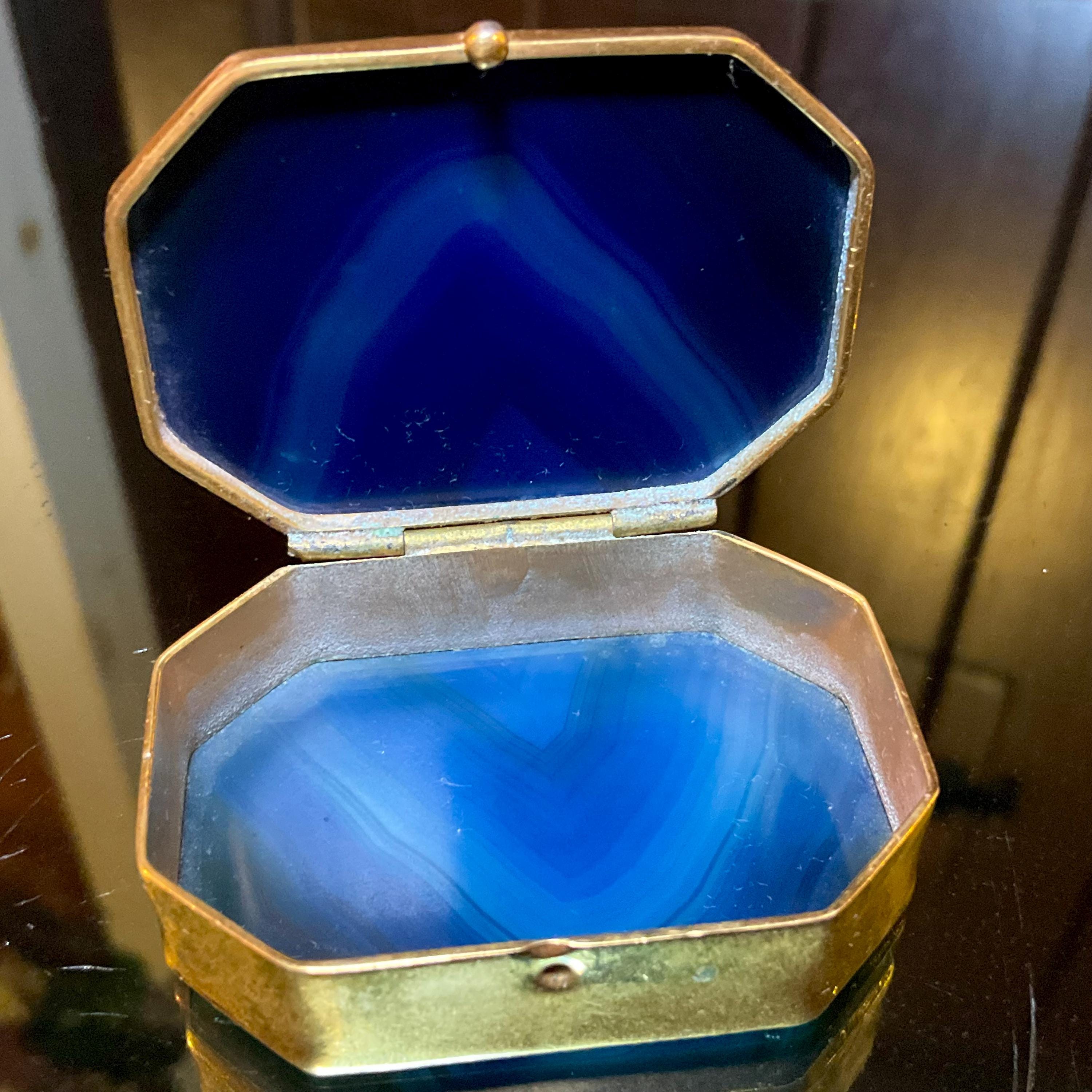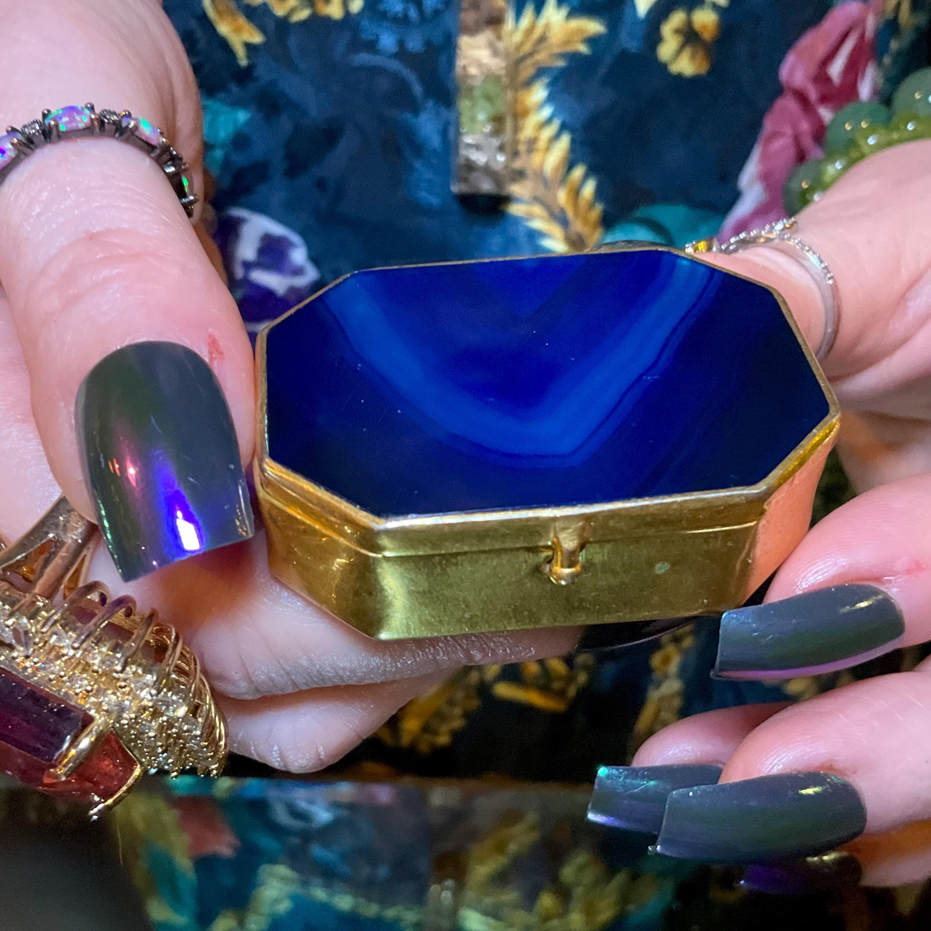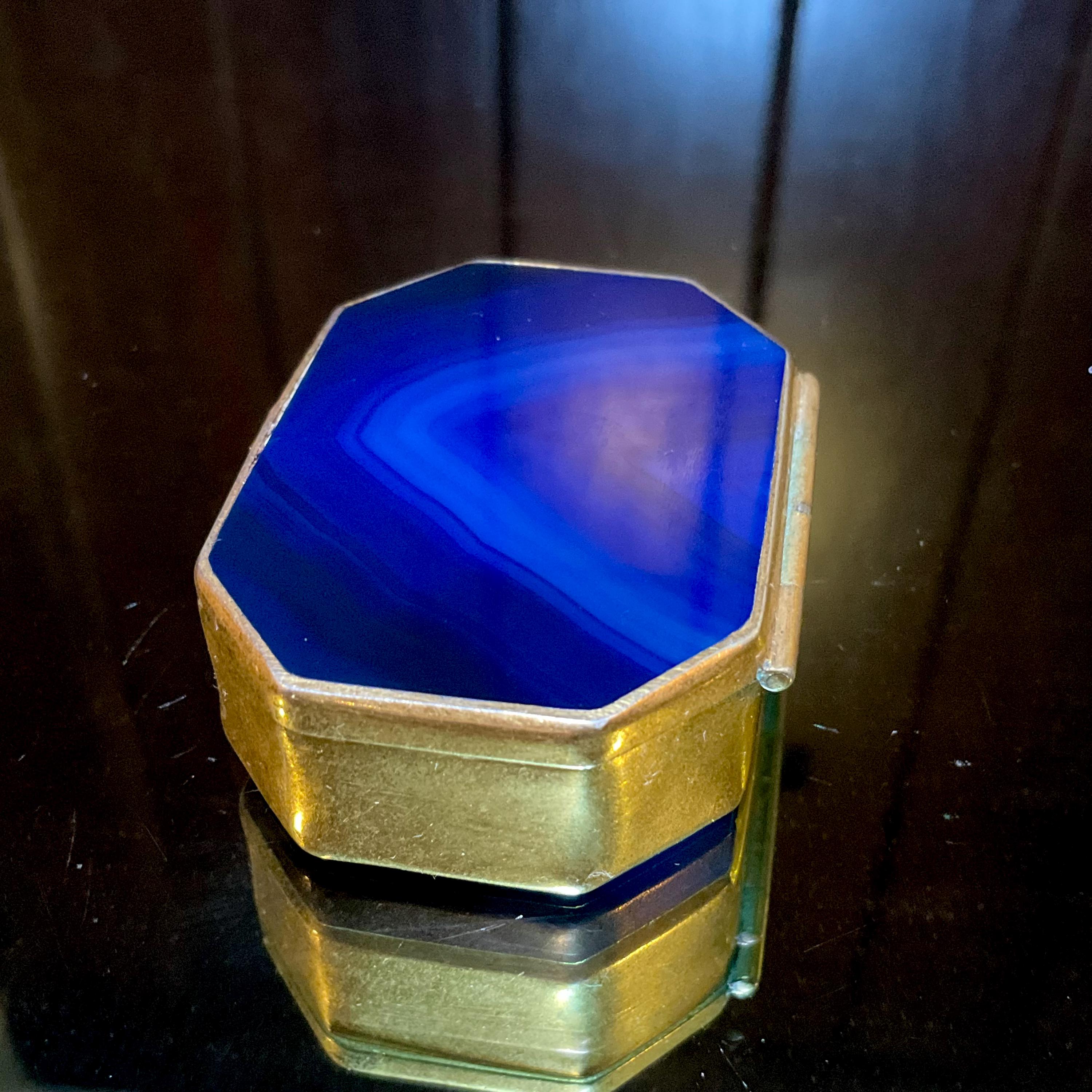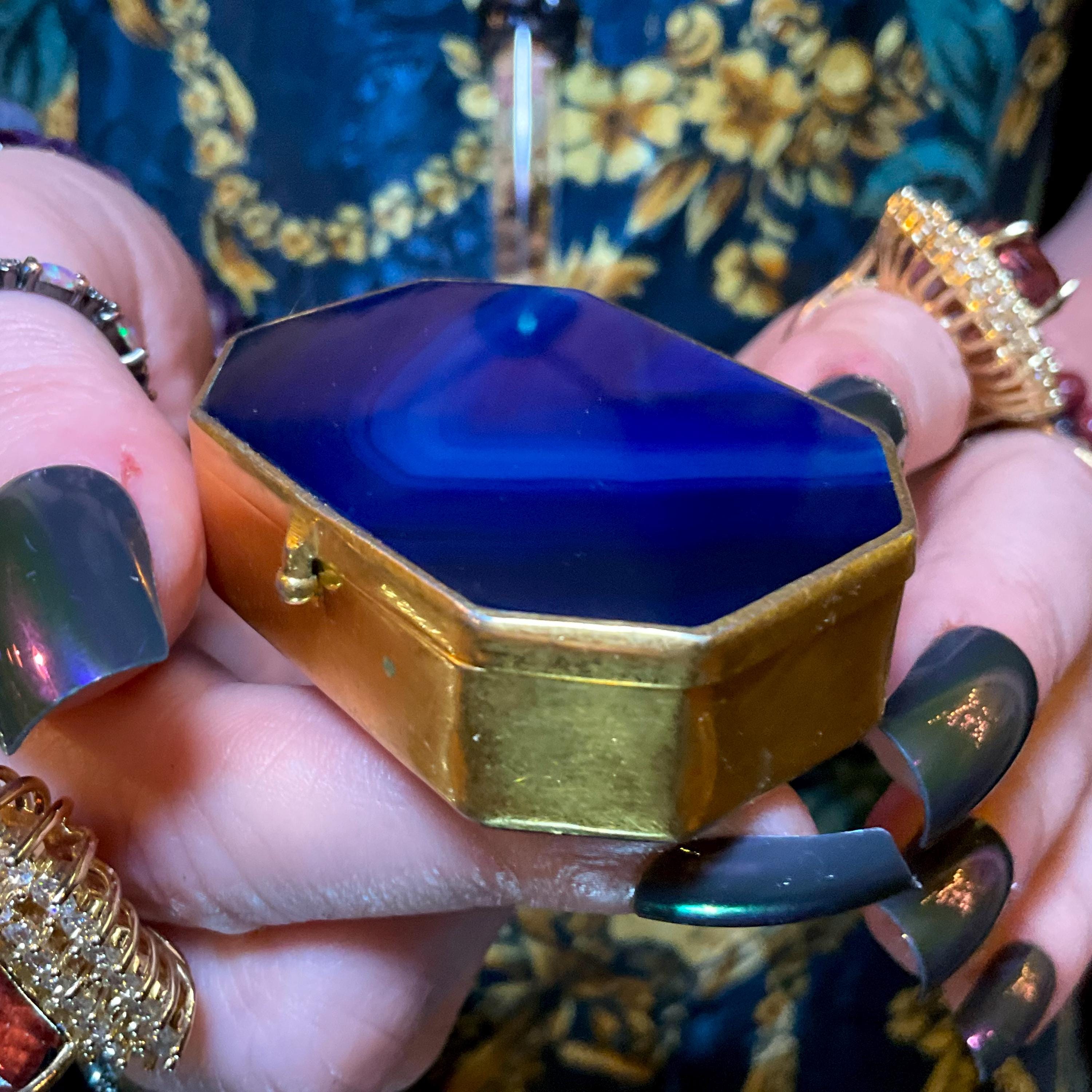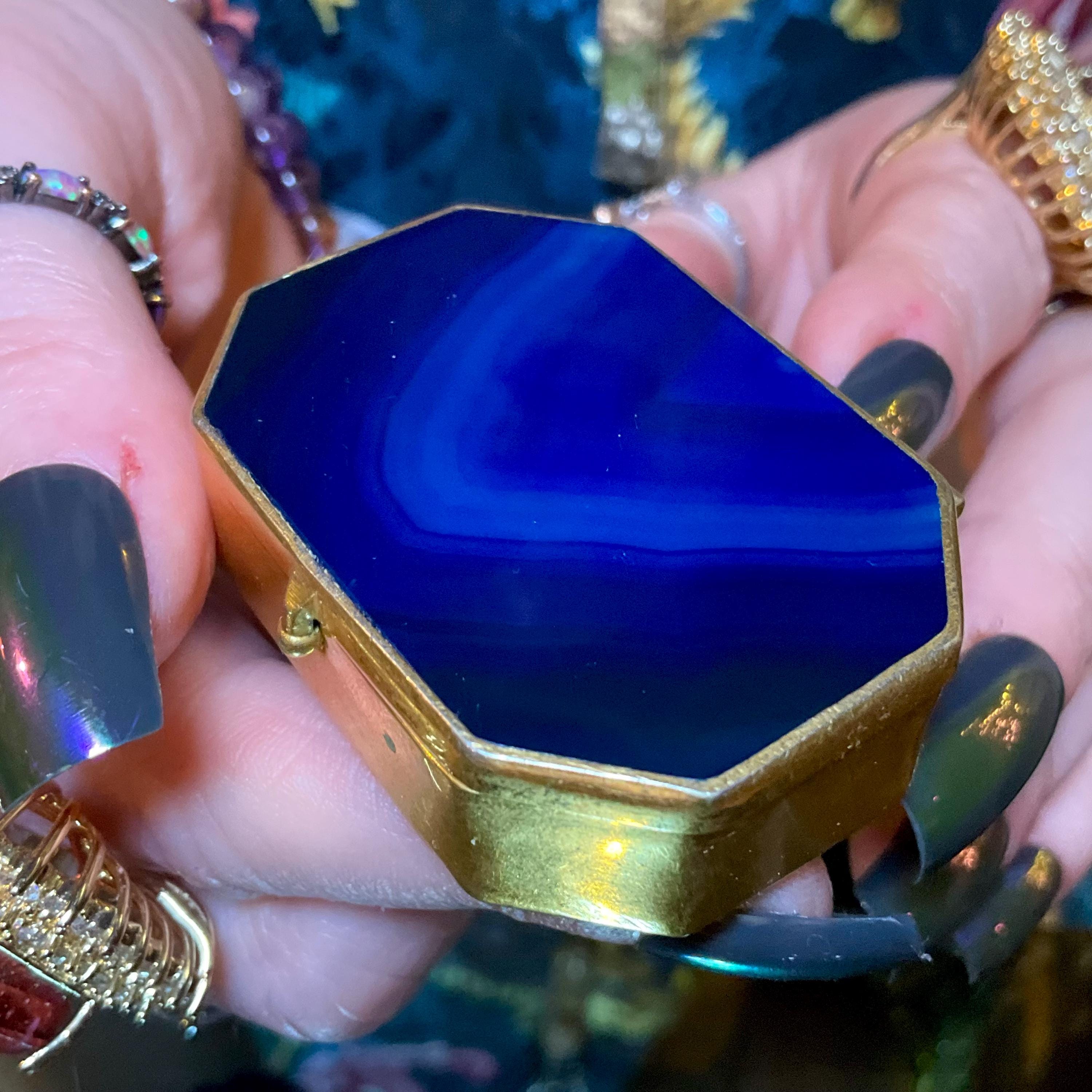 A fantastic and wonderfully designed antique gold metal mounted blue agate Agate Pill/Trinket Box is charming, finished with superior quality and detail, no obvious cracks or damage.