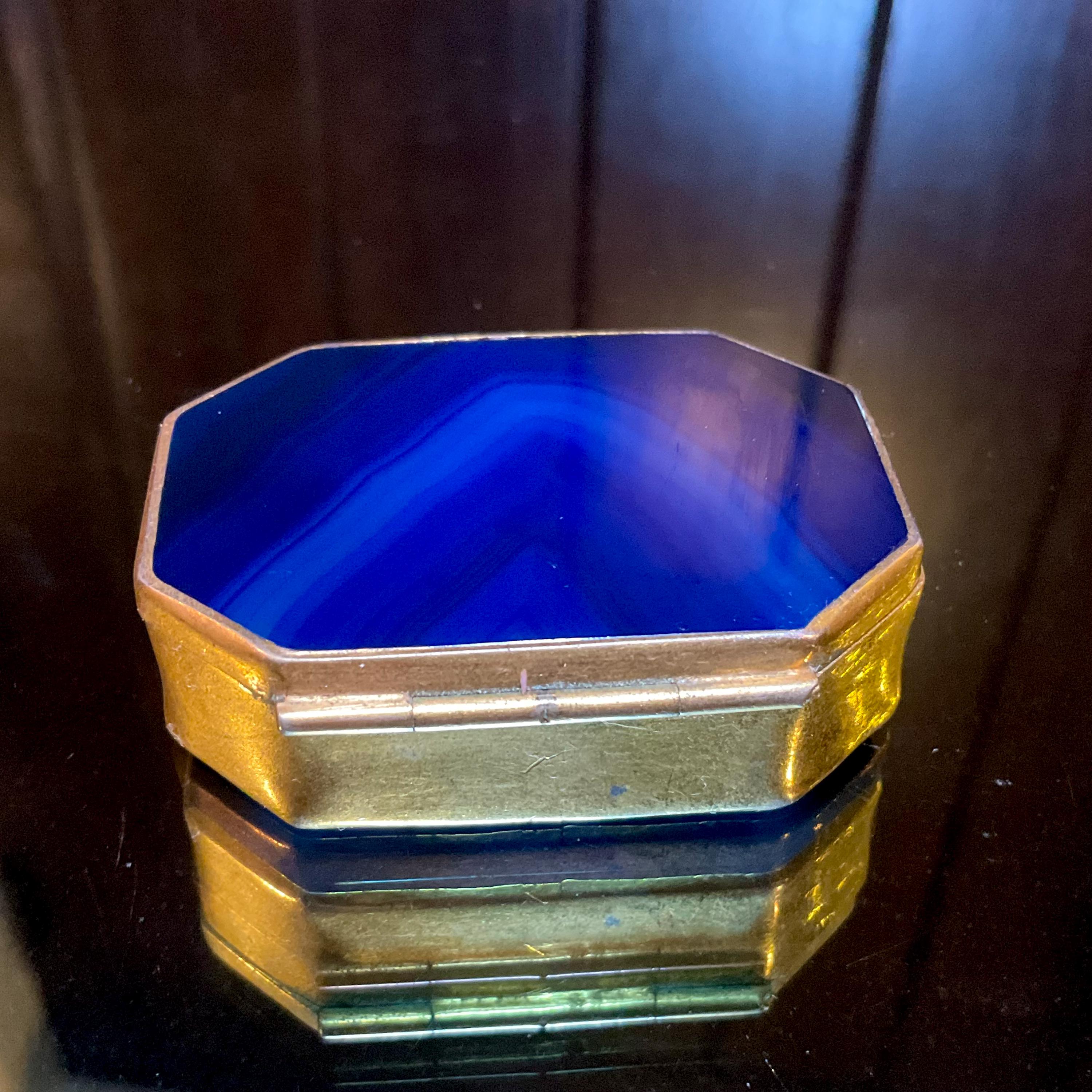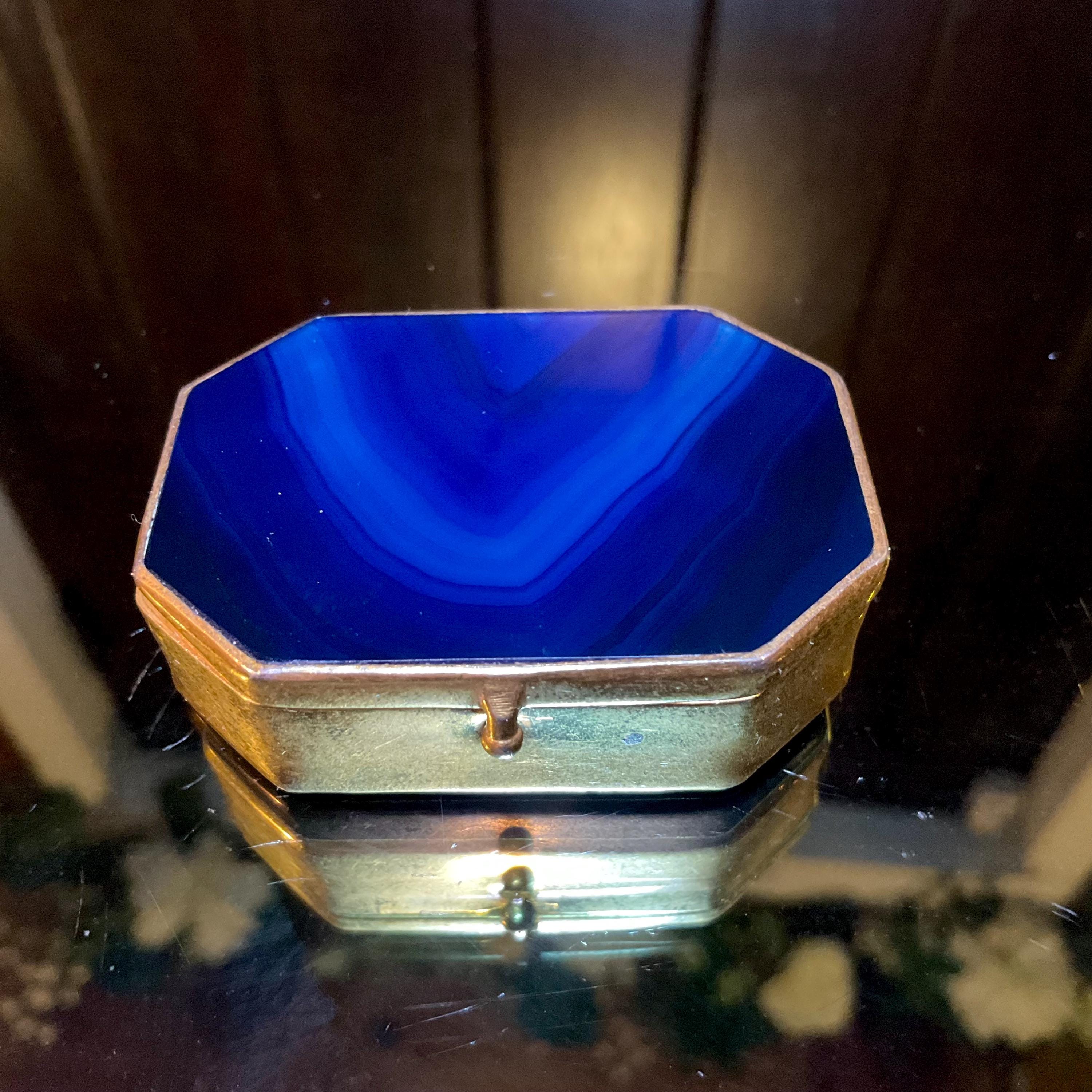 This elegant trinket or snuff box is made from gold metal and colorful blue agate, featuring beautifully detailed craftsmanship and a sophisticated design.