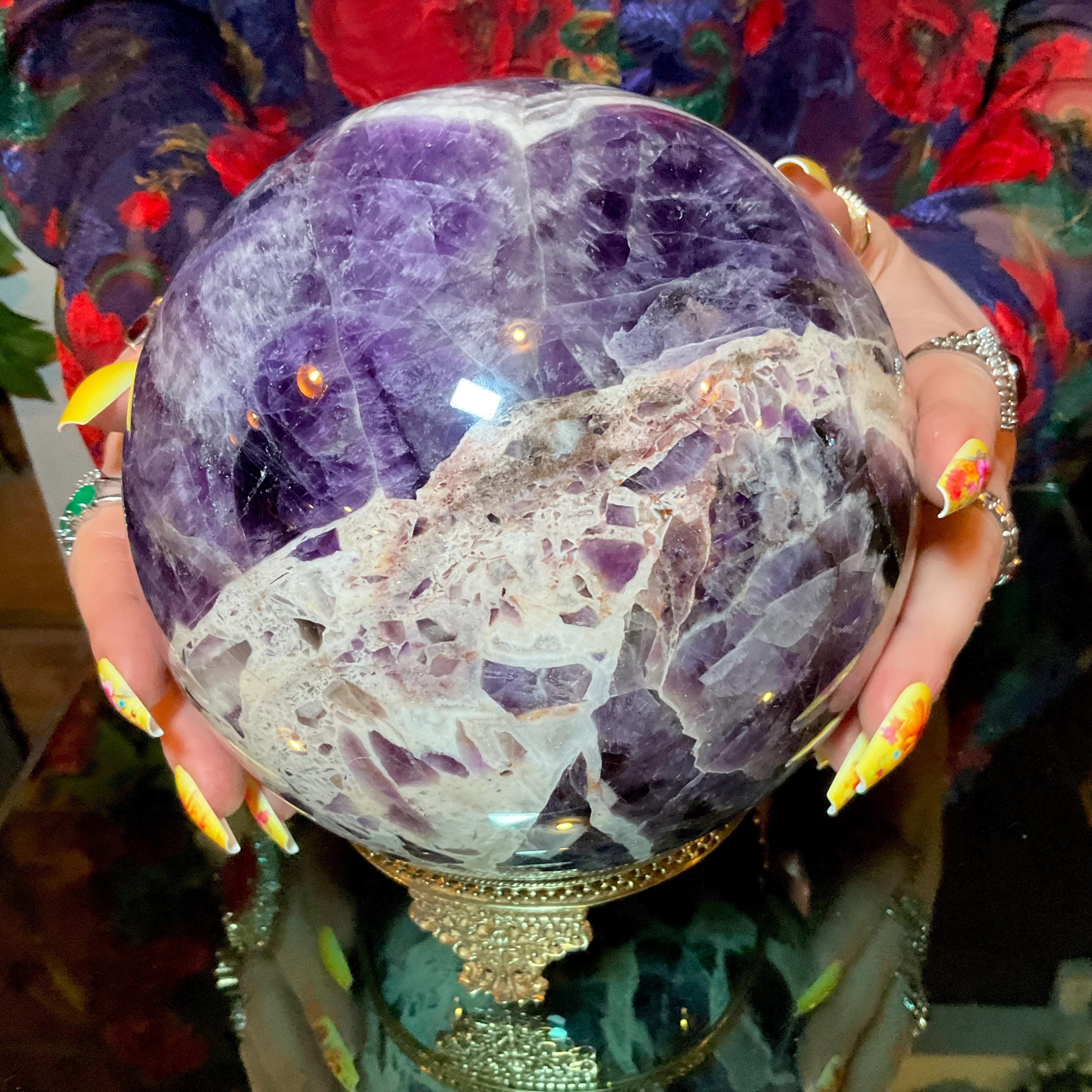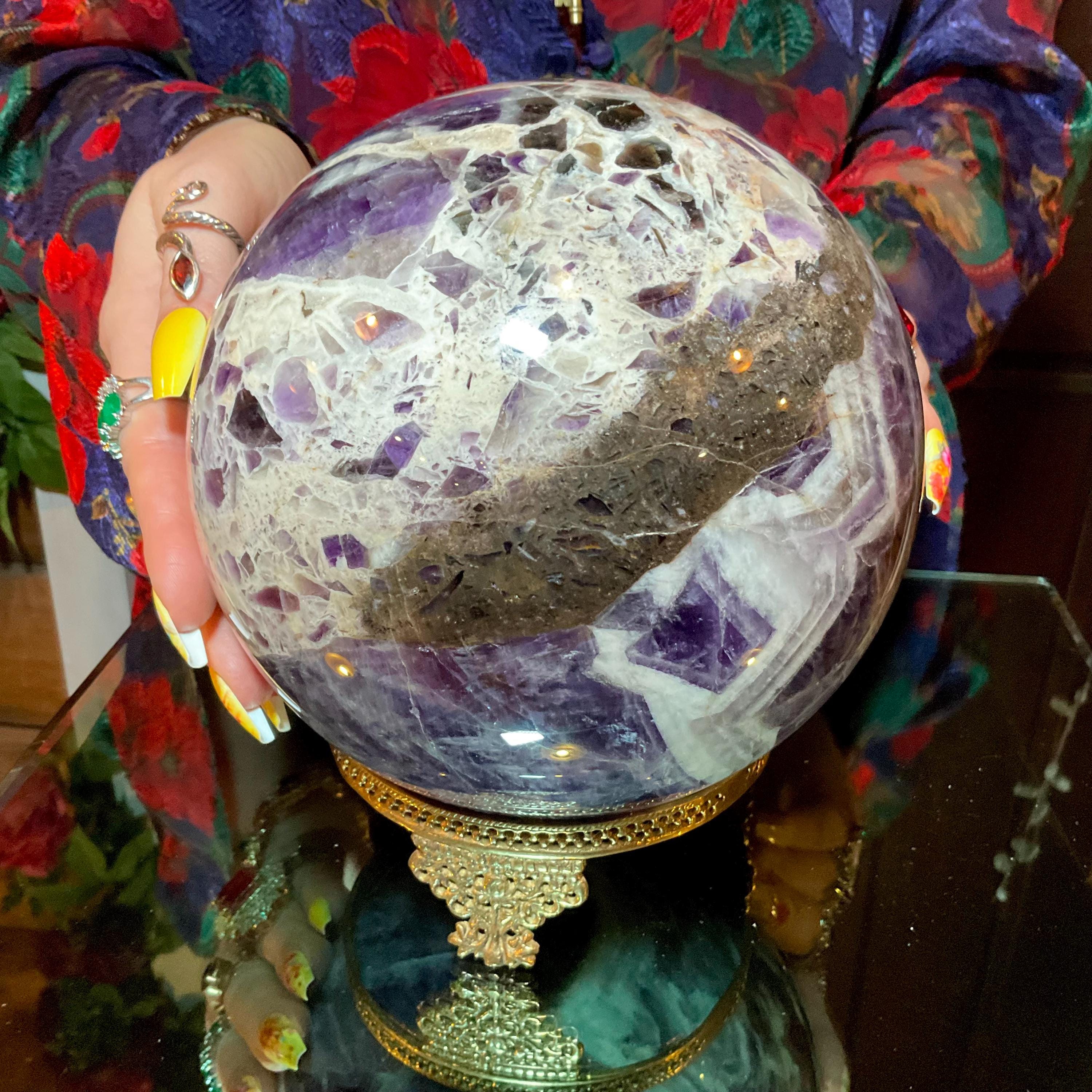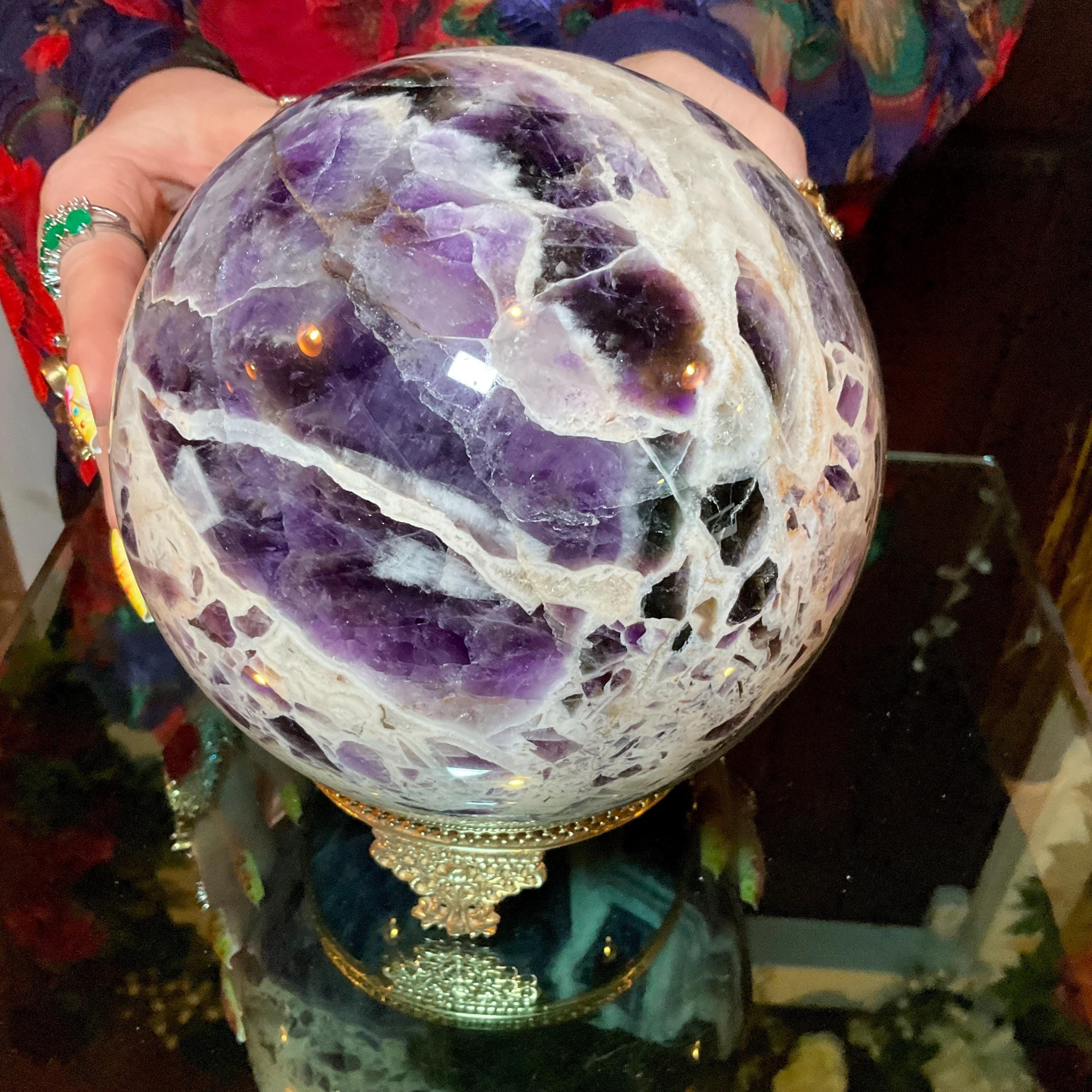 Amethyst Crystal Ball with Display Stand ~ Large 12 Lb. 12 oz. ~ 6" Wide ~ Purple and White Colors ~ Fast & Free Shipping, USA+ Global Shipping