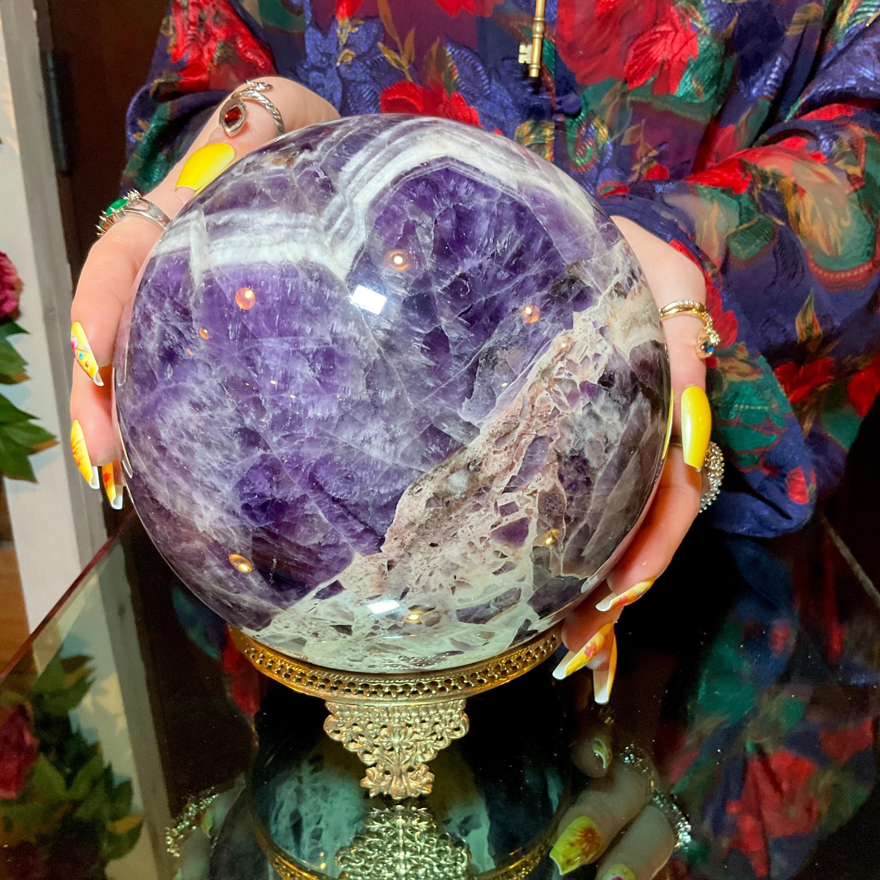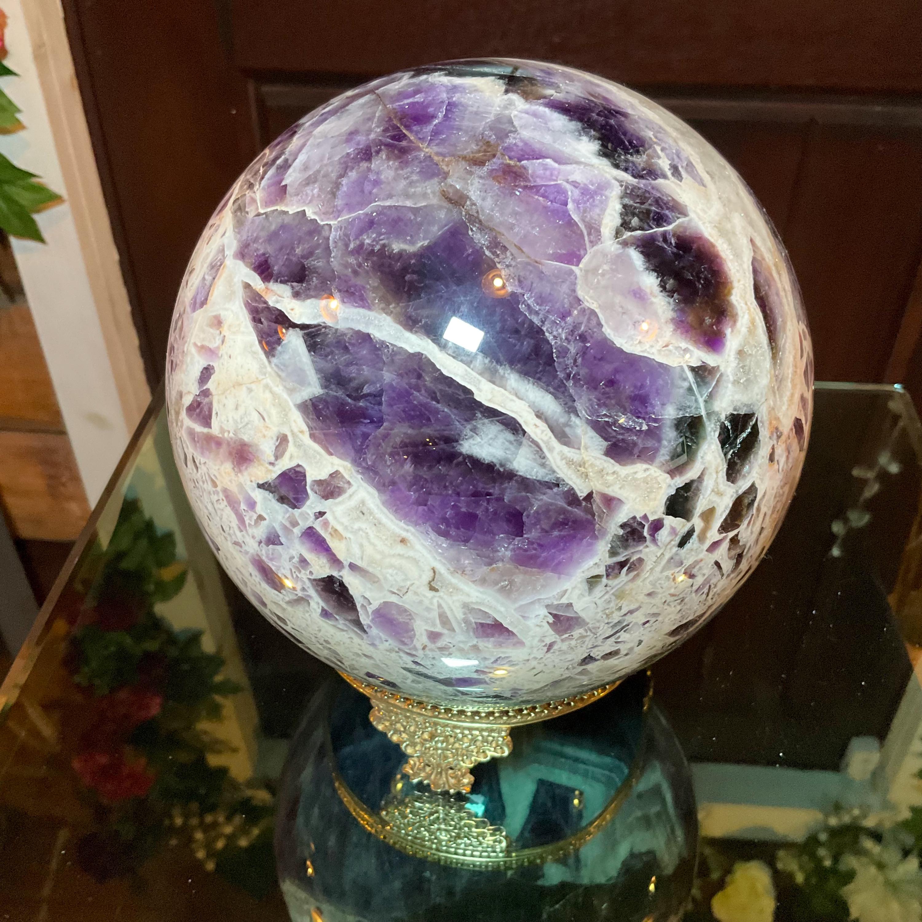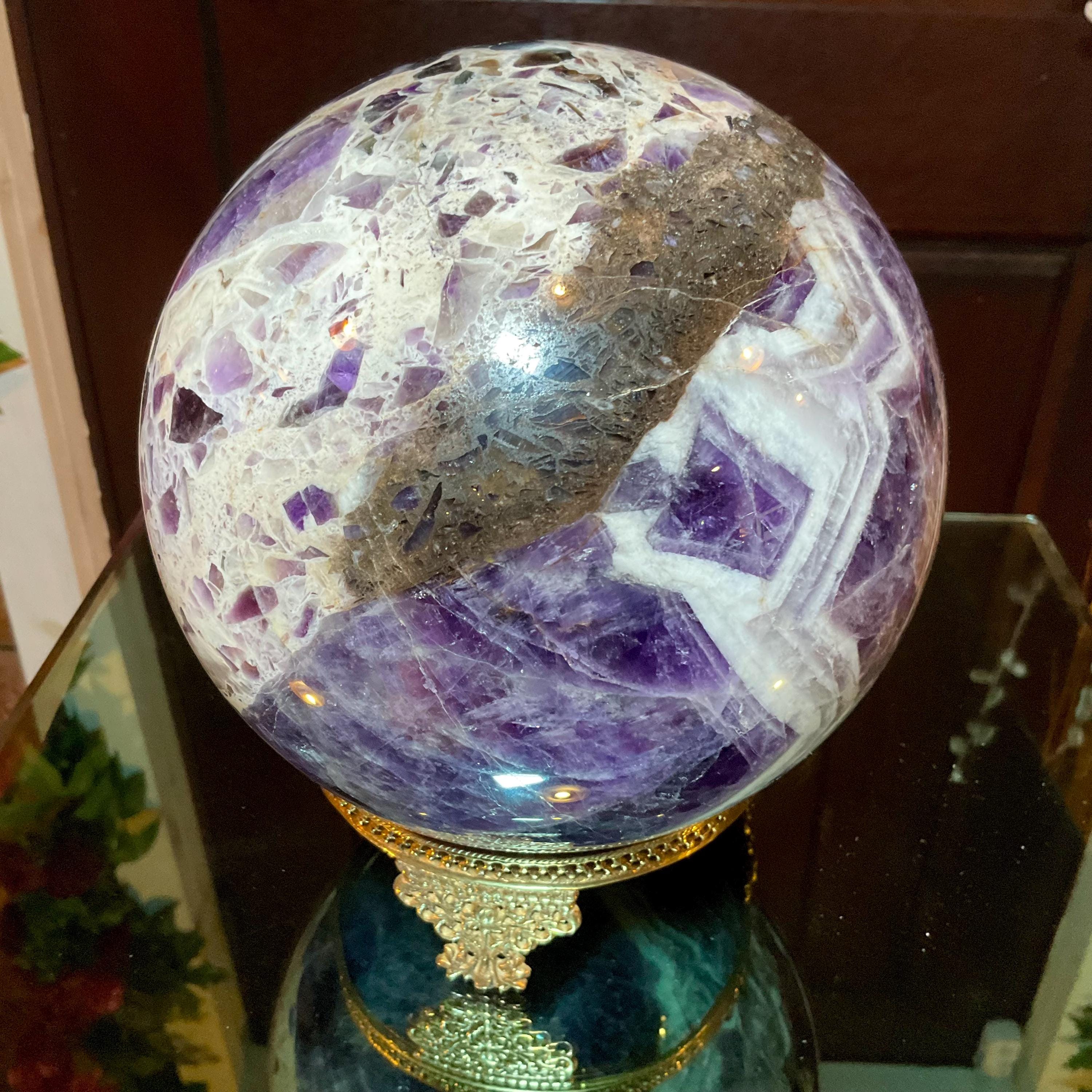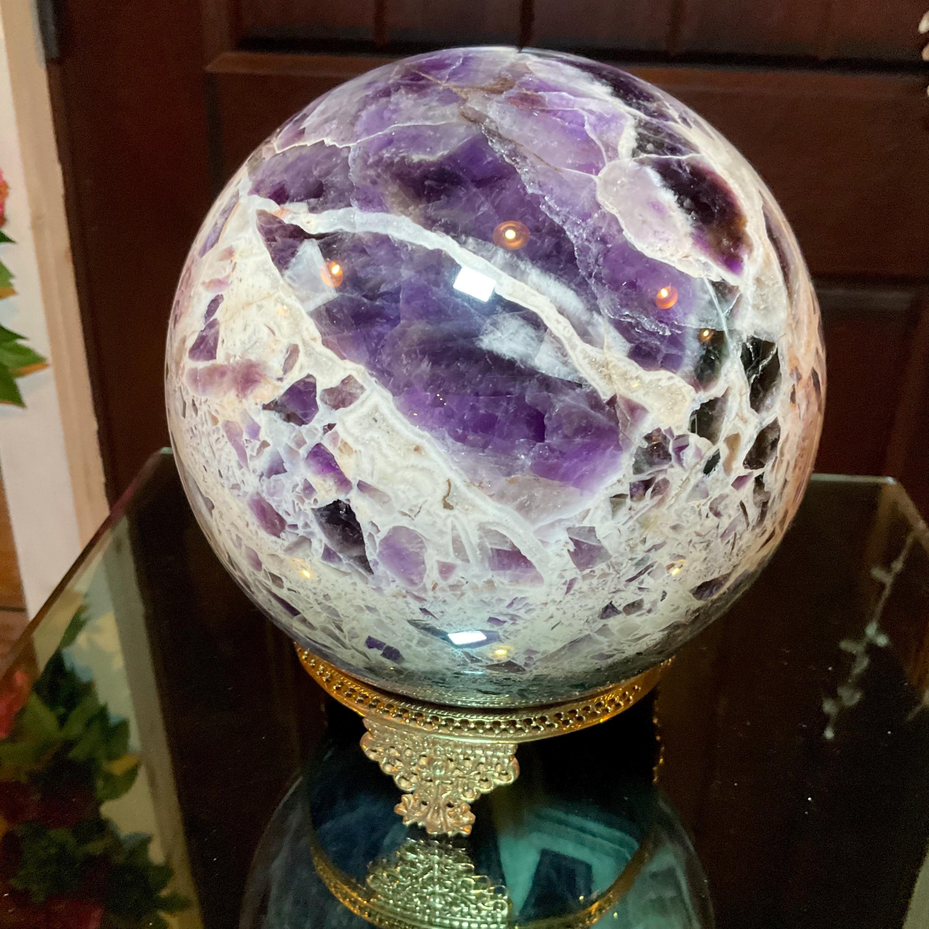 Amethyst Crystal Ball with Brass Display Stand ~ Large 12 Lb. 12 oz. ~ 6" Wide ~ Purple and White Colors ~ Fast & Free Shipping, USA