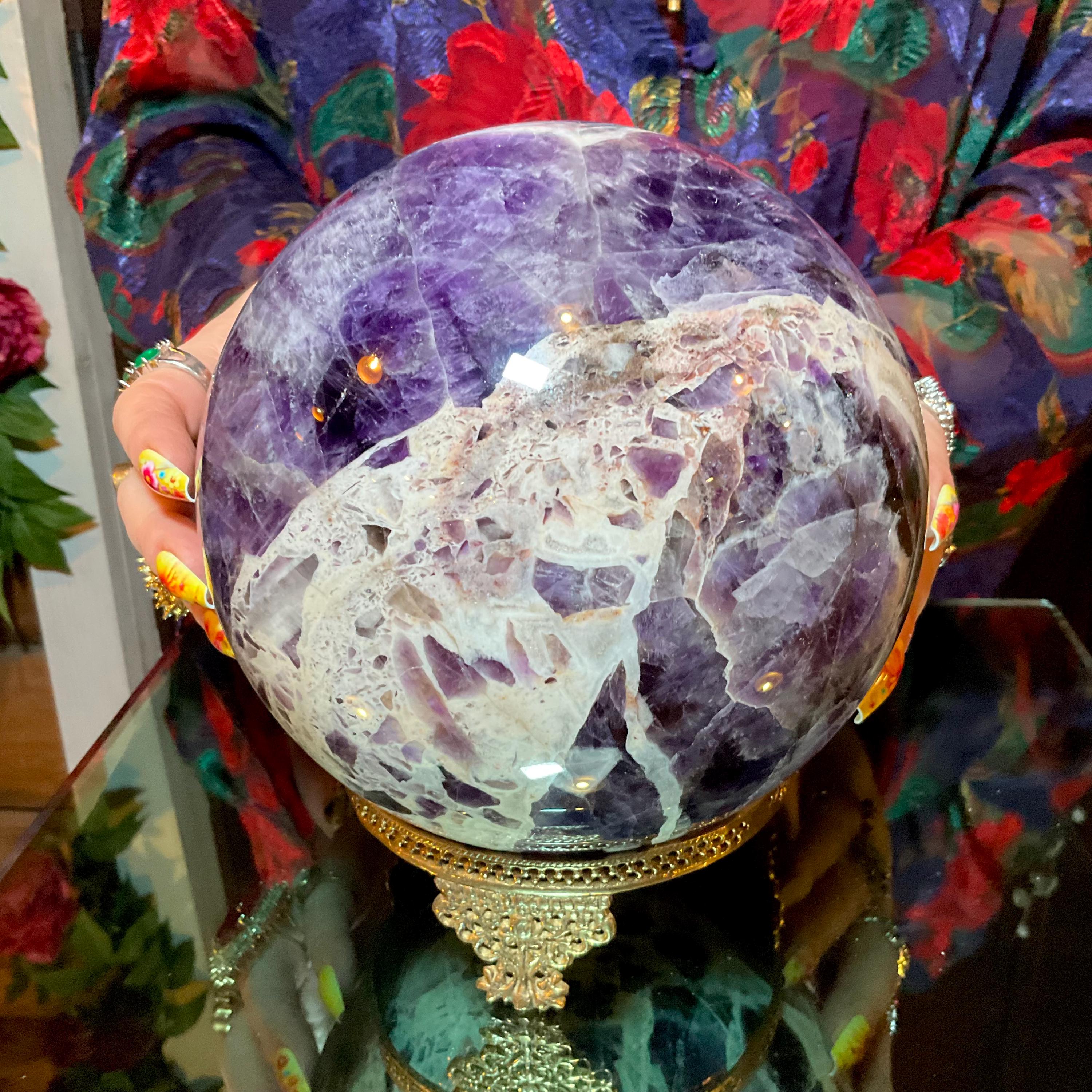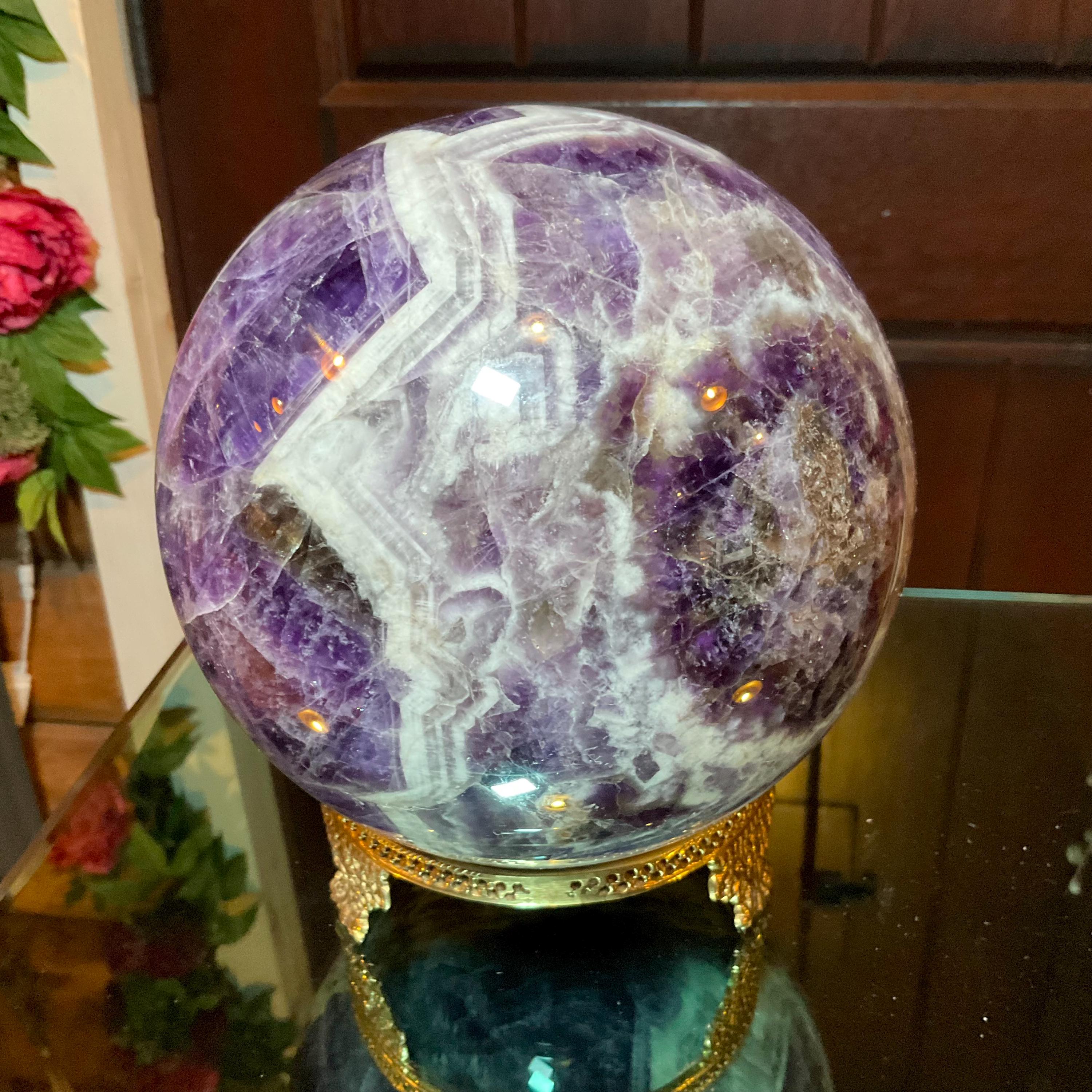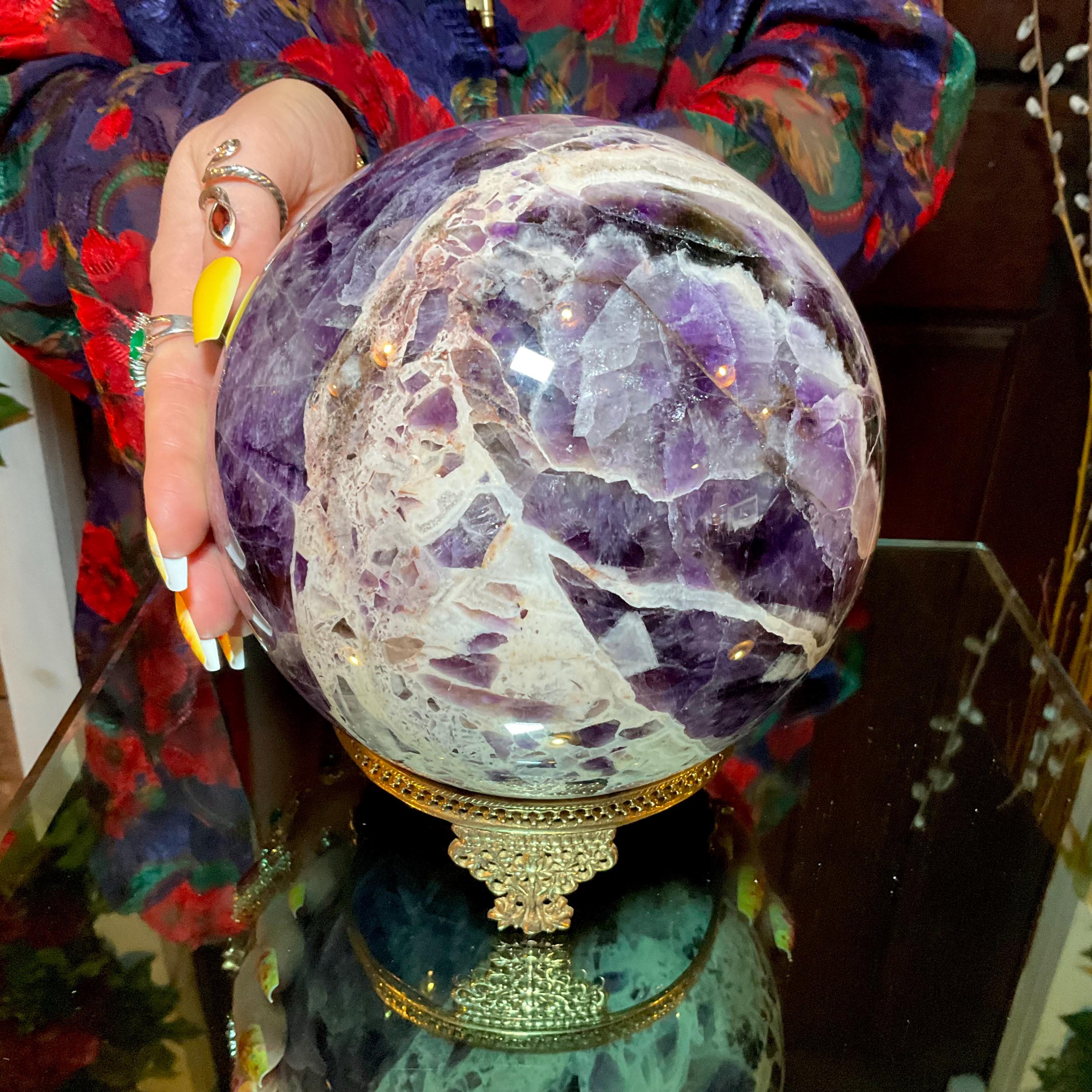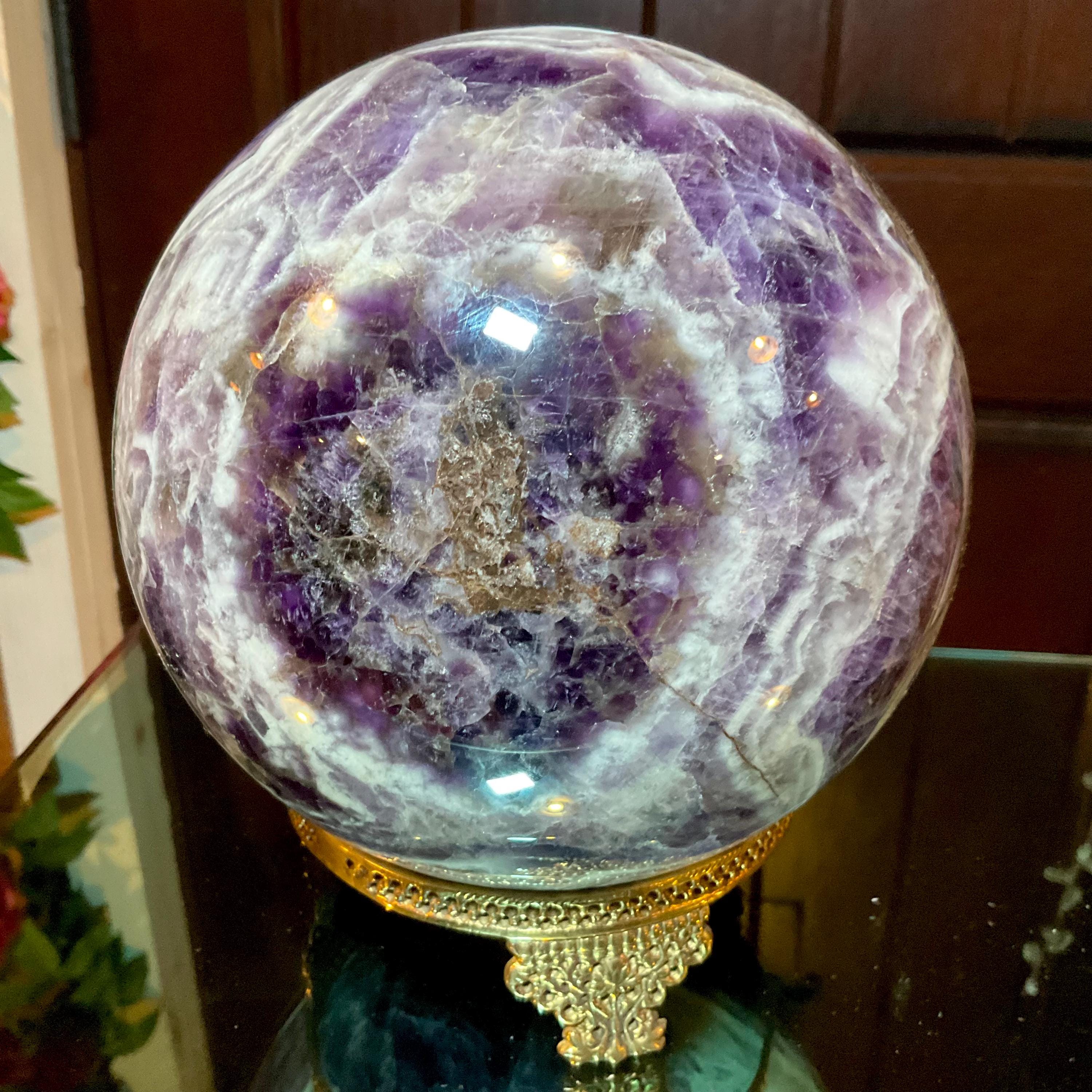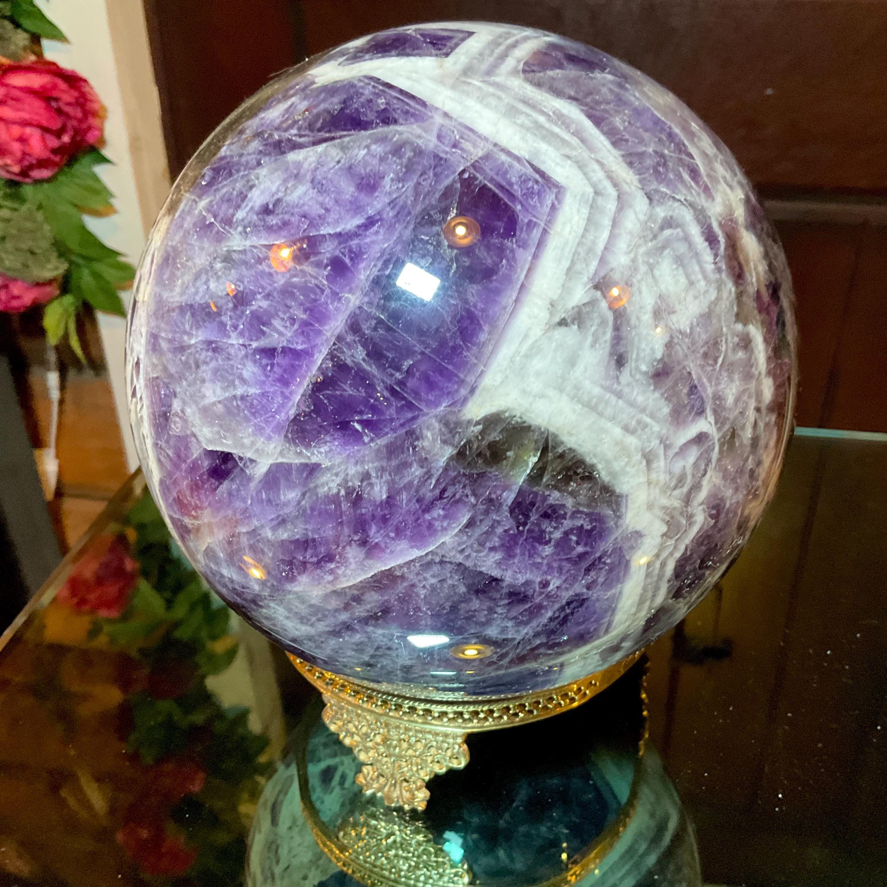 Amethyst Crystal Ball with Brass Display Stand ~ Large 12 Lb. 12 oz. ~ 6" Wide ~ Purple and White Colors ~ Fast & Free Shipping, USA