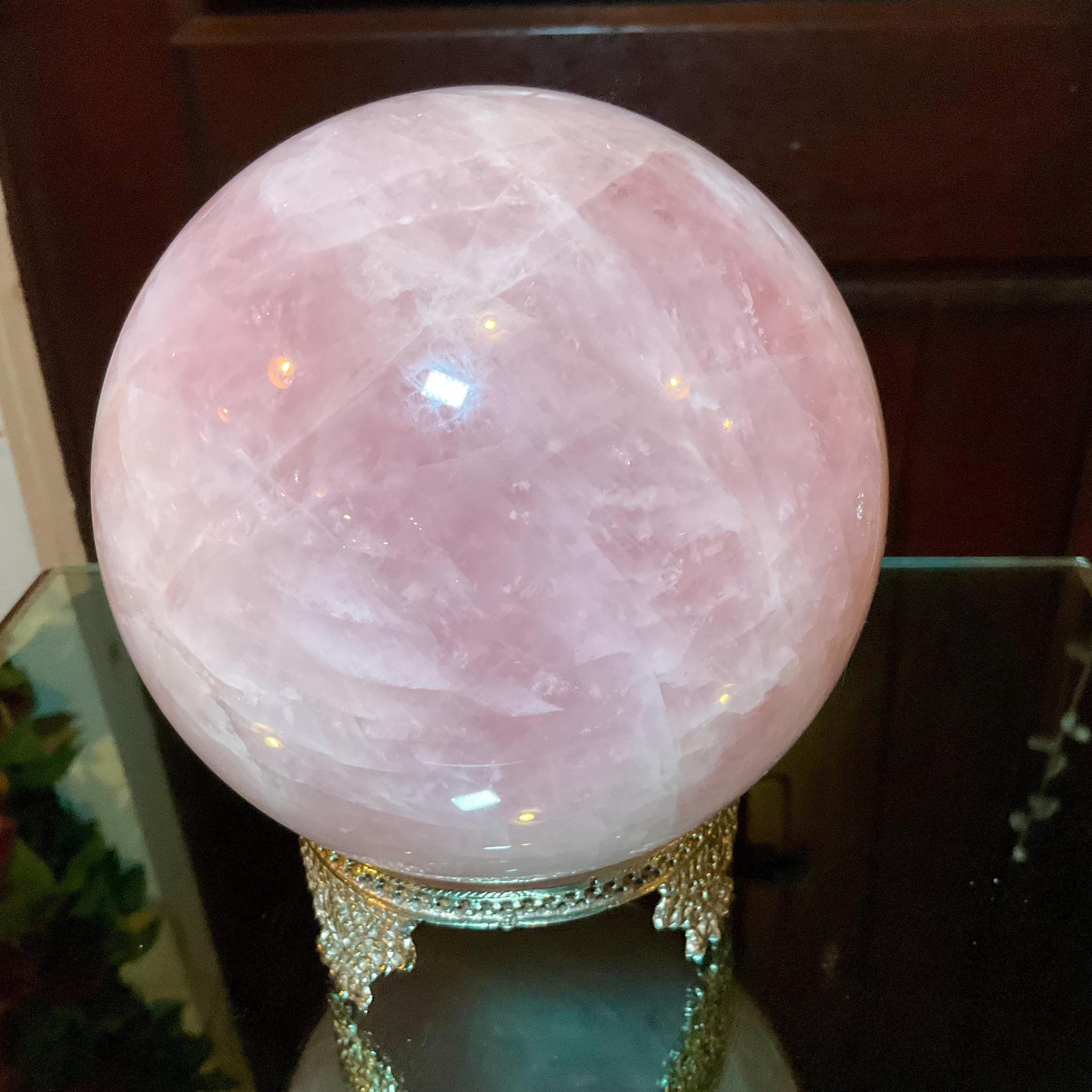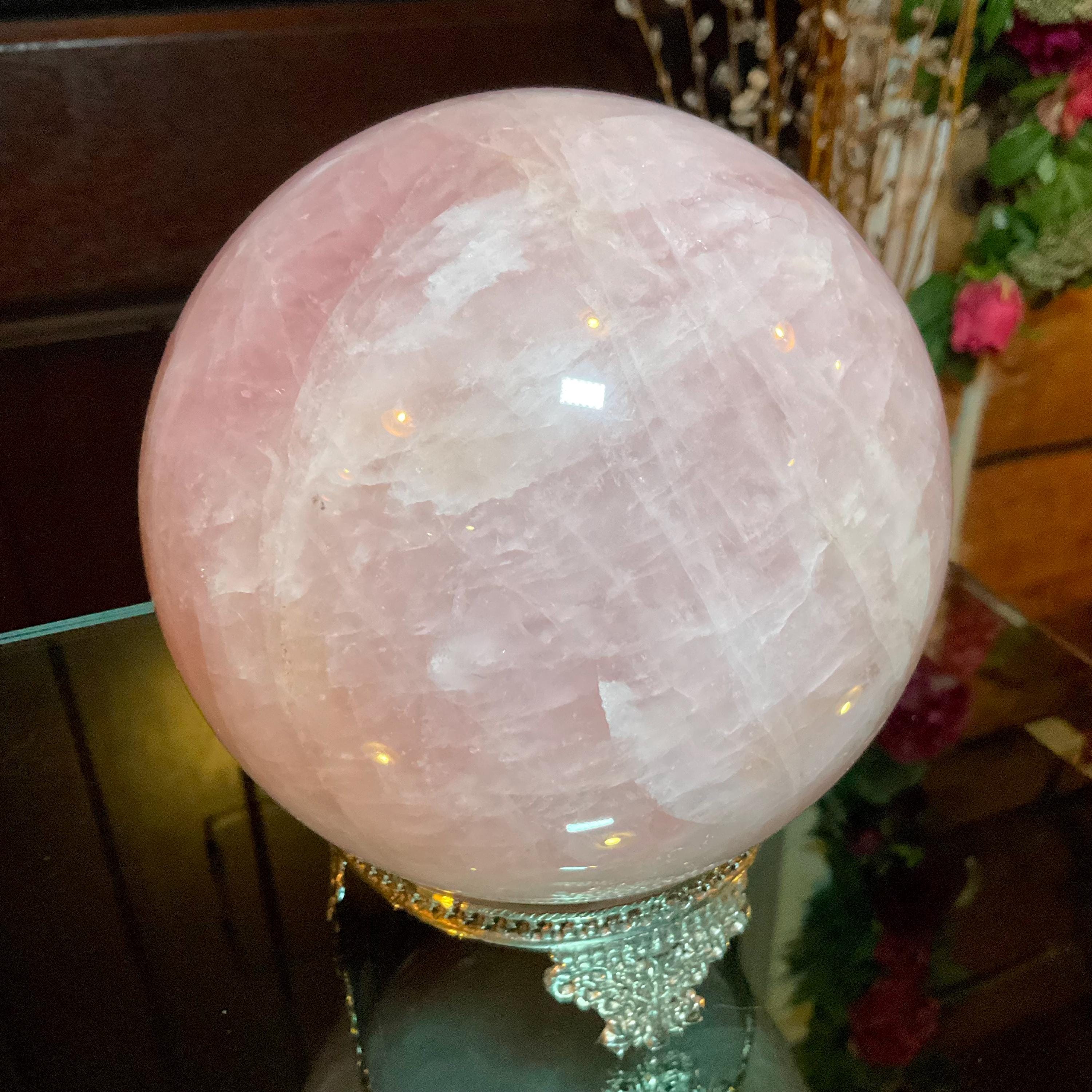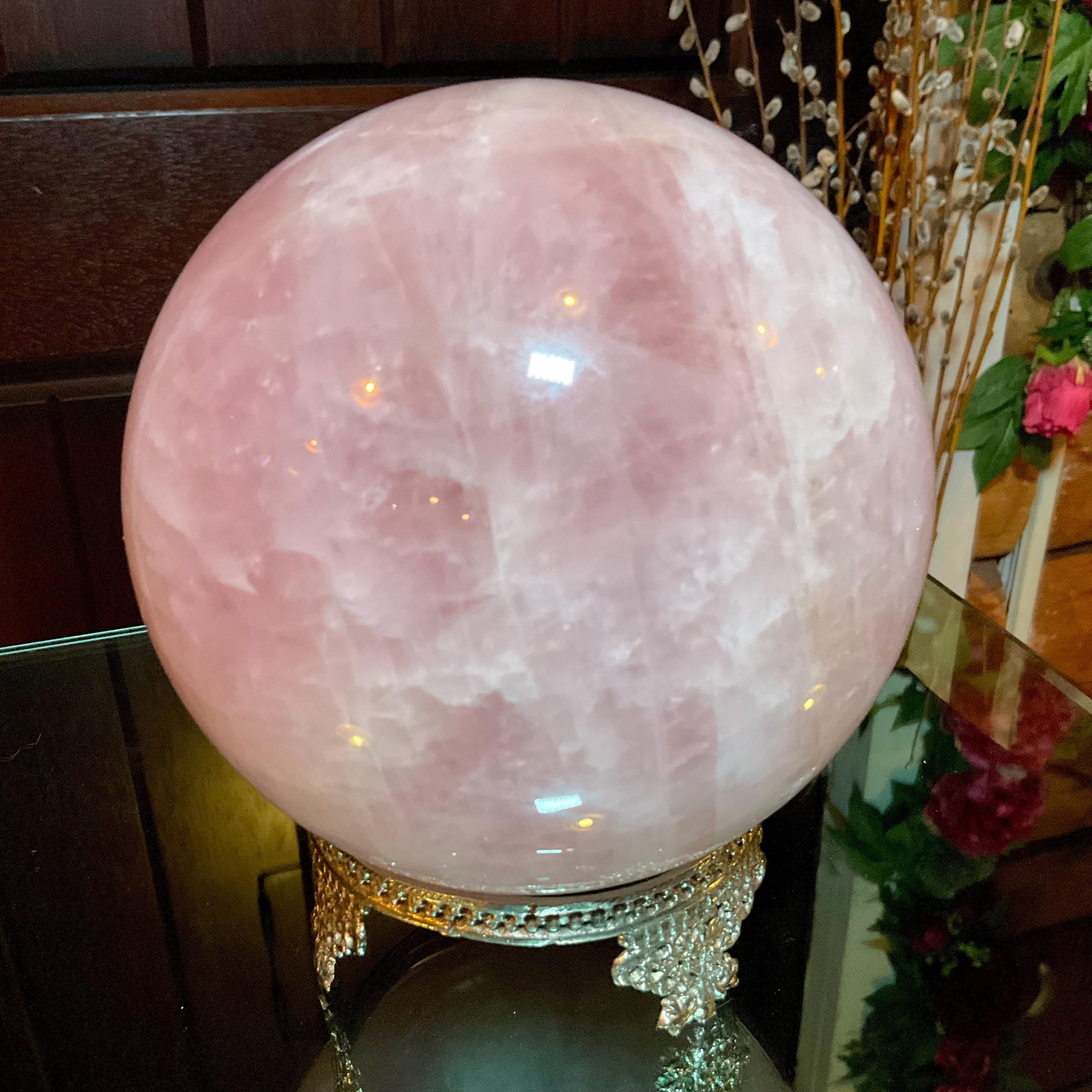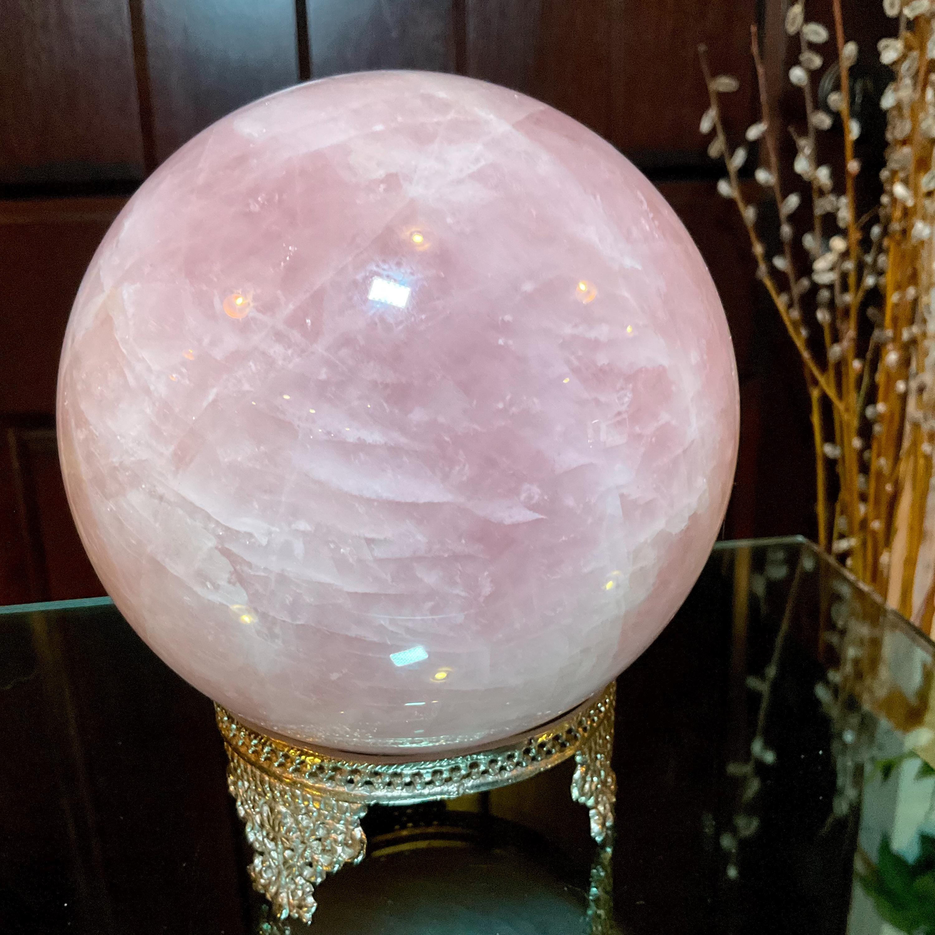 Rose Quartz Crystal Ball with brass display stand ~ Large 6 Lb. 13 oz. 5" Wide ~ Polished Pink Sphere, Reiki Altar Decor