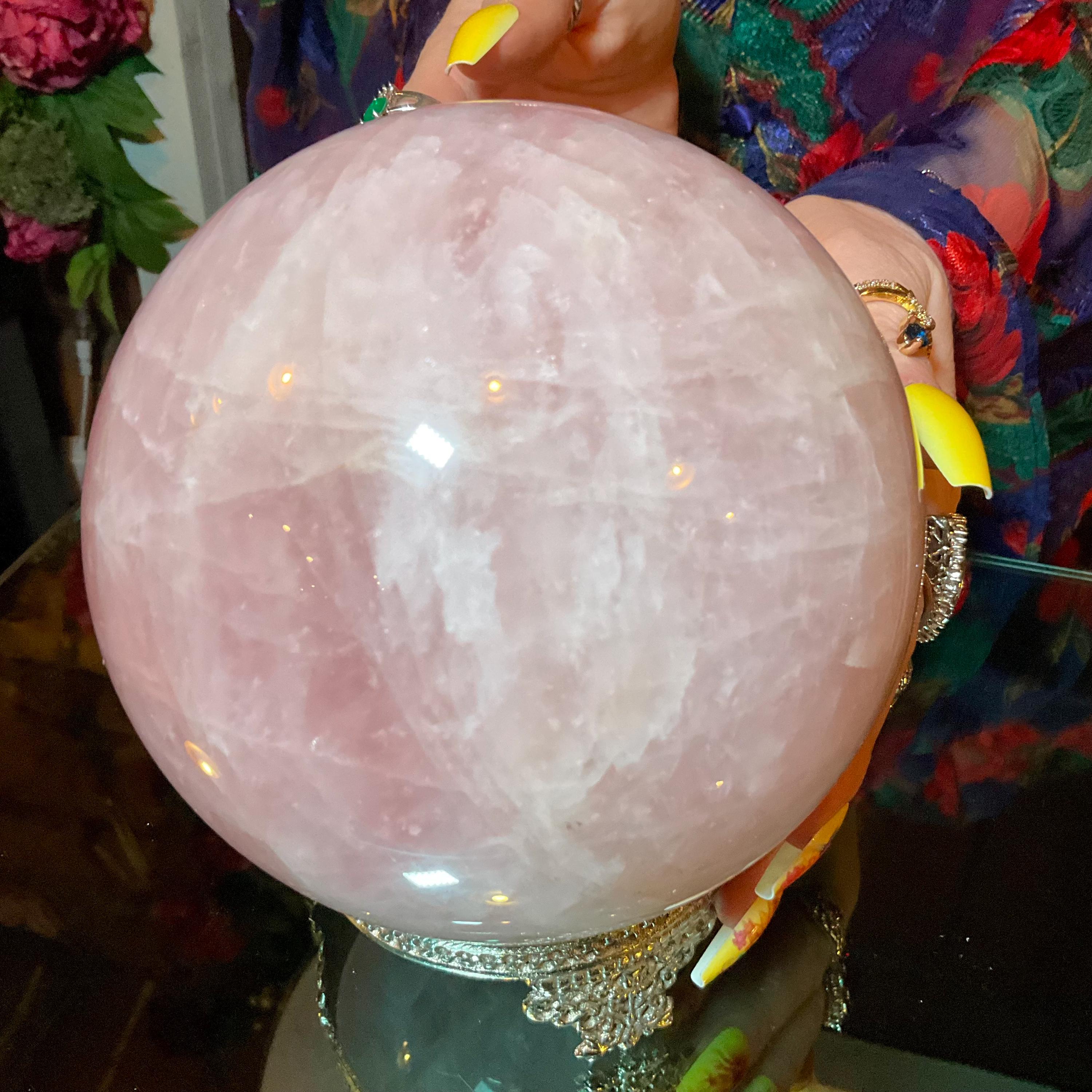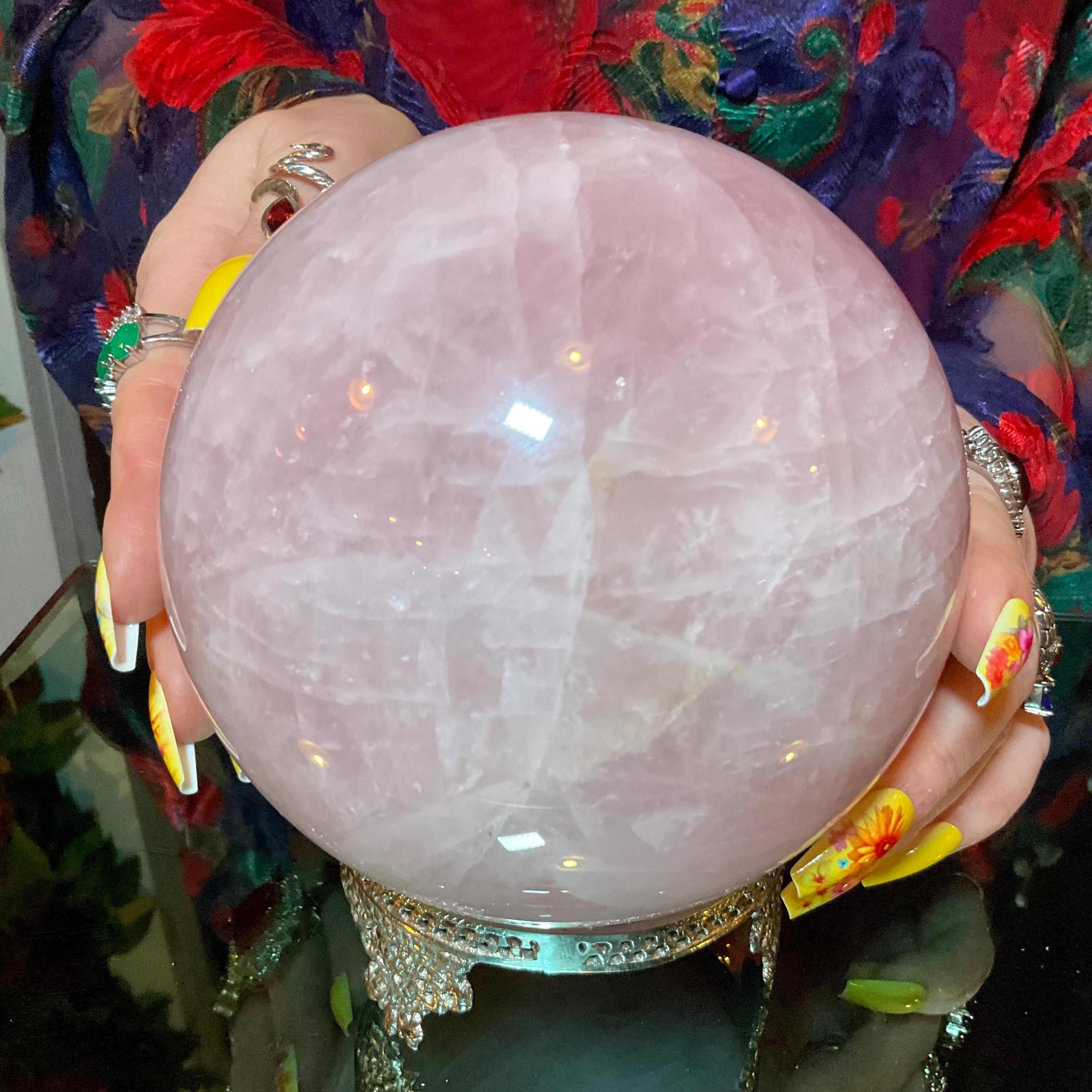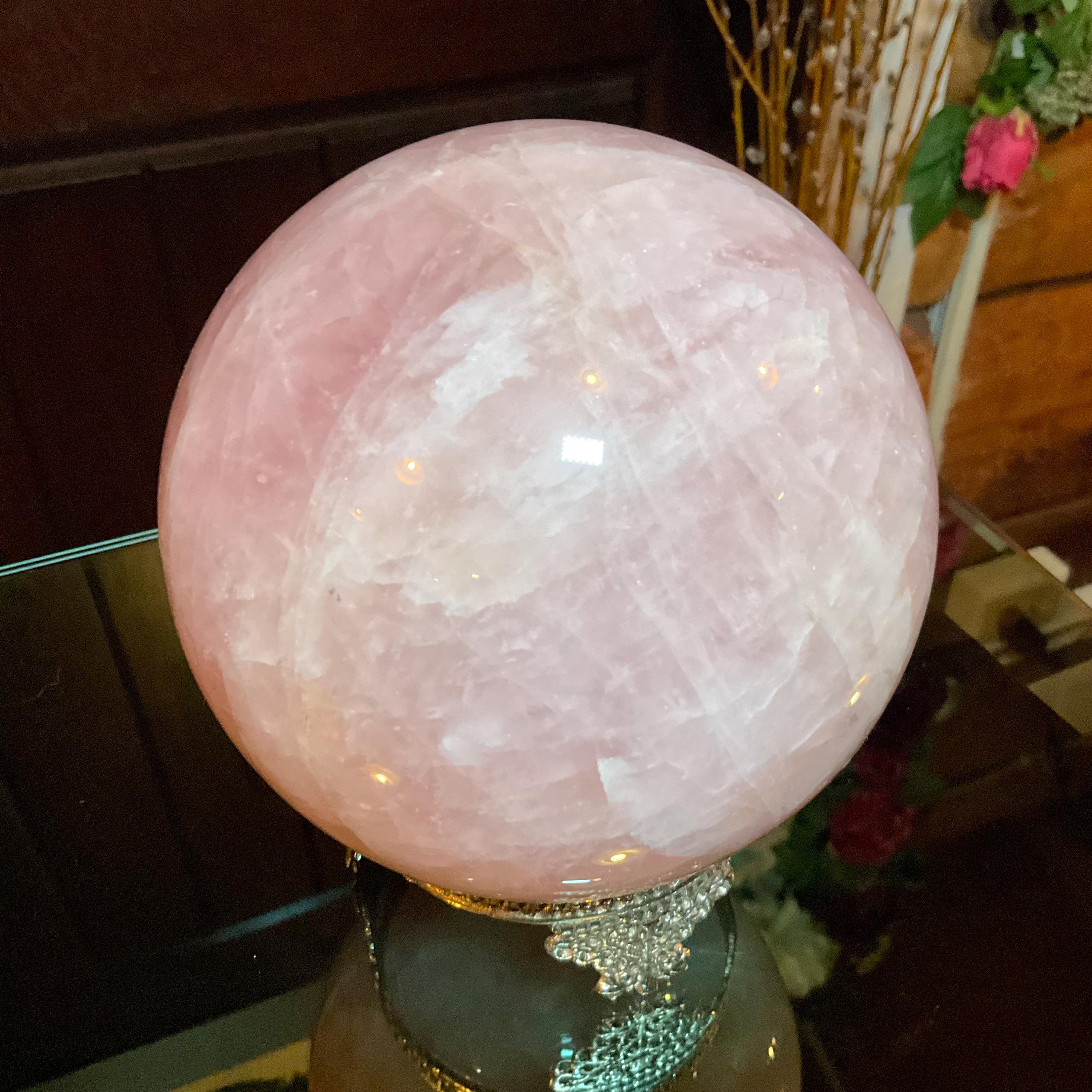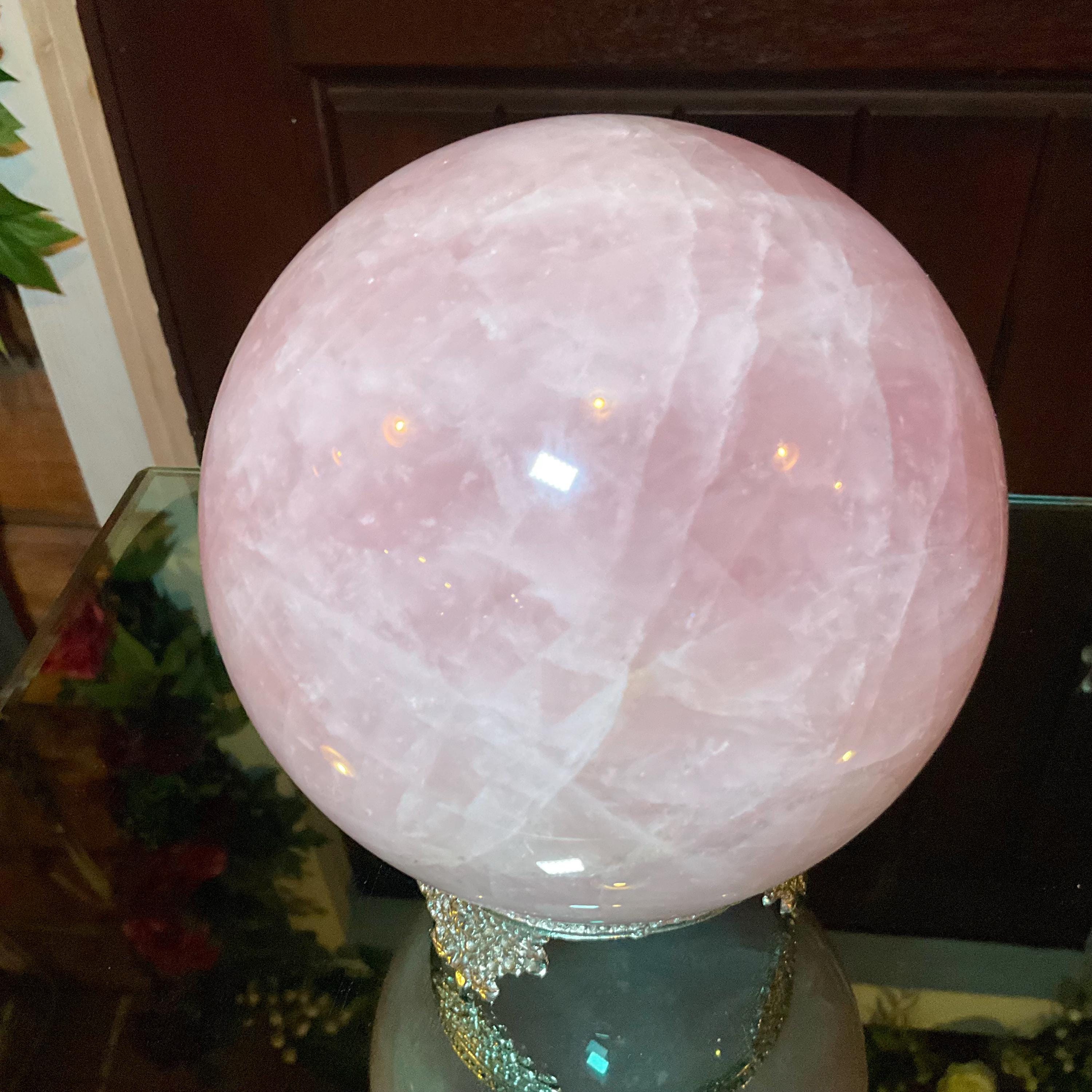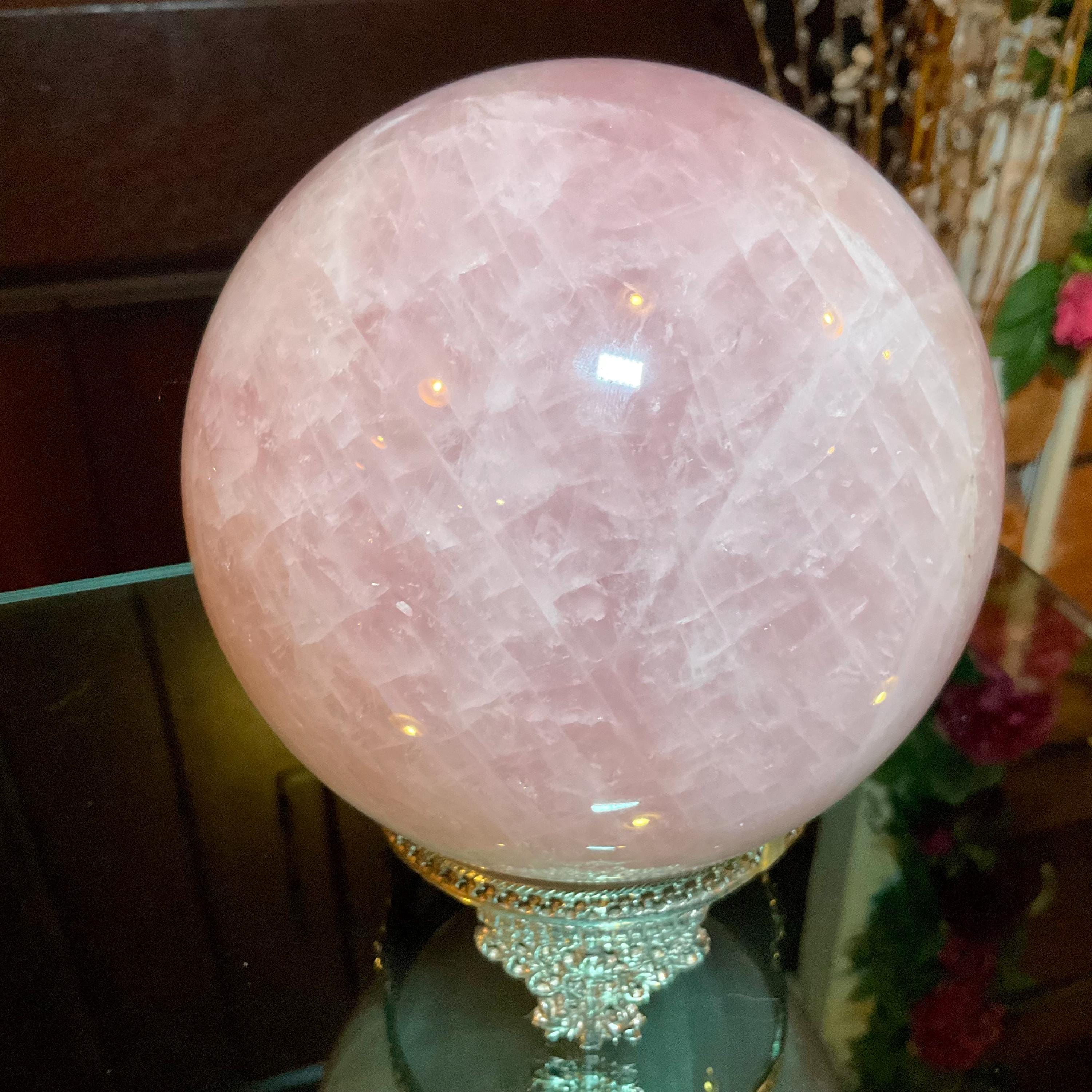 Rose Quartz Crystal Ball with brass display stand ~ Large 6 Lb. 13 oz. 5" Wide ~ Polished Pink Sphere, Reiki Altar Decor