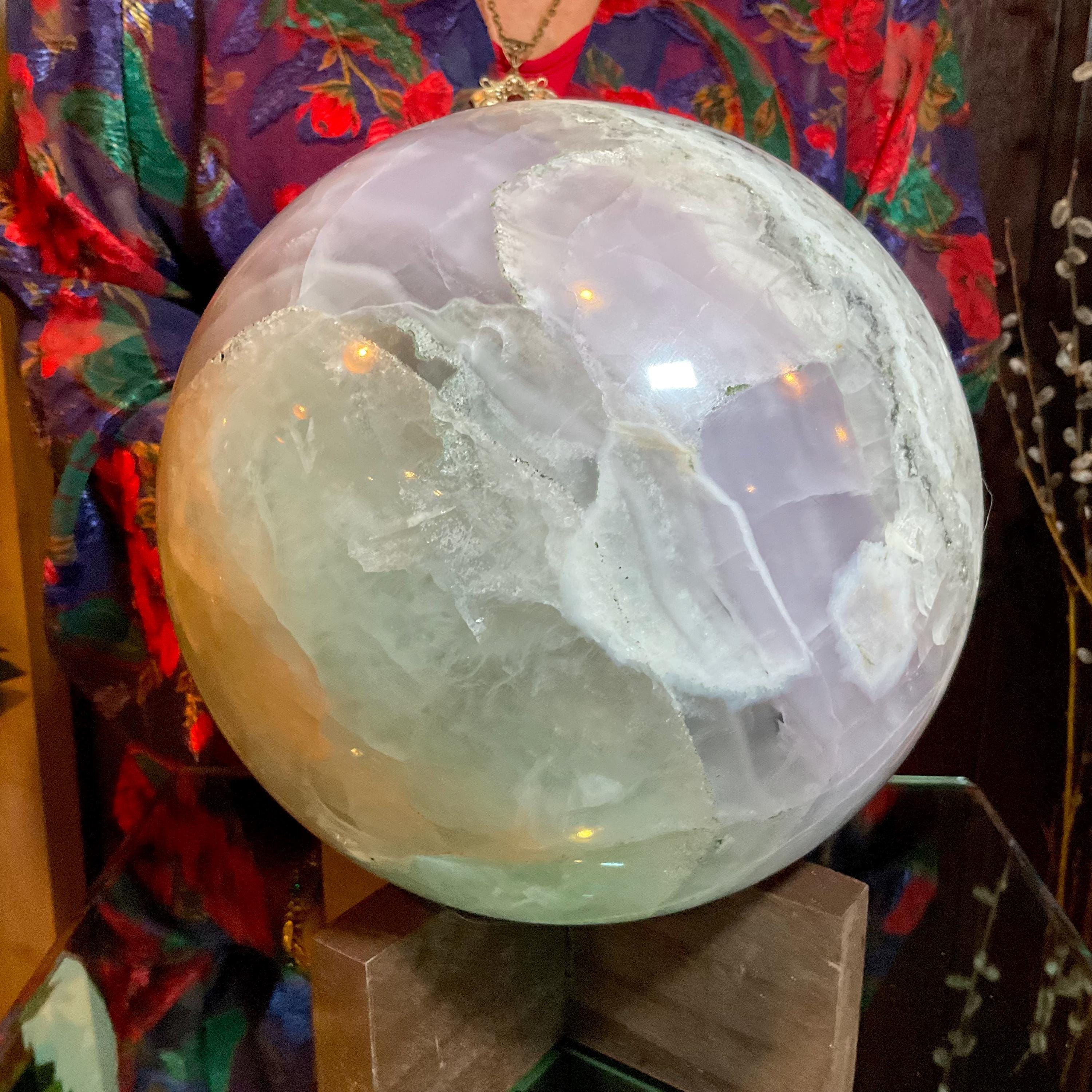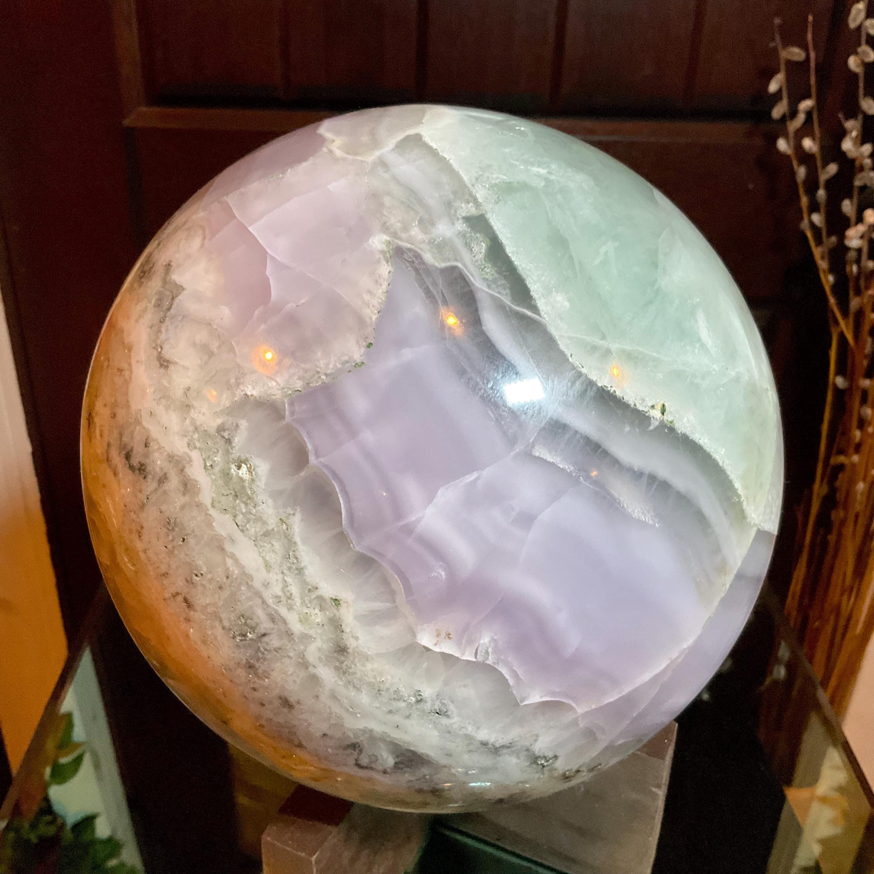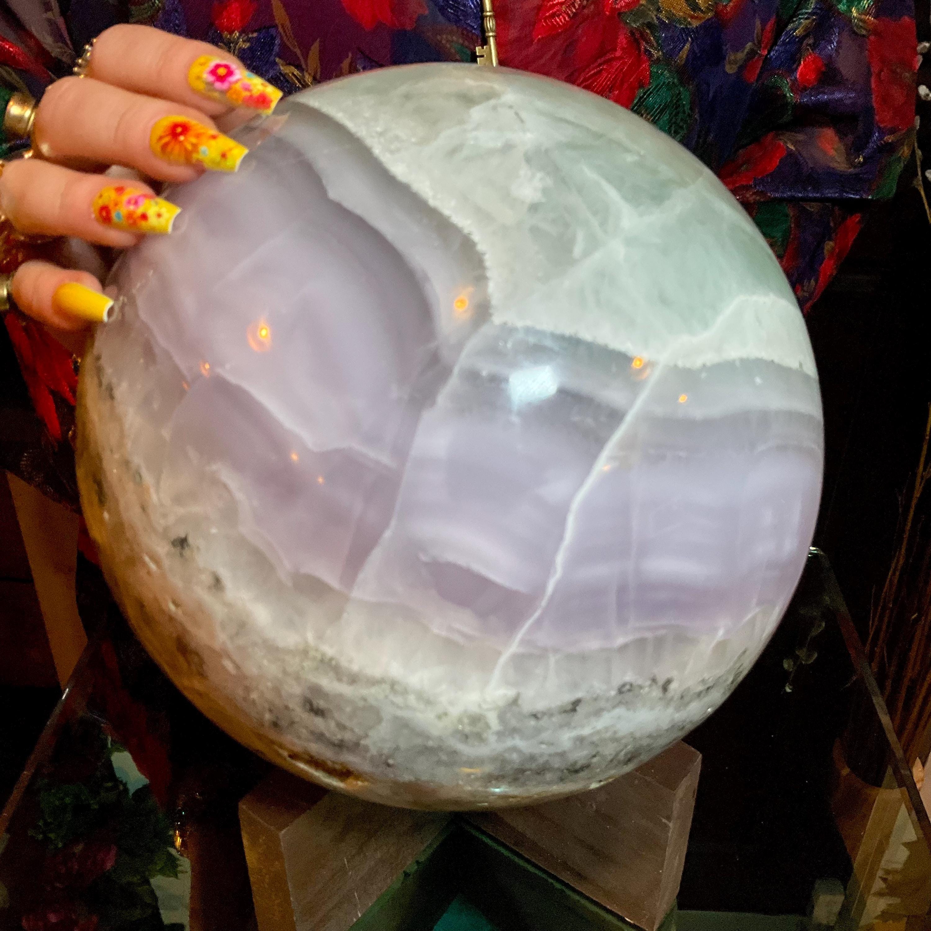 What makes this big sphere so incredible and truly a one of a kind is the colors that swirl throughout the sphere purples, whites and pastel colors blending so naturally and perfectly balanced.