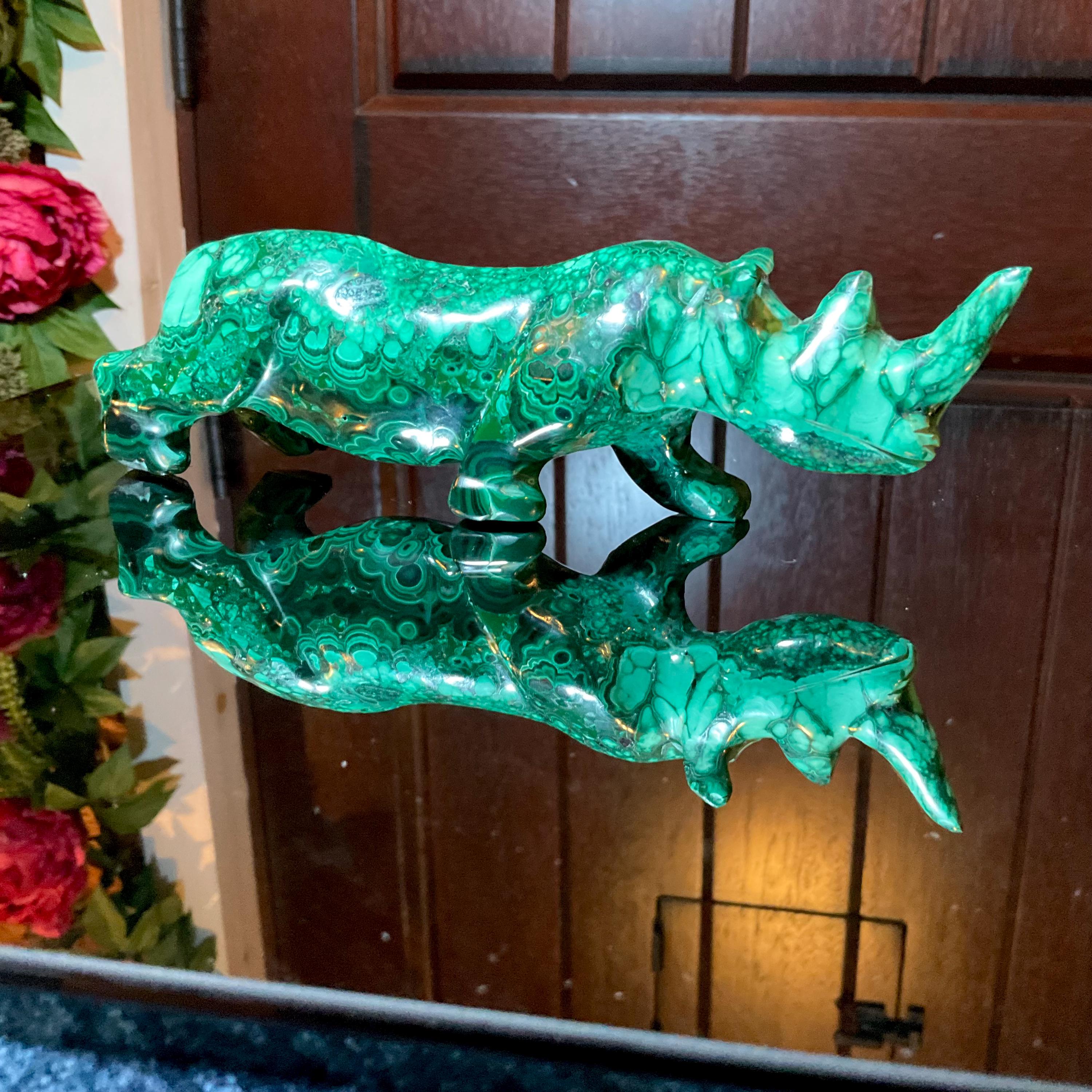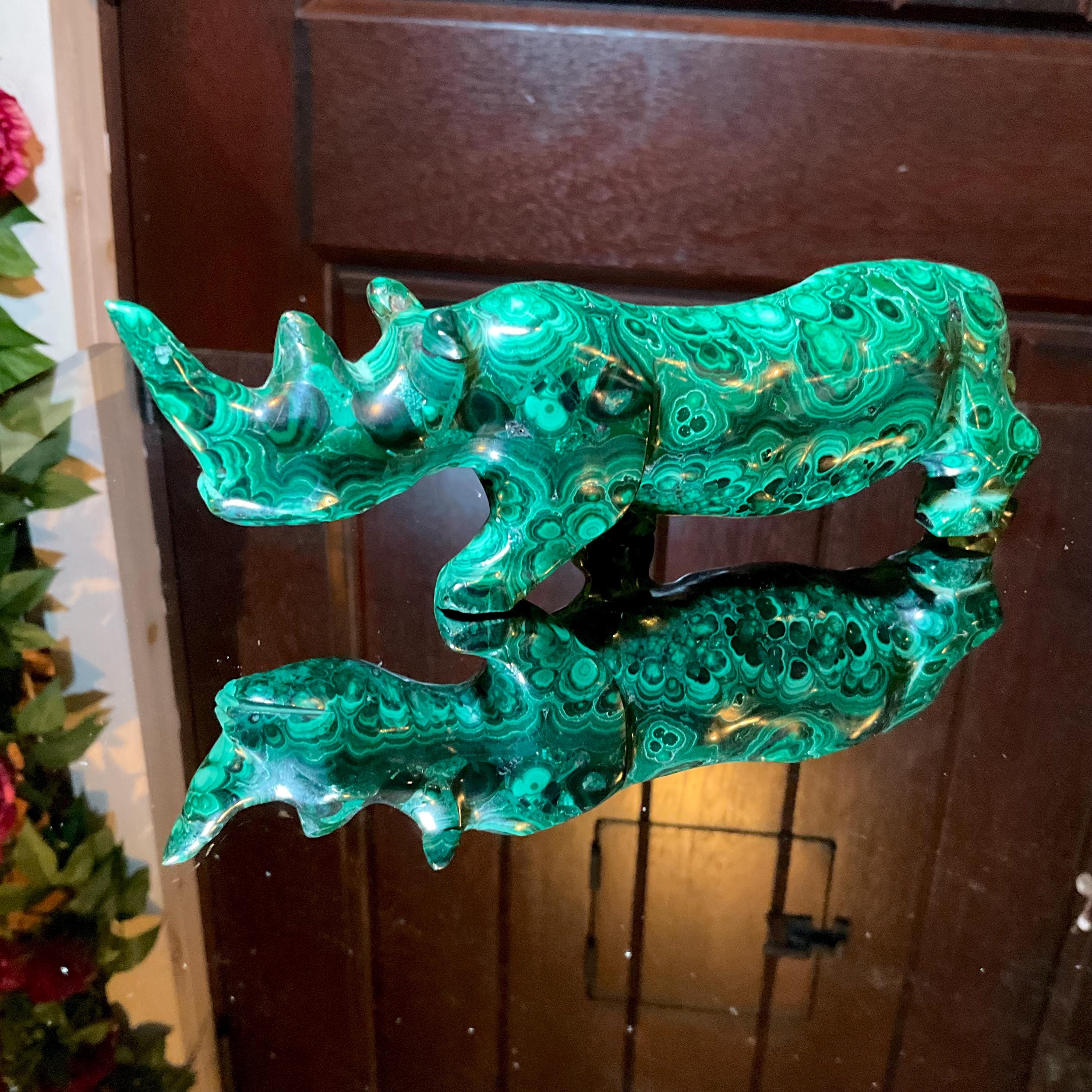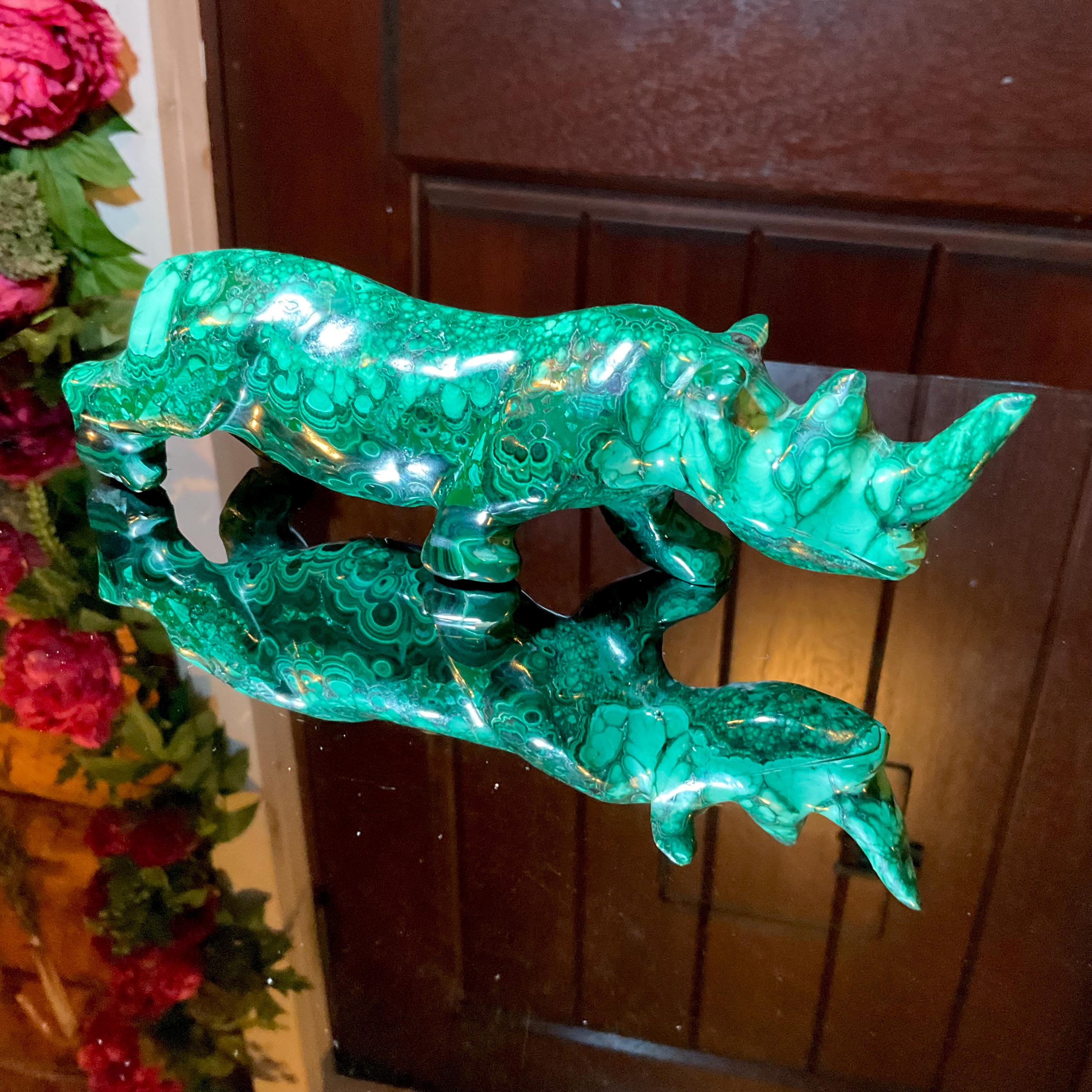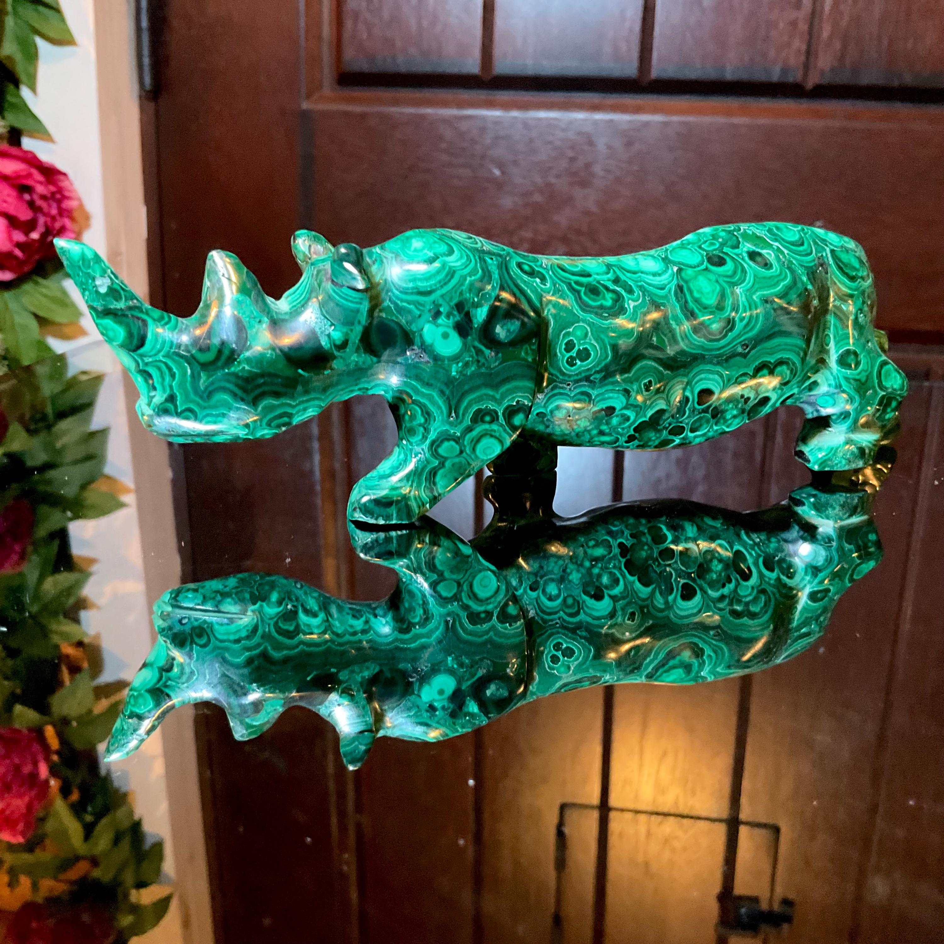 This is a one-of-a-kind carved malachite Rhinoceros.