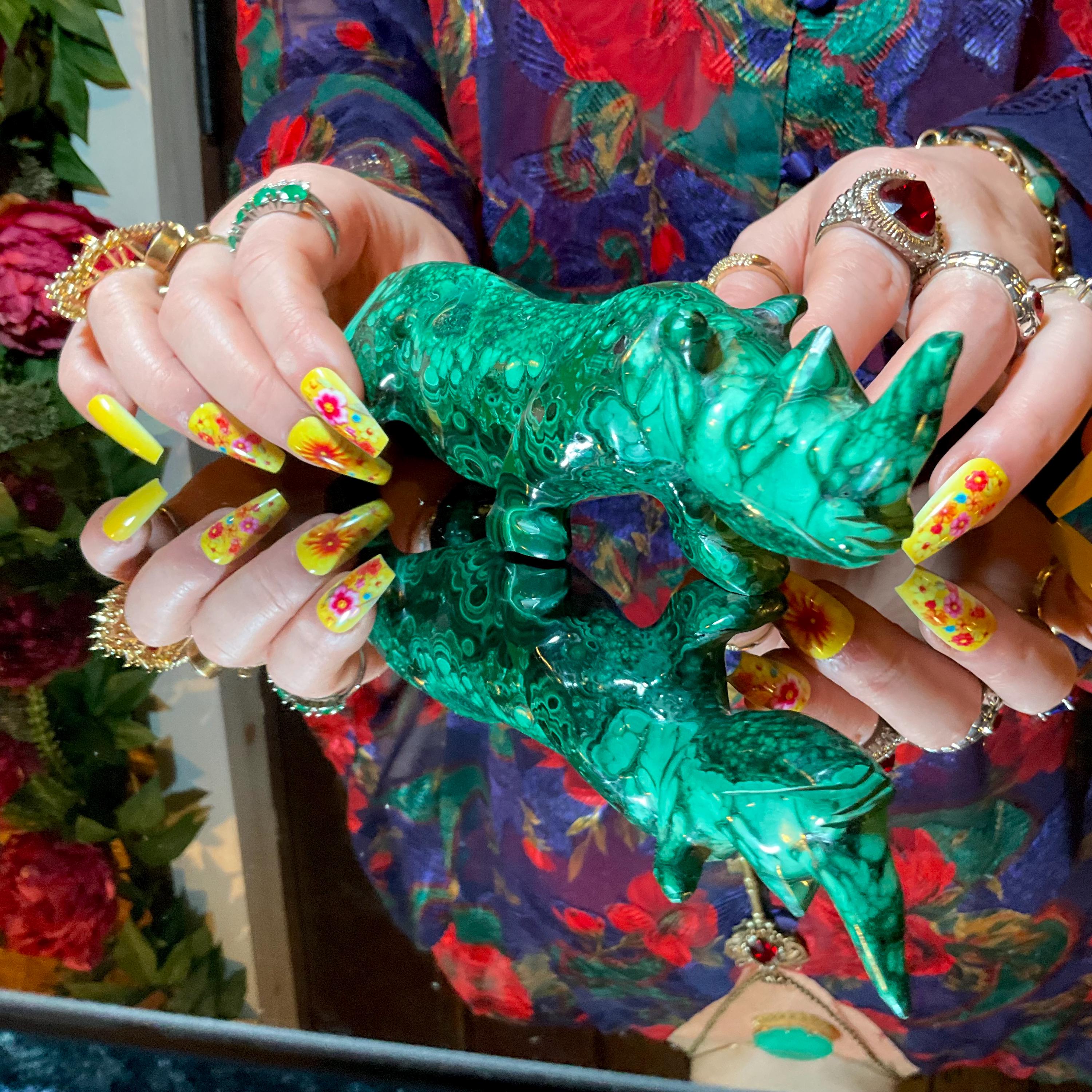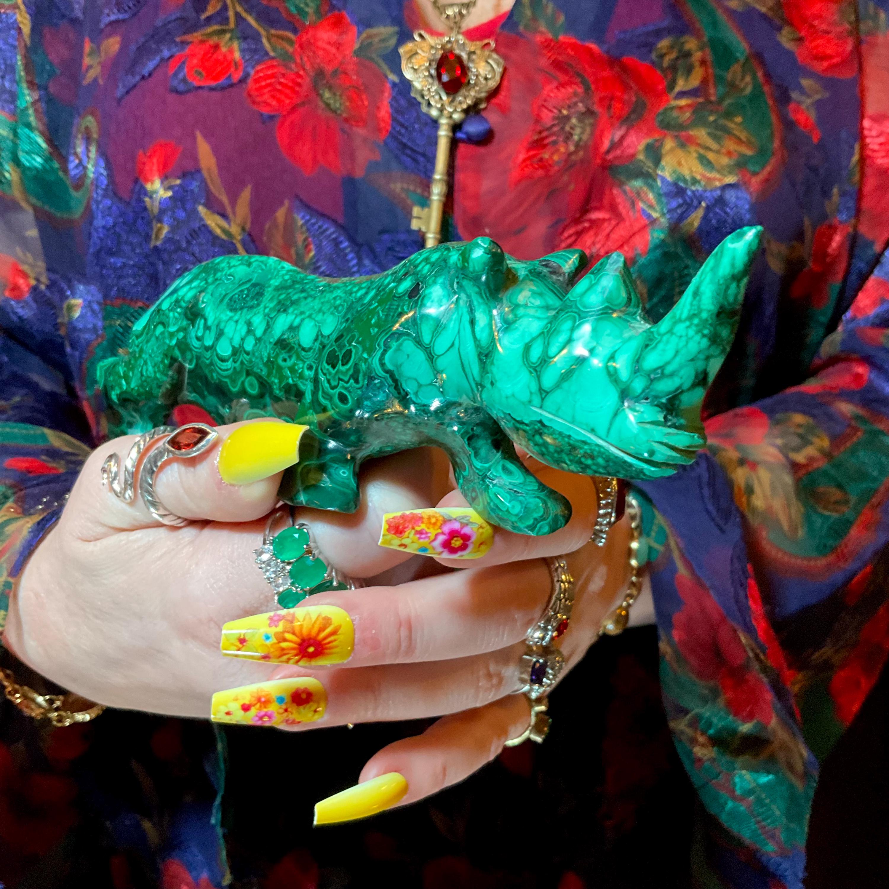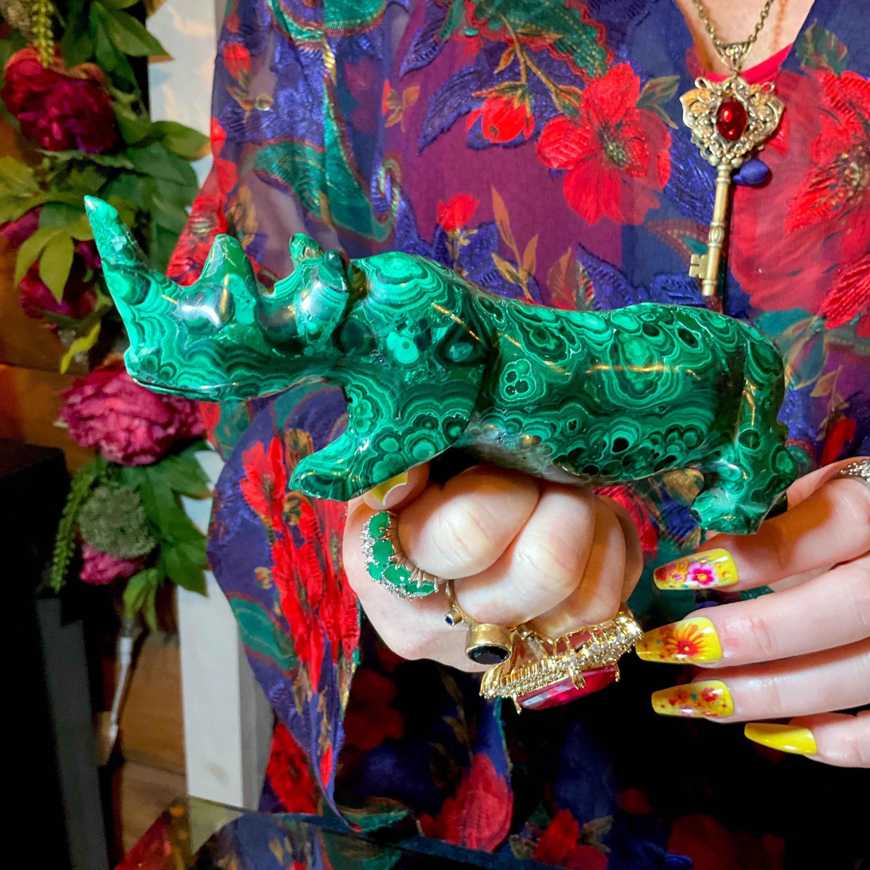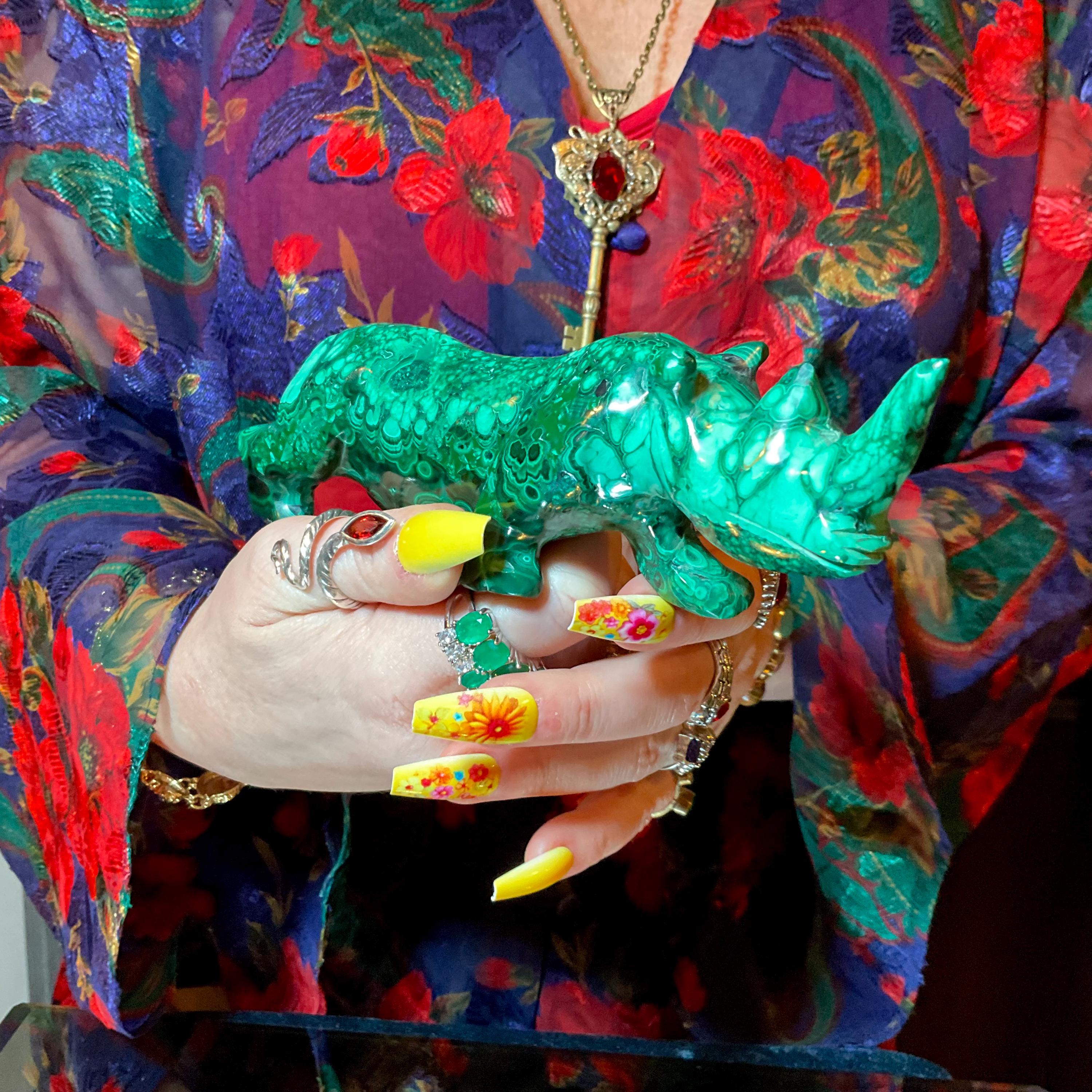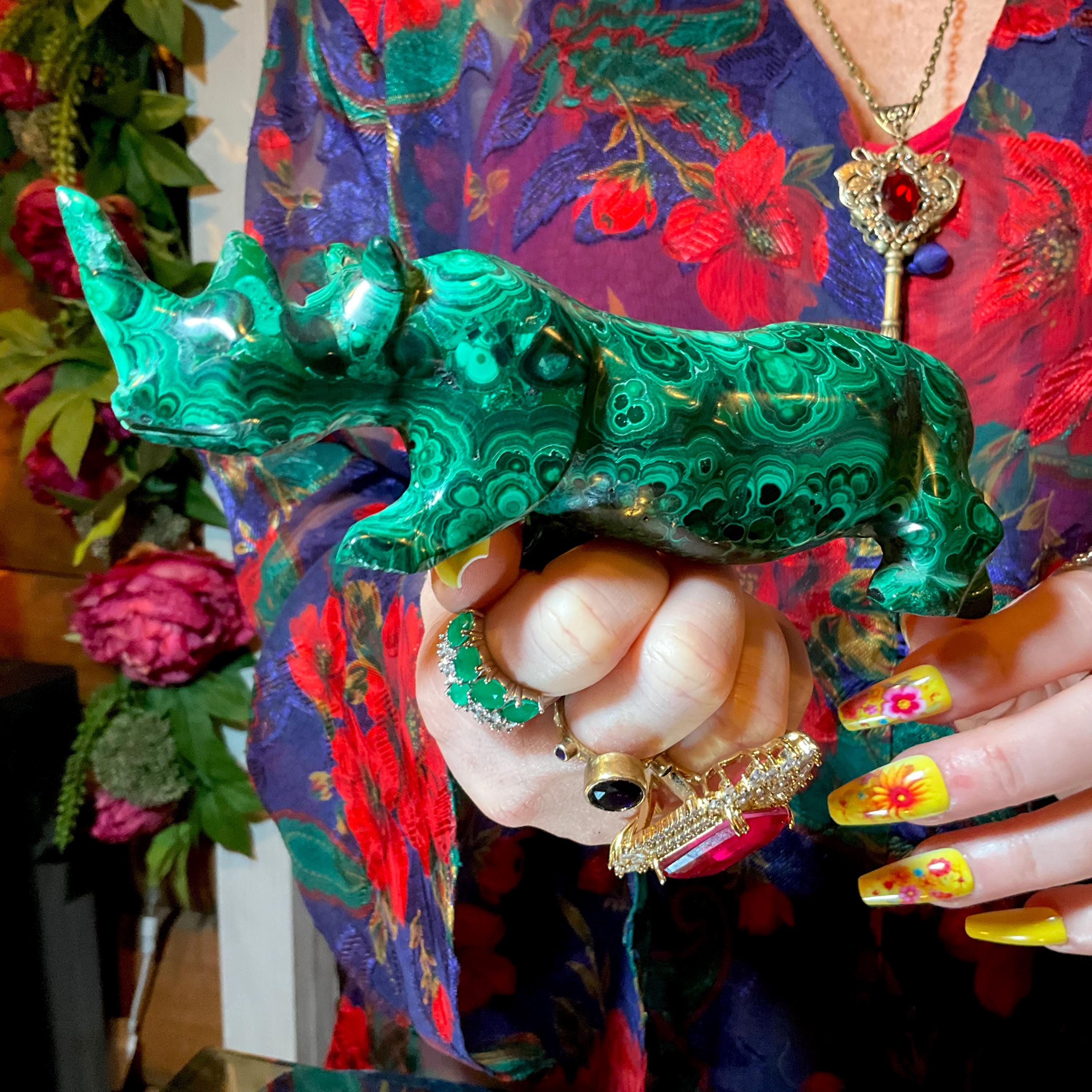 This is a one-of-a-kind carved malachite Rhinoceros.