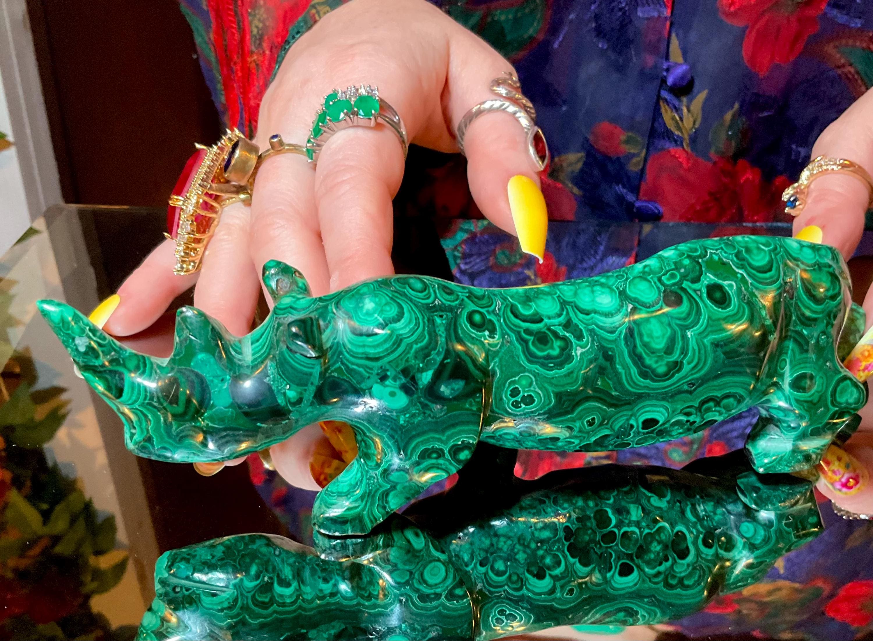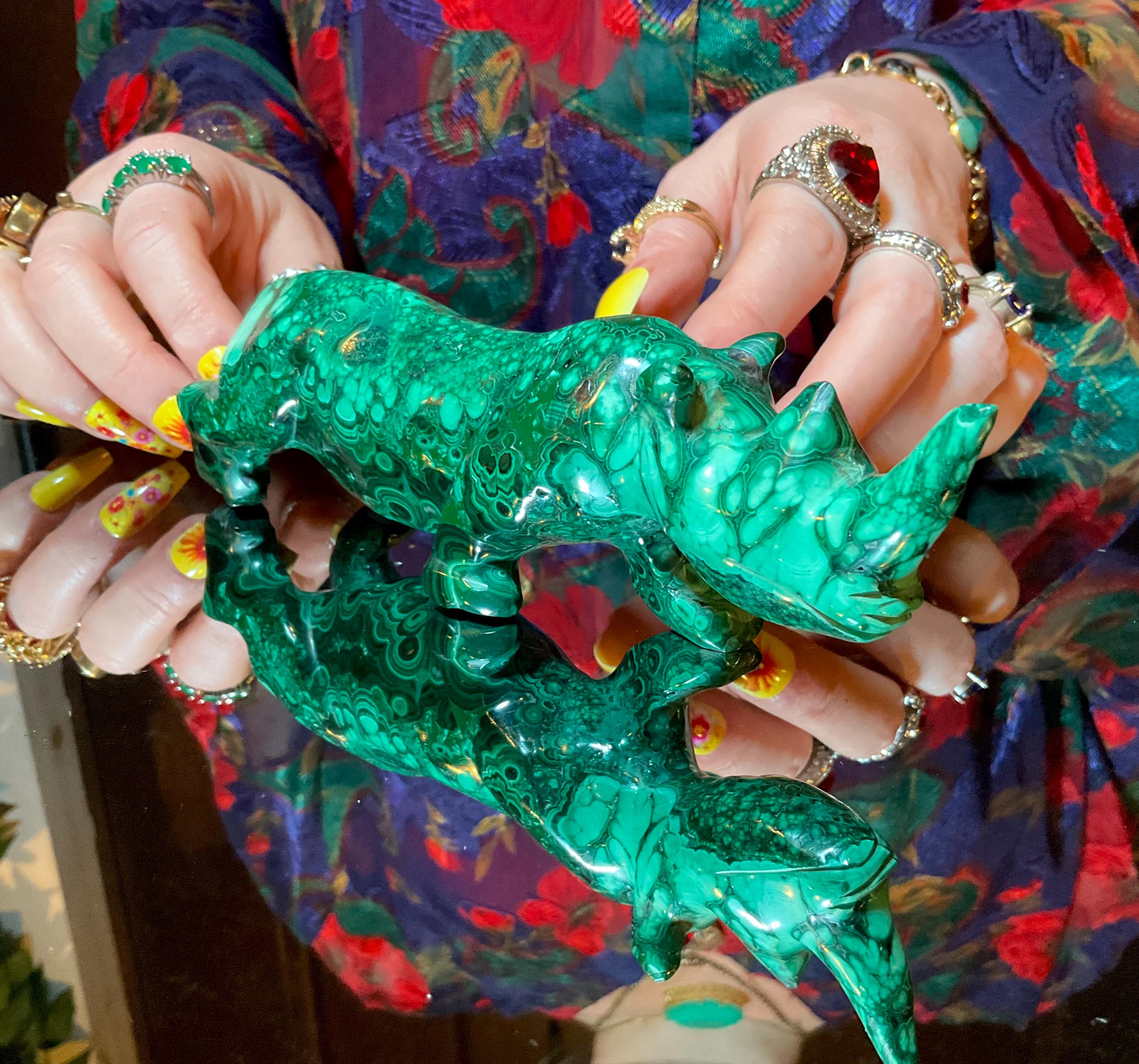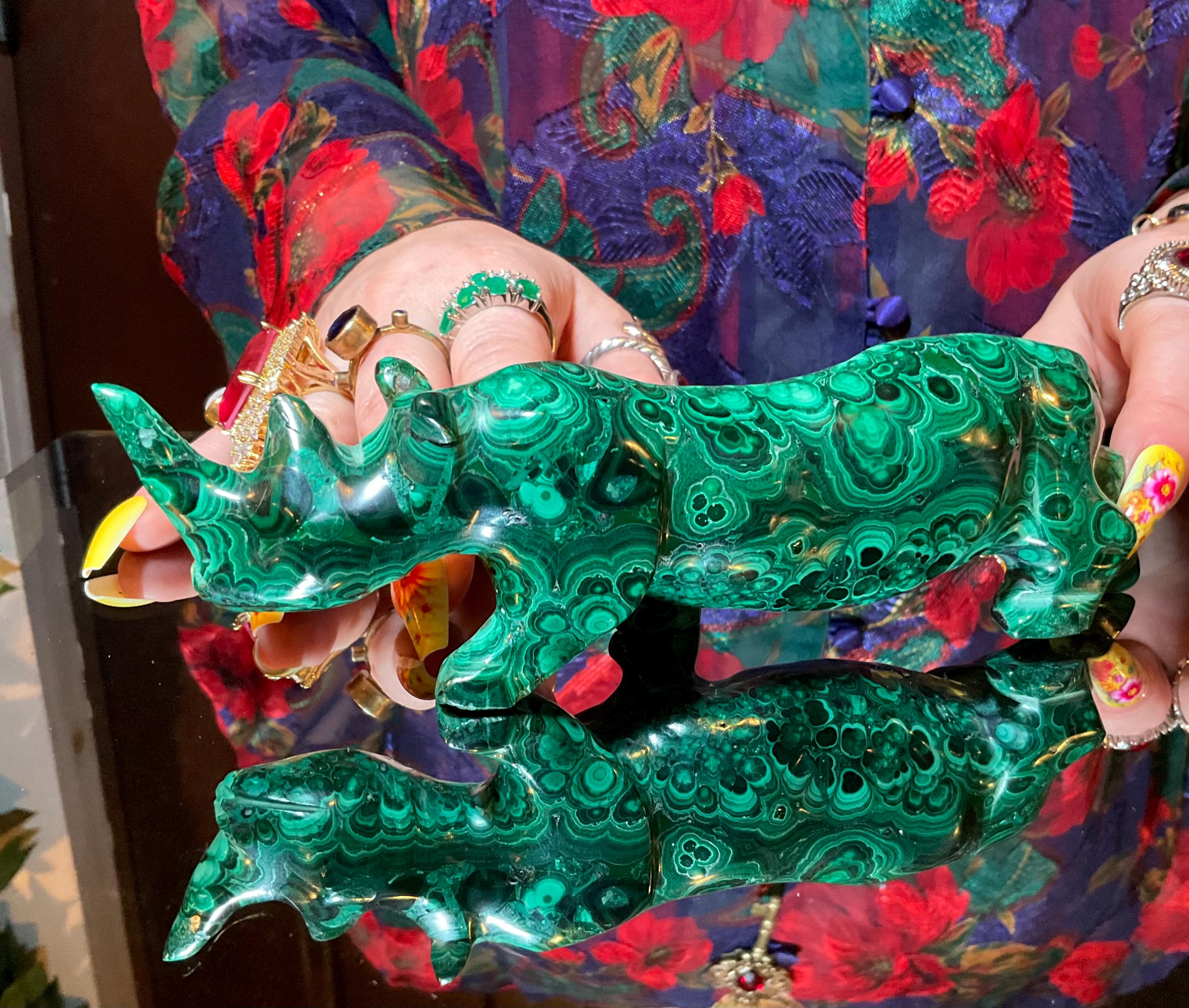 What makes this Malachite Rhinoceros so special is age, patina, and its vintage deco free form style.