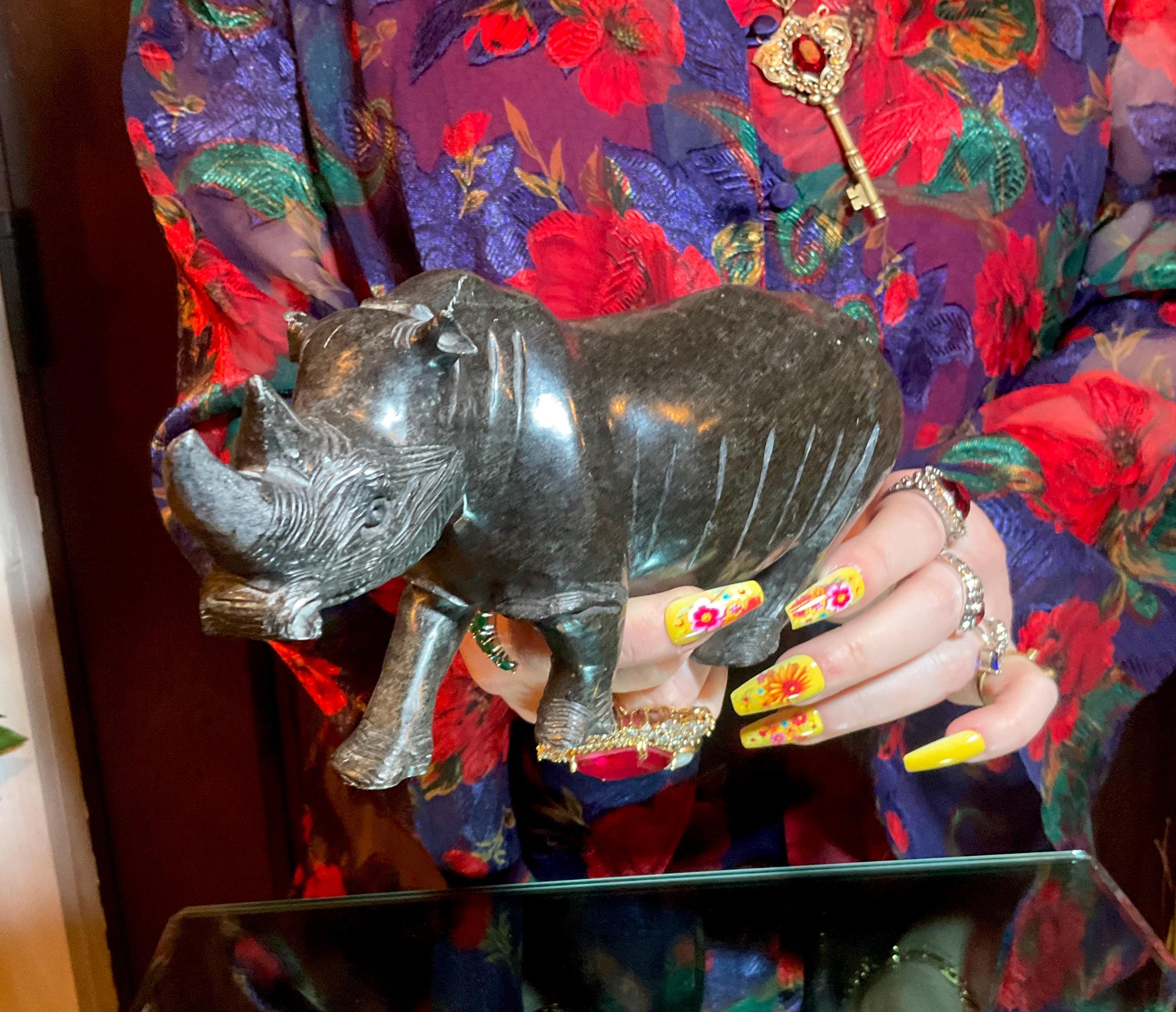 This is a one-of-a-kind carved Verdite Rhinoceros with carved birds on his back.