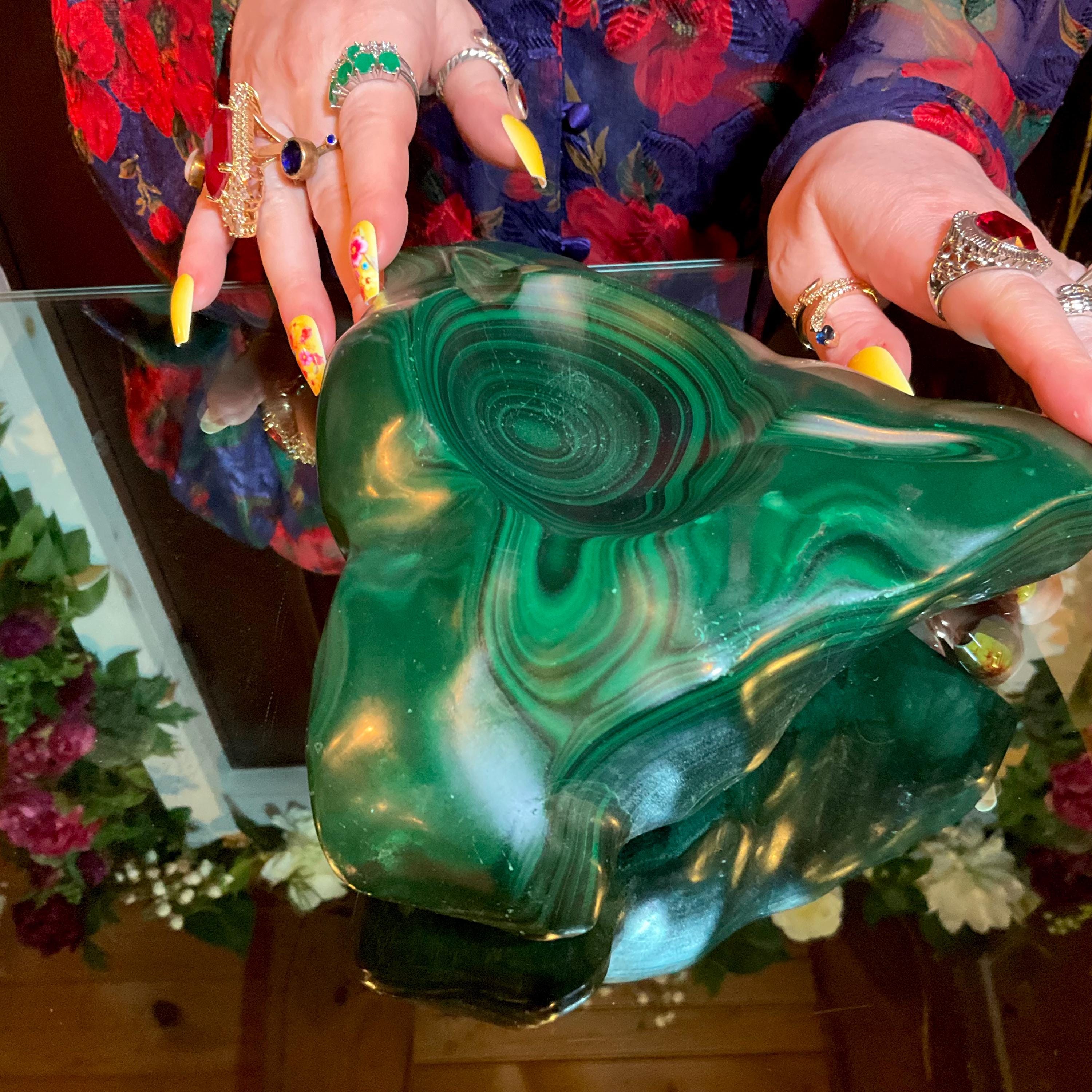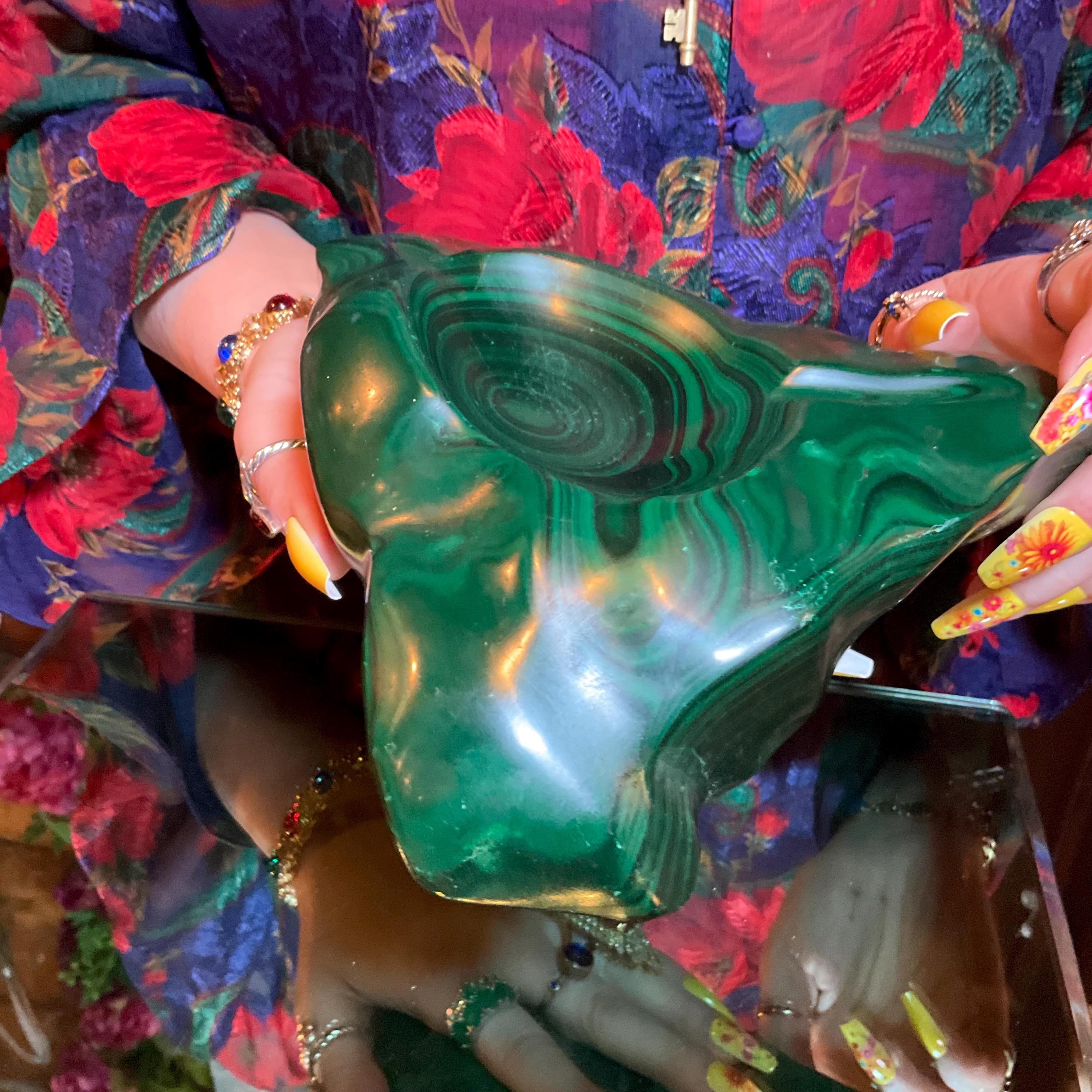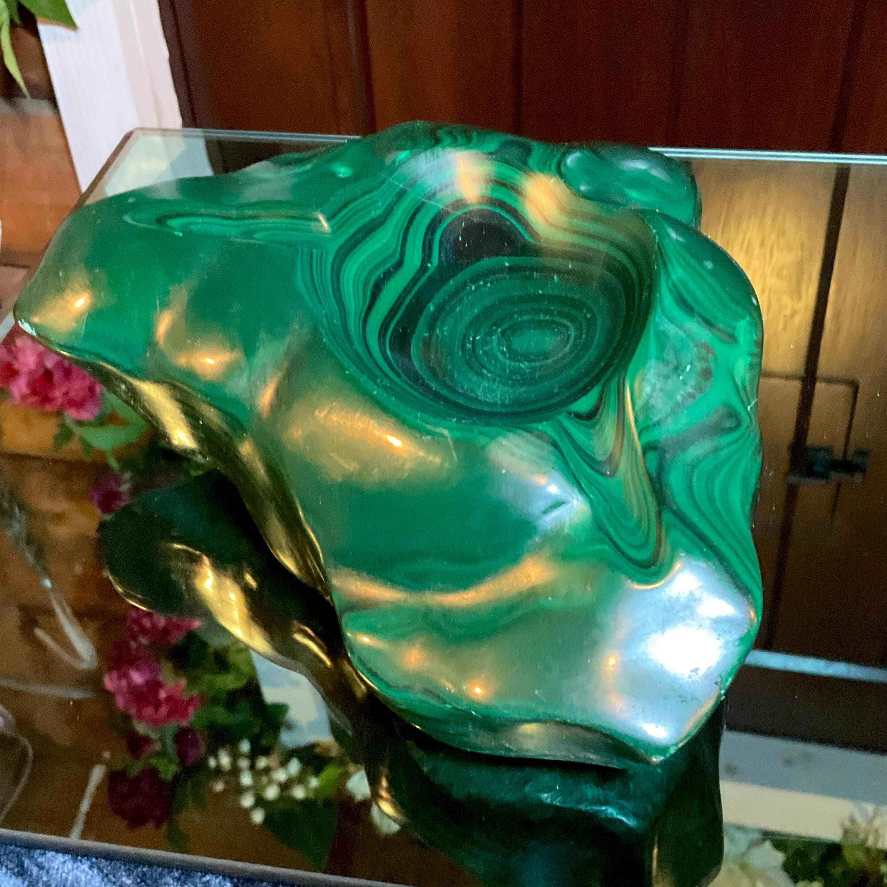 This gorgeous malachite free form stone dish is perfection the vibrant deep green colors swirling into beautiful patterns, is unique only to this mineral making it truly a remarkable piece for your collection.