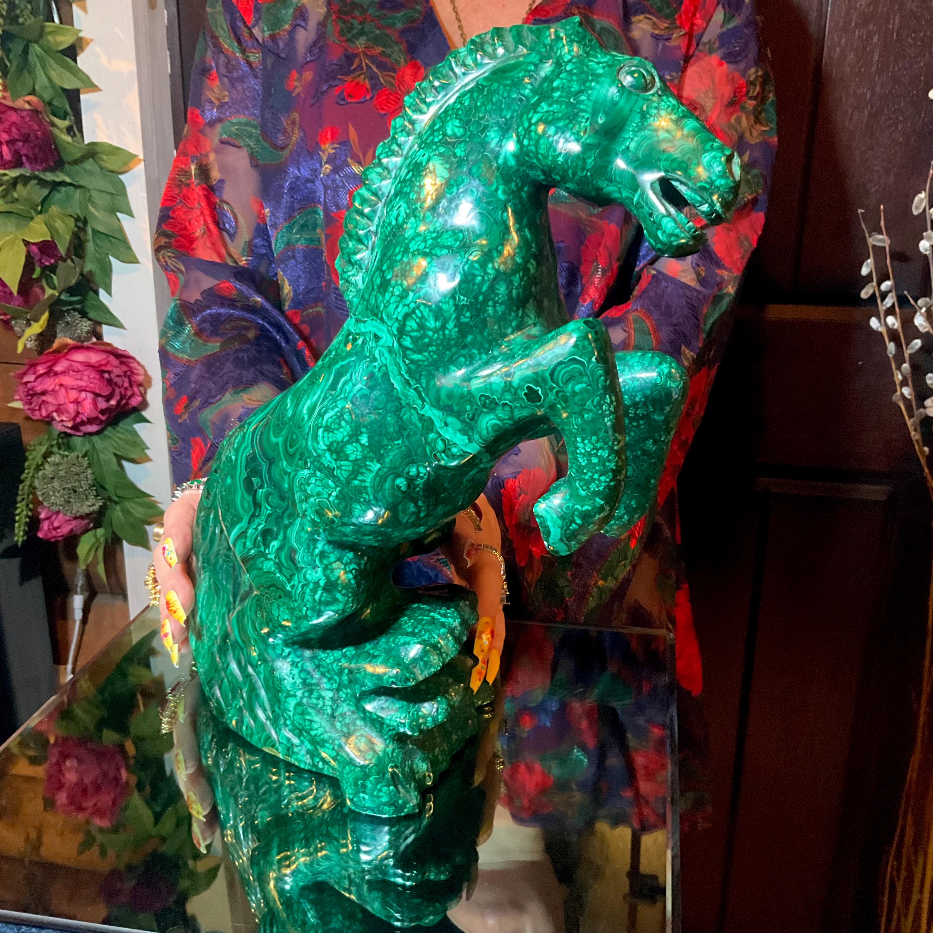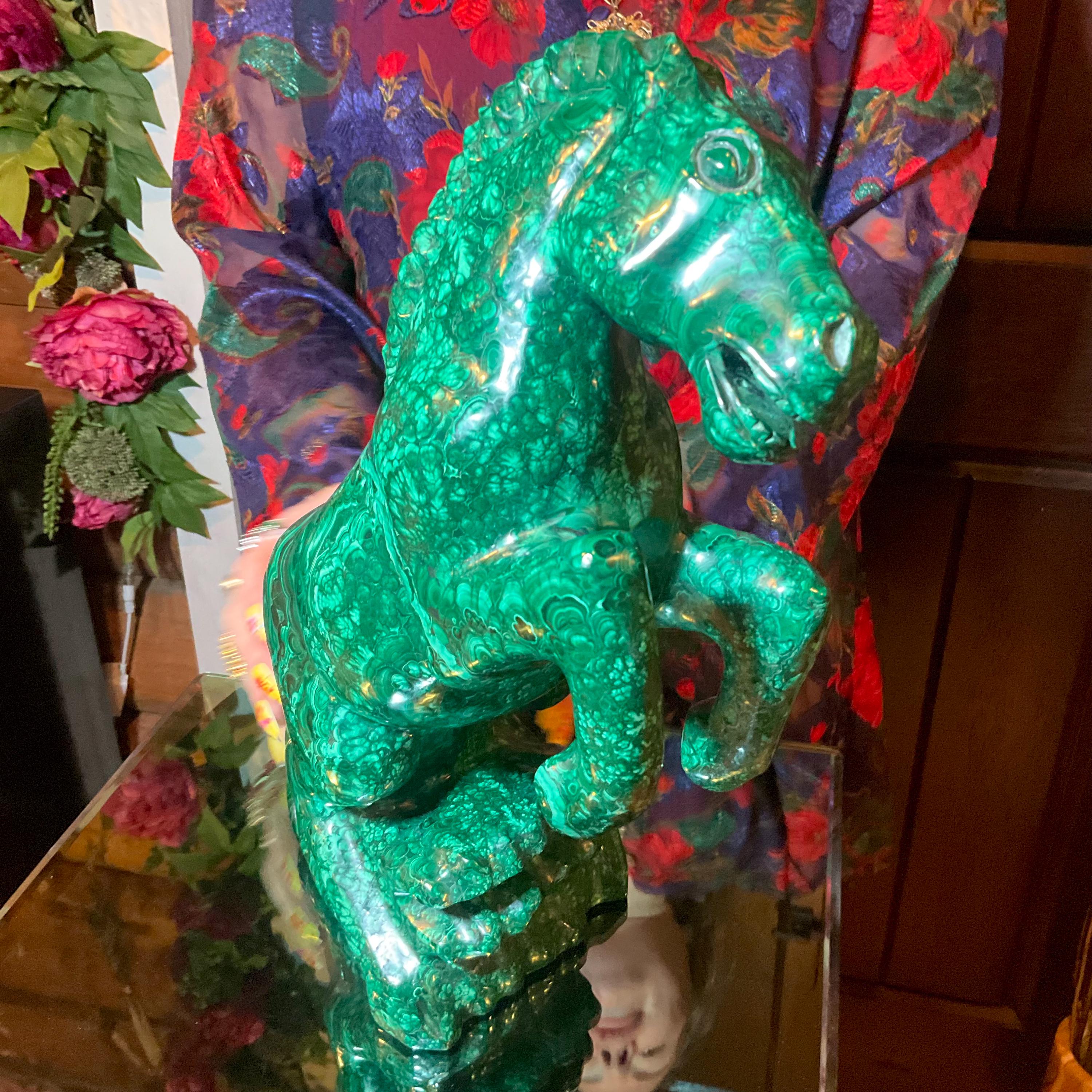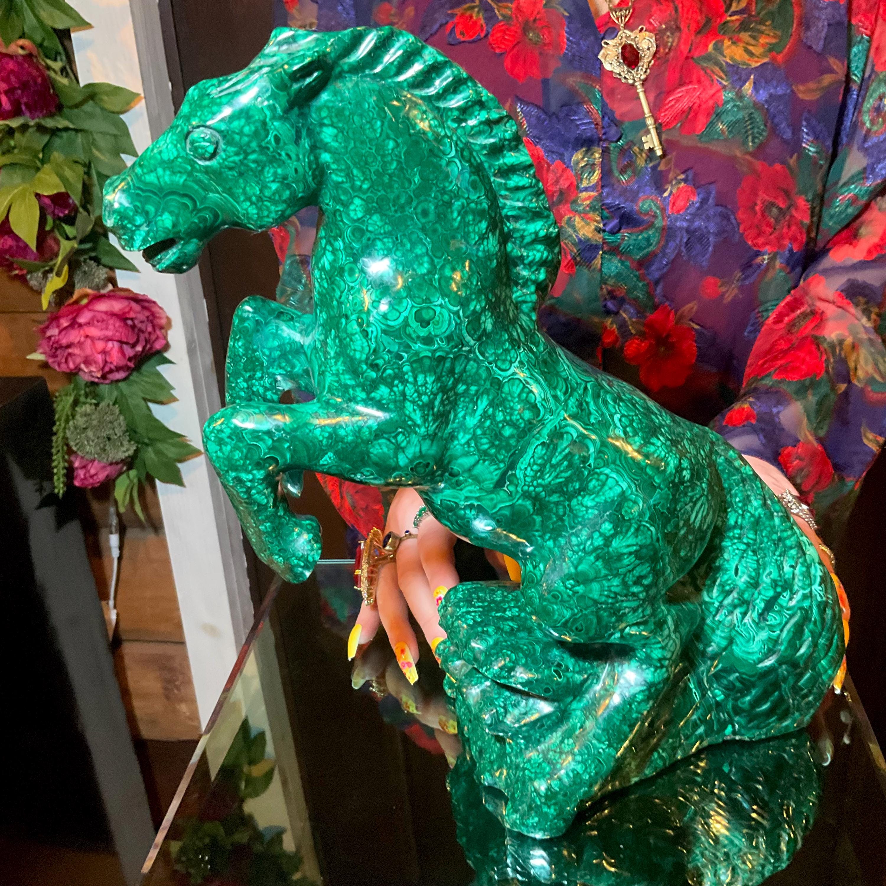 What makes this Malachite Horse so special is age, patina, and its vintage deco free form style.
