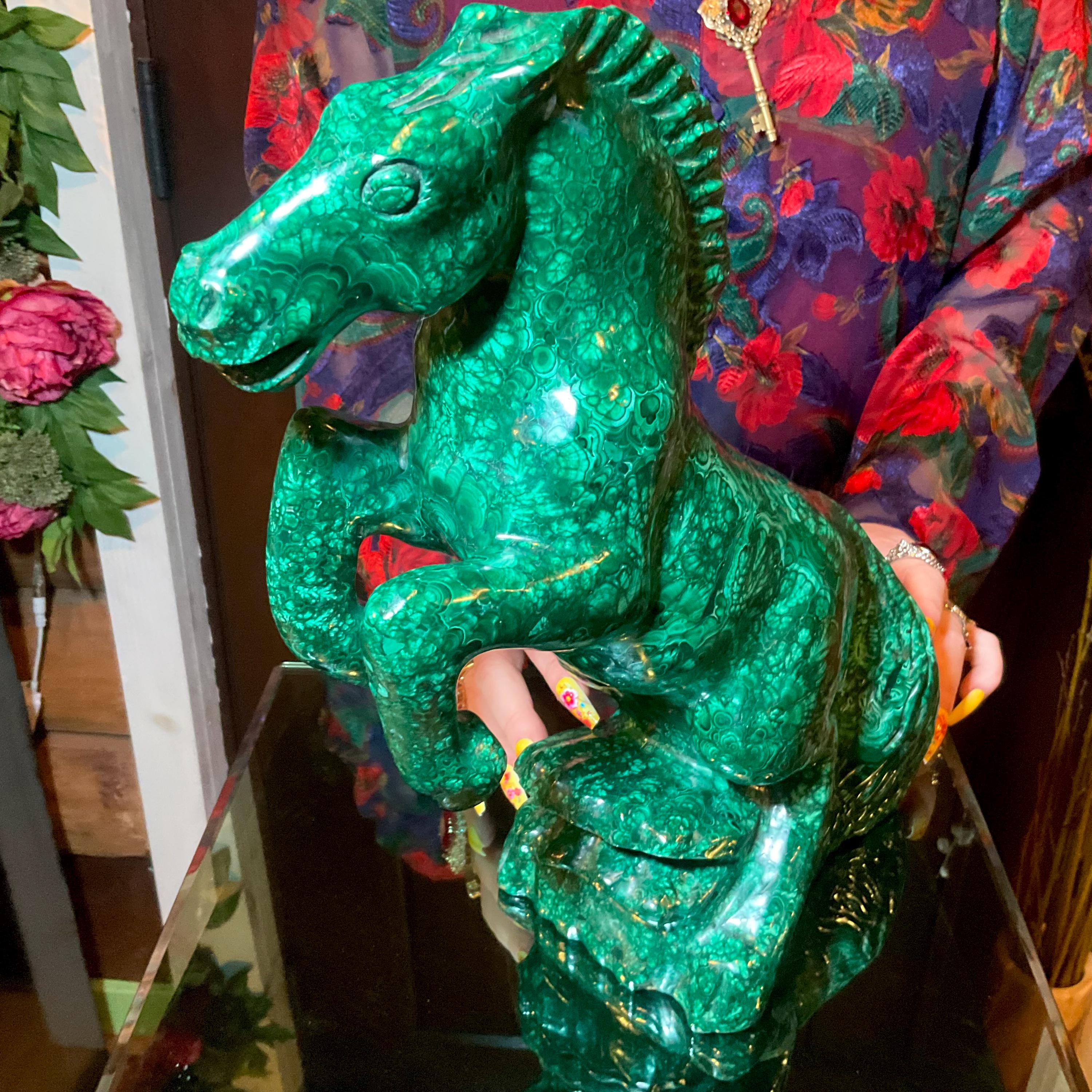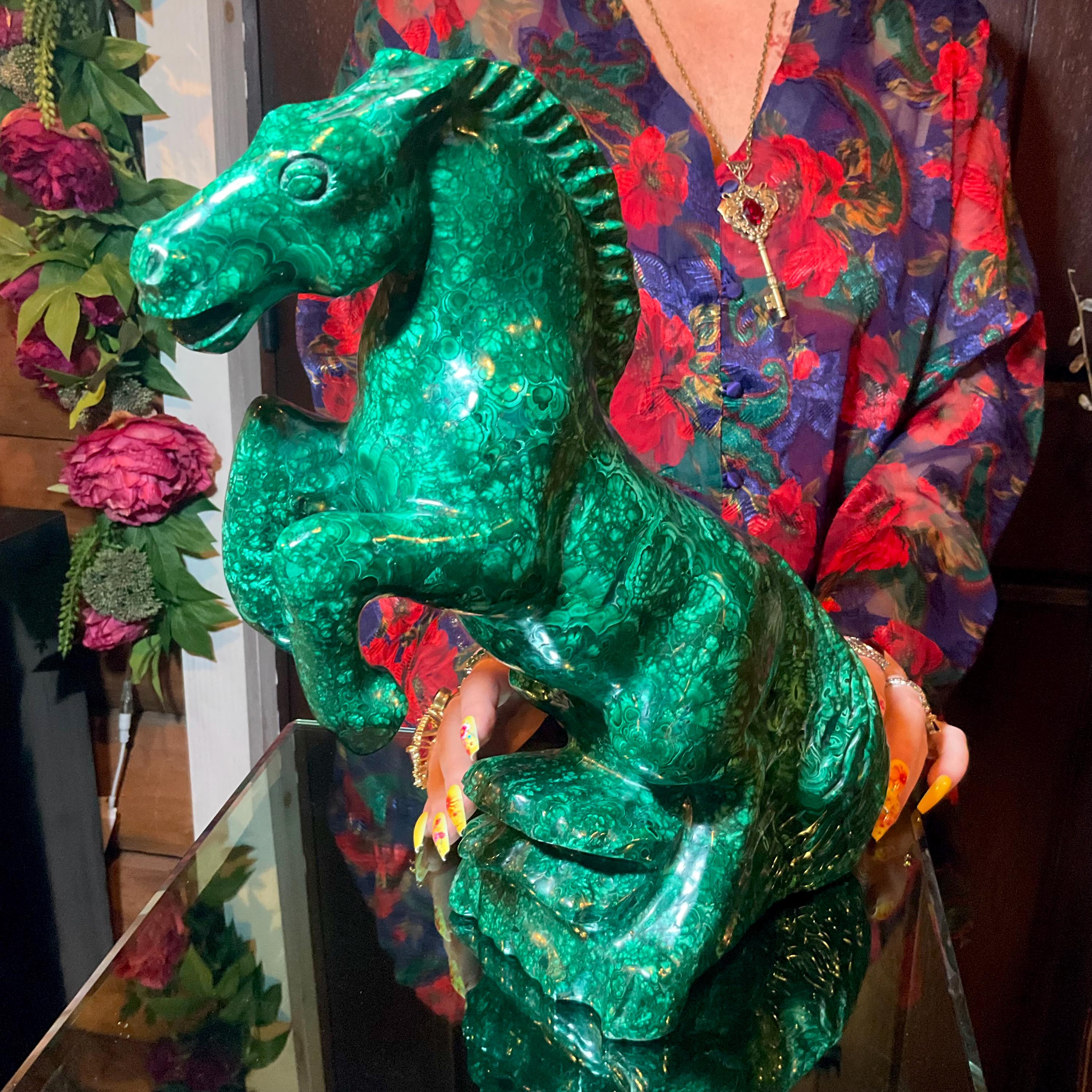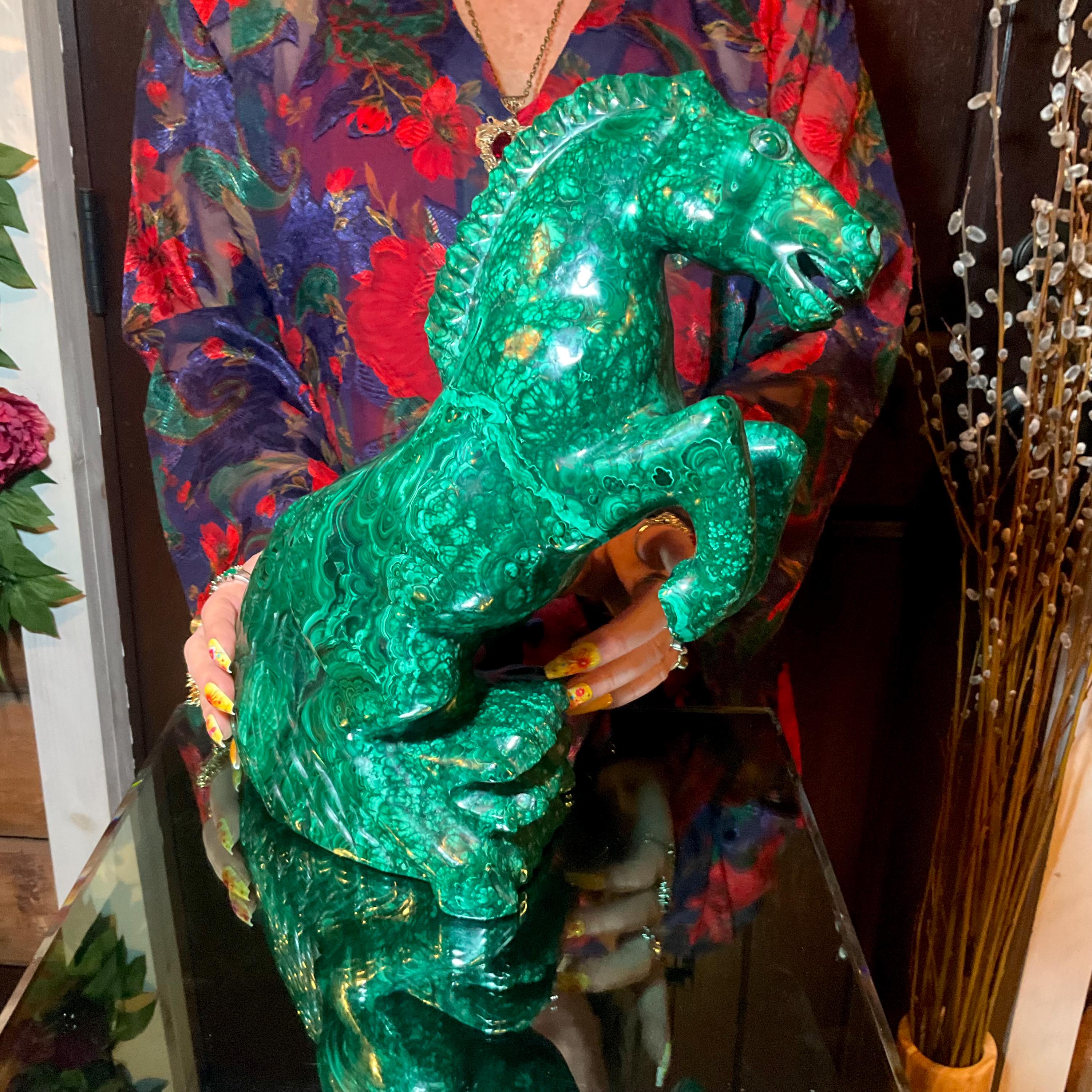 What makes this Malachite Horse so special is age, patina, and its vintage deco free form style.