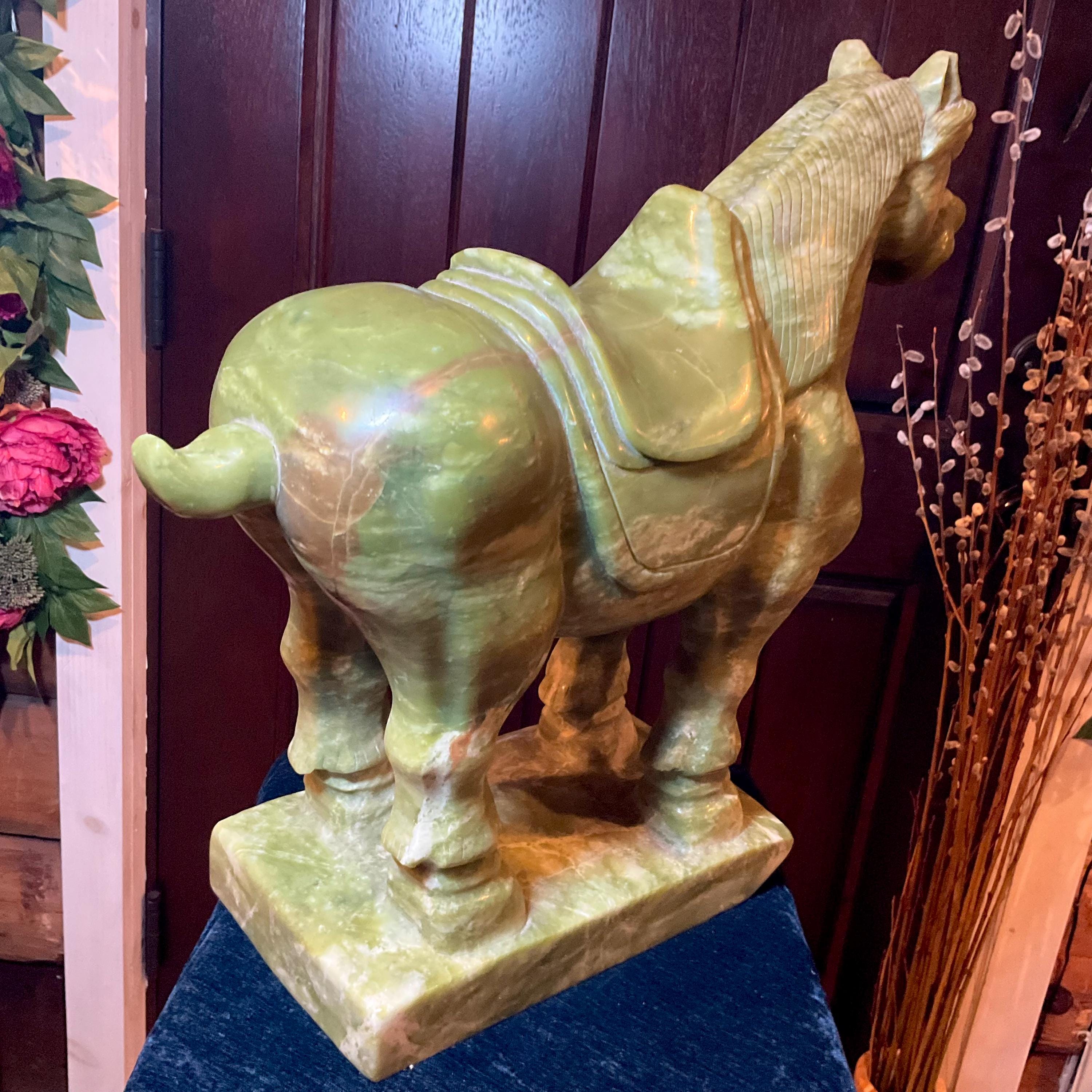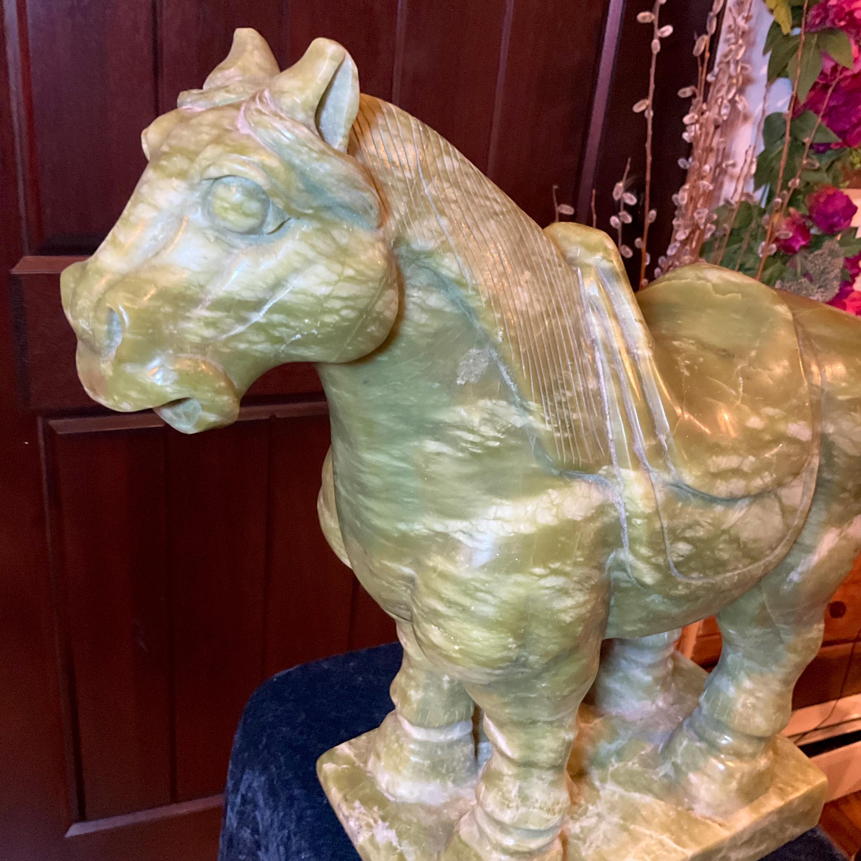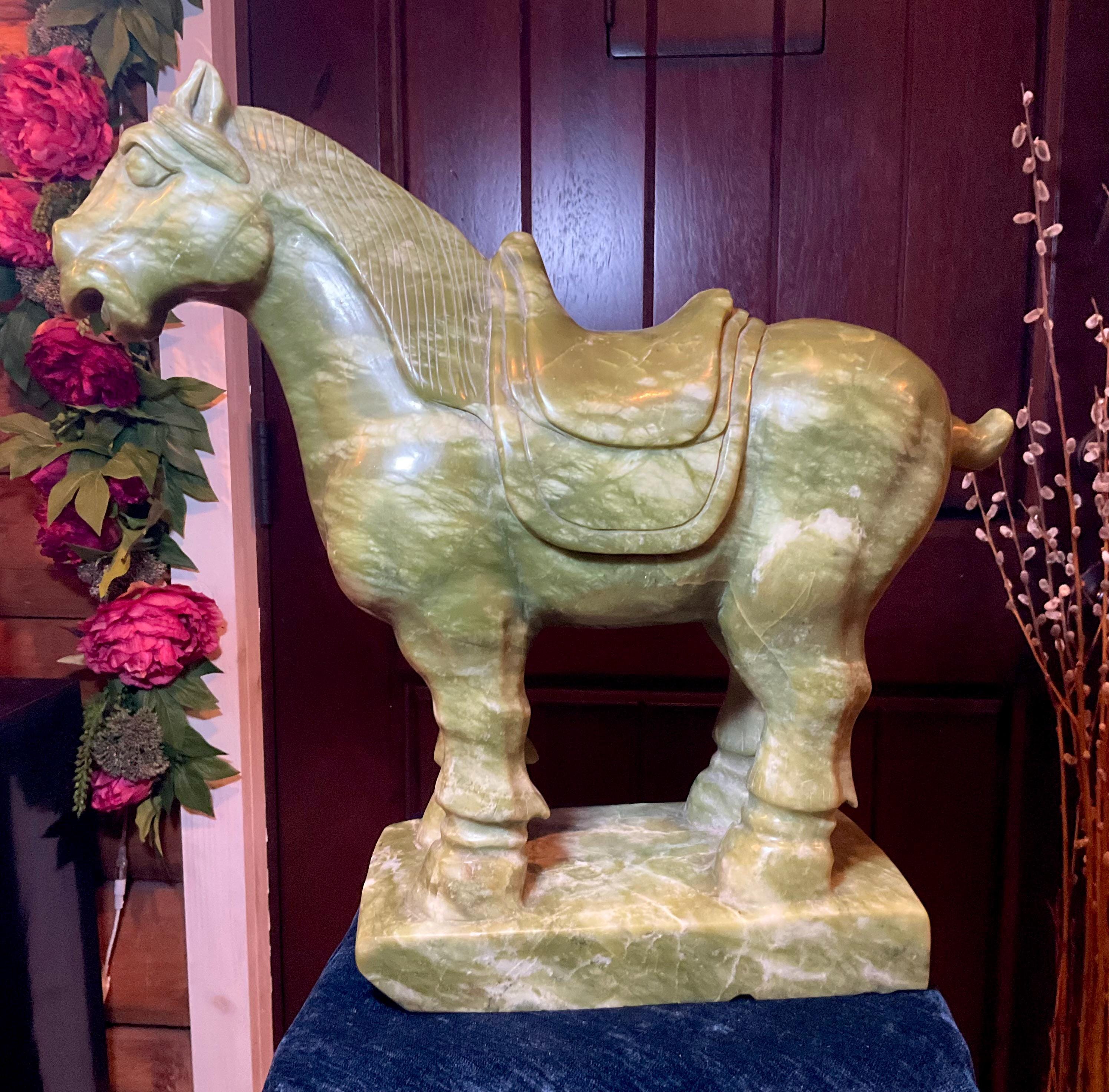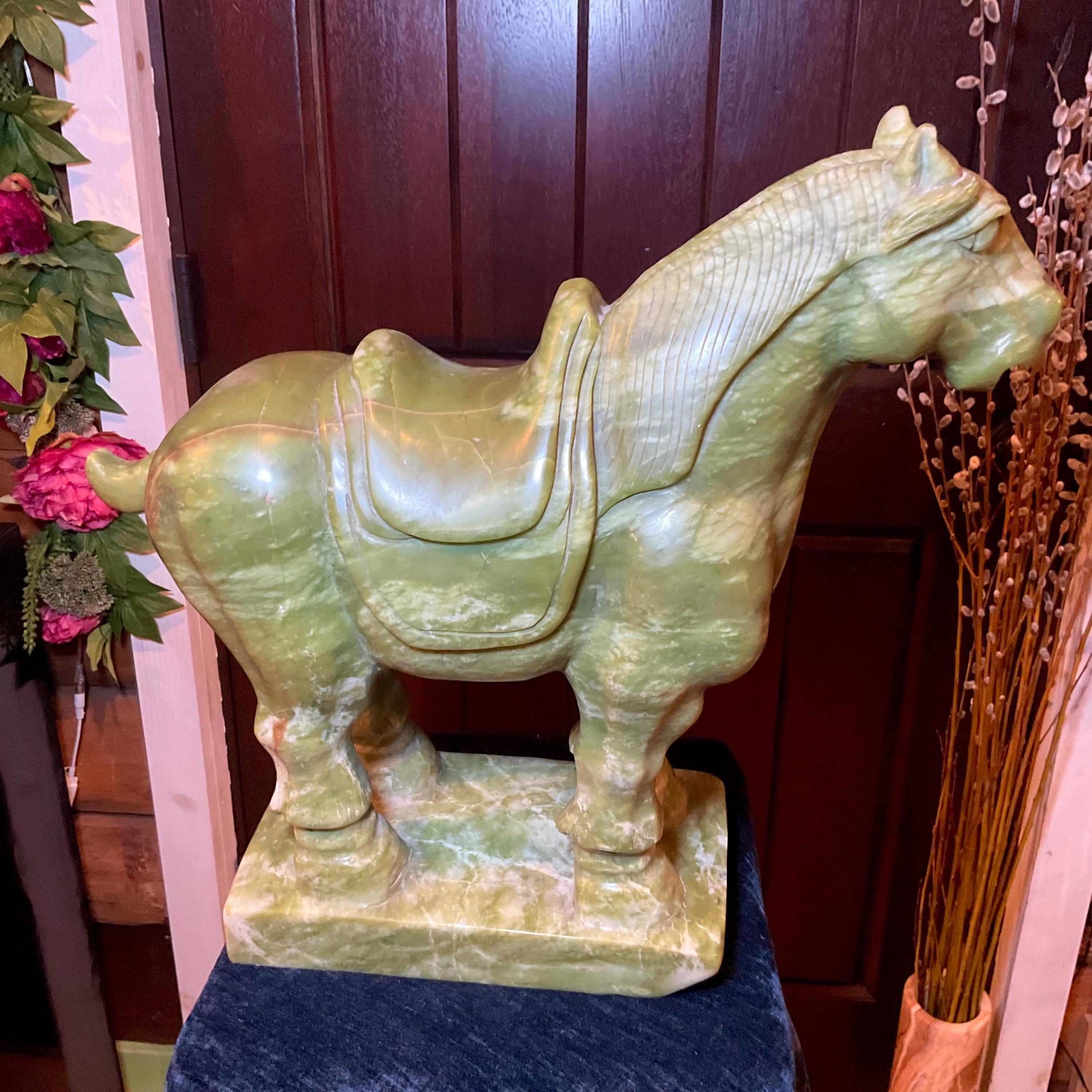 This stunning hand-carved green stone horse sculpture features detailed Tang Dynasty-inspired design elements, including a traditional saddle and stylized mane.