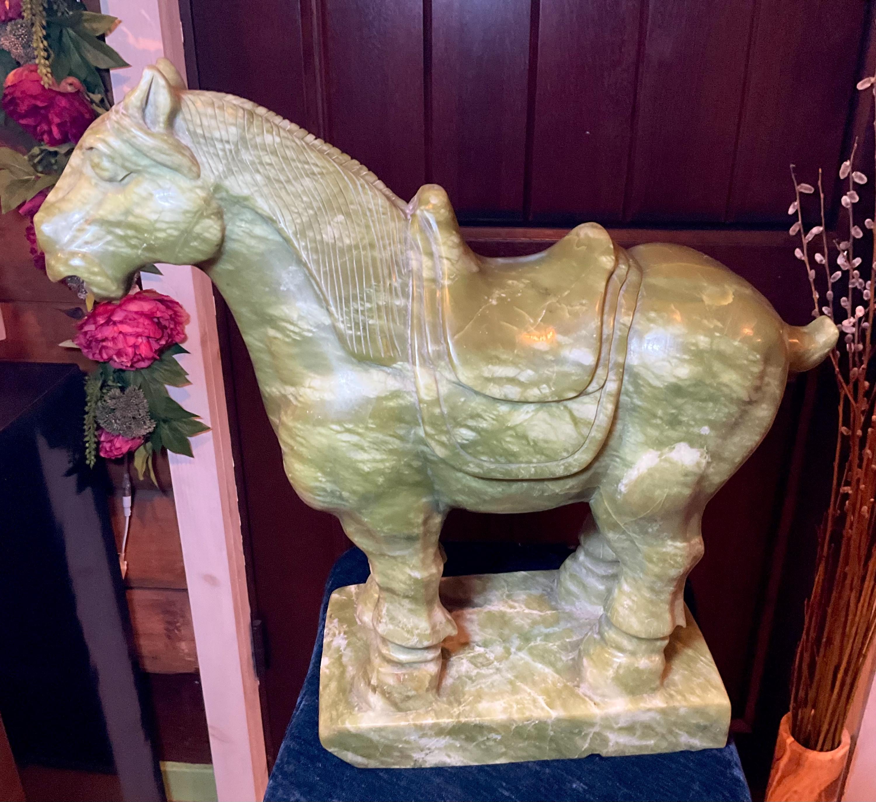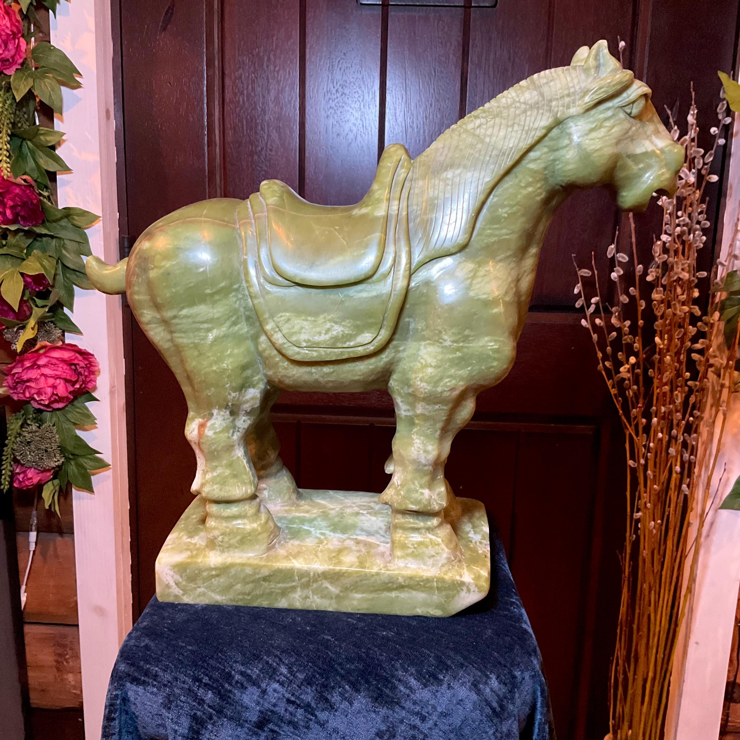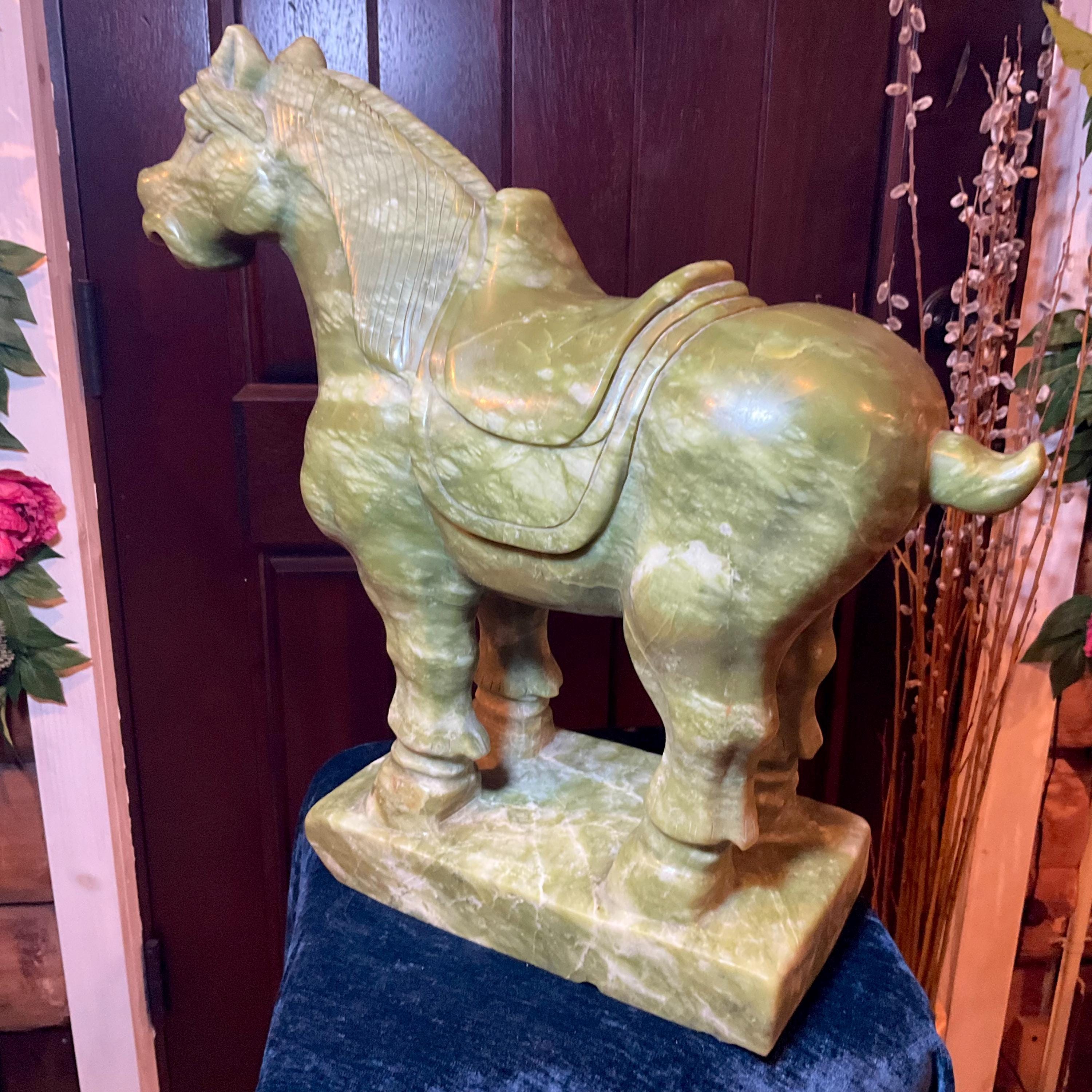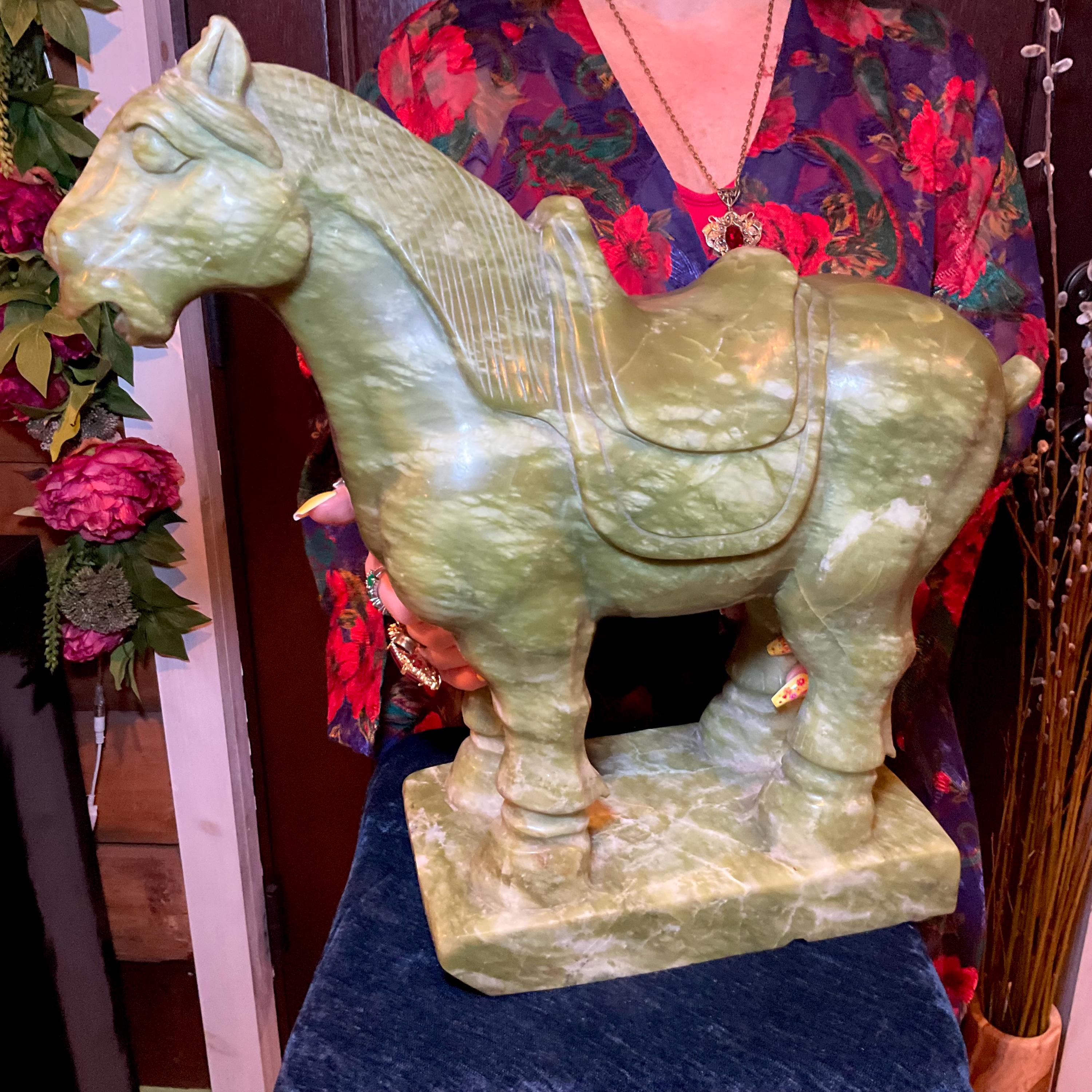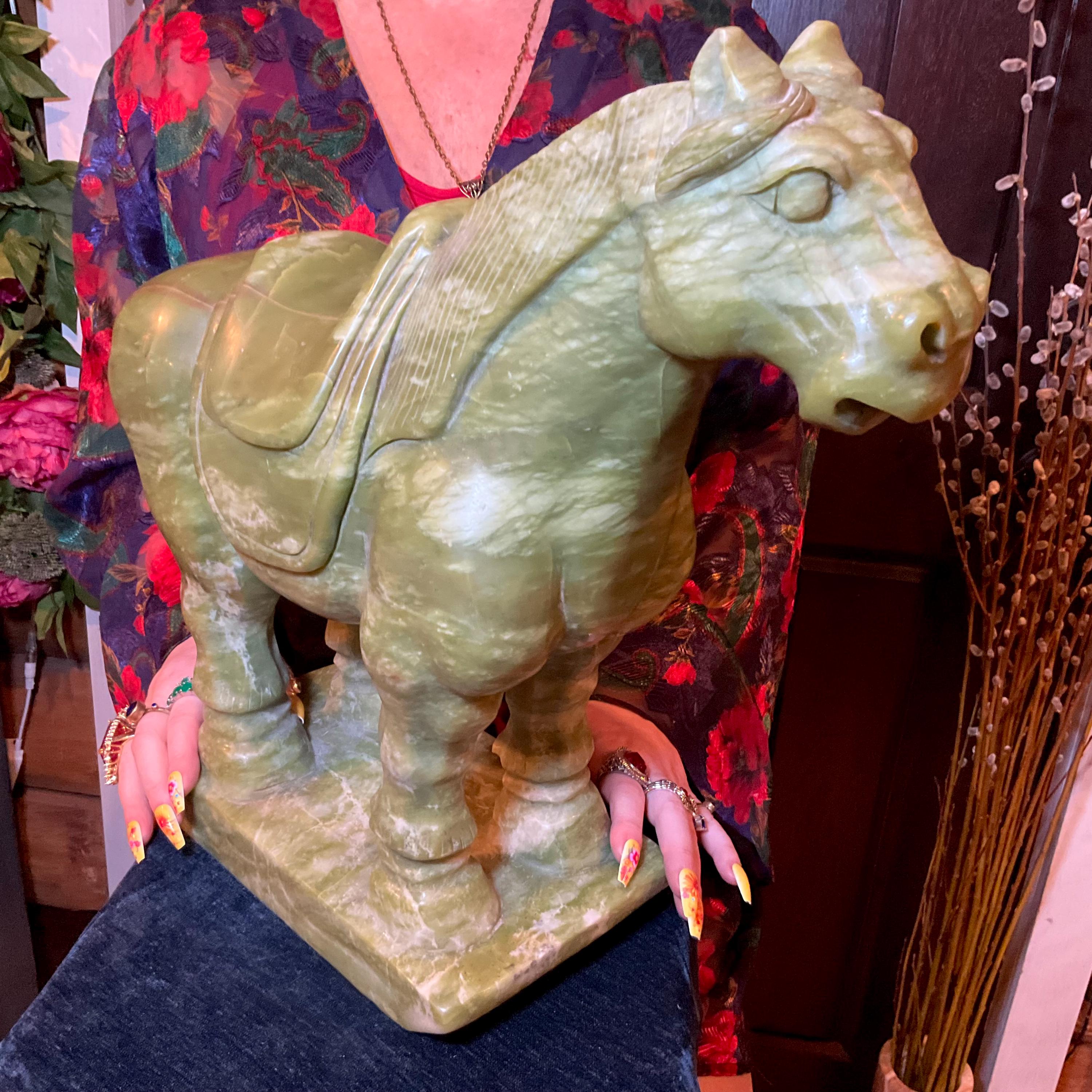 This stunning hand-carved green stone horse sculpture features detailed Tang Dynasty-inspired design elements, including a traditional saddle and stylized mane.
