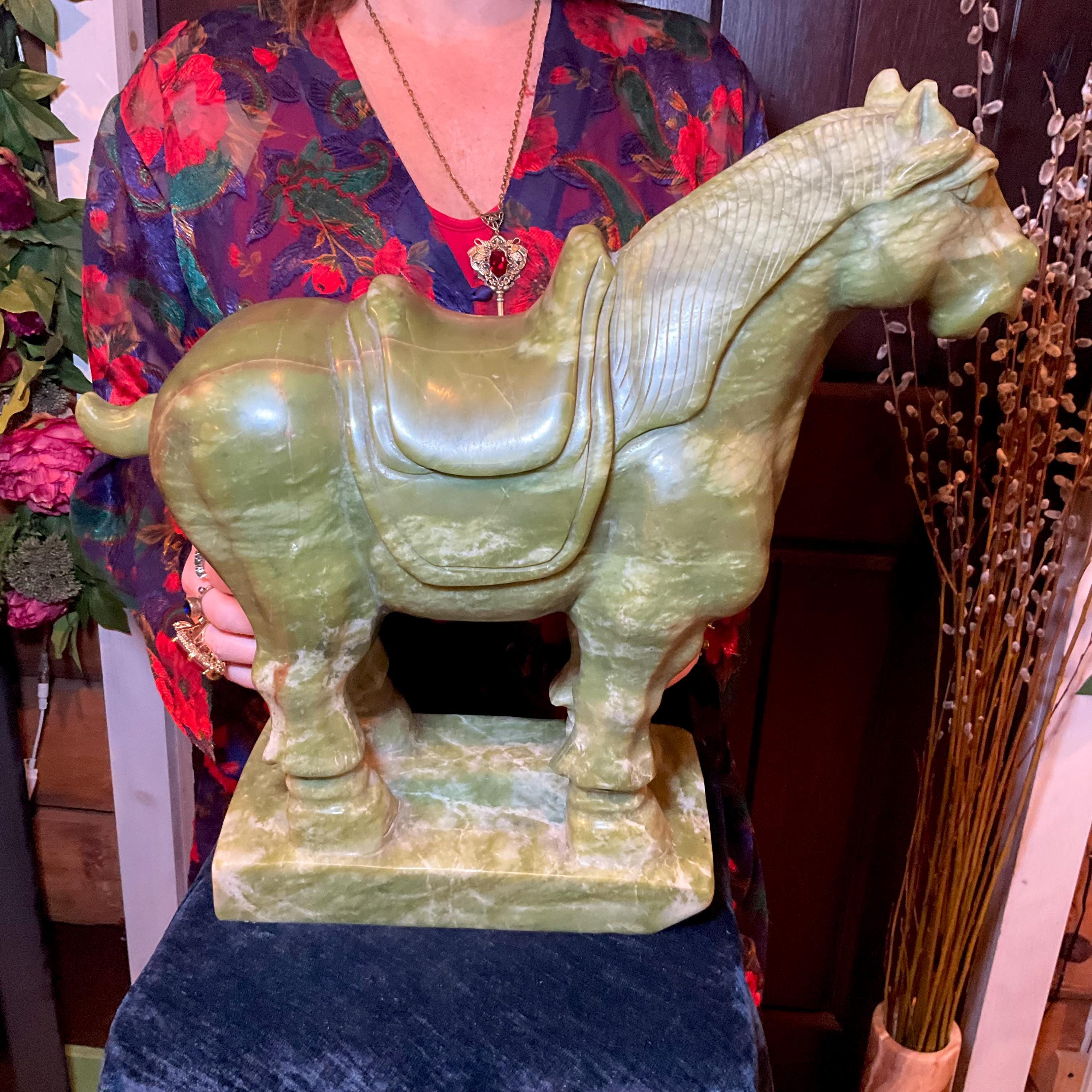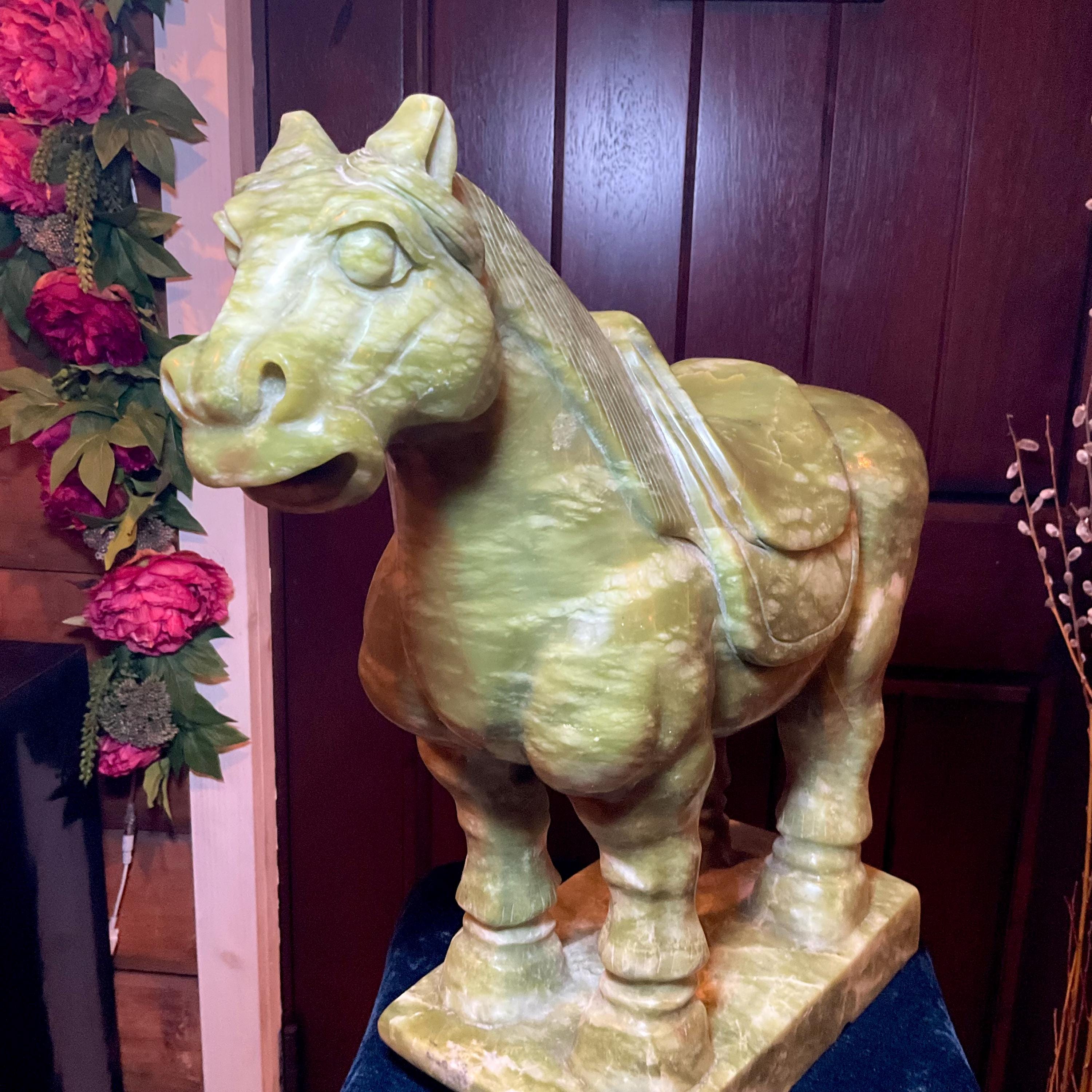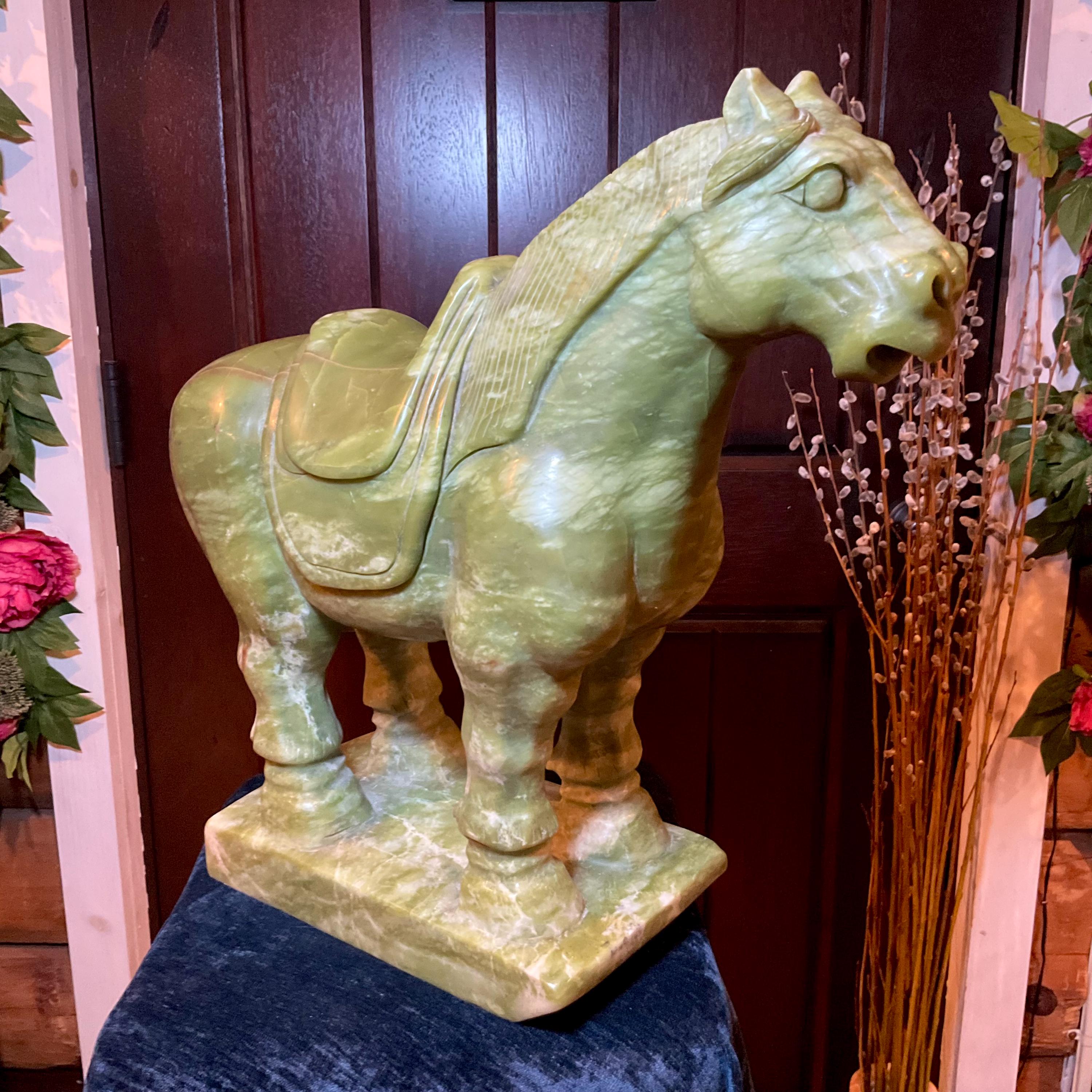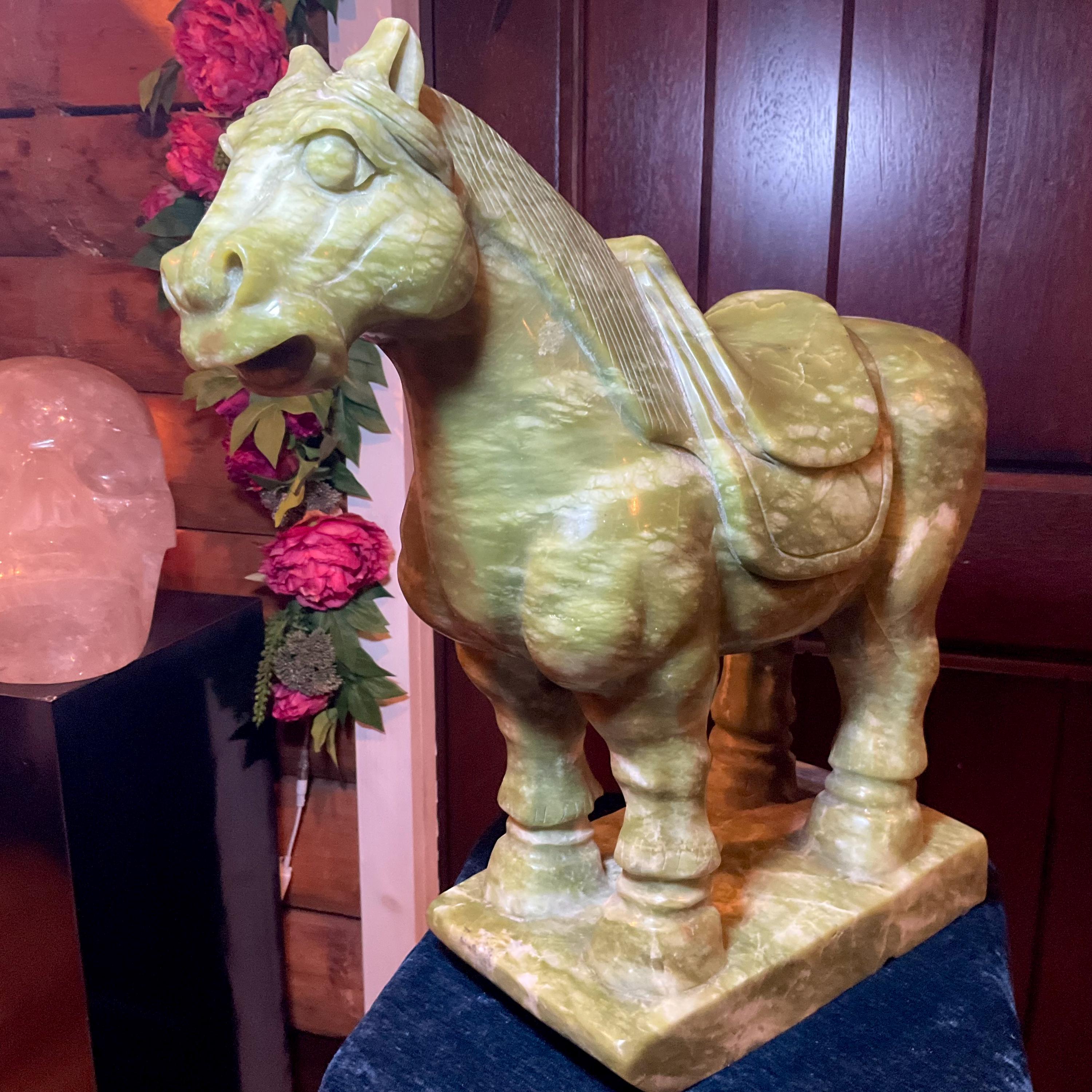 This stunning hand-carved green stone horse sculpture features detailed Tang Dynasty-inspired design elements, including a traditional saddle and stylized mane.