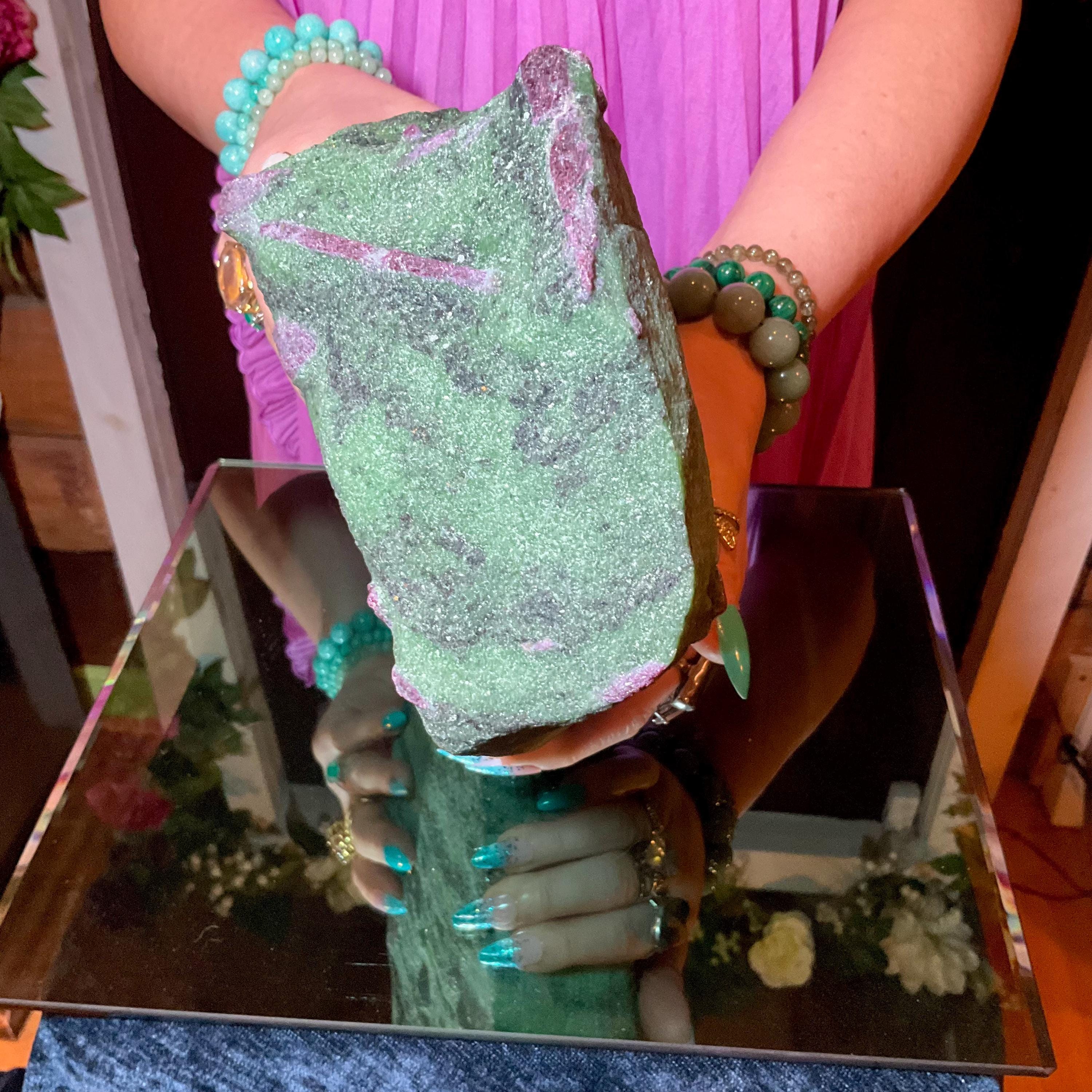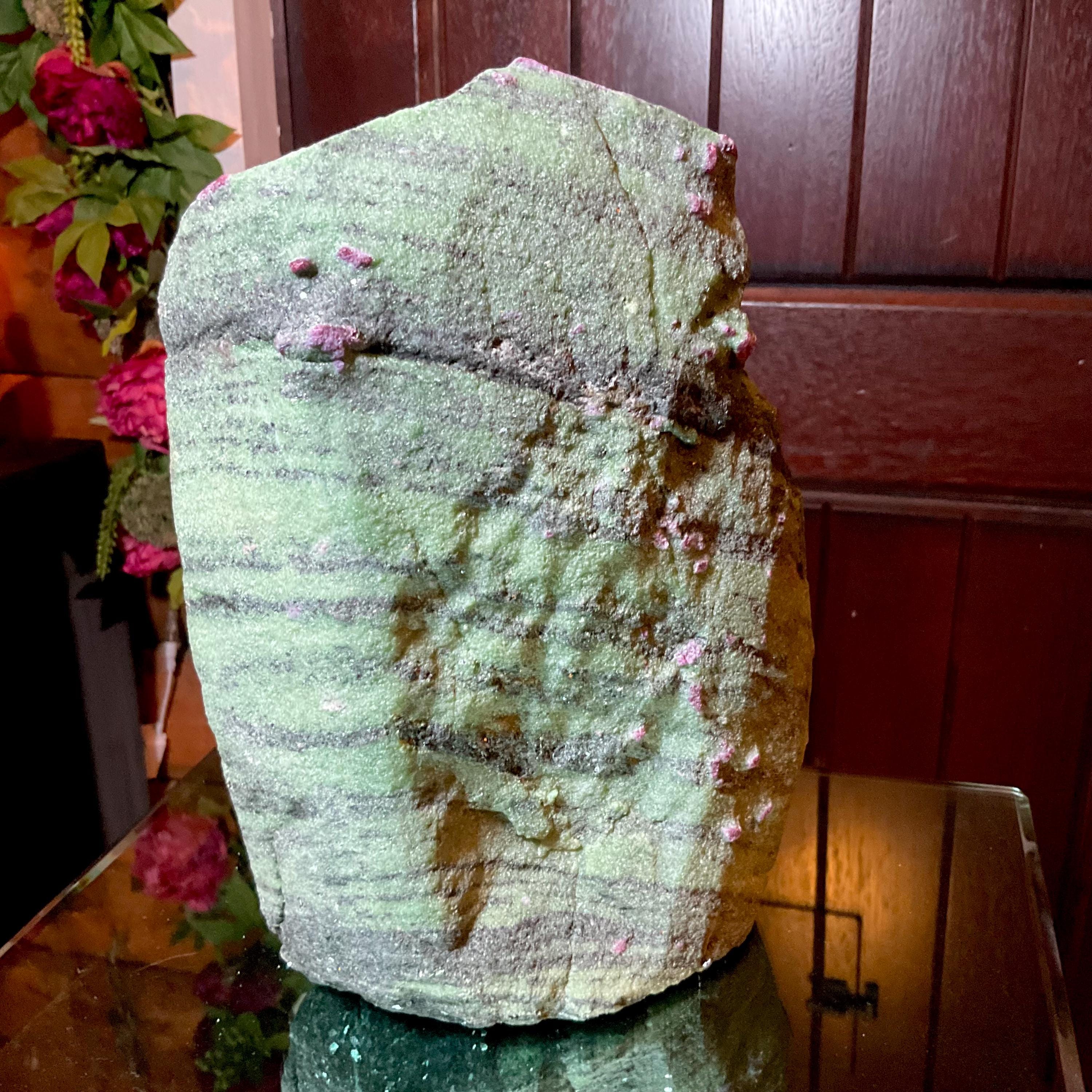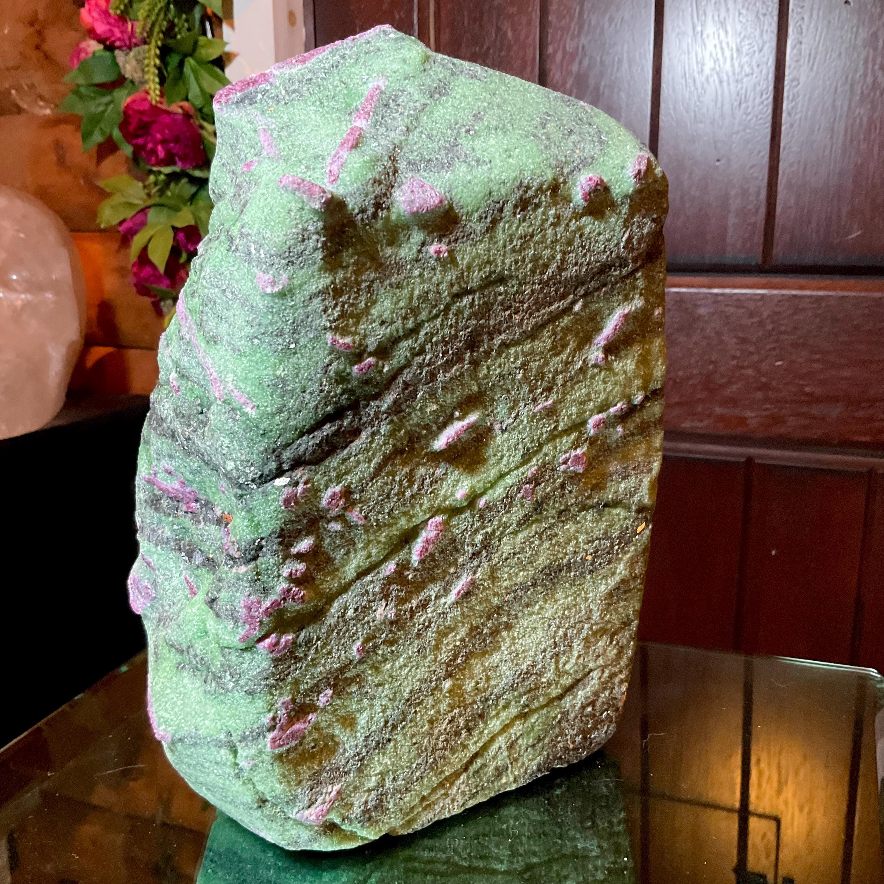 This is a one-of-a-kind Ruby Zoisite Crystal Cluster, it has the most specular Natural Ruby Red, Green & Black patterns you will ever see it is perfection and when you gaze into its natural beauty you will be amazed at how perfect nature can be.
