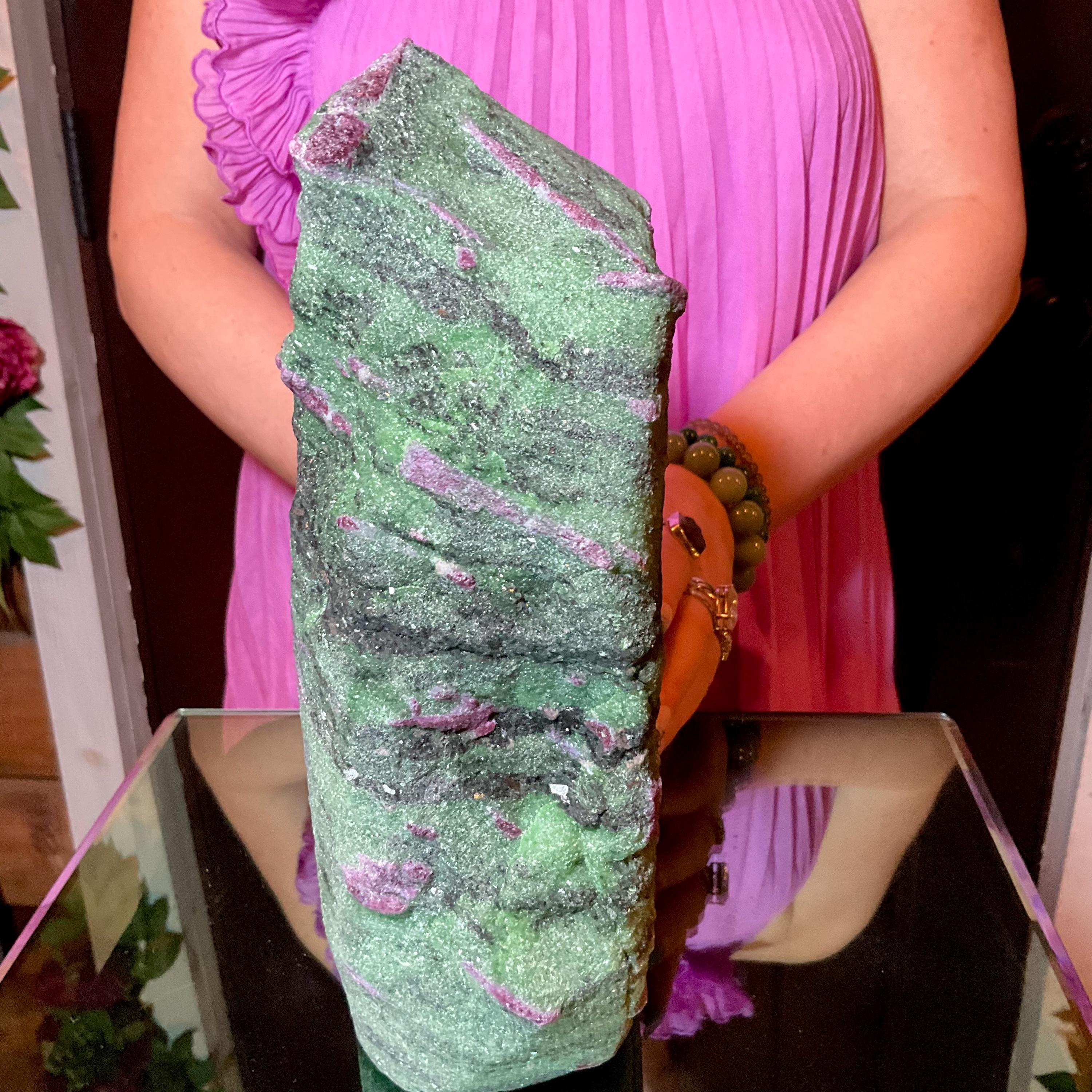 Ruby Zoisite Crystal Cluster ~ 17 Lb. 8 oz. ~ 9 1/2" Tall Tower ~Sparkling Natural Red, Green & Black Colors