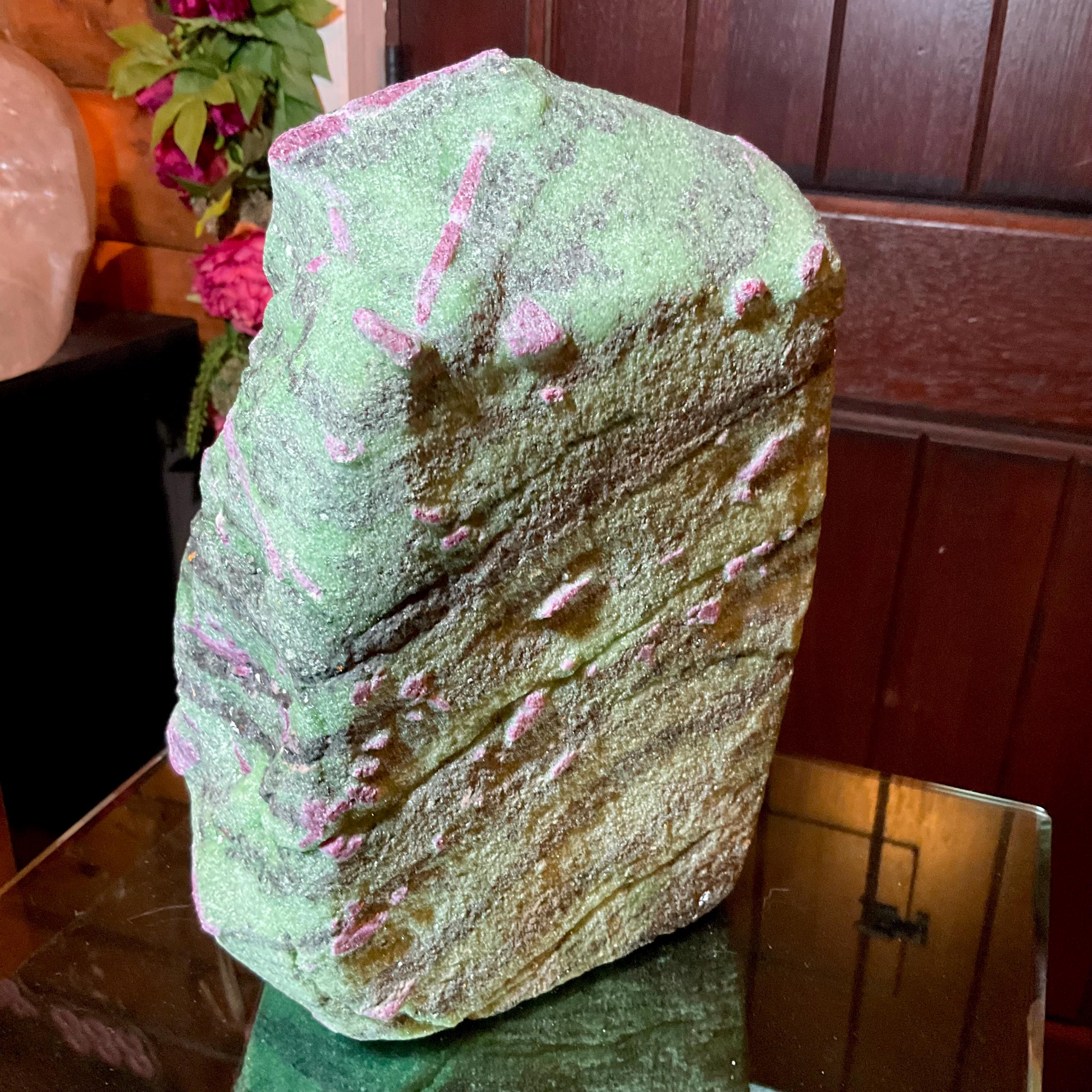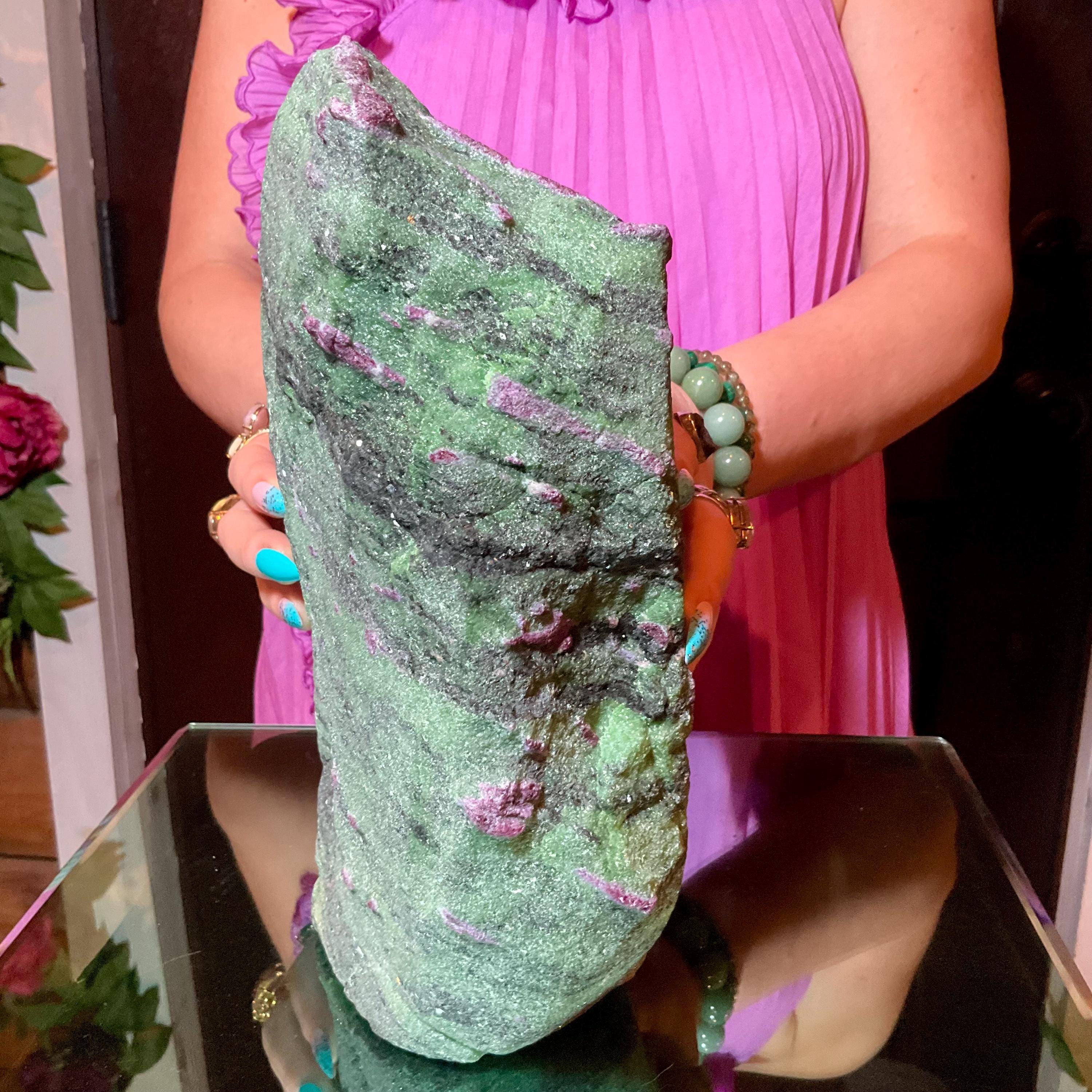 I am very happy to pass along this large, 17 pound 8-ounce Ruby Zoisite crystal Cluster measuring 9 1/2 inches tall, 3 inches thick and 7 inches wide.