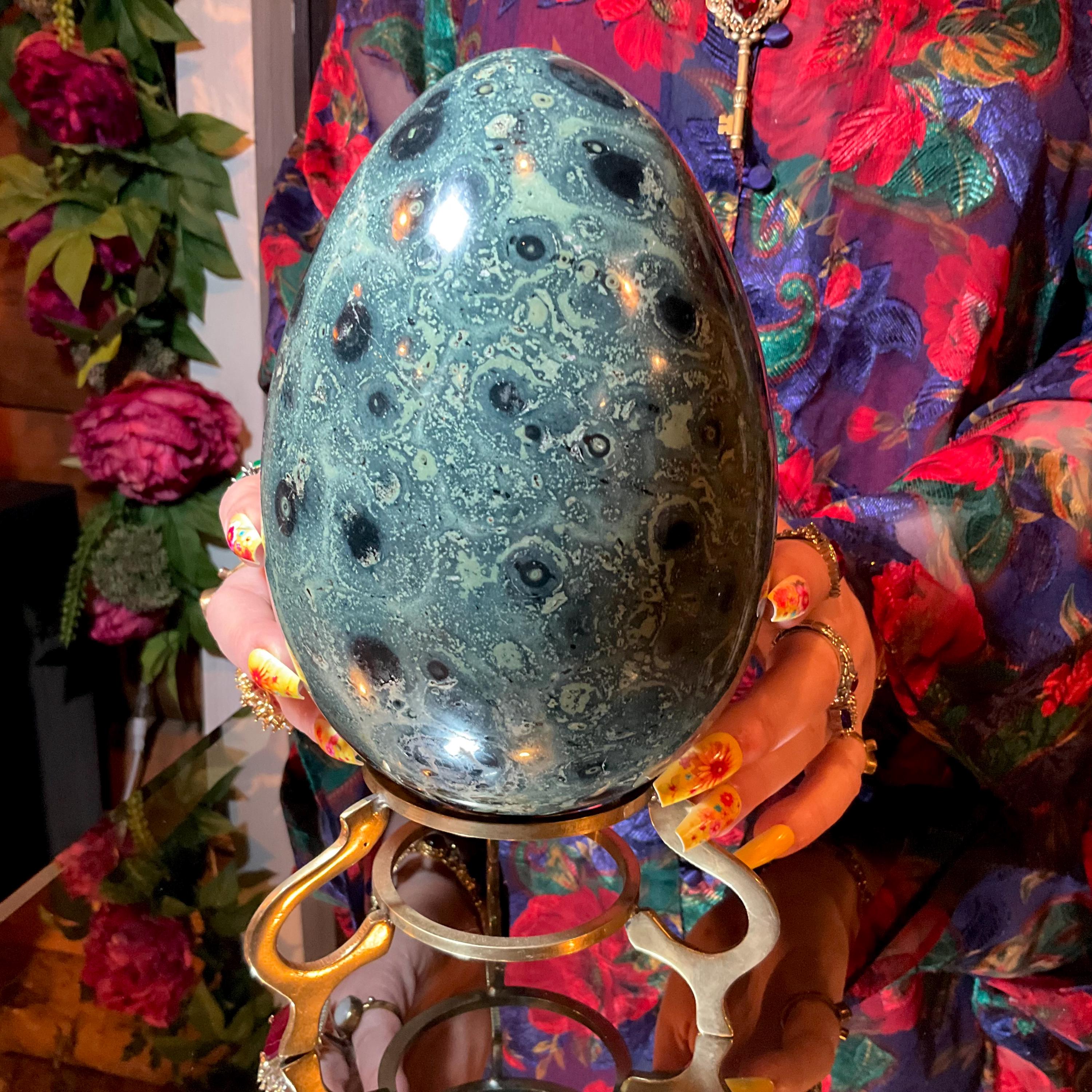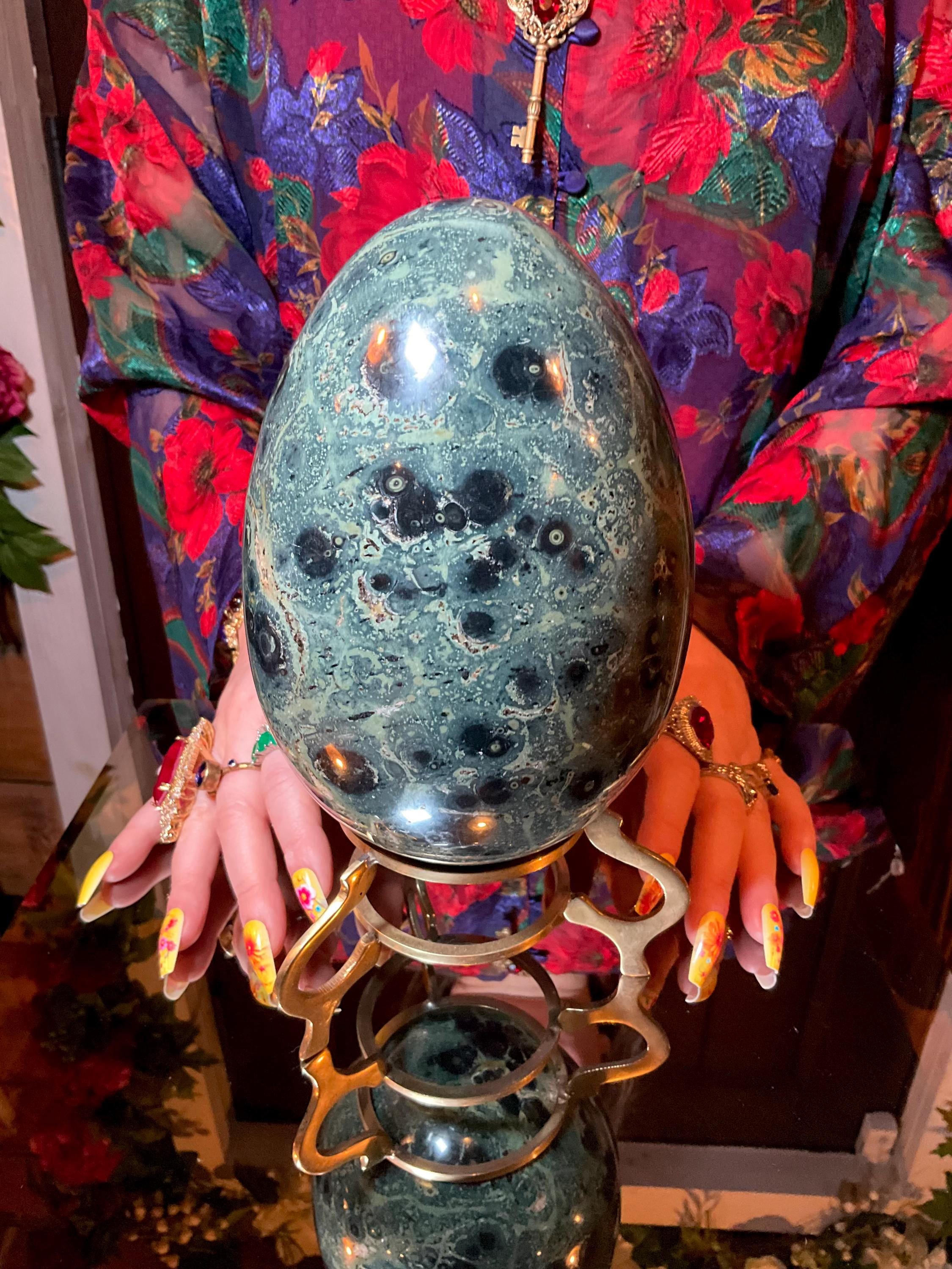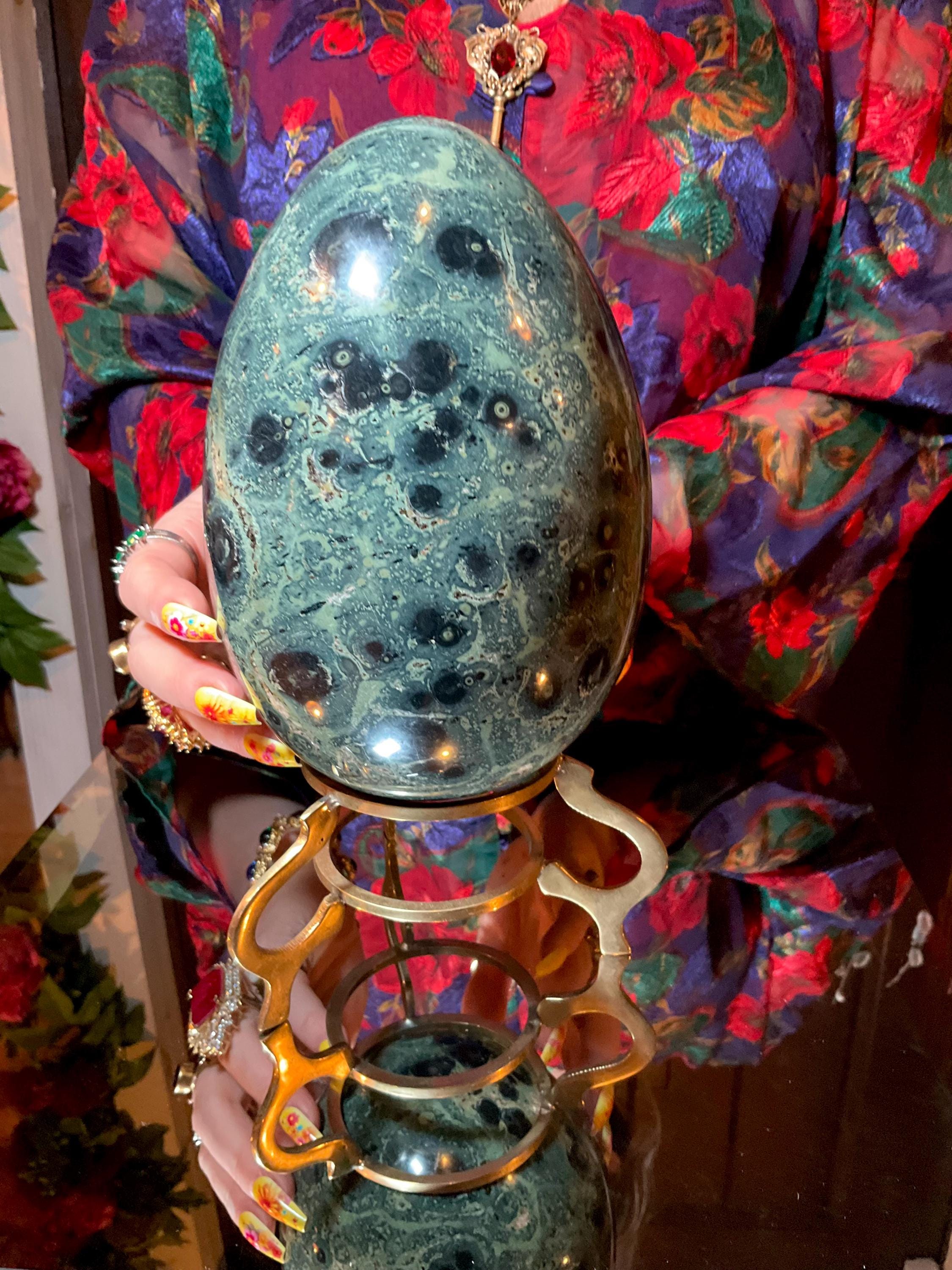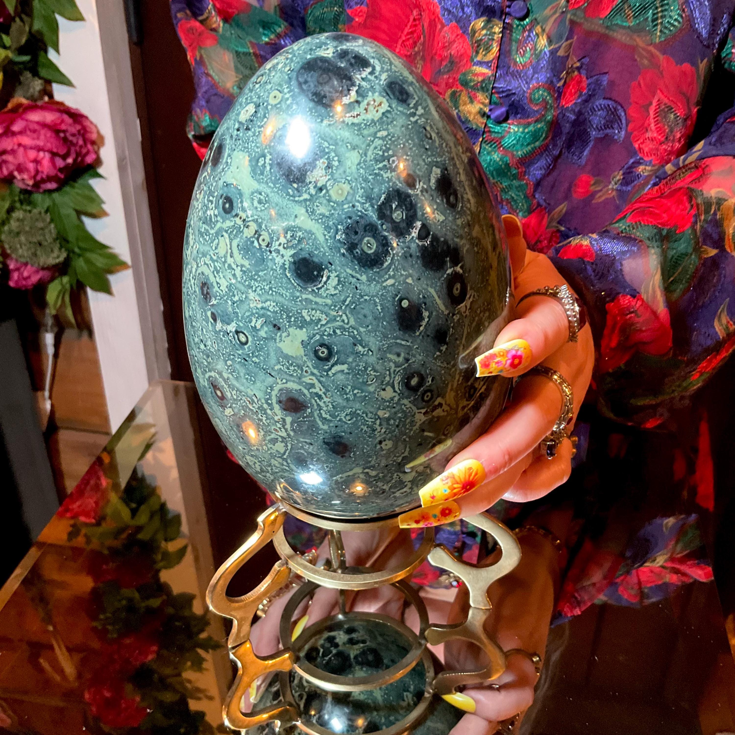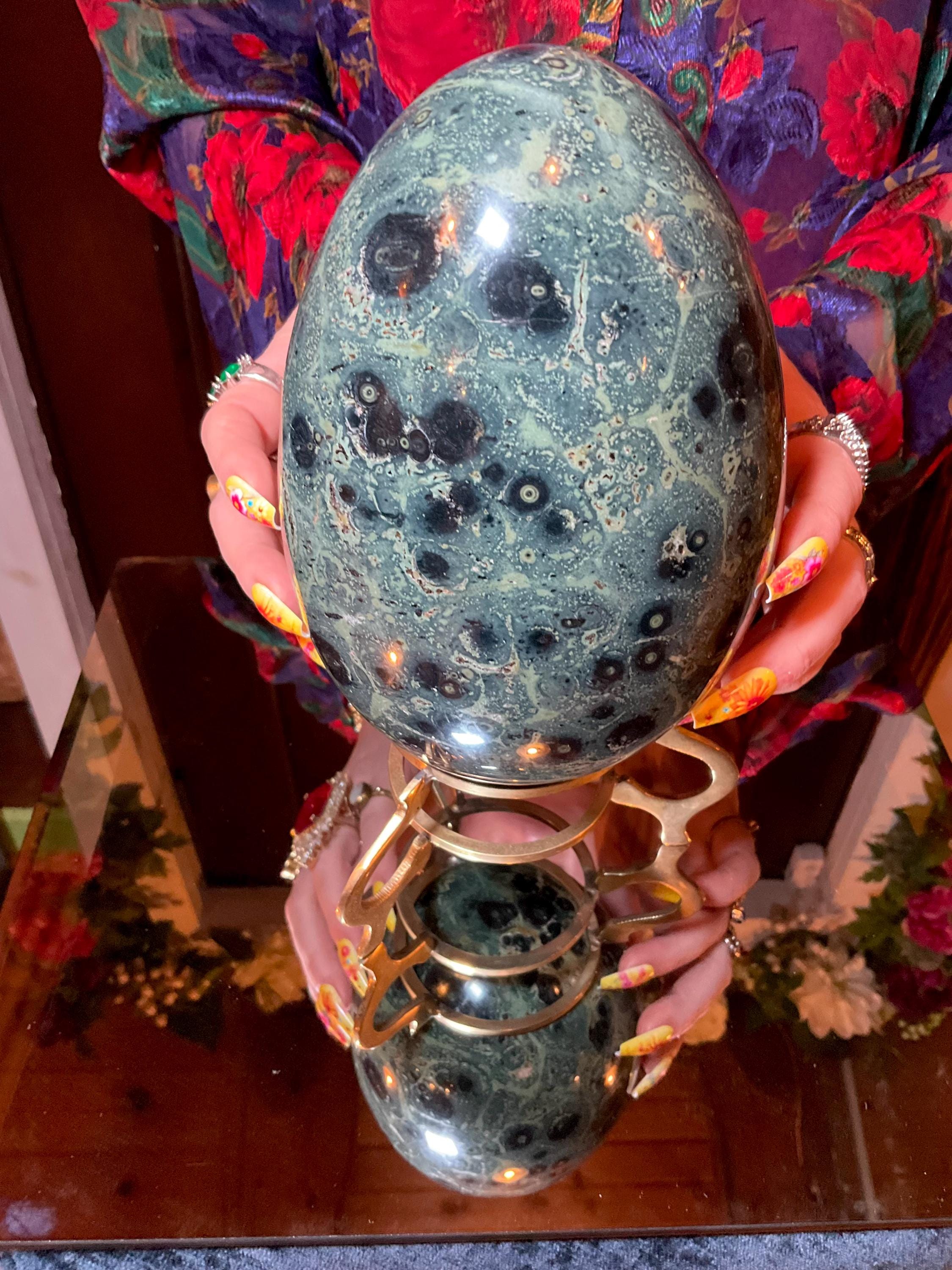 Kambaba Jasper Crystal Egg Large 8 lb. W/ Brass Stand ~ 7" Tall ~ Sparkling Green & Black Colors Swirling Inclusions ~ Meditation, Altar Décor, Reiki, Zen