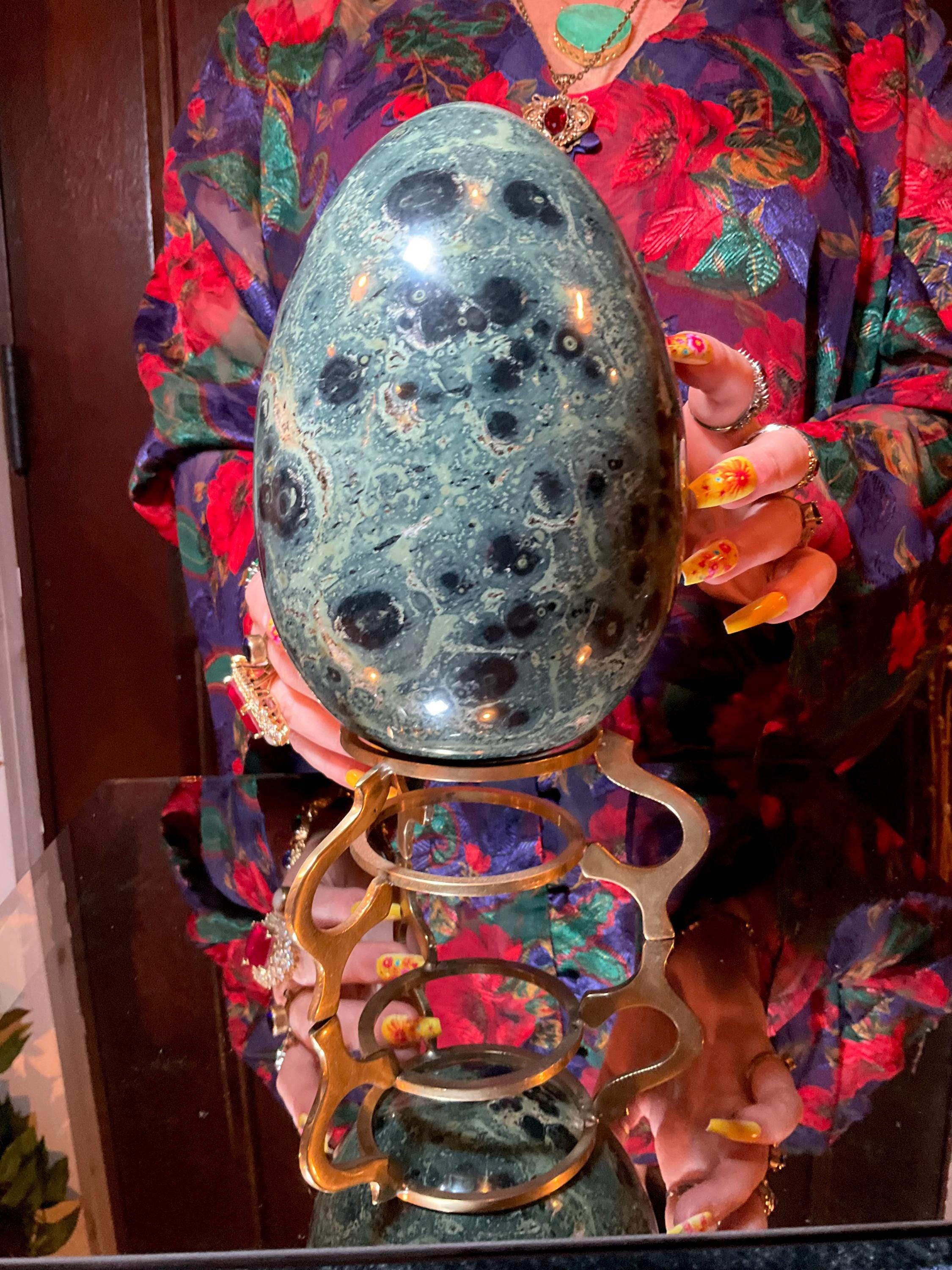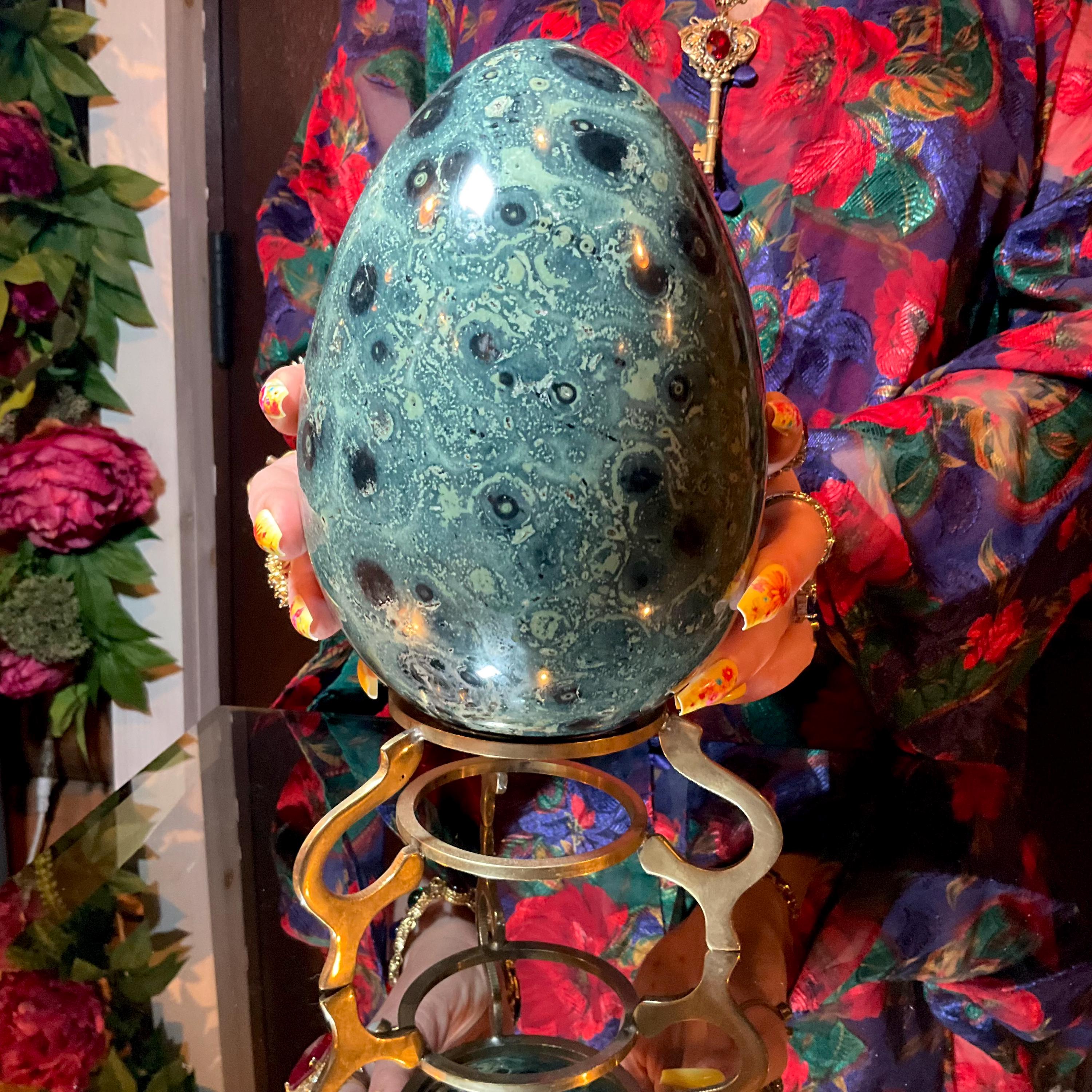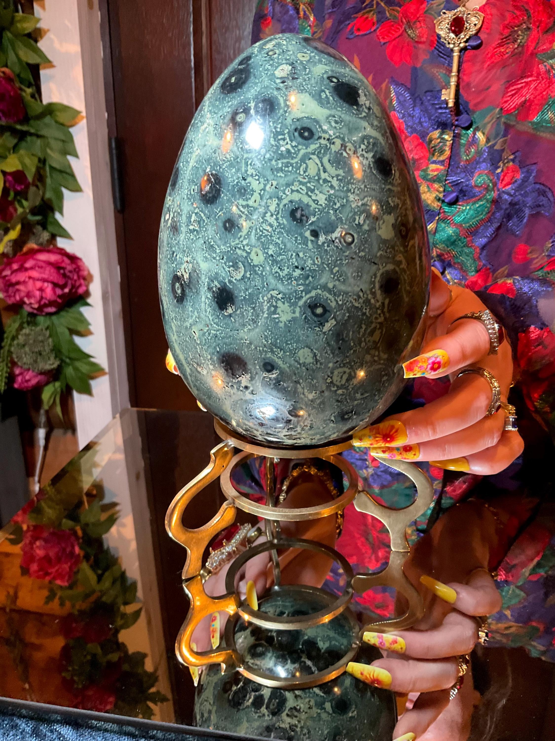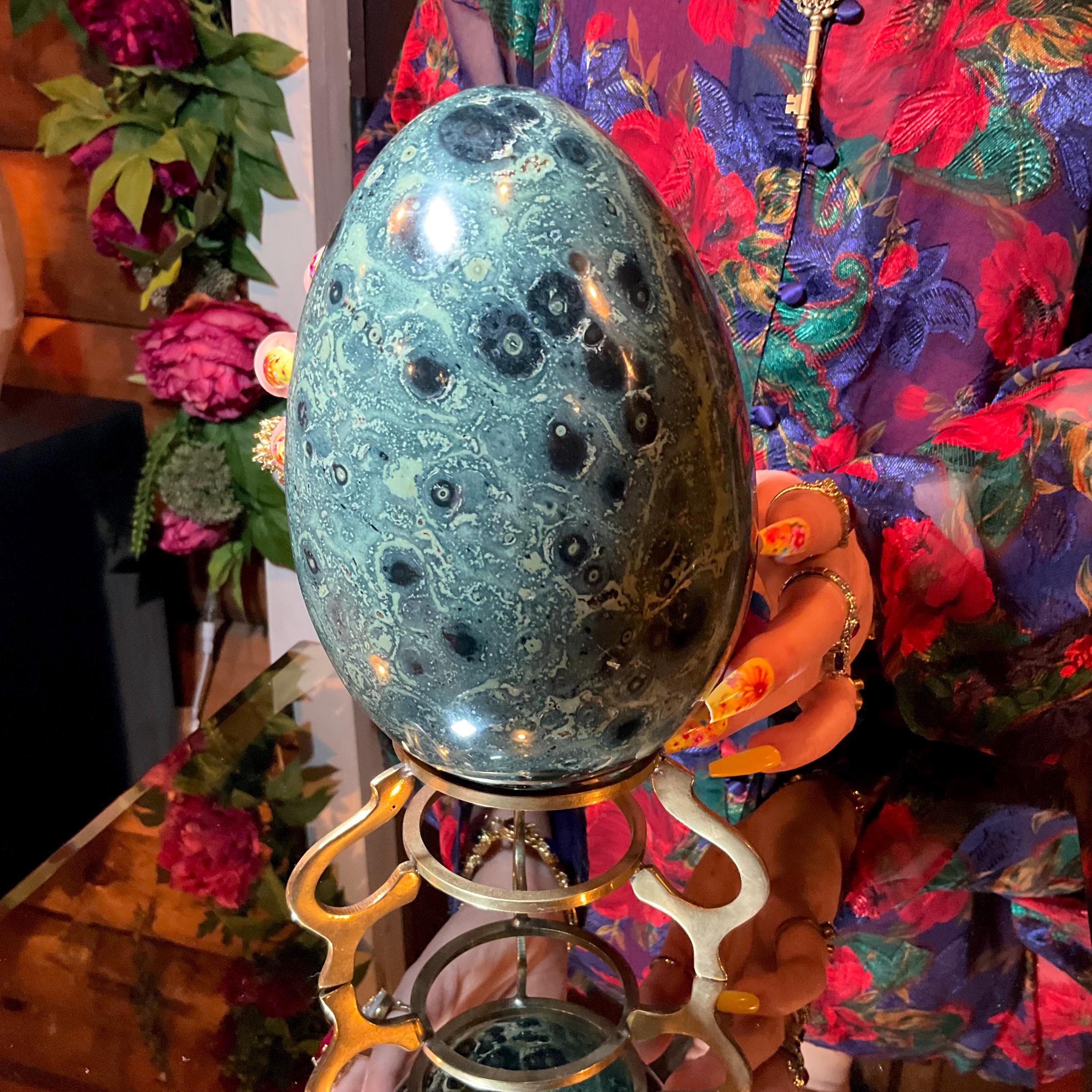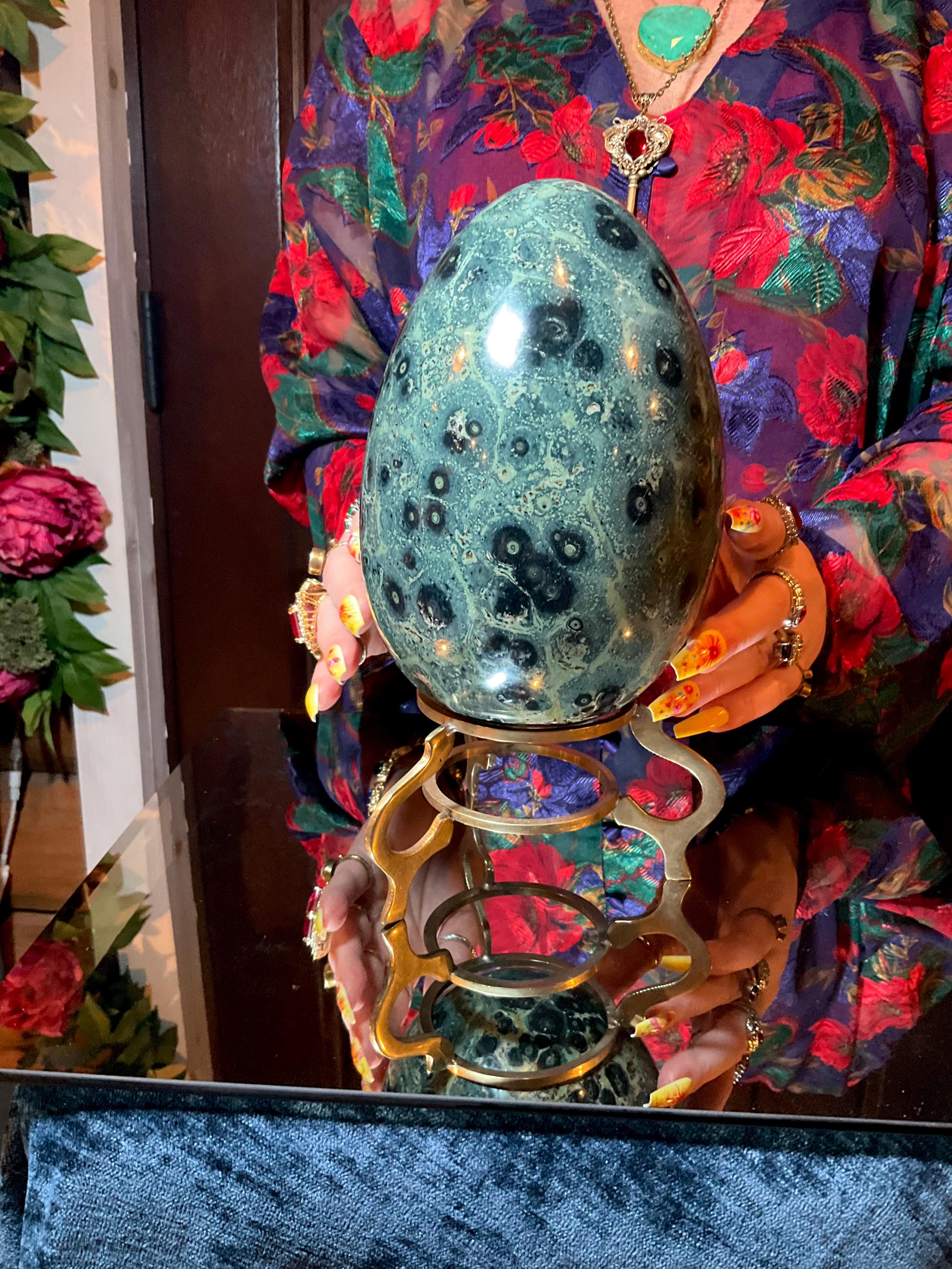 Kambaba Jasper Crystal Egg Large 8 lb. W/ Brass Stand ~ 7" Tall ~ Sparkling Green & Black Colors Swirling Inclusions ~ Meditation, Altar Décor, Reiki, Zen