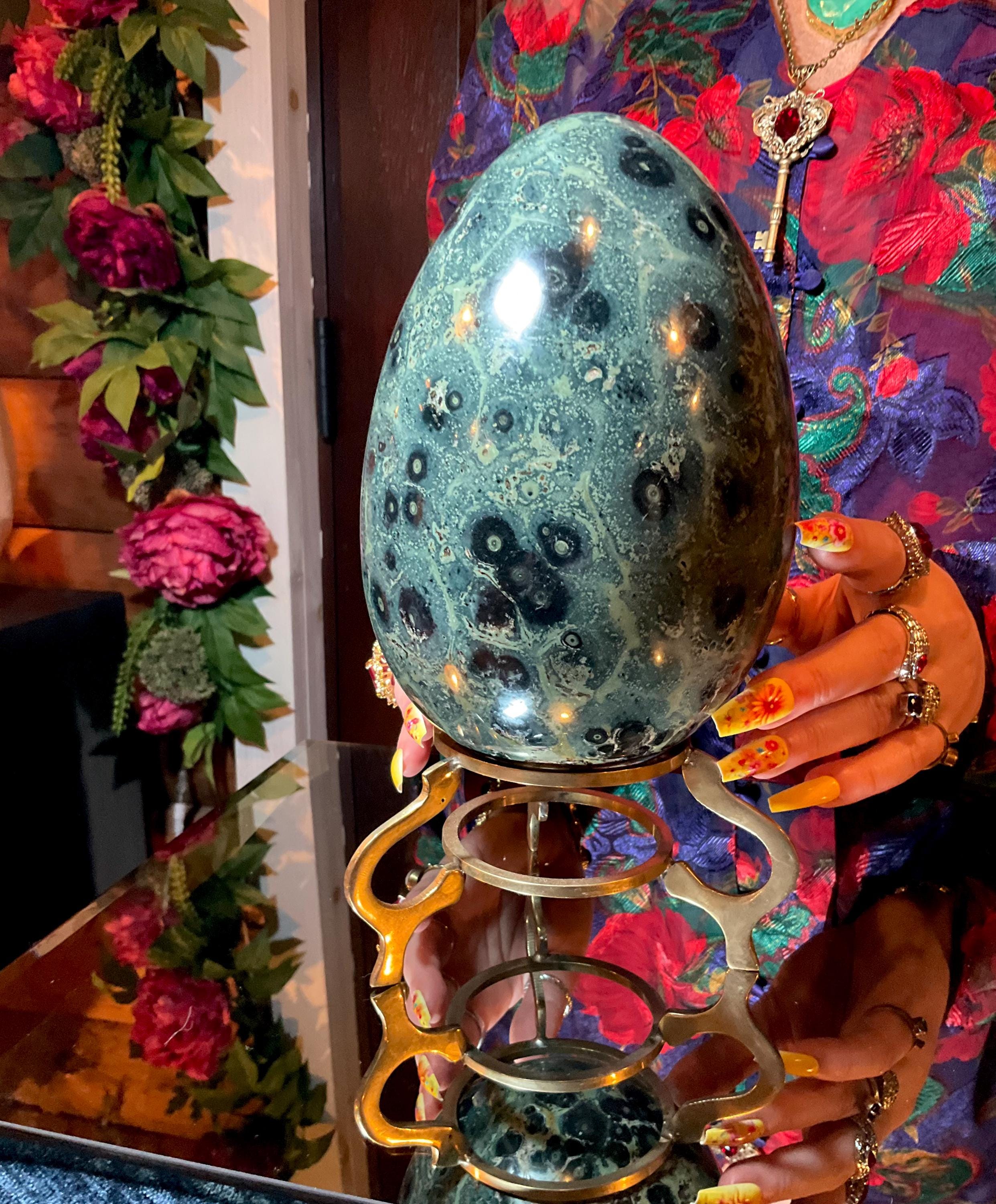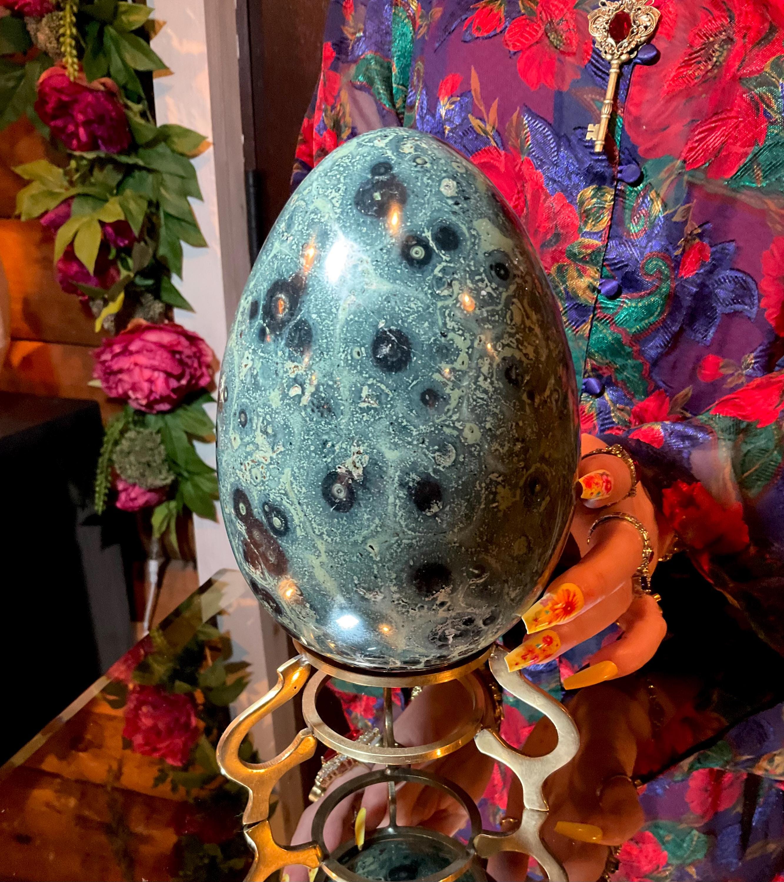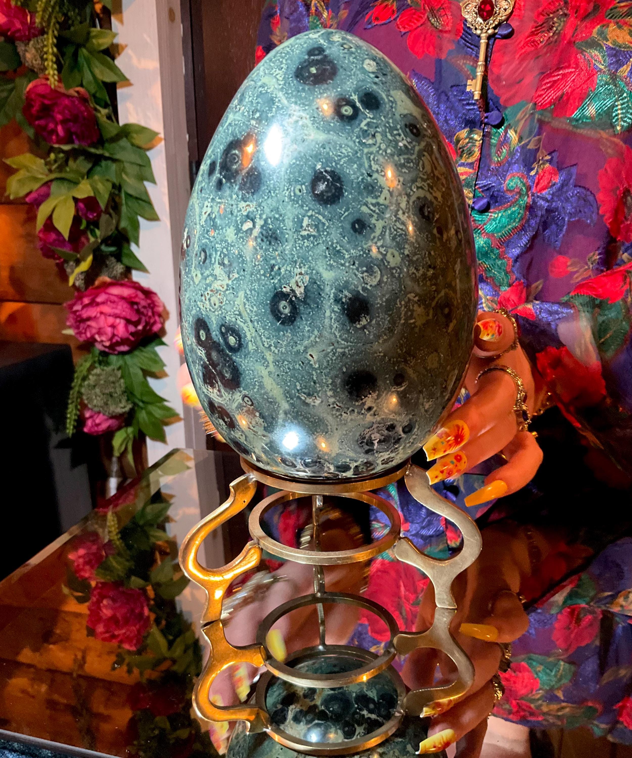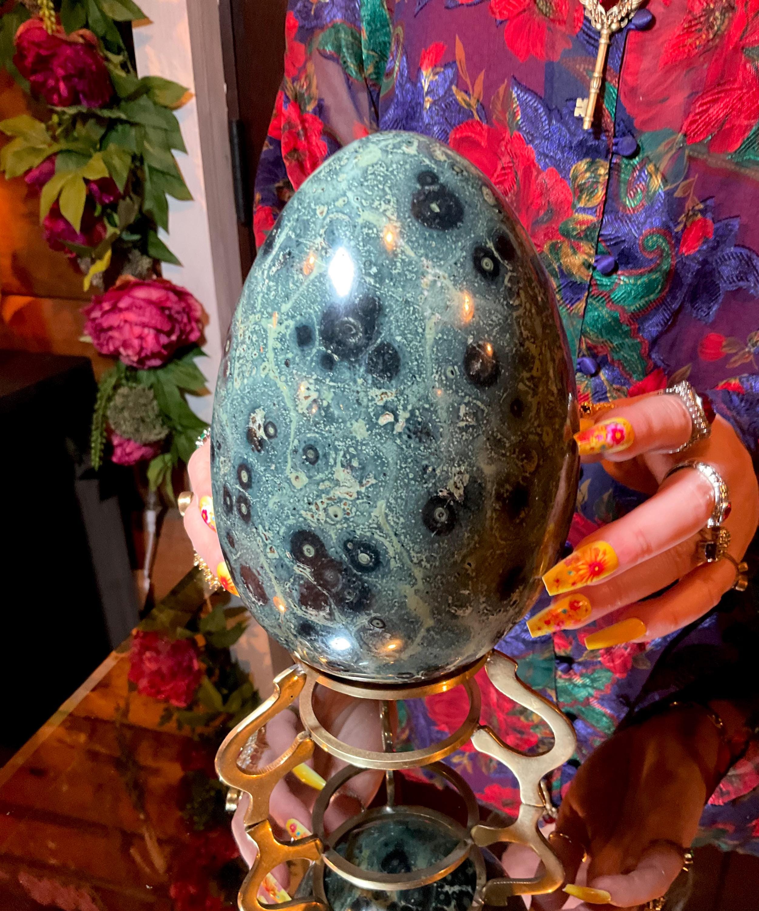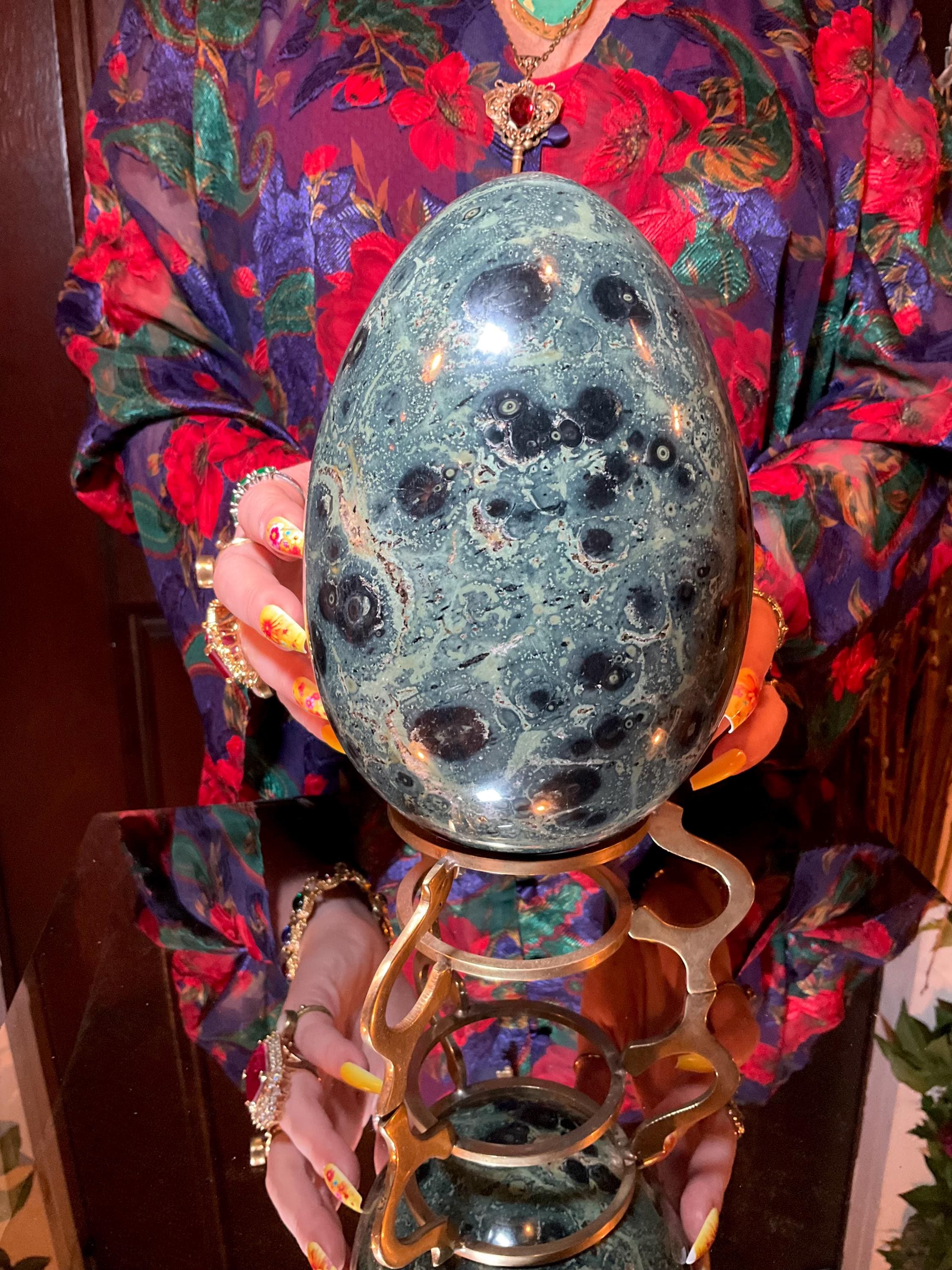 Kambaba Jasper Crystal Egg Large 8 lb. W/ Brass Stand ~ 7" Tall ~ Sparkling Green & Black Colors Swirling Inclusions ~ Meditation, Altar Décor, Reiki, Zen