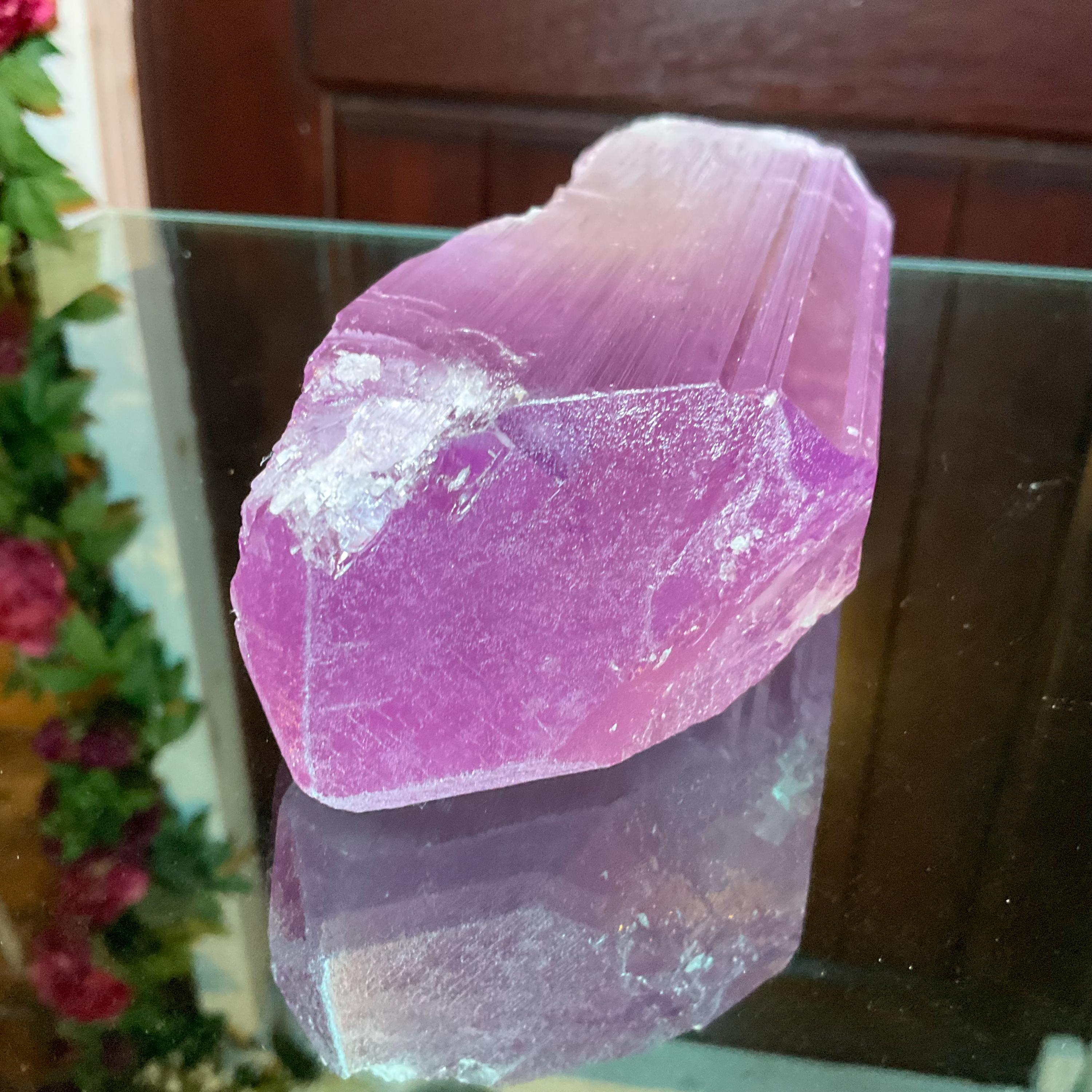 This natural Kunzite gemstone measures 6 inches long, 2 inches wide and 1 1/2 inches thick and weighs a mighty 1 pound 10 ounces.