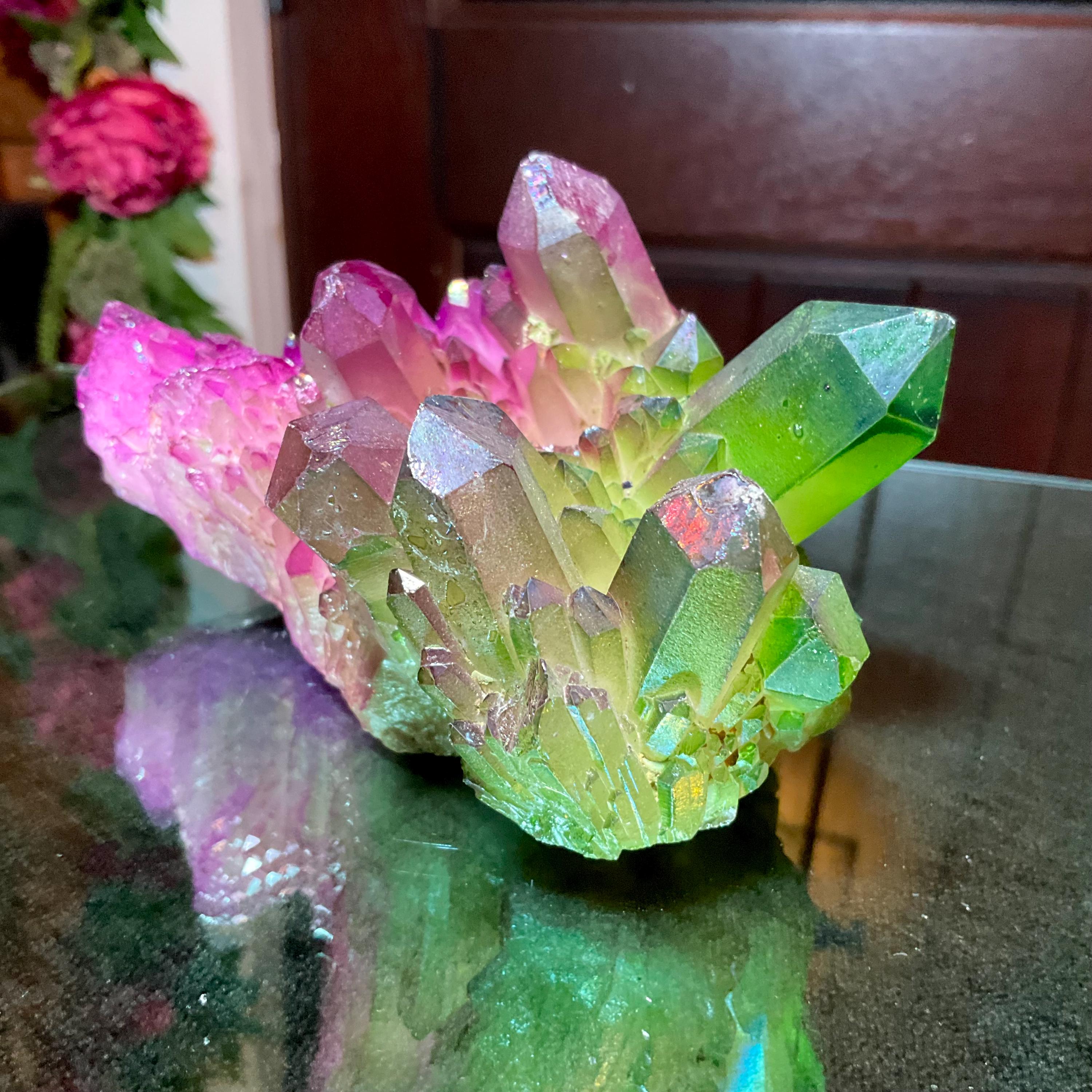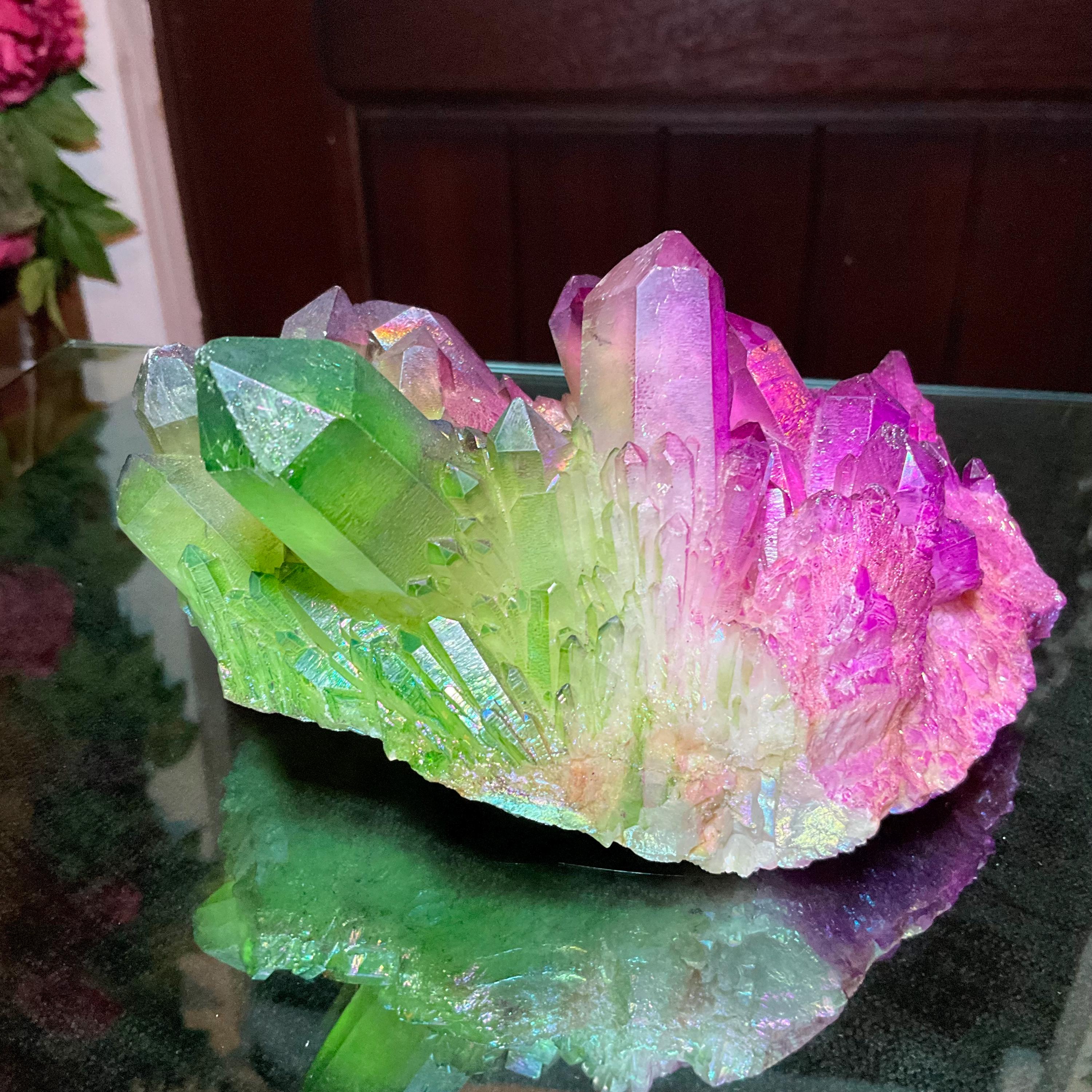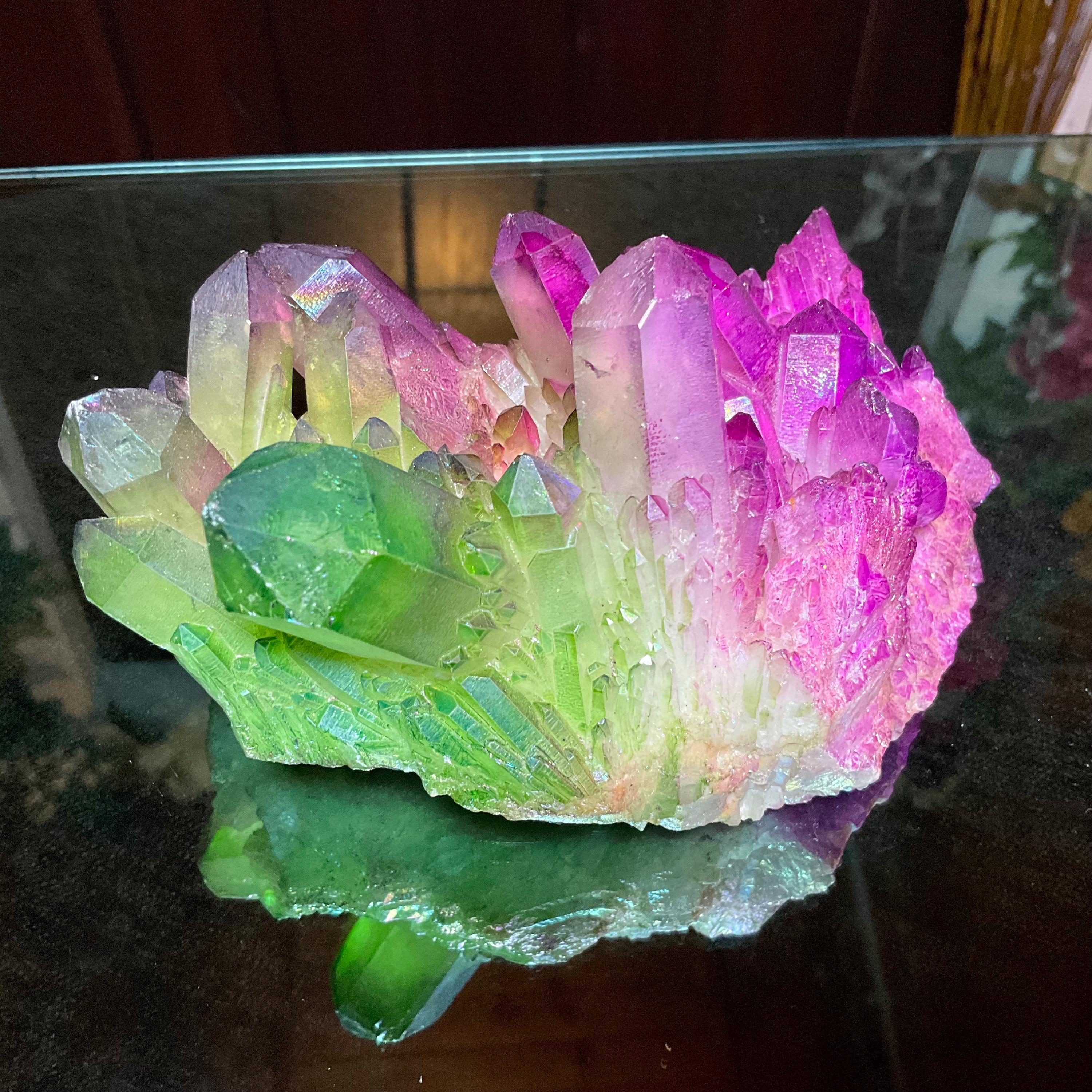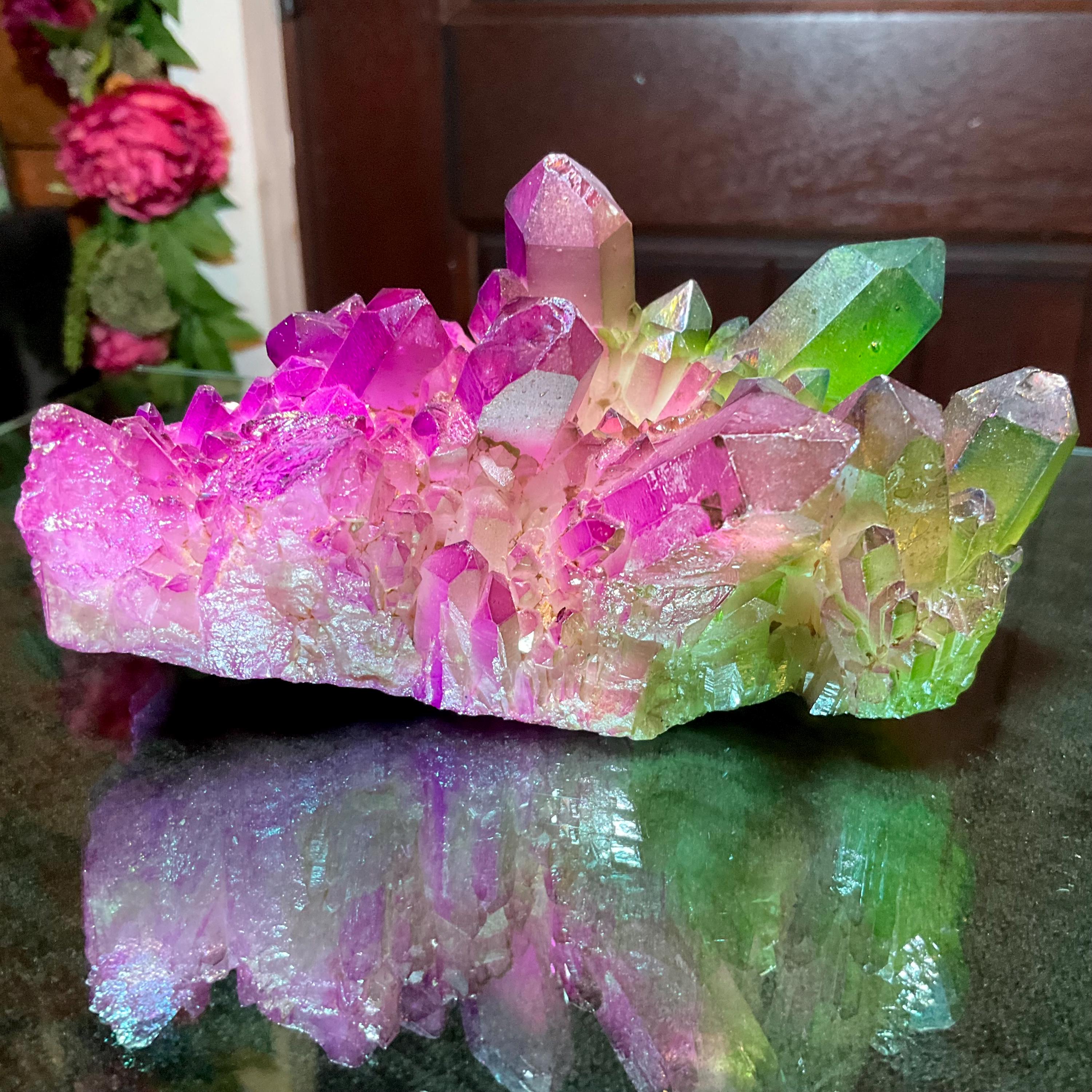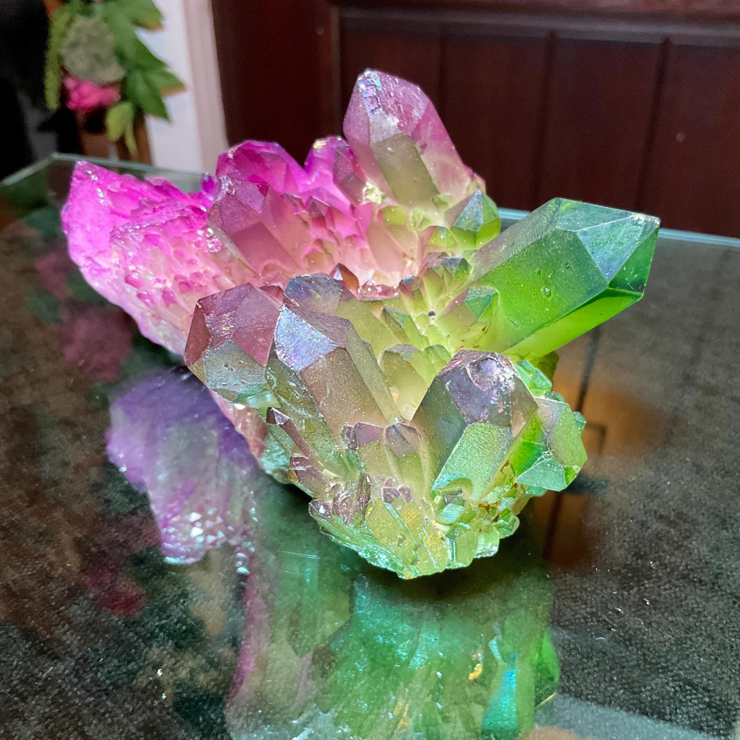 It is a natural quartz cluster that has been infused with heat and precious metals, in an alchemical process, to result in this stunning dazzler.