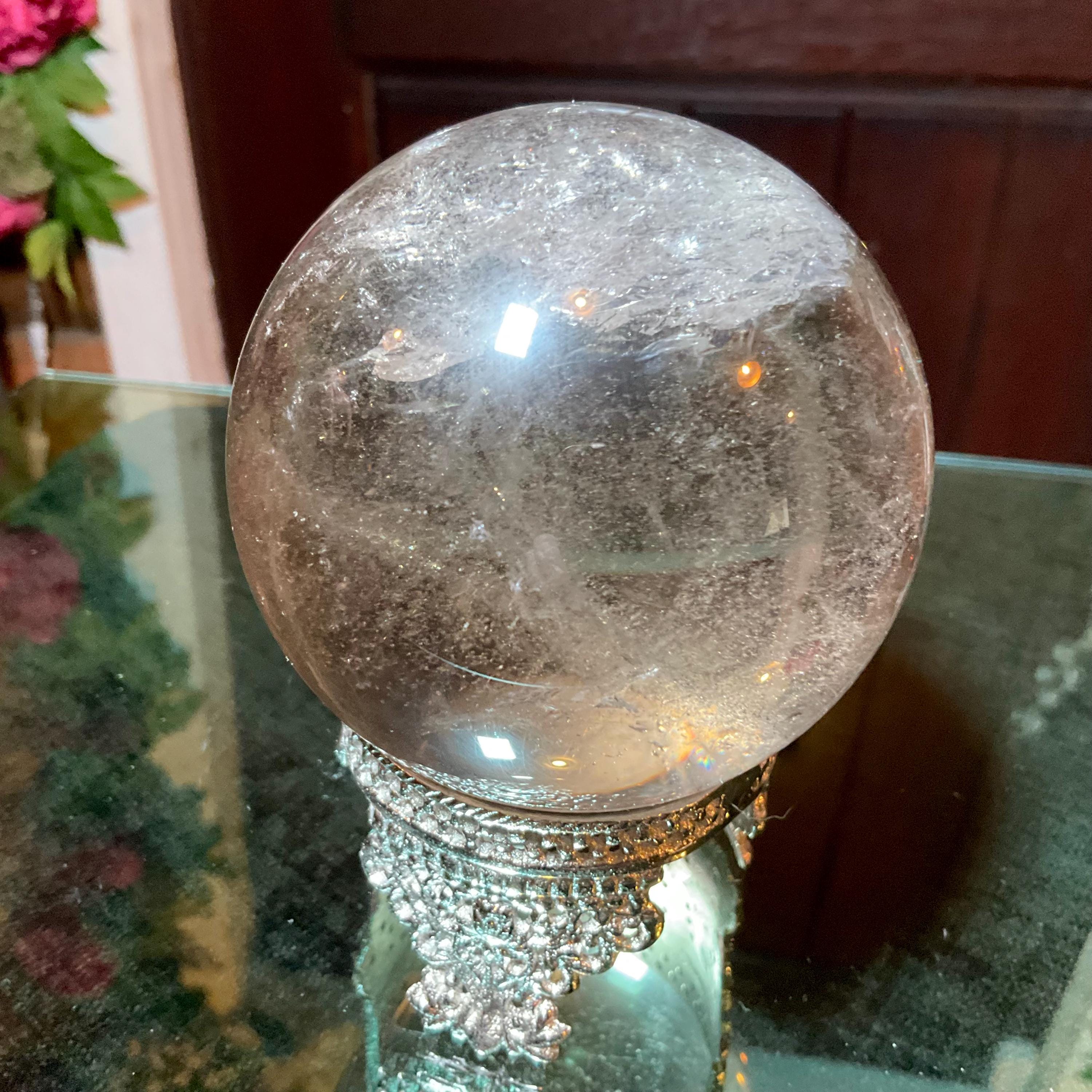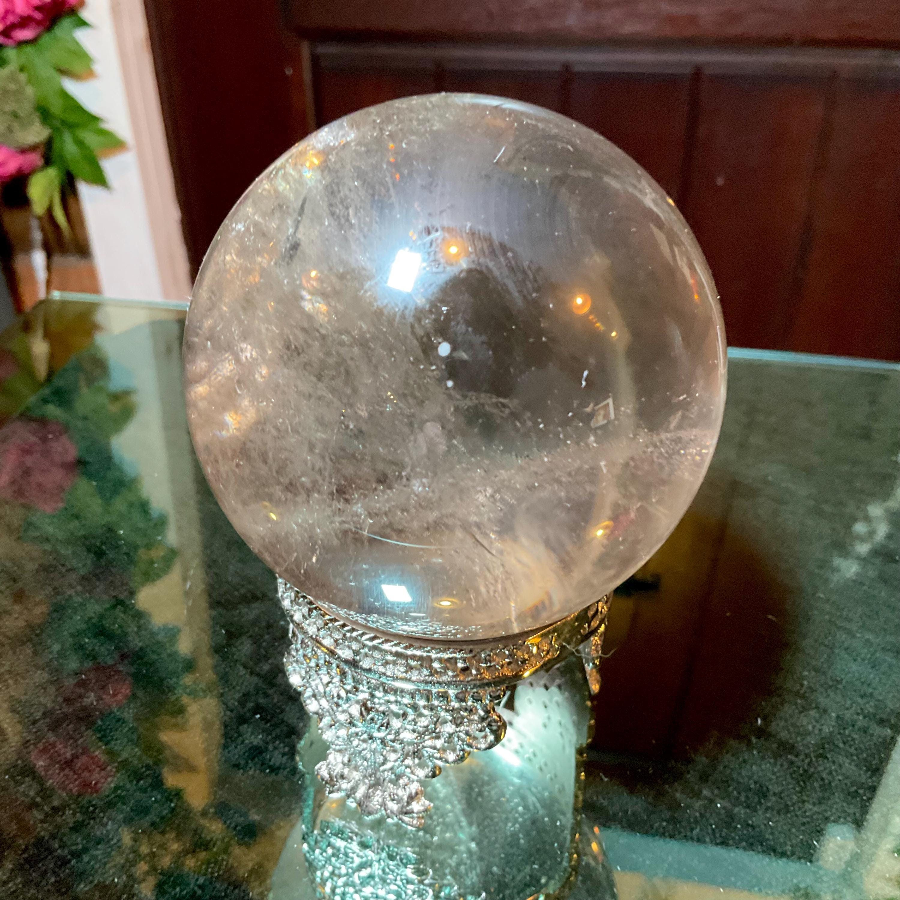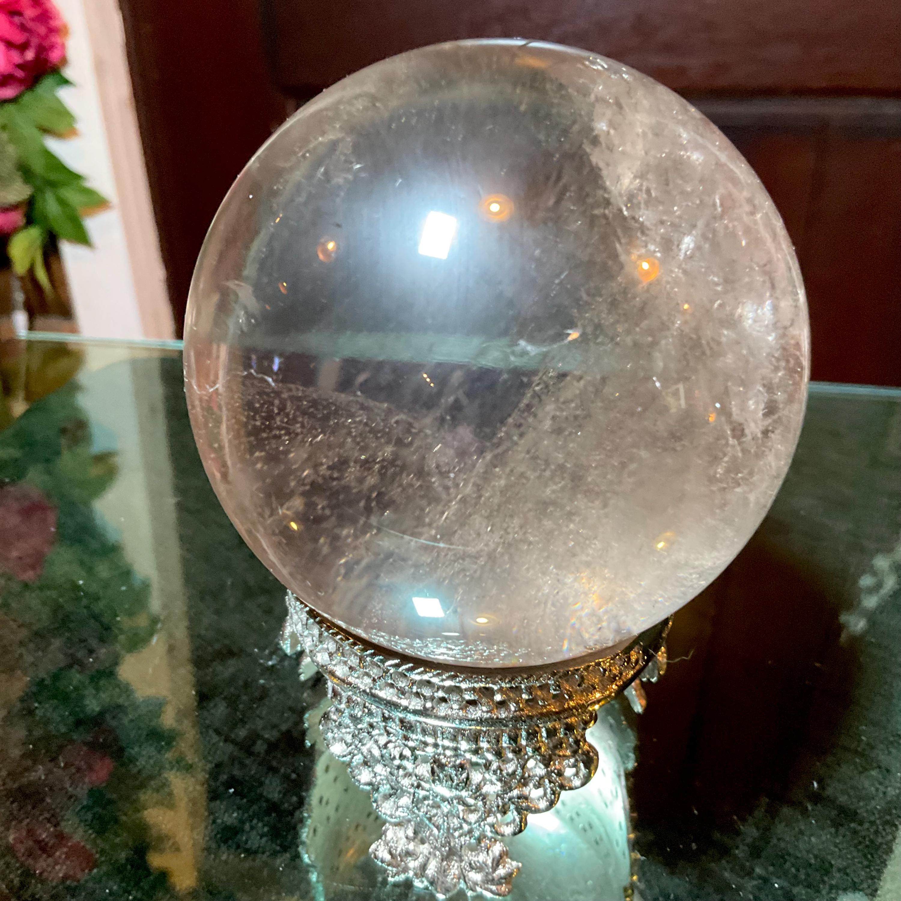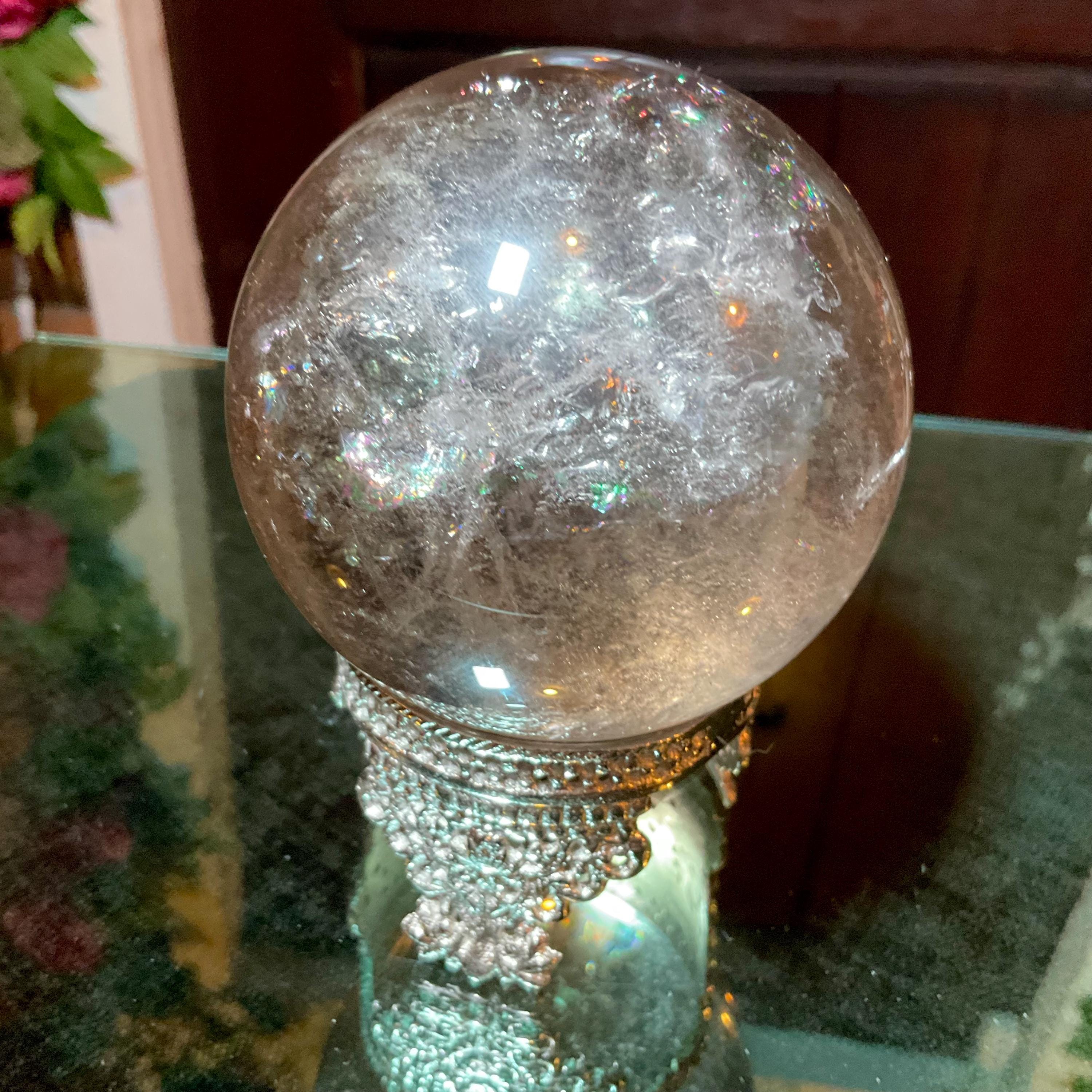 I am very happy to pass along this 1 pound 8-ounce, crystal clear ball, sphere, approximately 3 inches across and it comes with a beautiful crystal ball with a 2- decorative silver display stand as pictured.