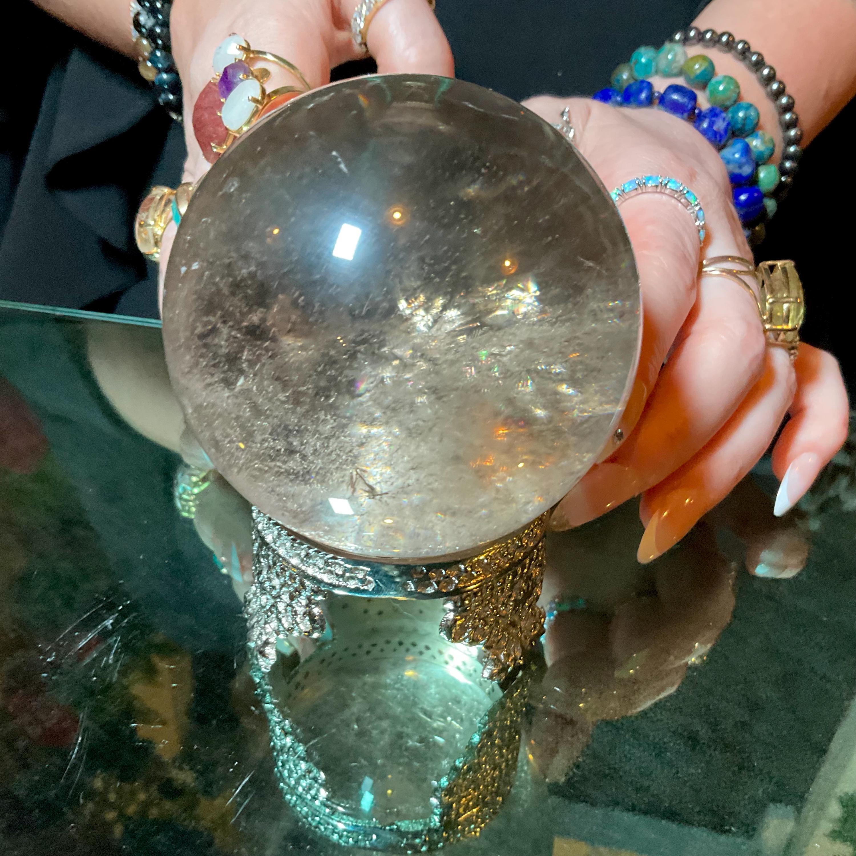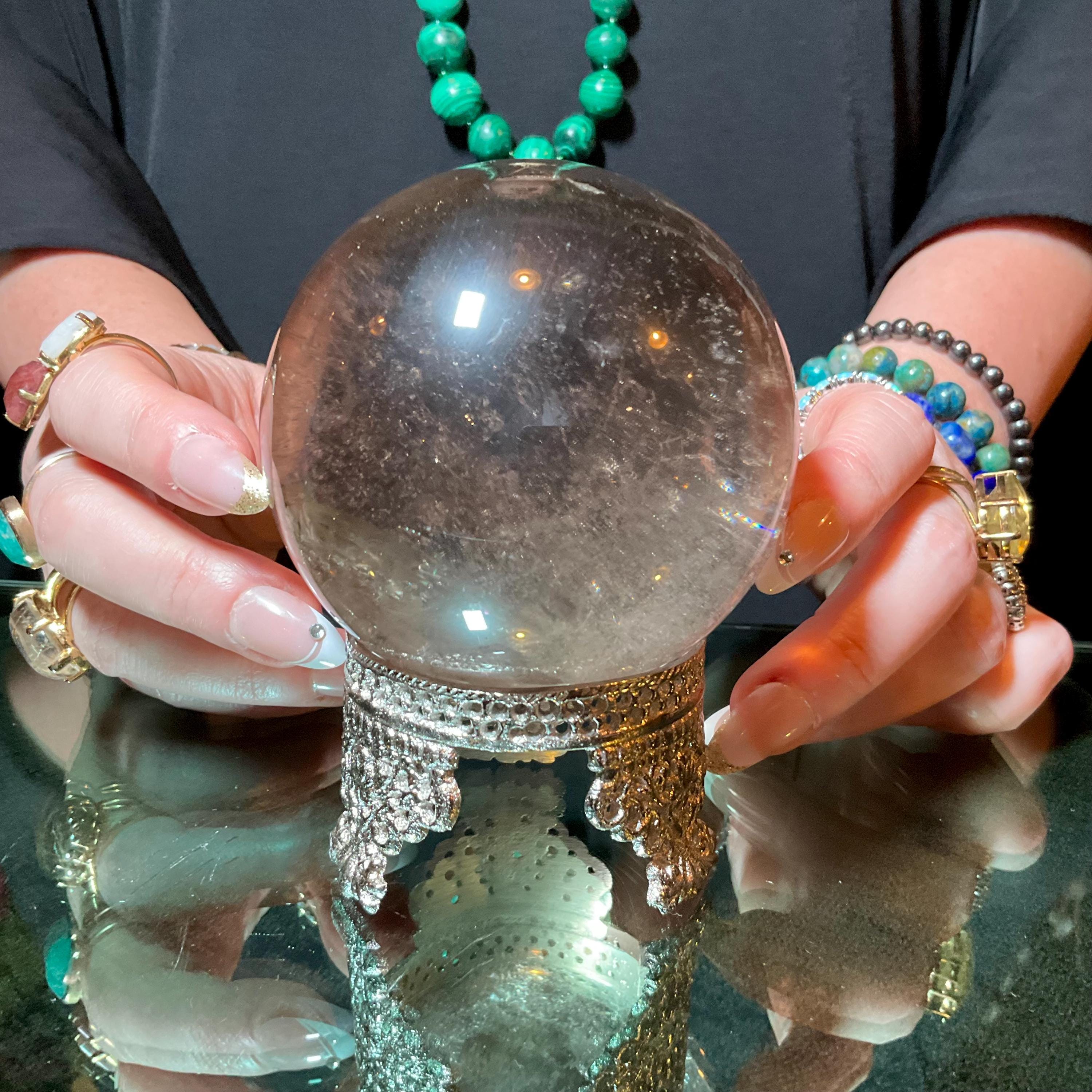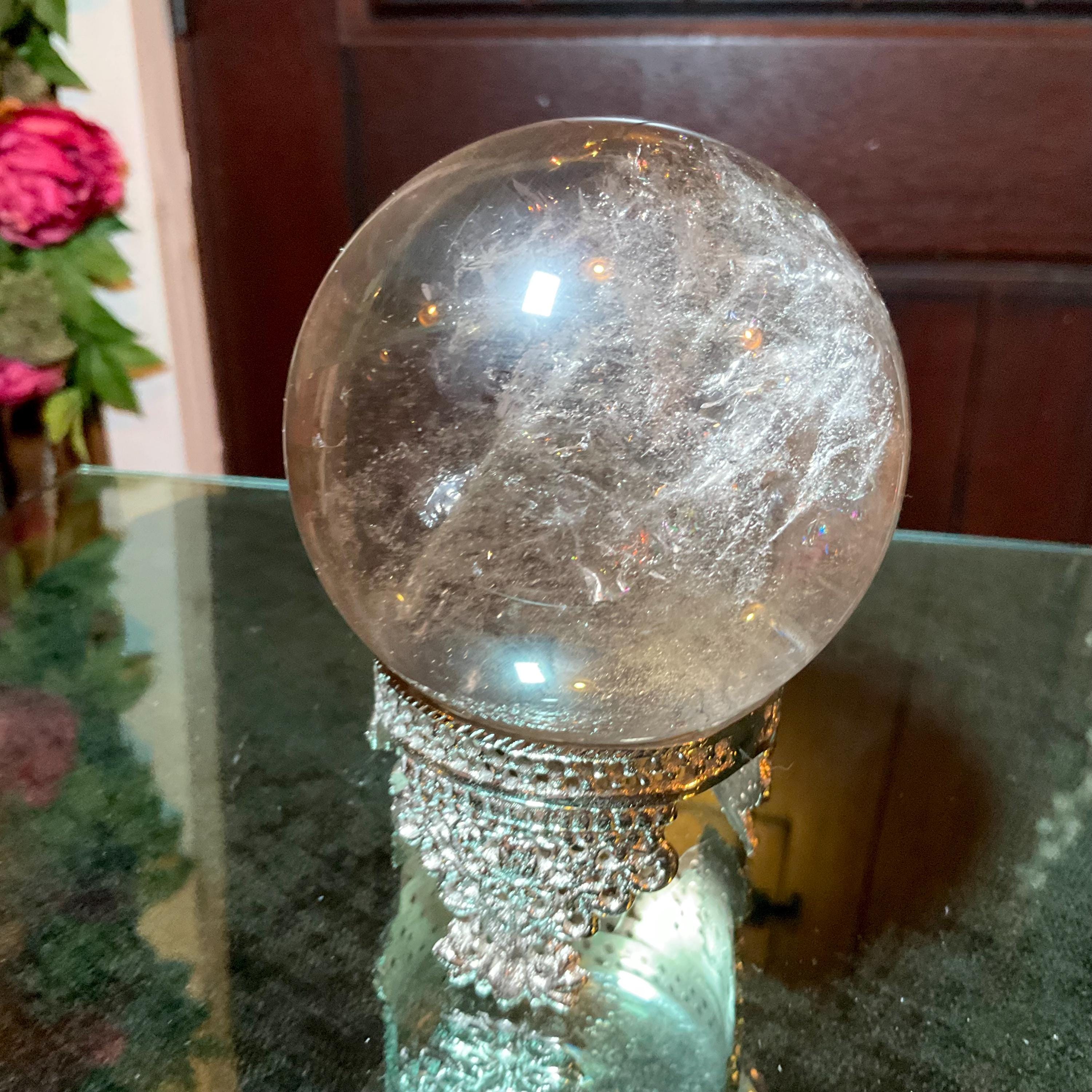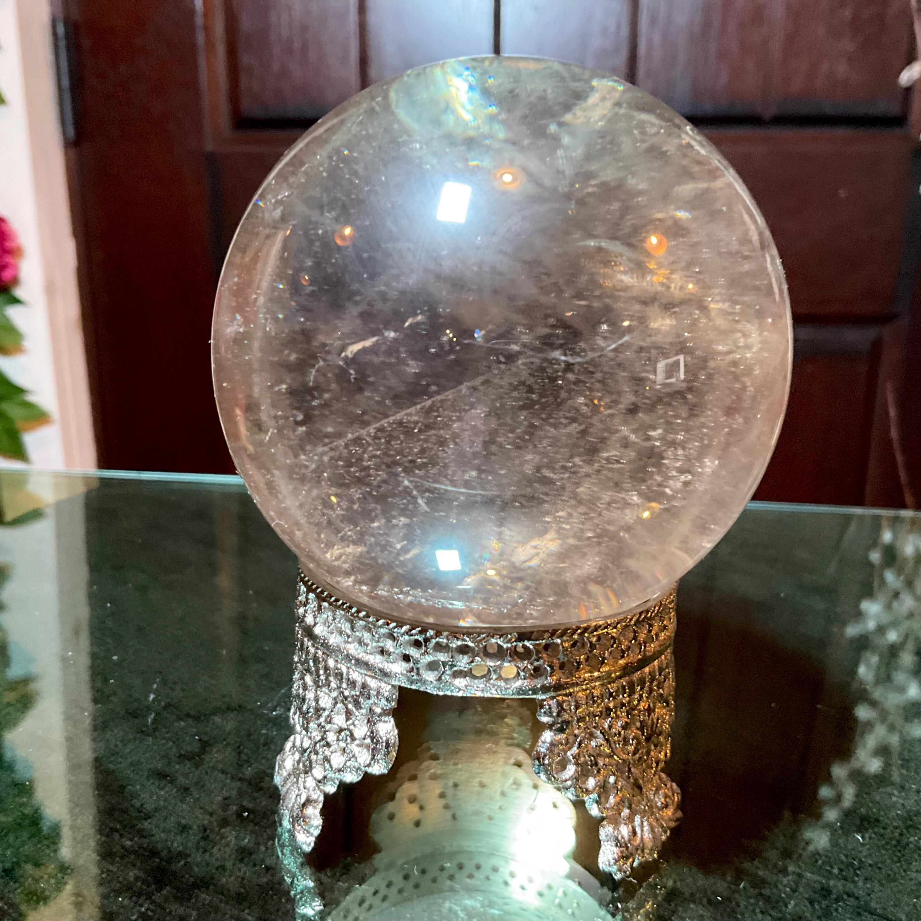 I am very happy to pass along this 1 pound 8-ounce, crystal clear ball, sphere, approximately 3 inches across and it comes with a beautiful crystal ball with a 2- decorative silver display stand as pictured.