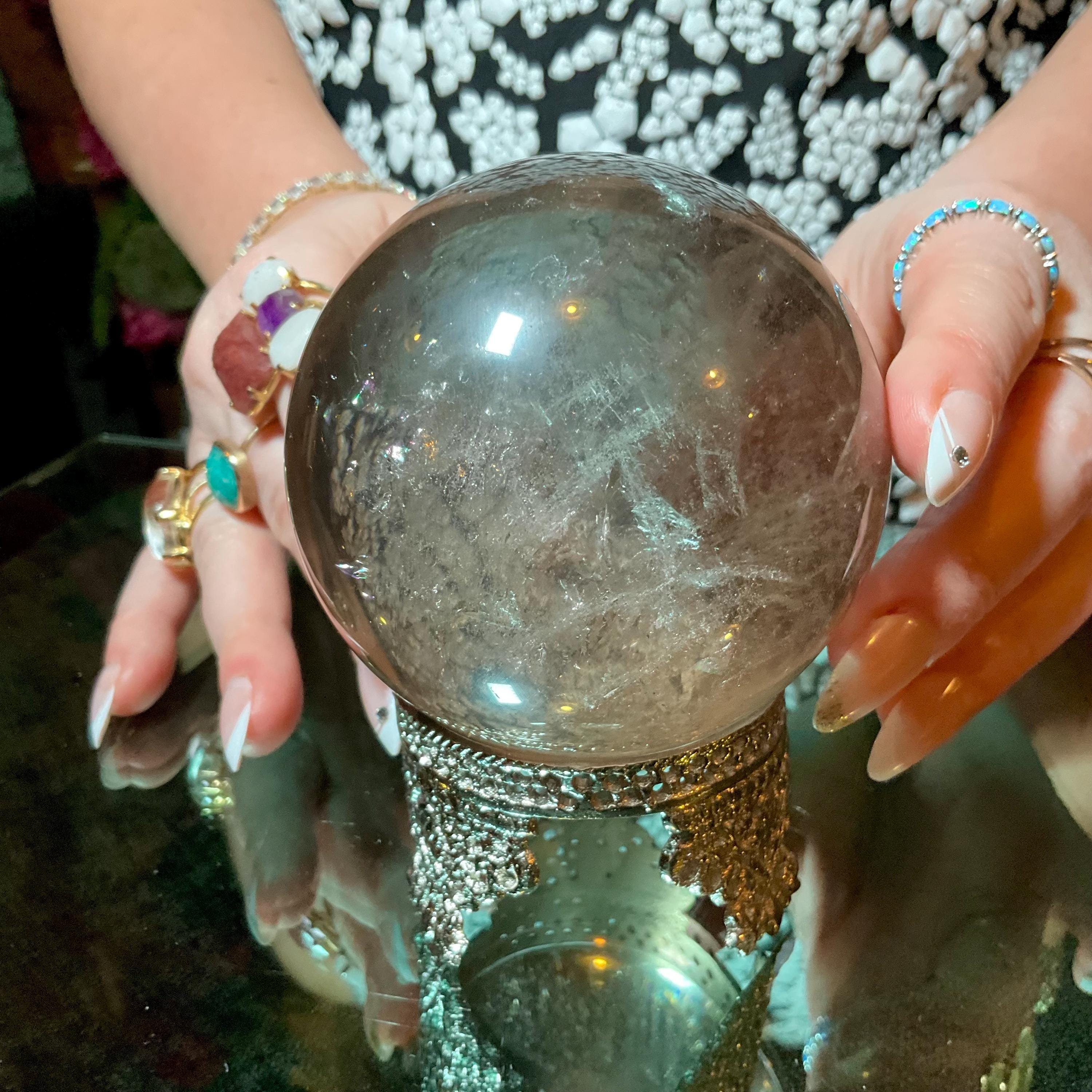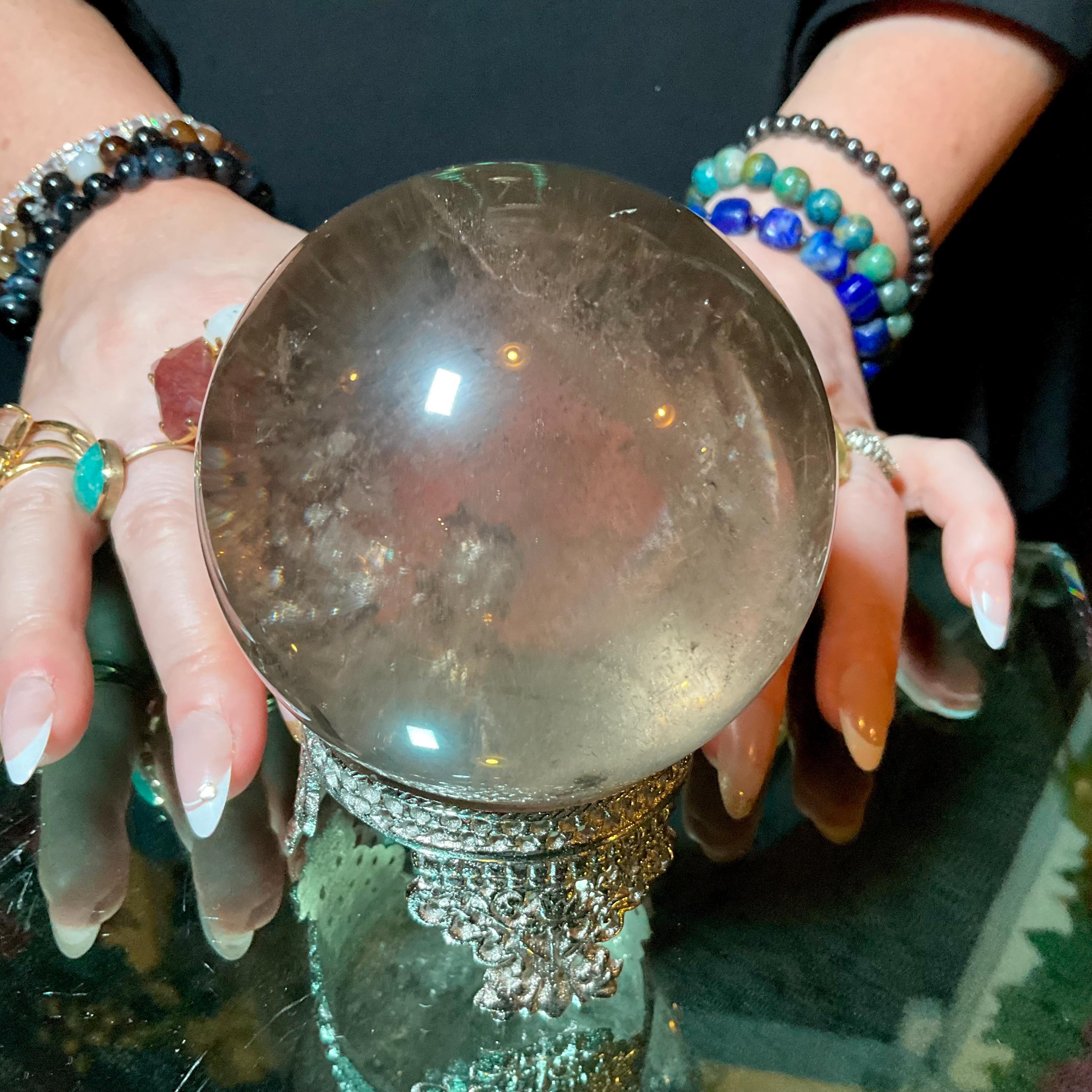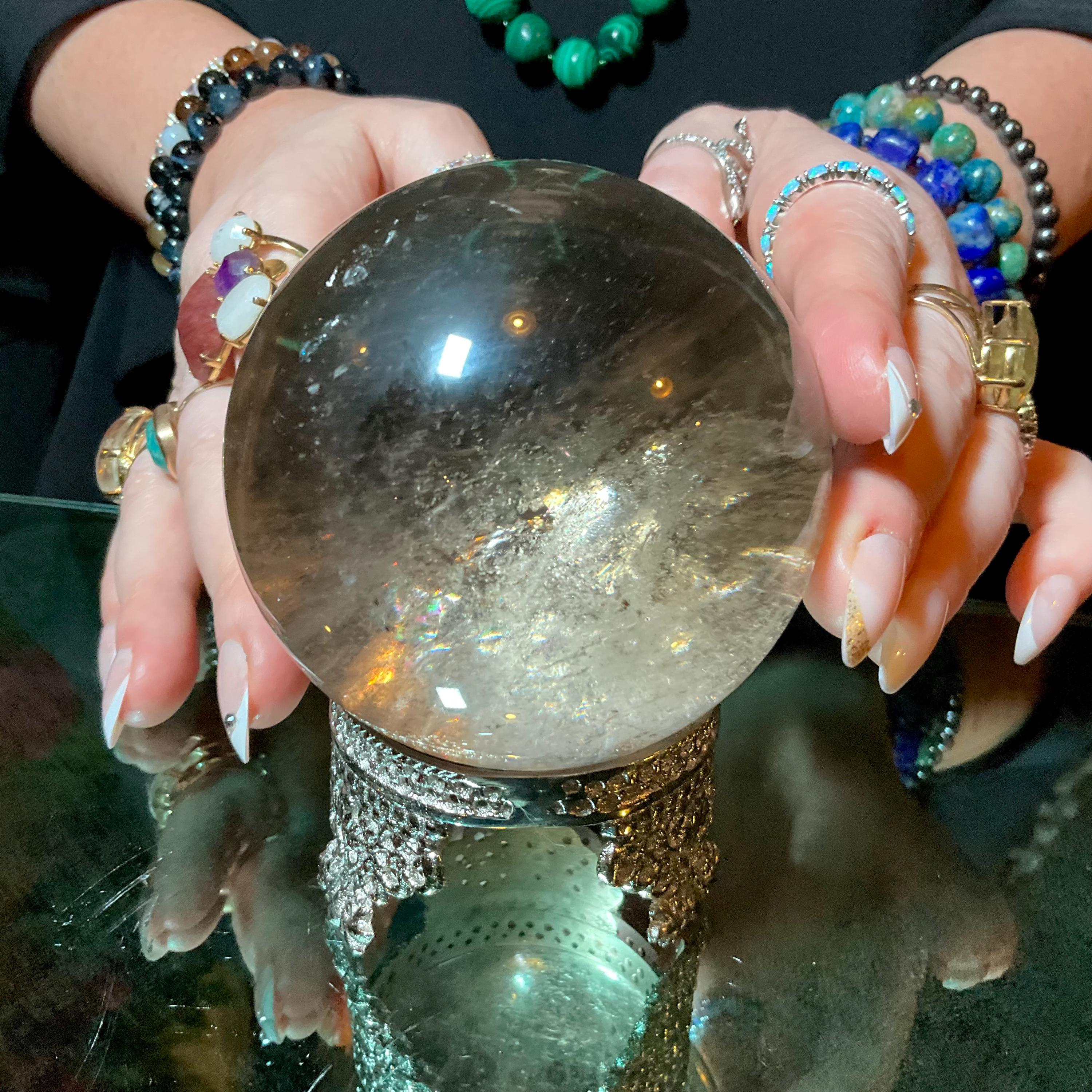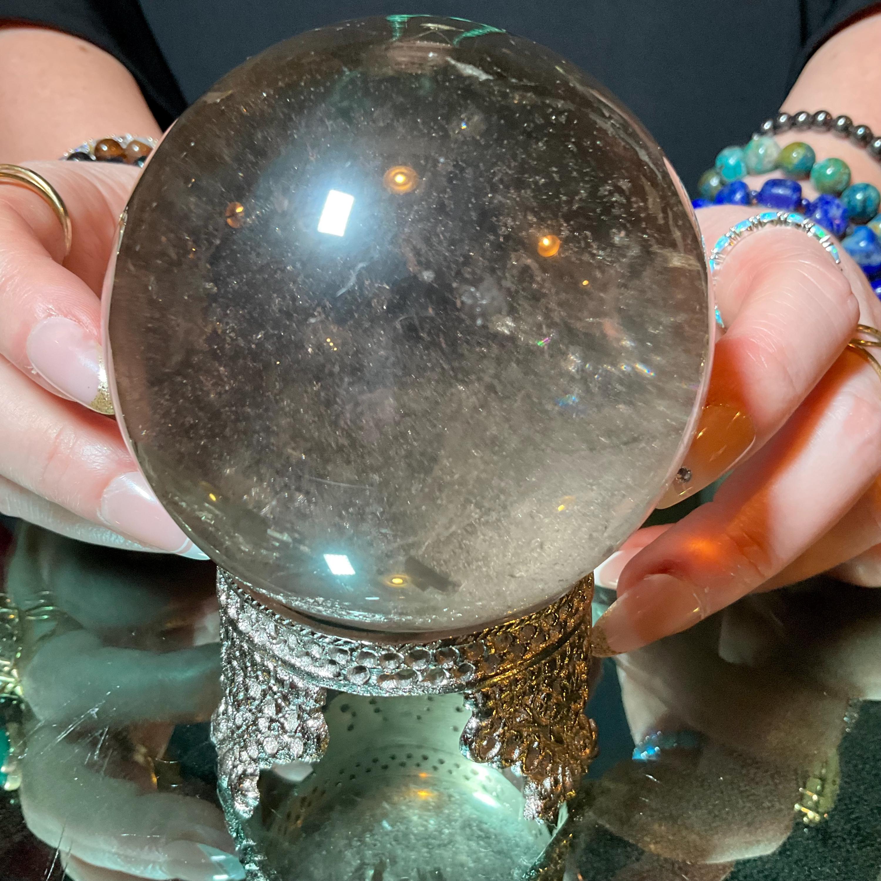 I am very happy to pass along this 1 pound 8-ounce, crystal clear ball, sphere, approximately 3 inches across and it comes with a beautiful crystal ball with a 2- decorative silver display stand as pictured.