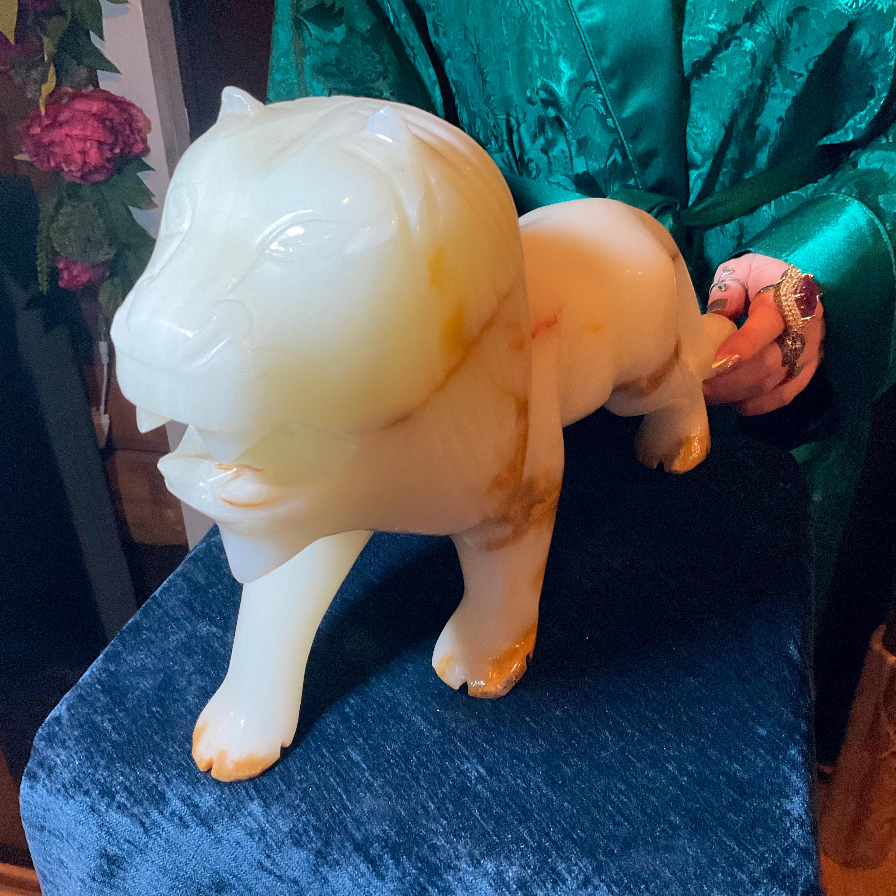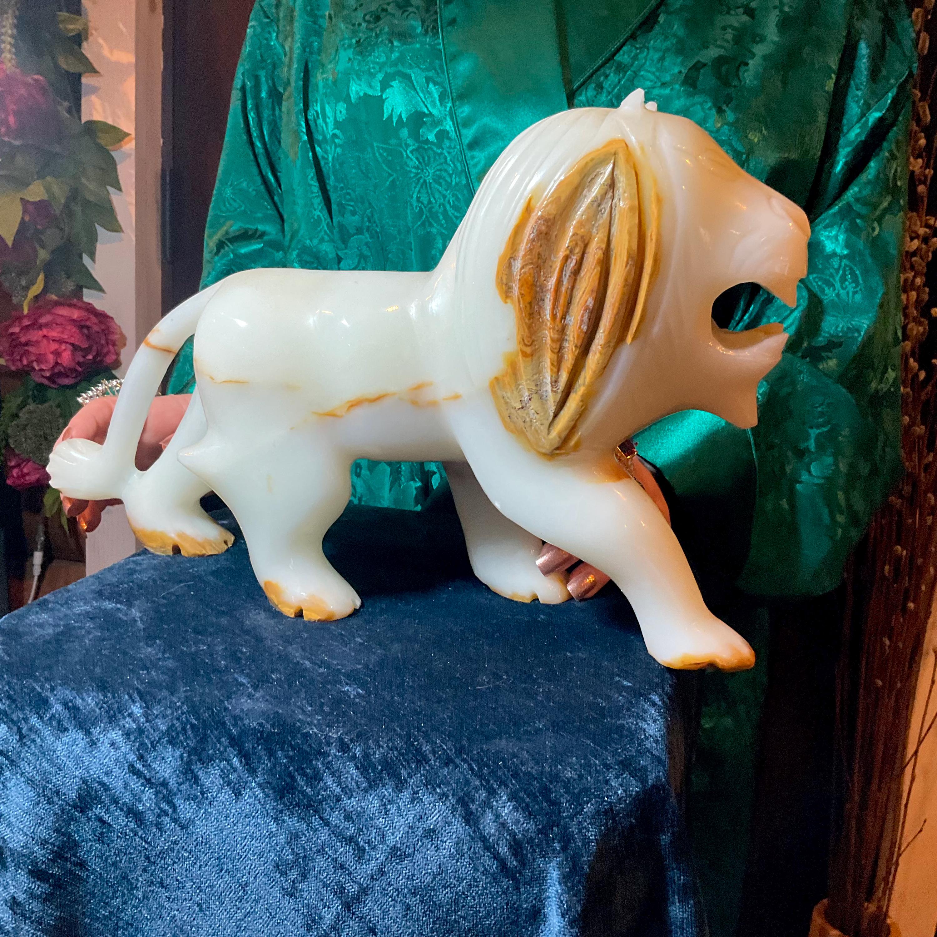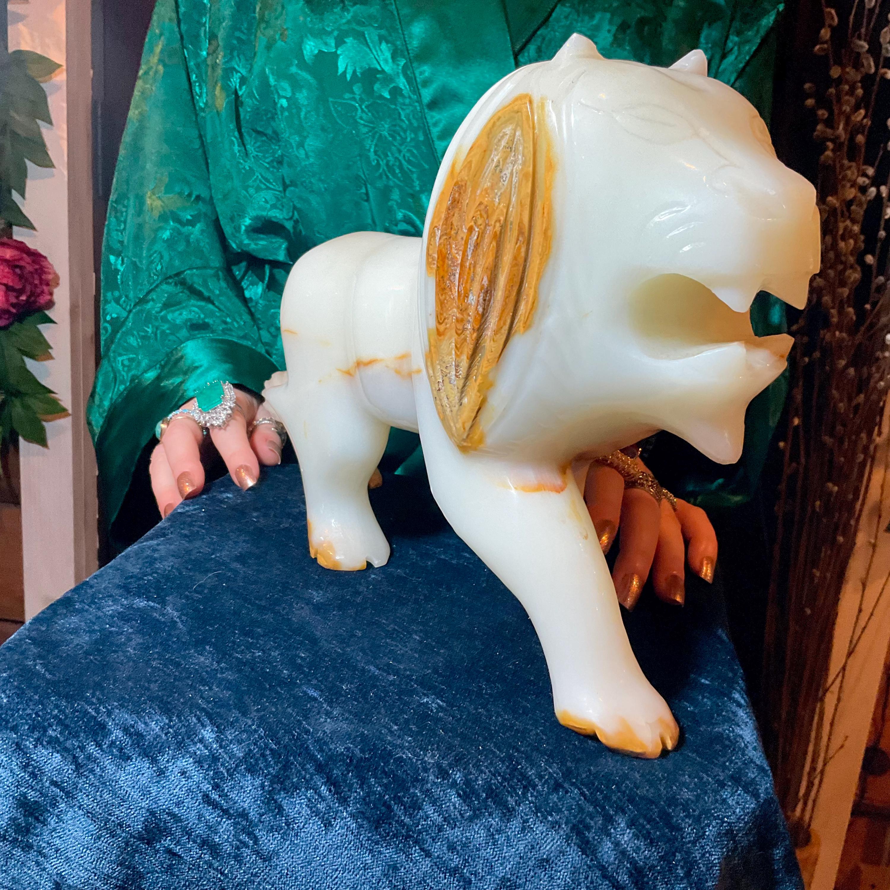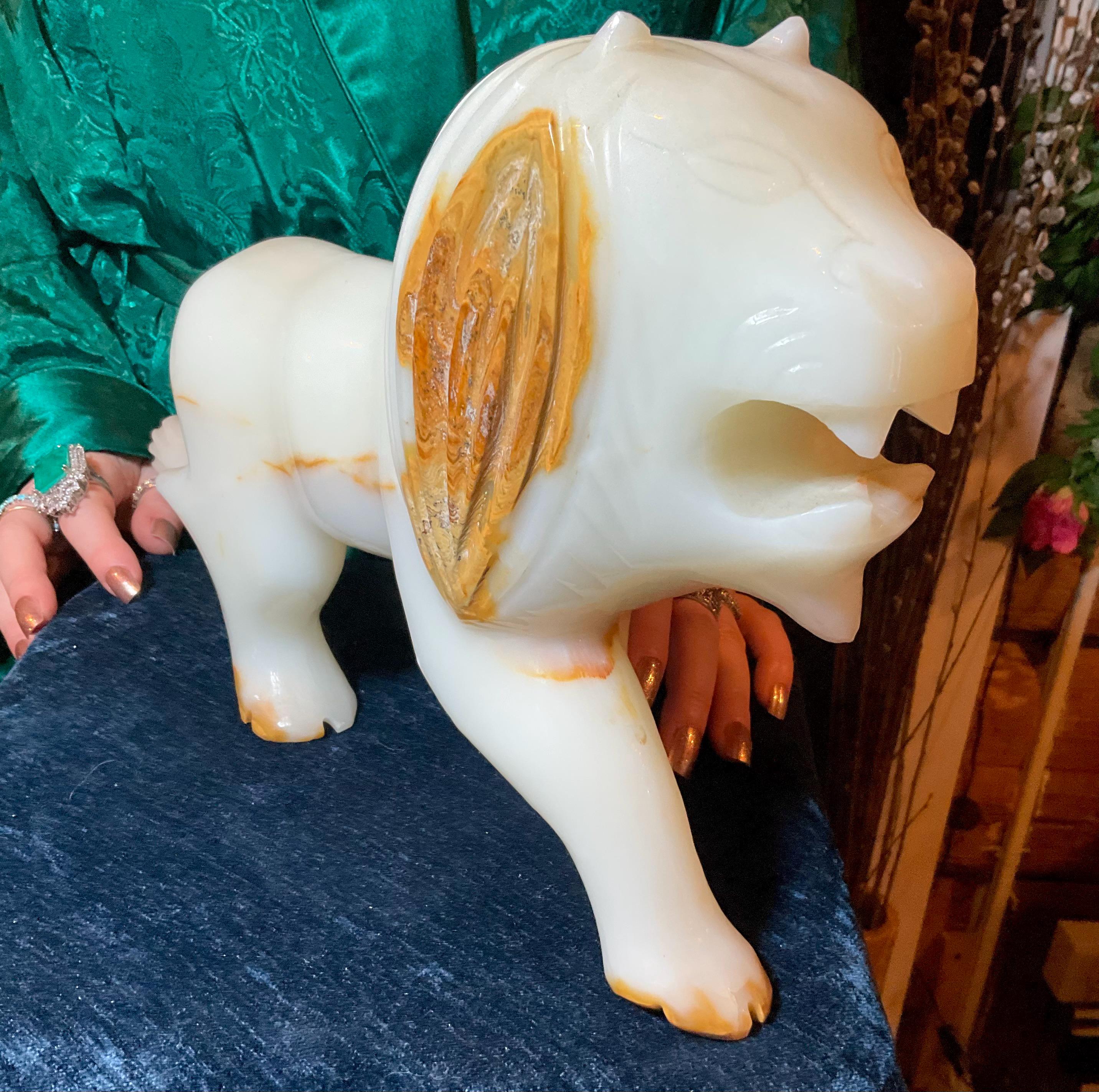 This is a one-of-a-kind carved White and gold Onyx lion.