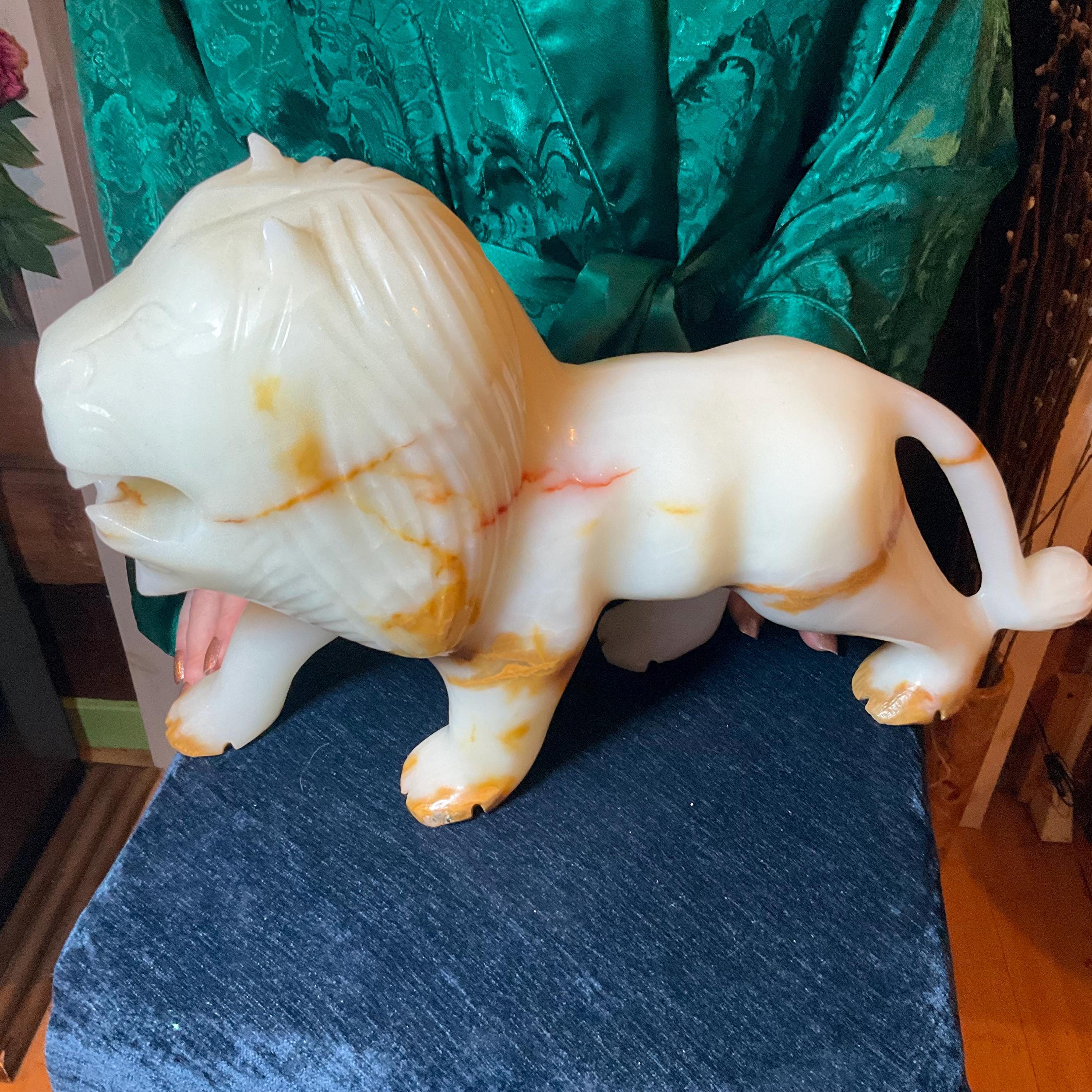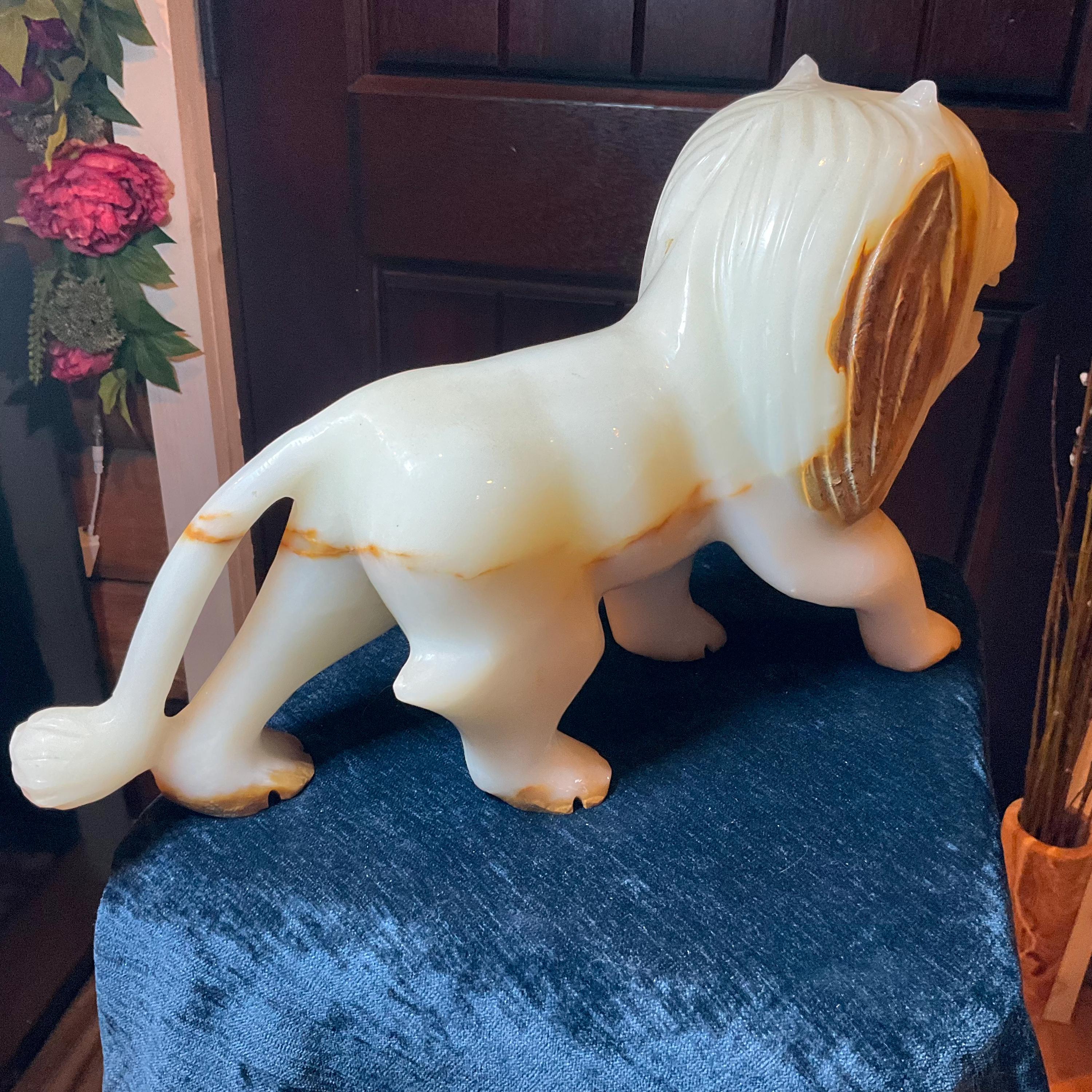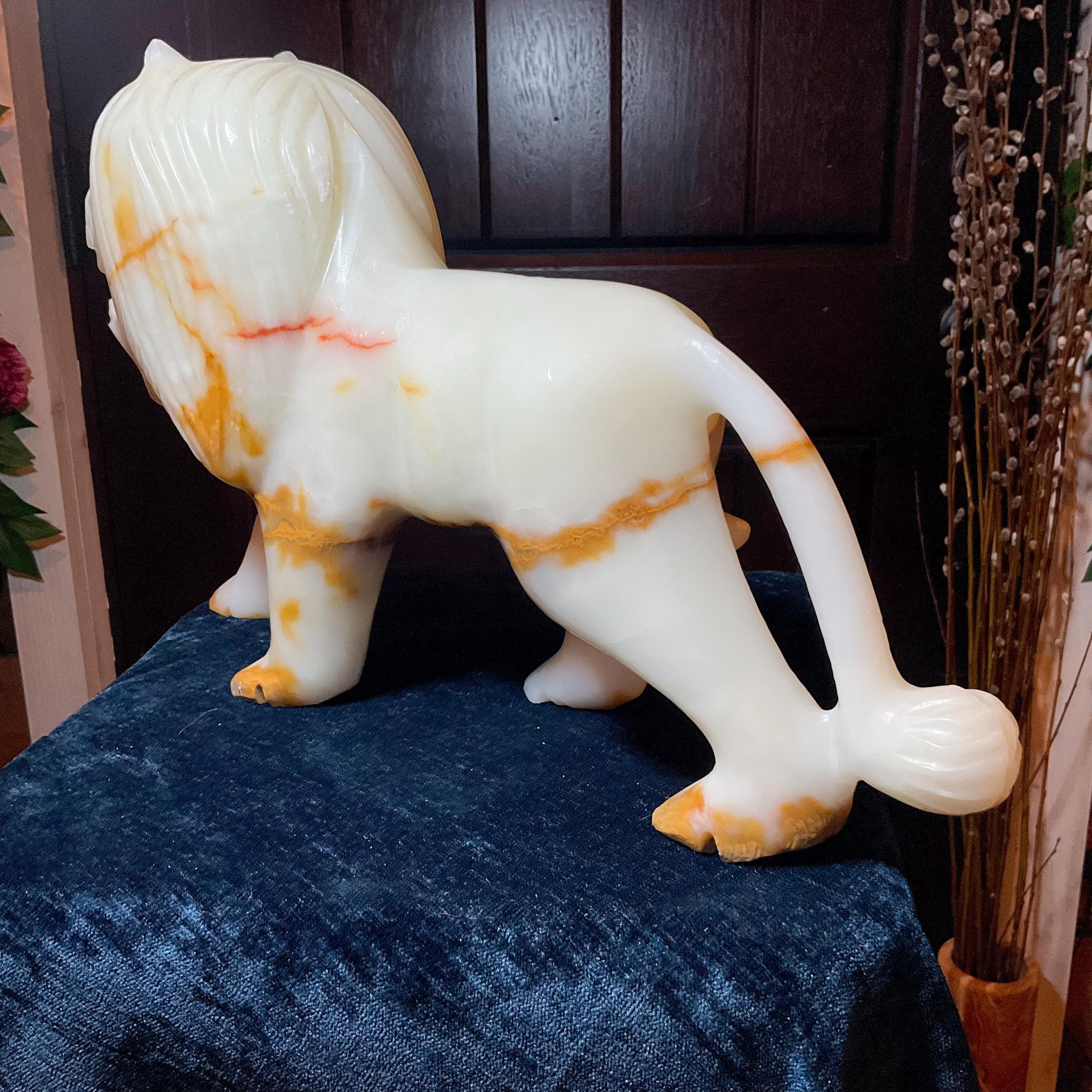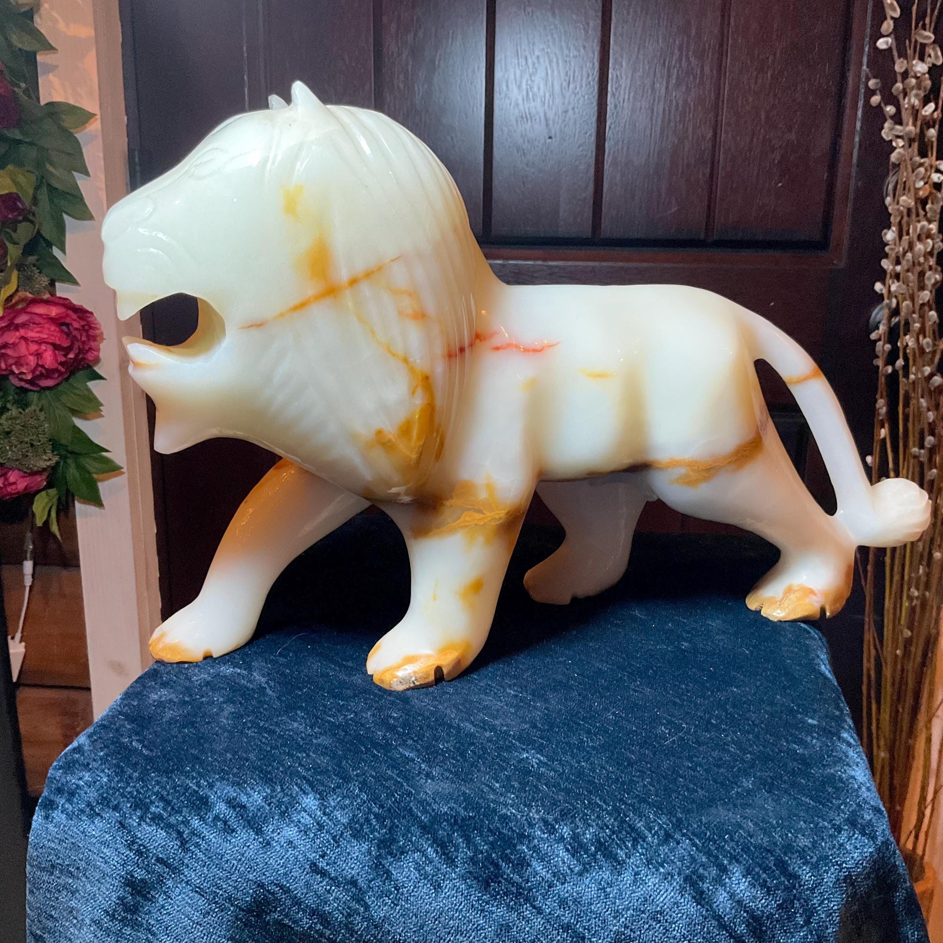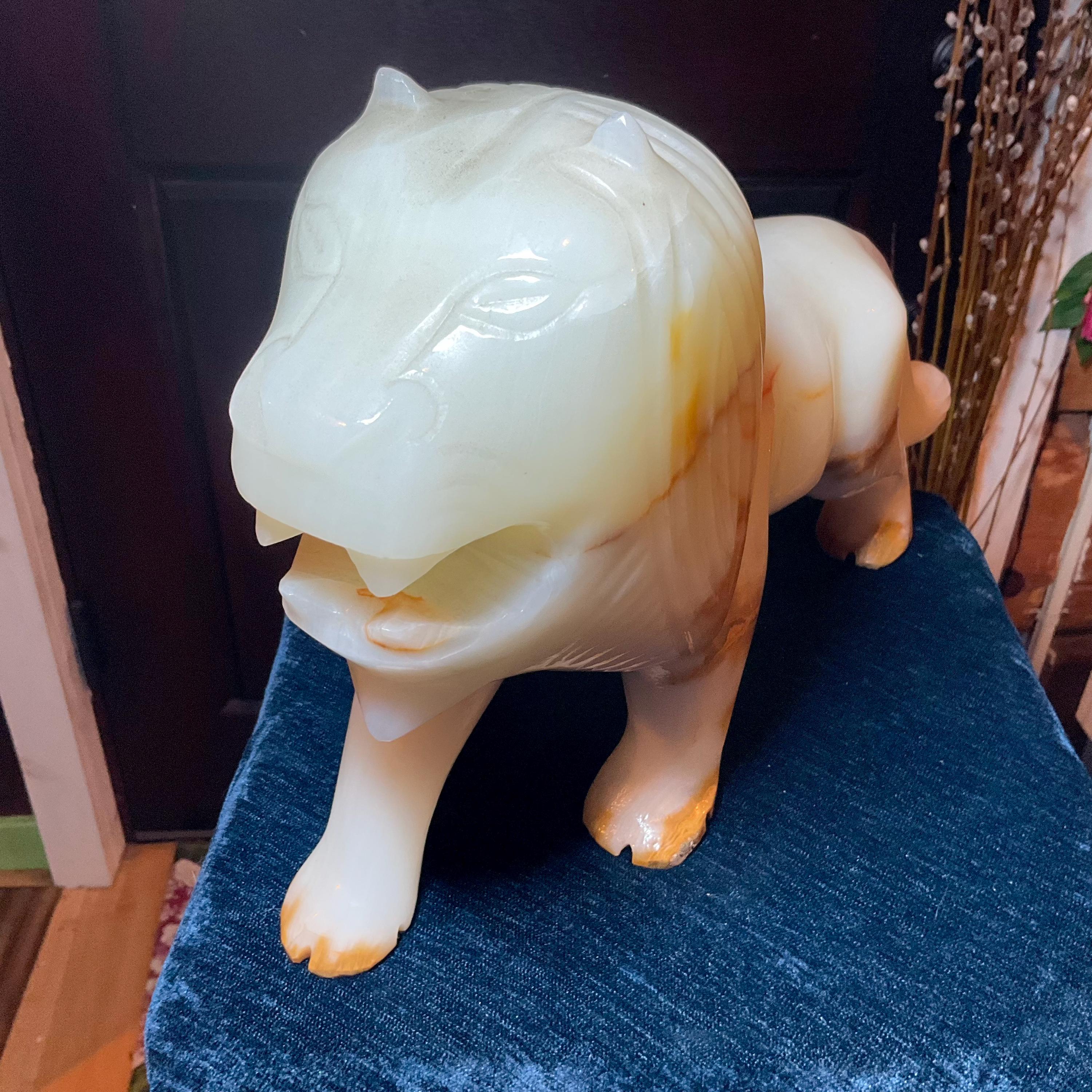 This is a one-of-a-kind carved White and gold Onyx lion.
