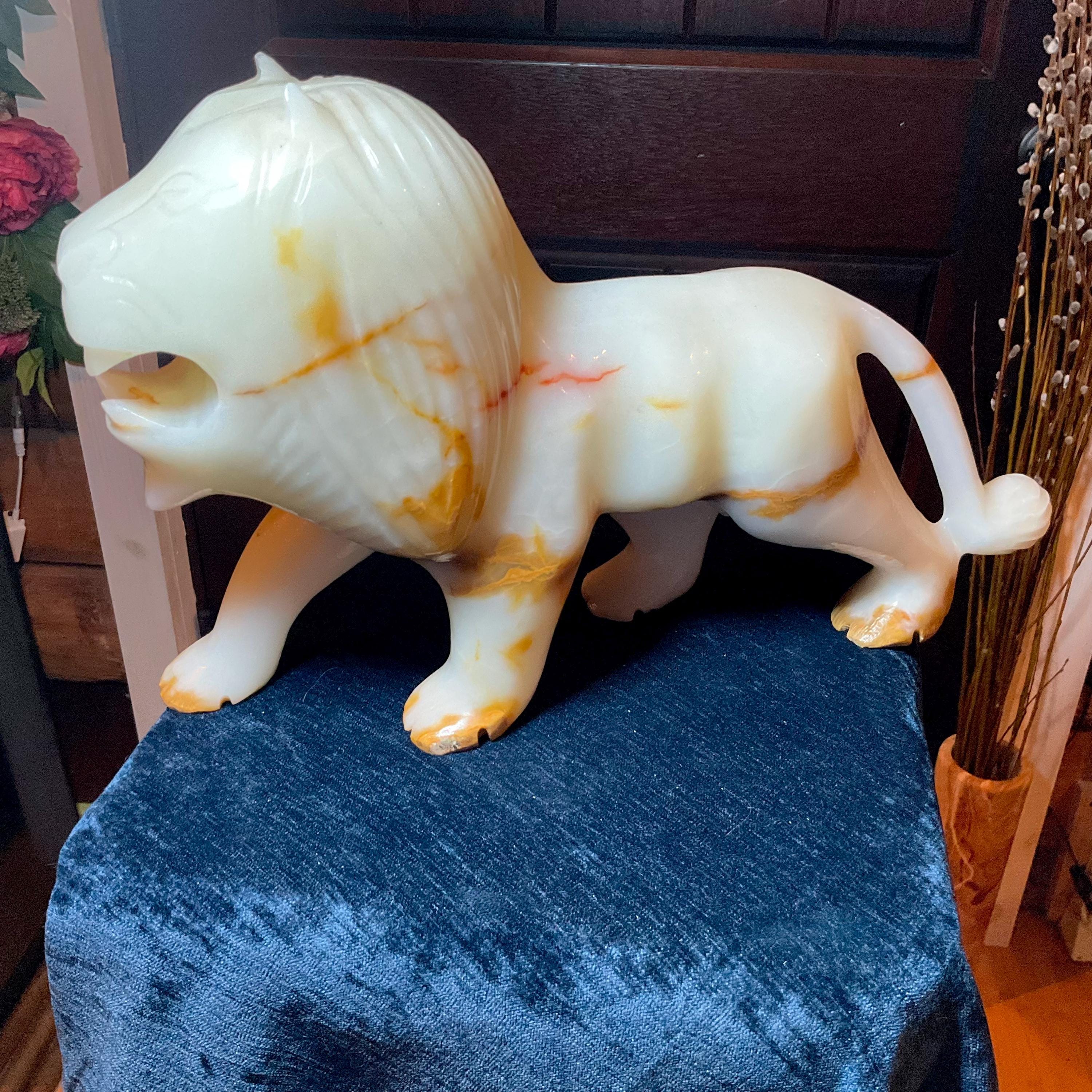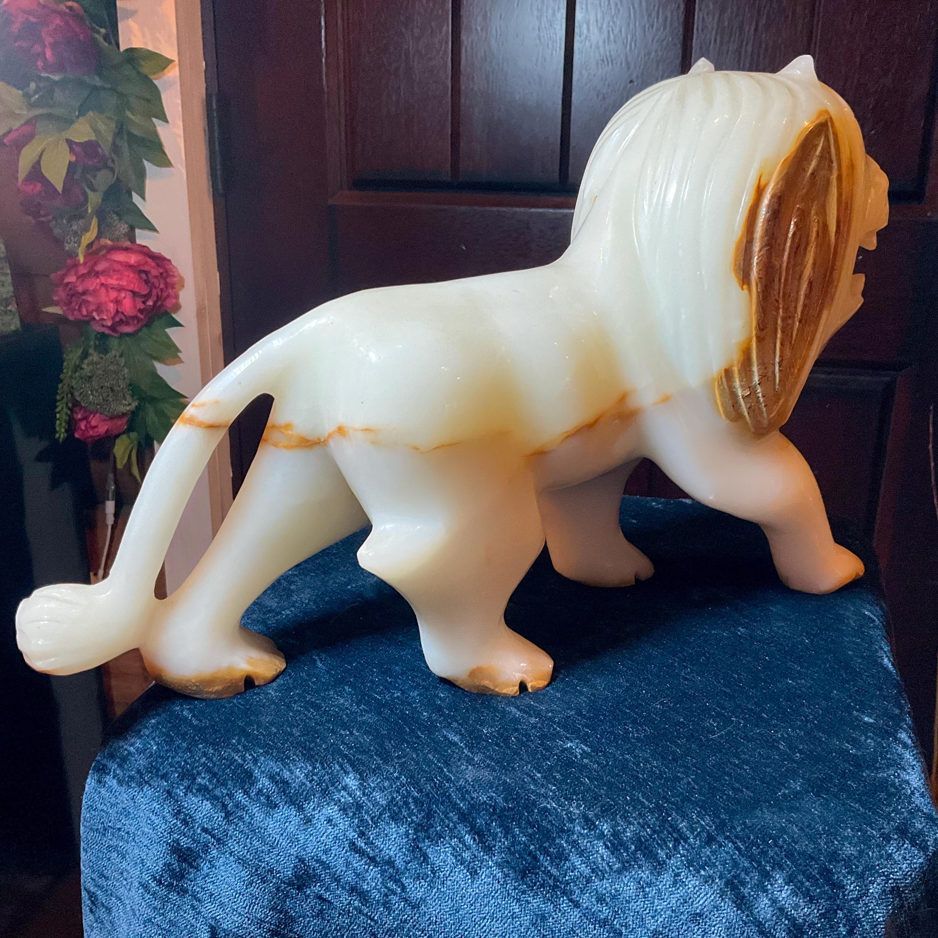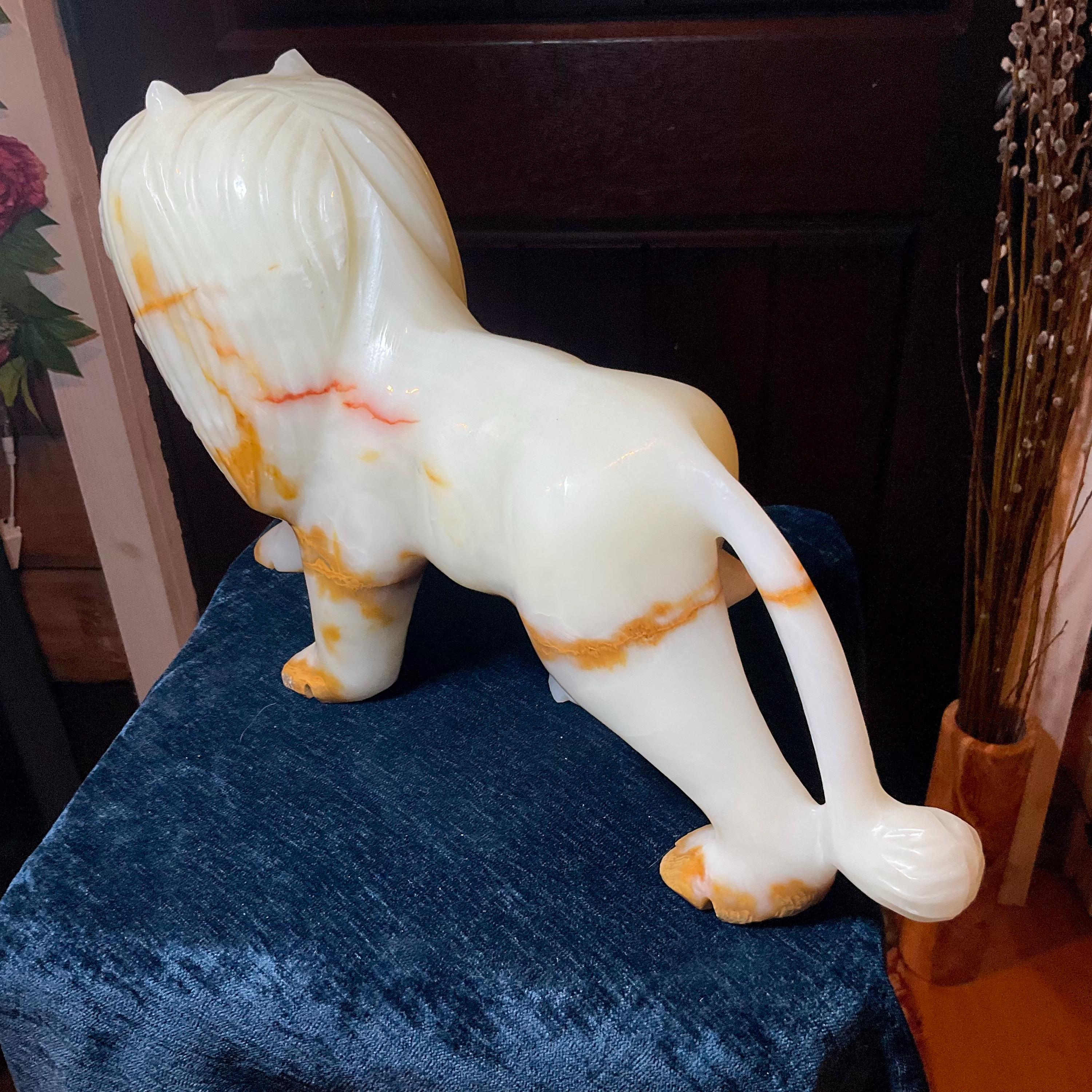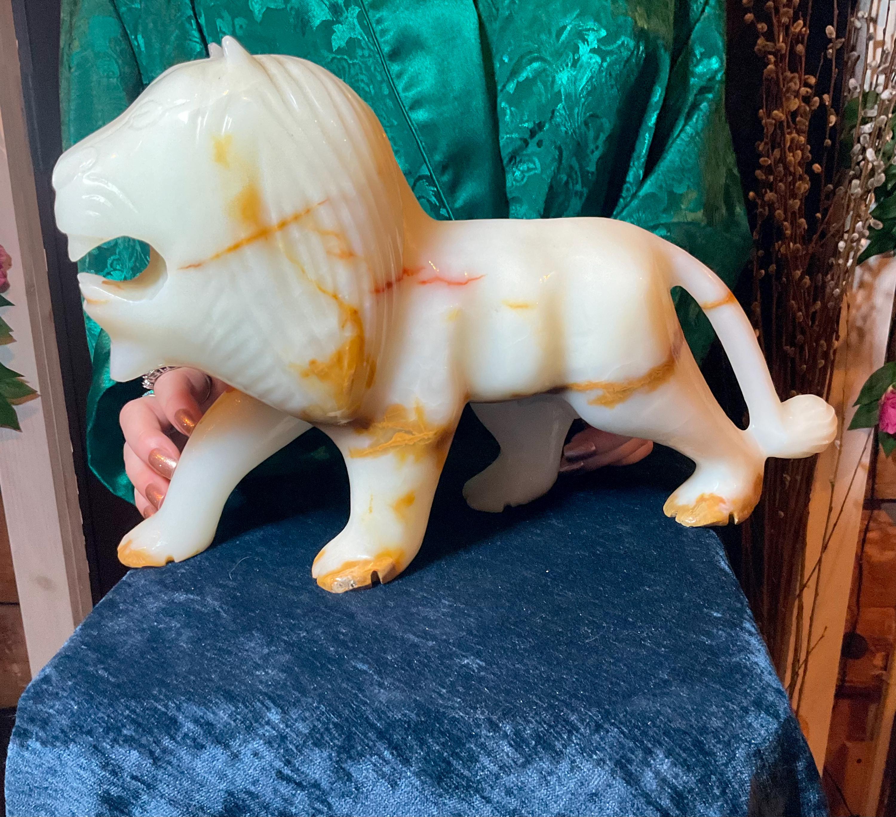 This is a one-of-a-kind carved White and gold Onyx lion.