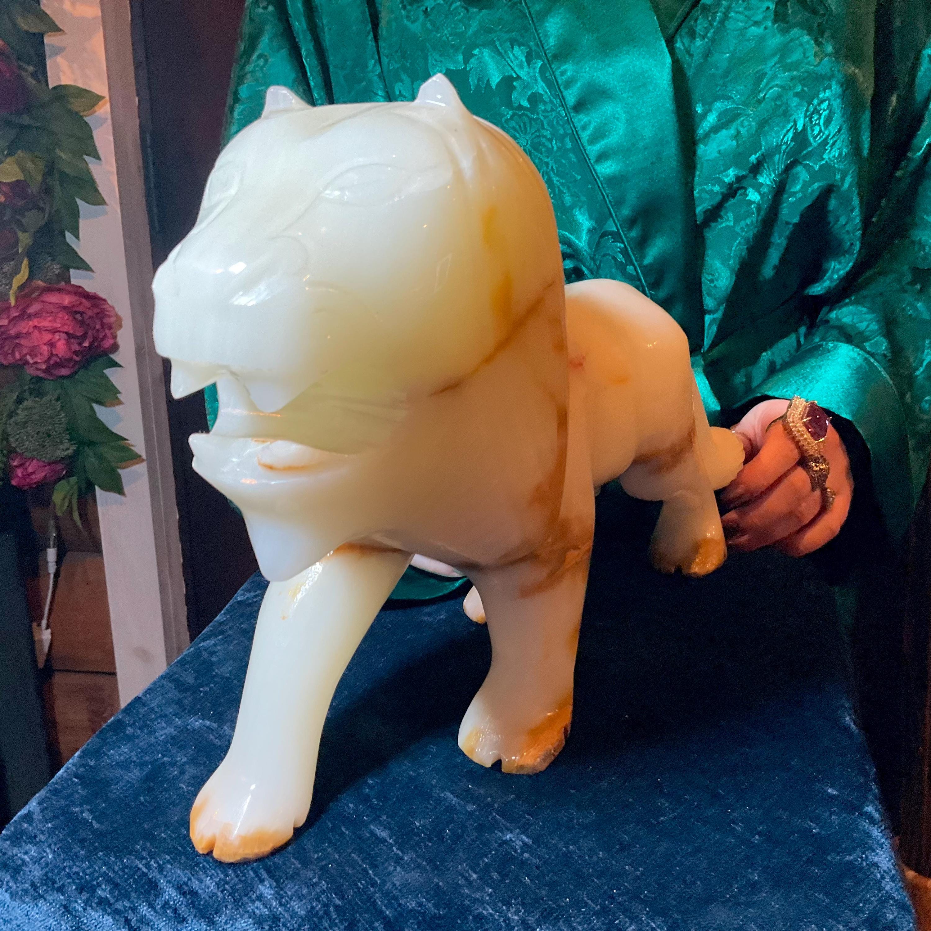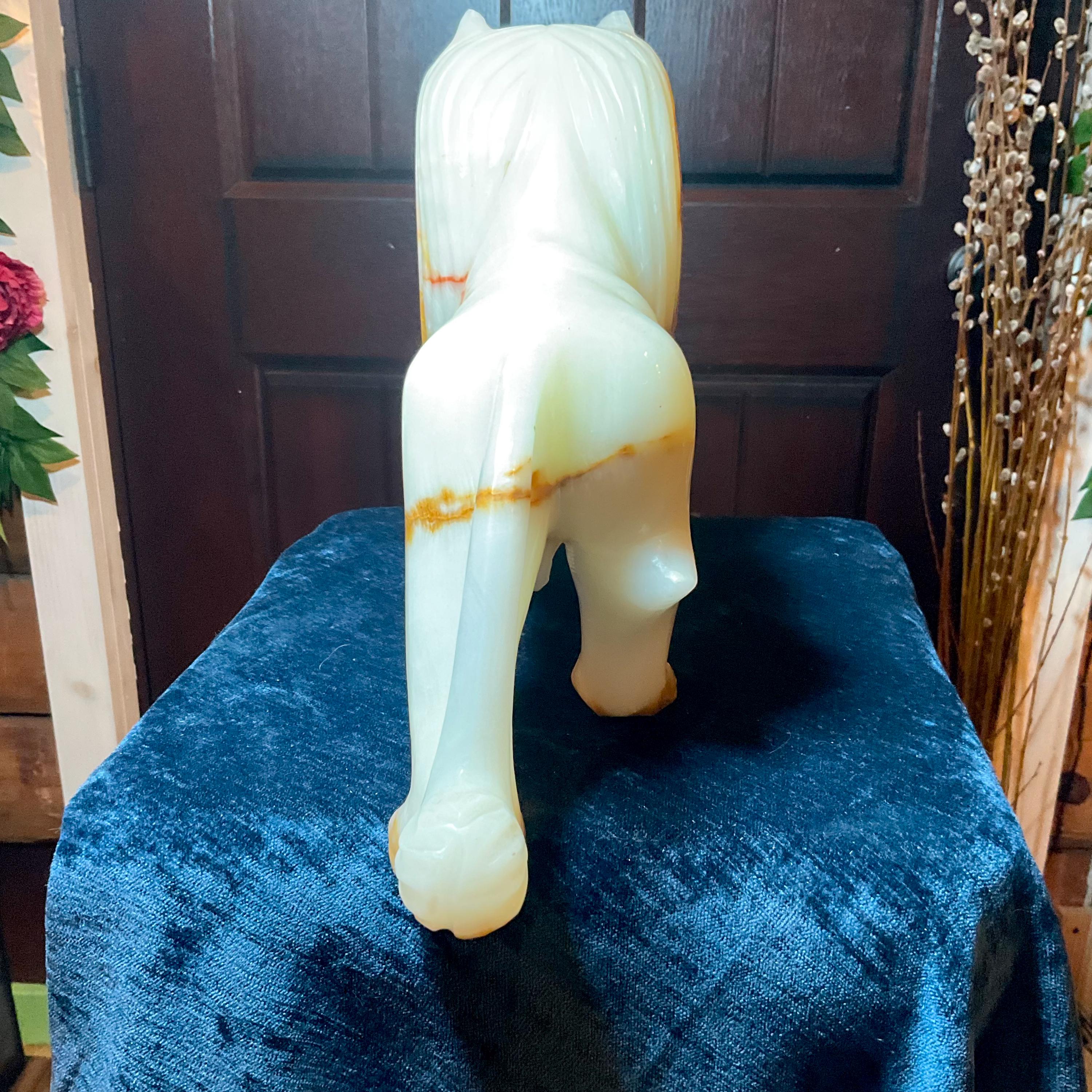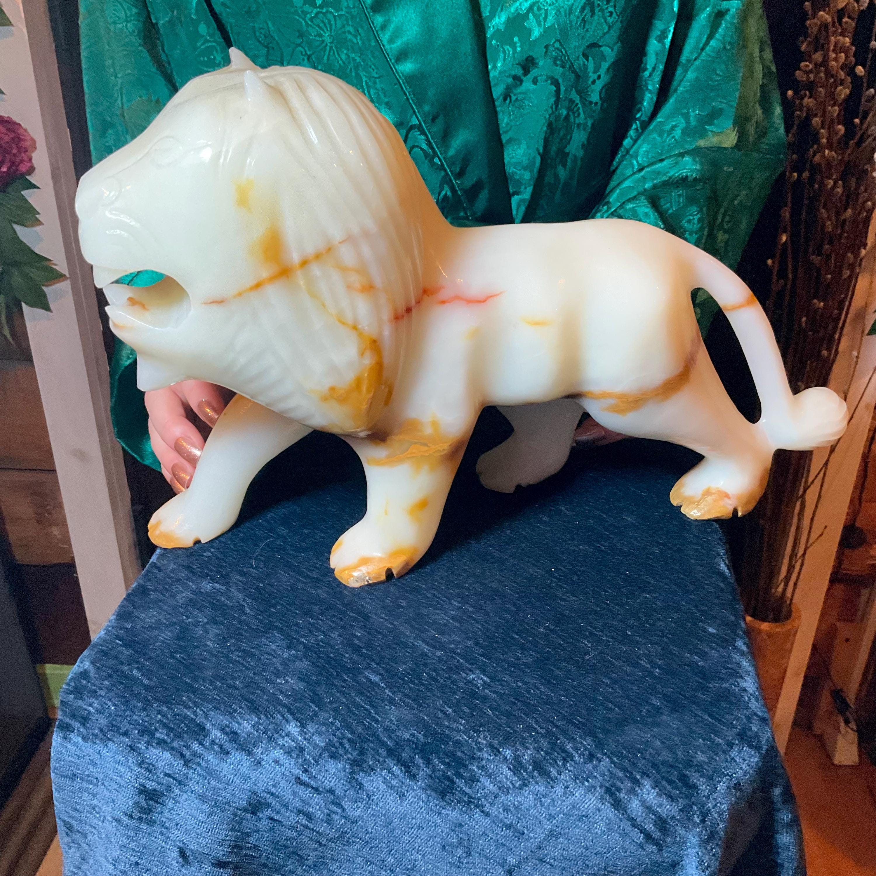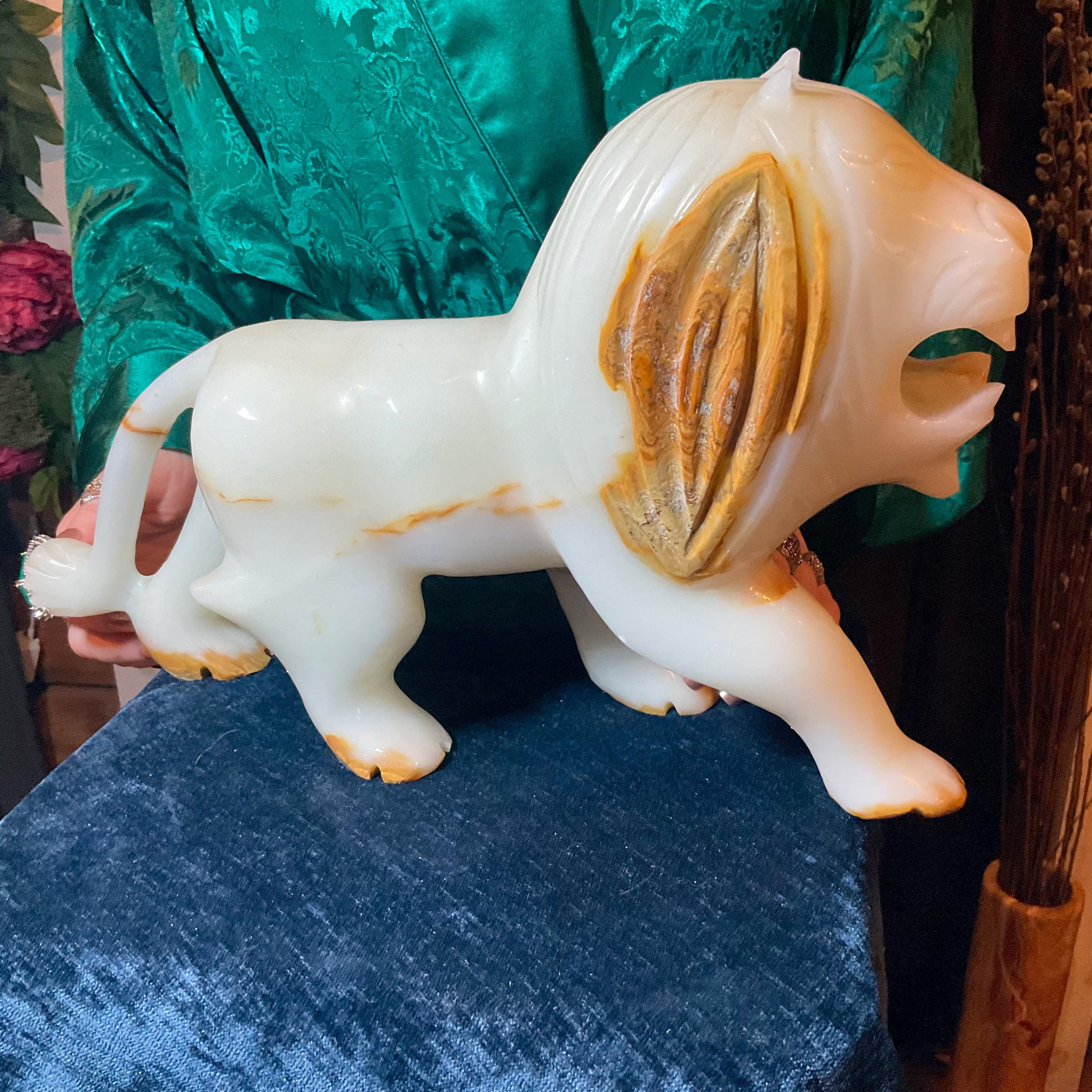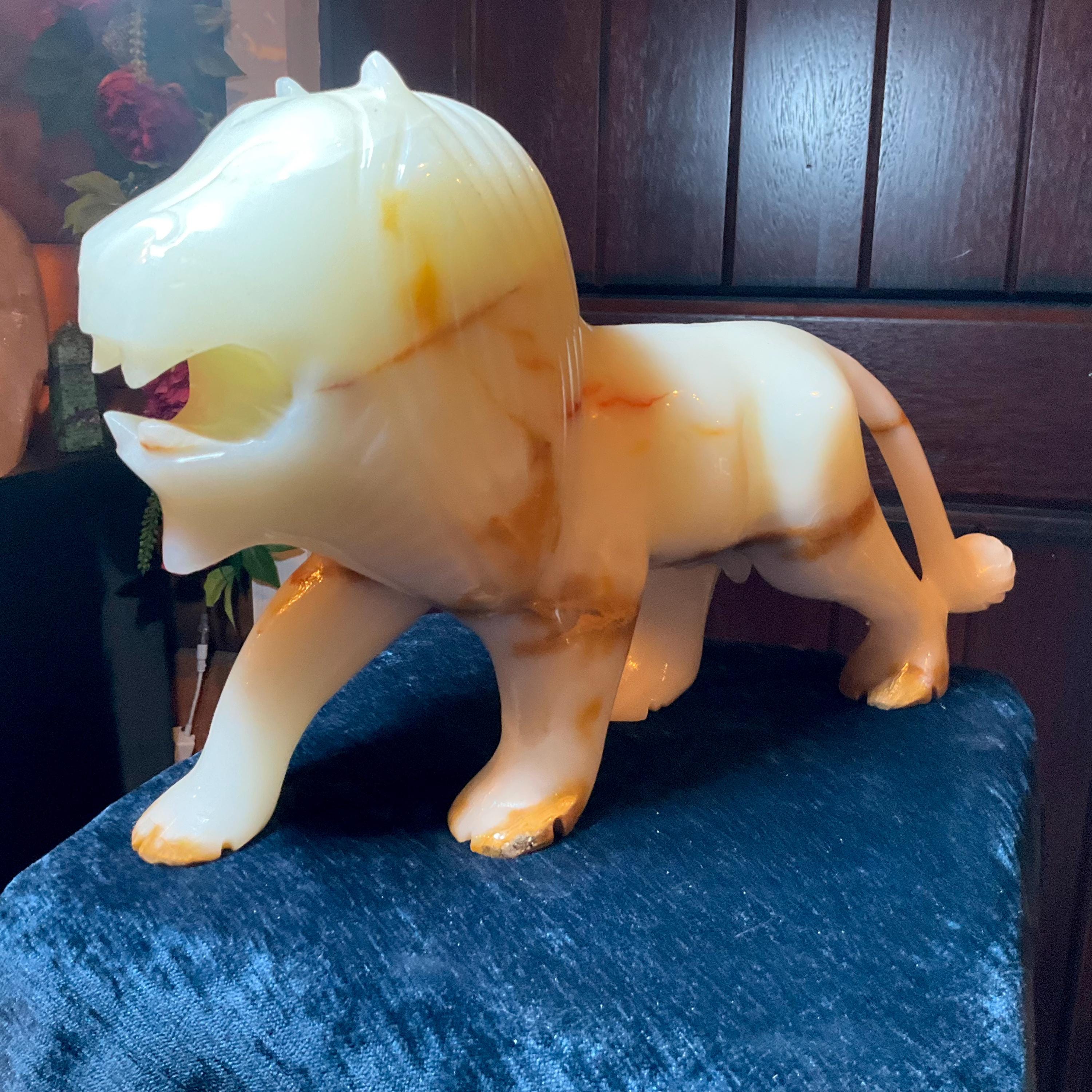 This is a one-of-a-kind carved White and gold Onyx lion.