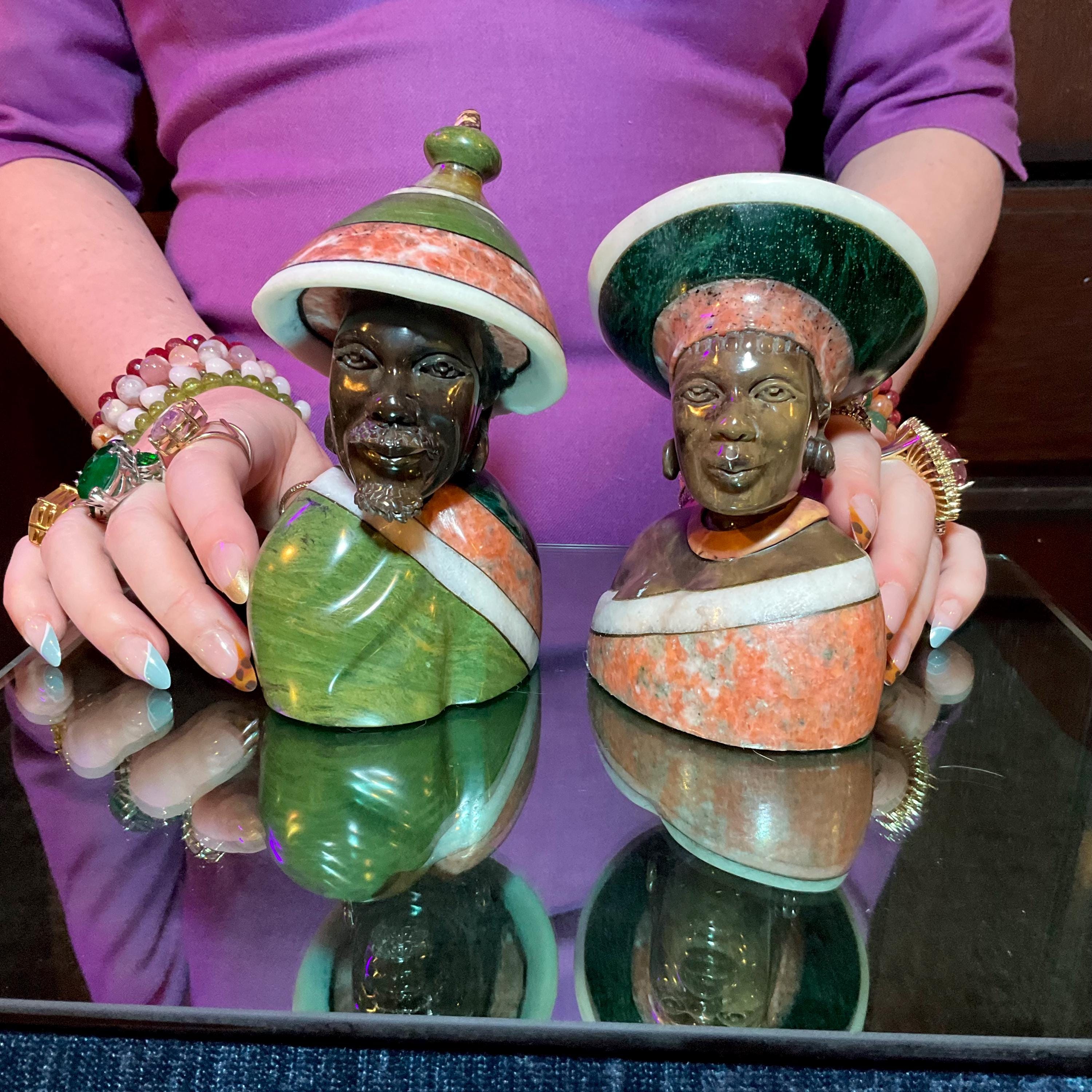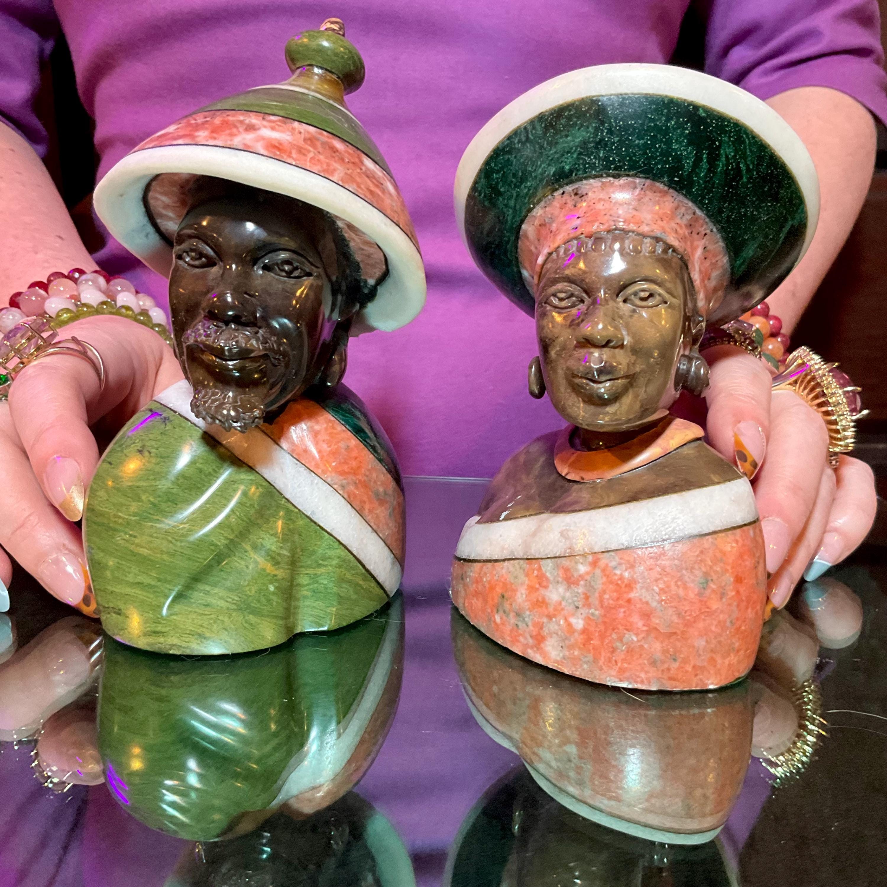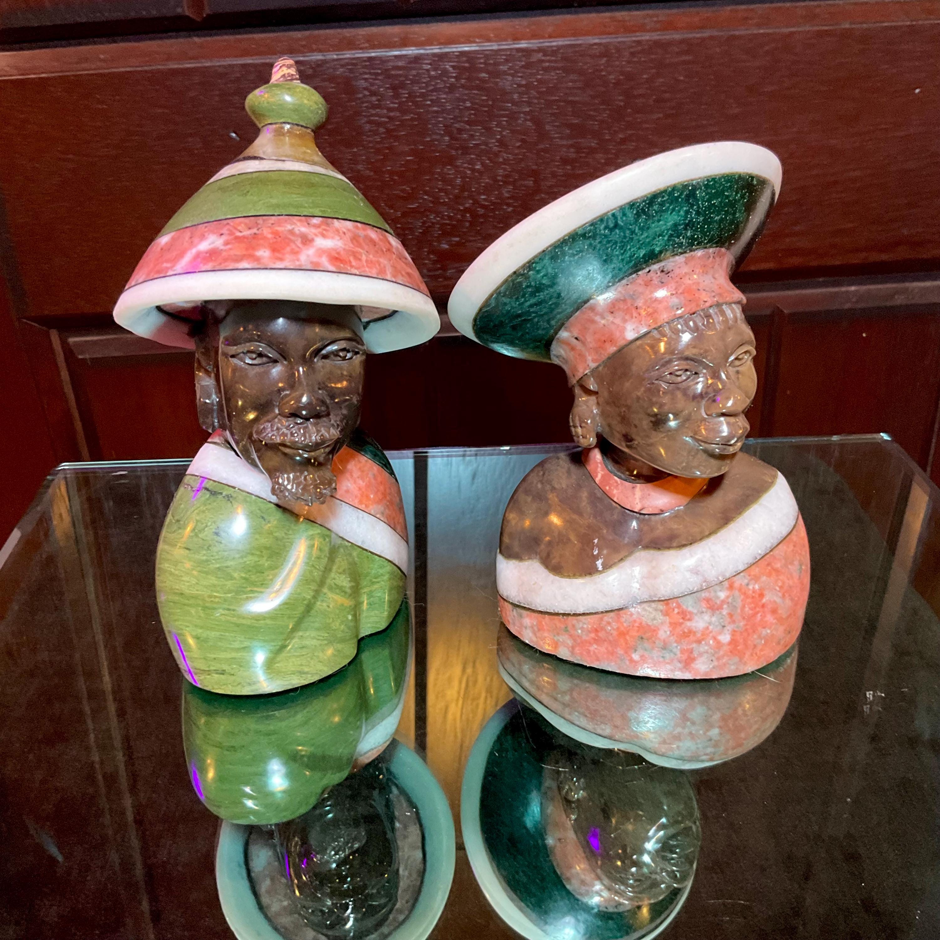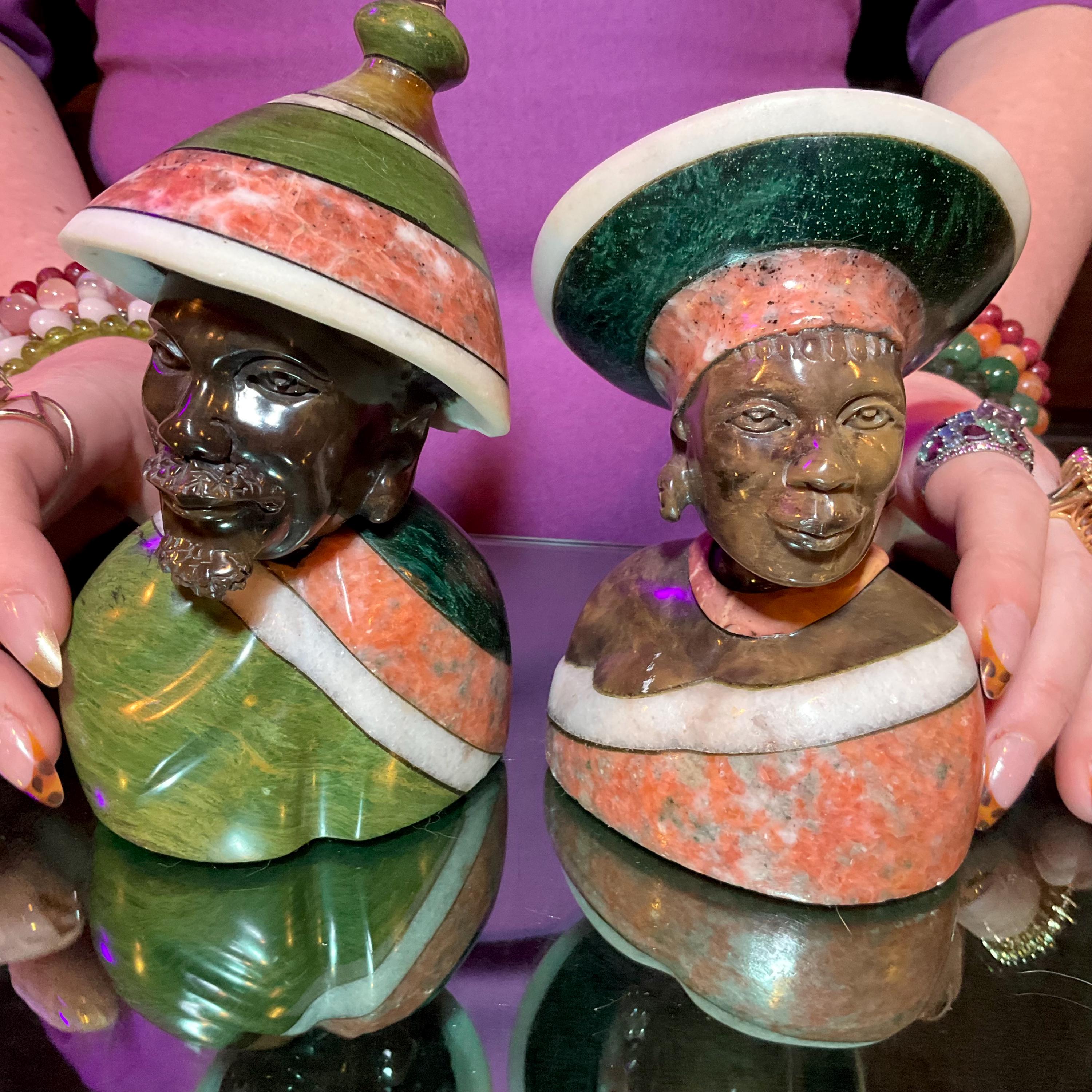 Vintage Serpentine Hand Carved Zimbabwean Couple Sculpture ~ 5 1/2" Tall ~ Swirling Green, White, Red & Black Colors~ Museum Quality