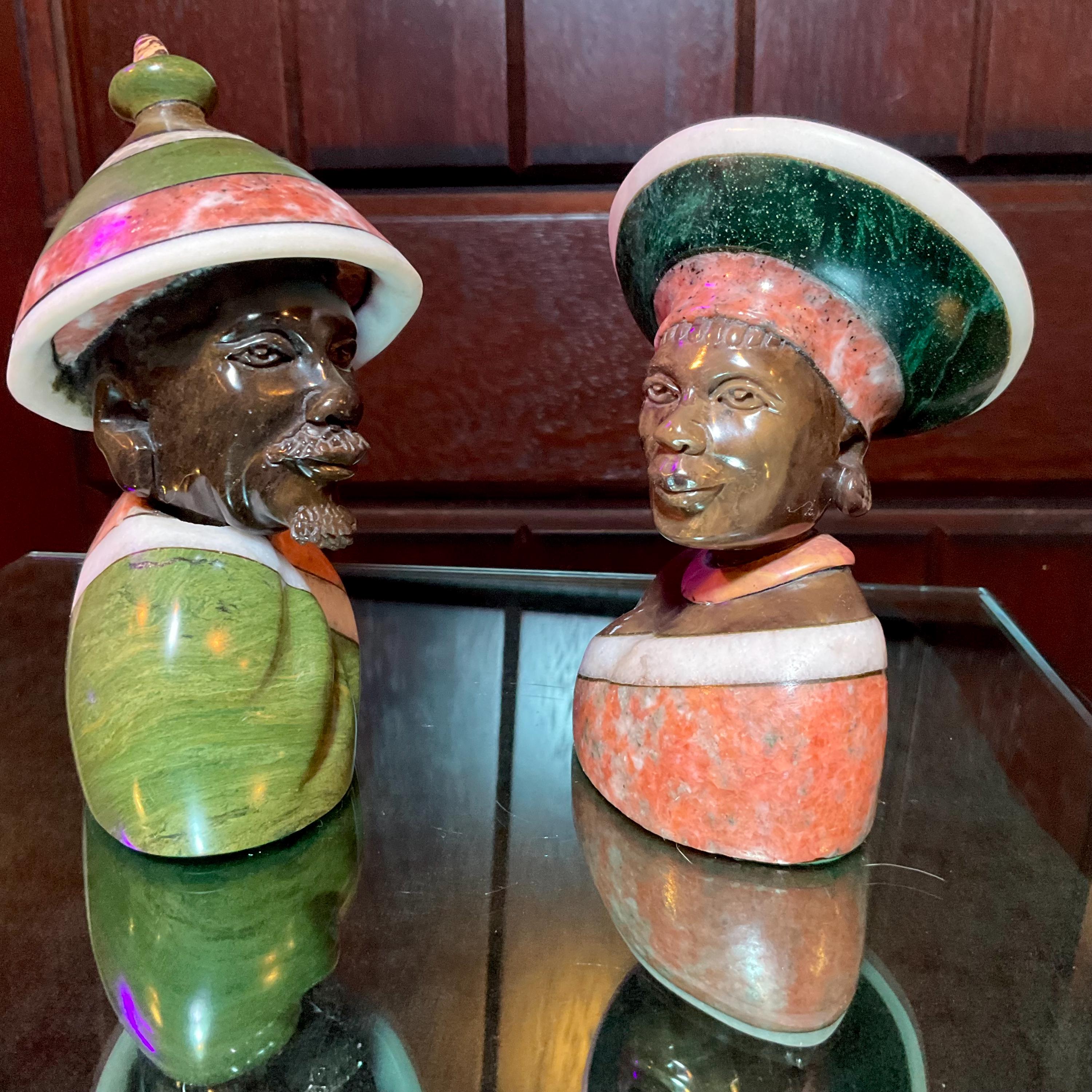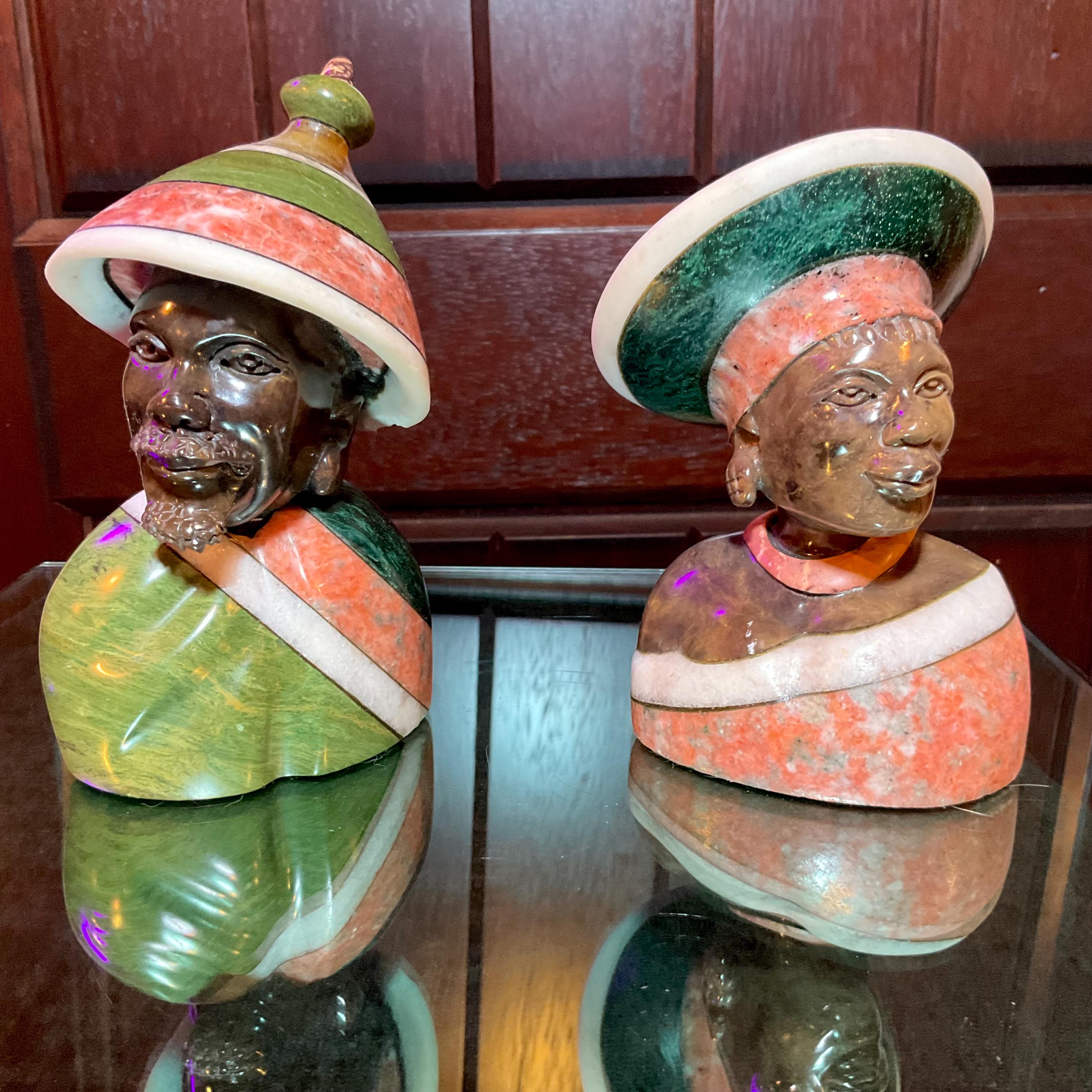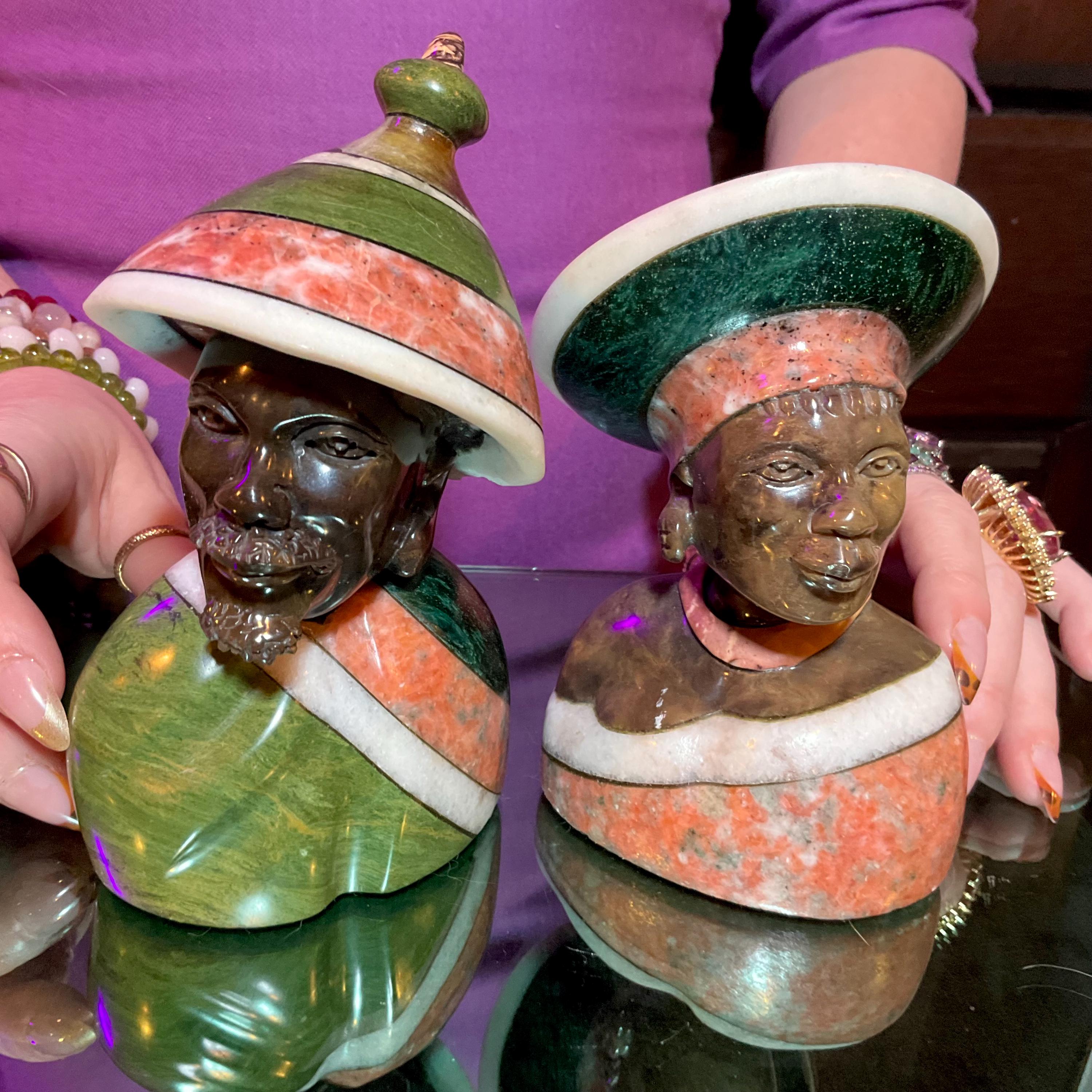 Vintage Serpentine Hand Carved Zimbabwean Couple Sculpture ~ 5 1/2" Tall ~ Swirling Green, White, Red & Black Colors~ Museum Quality