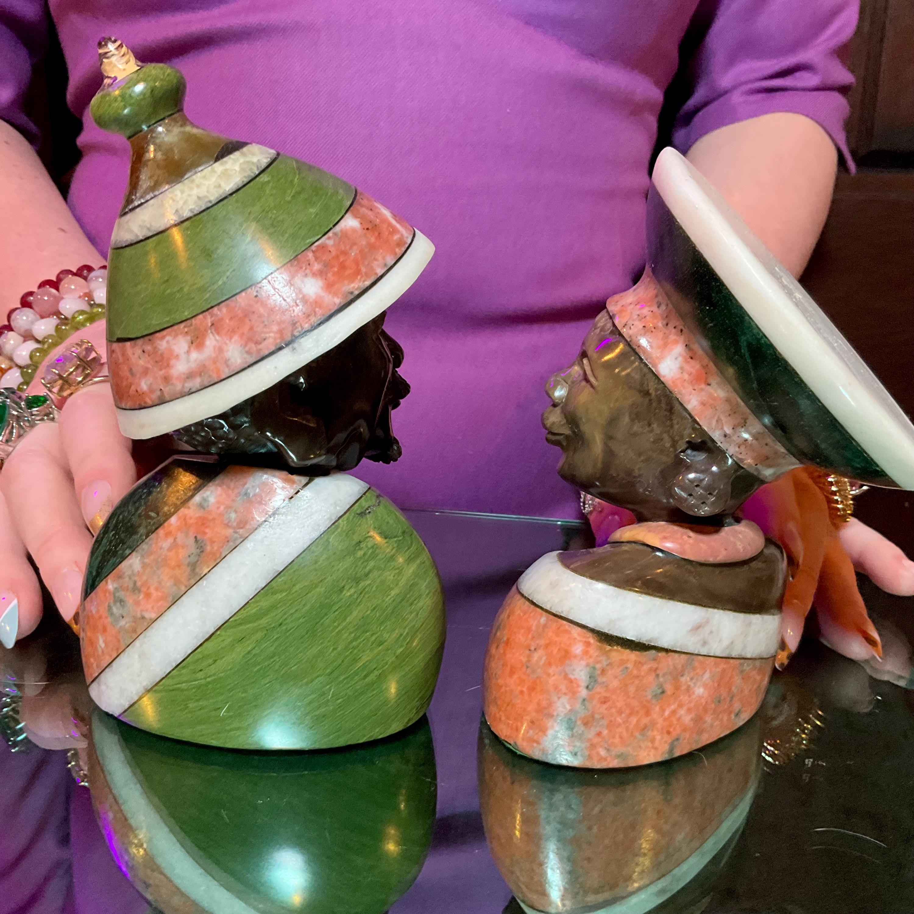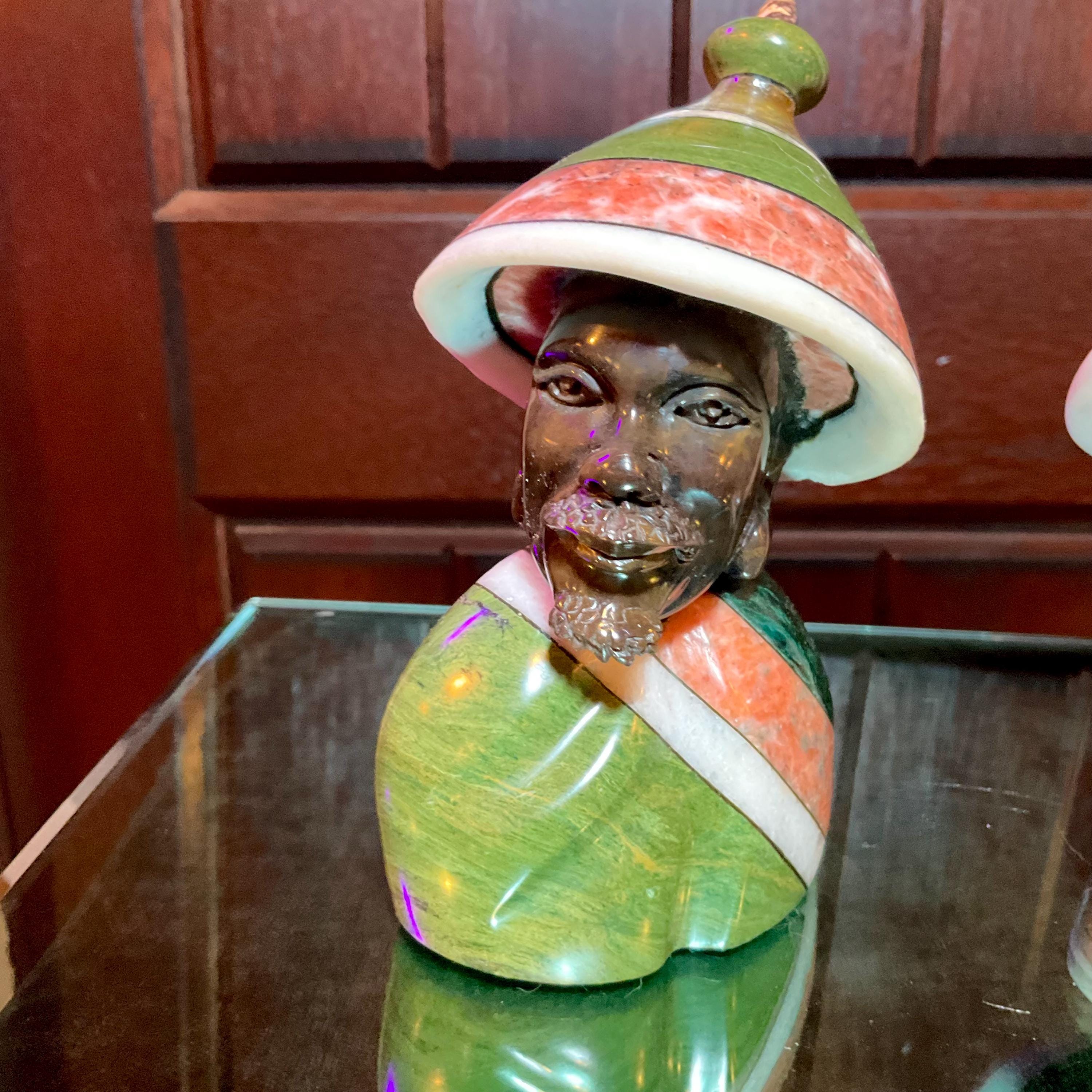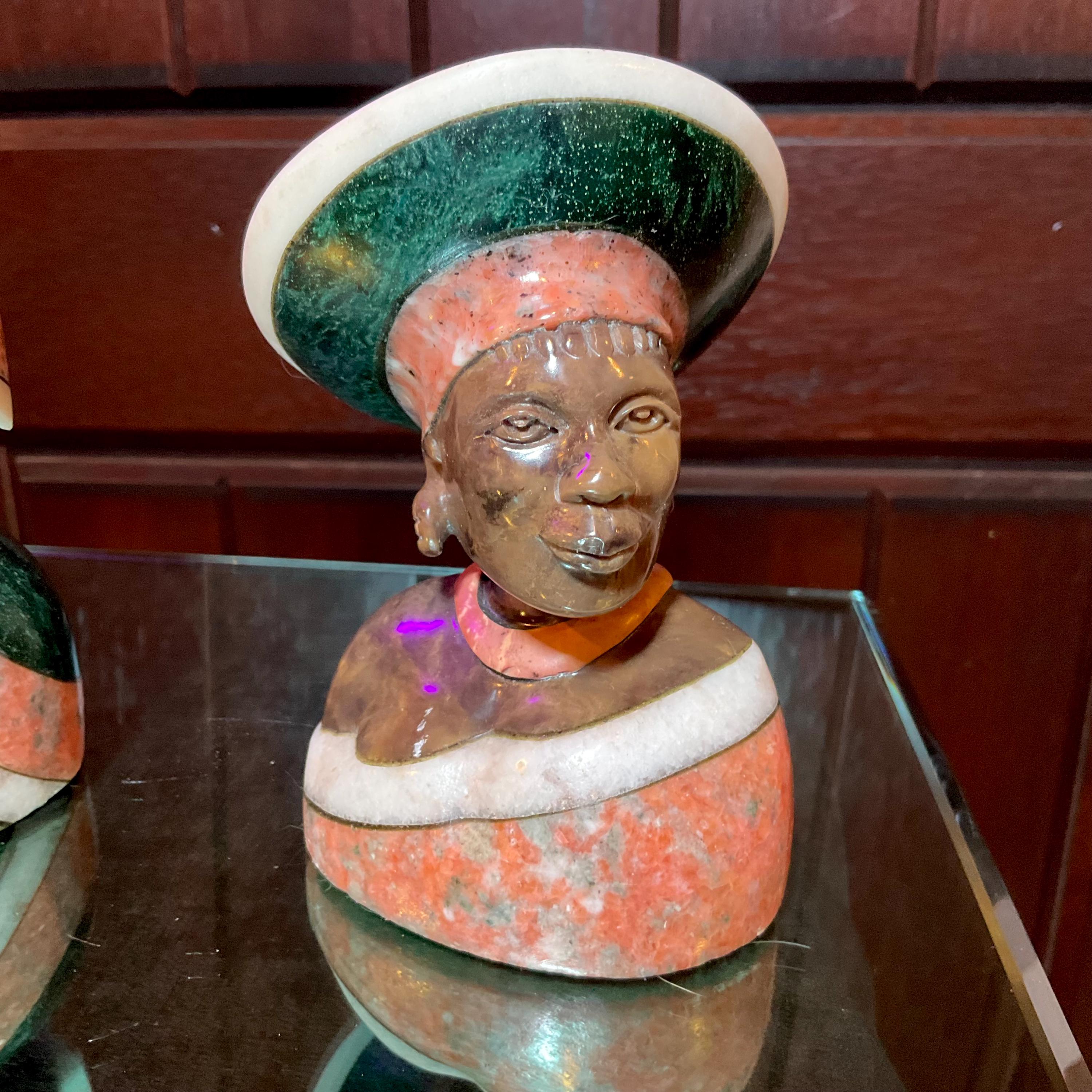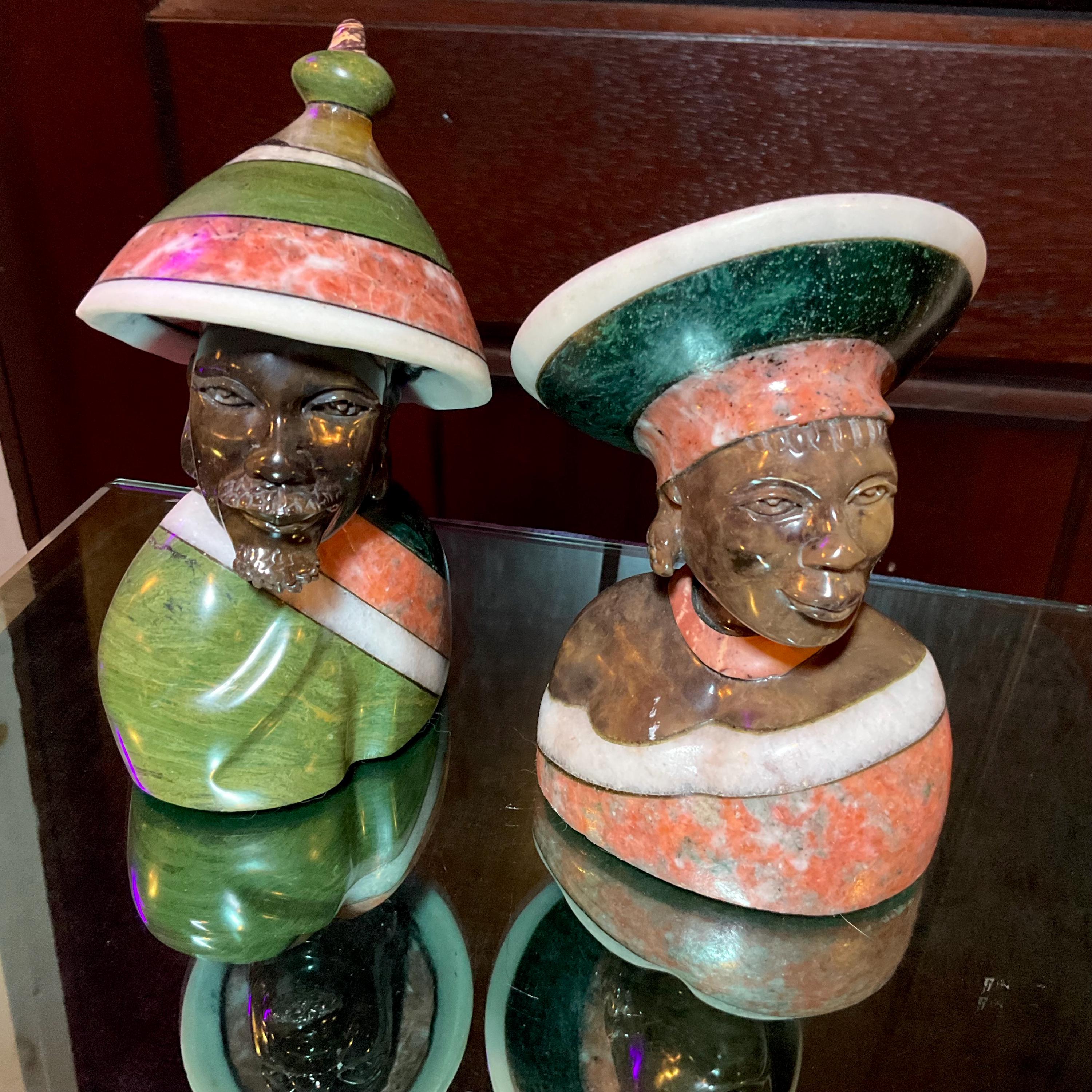 Vintage Serpentine Hand Carved Zimbabwean Couple Sculpture ~ 5 1/2" Tall ~ Swirling Green, White, Red & Black Colors~ Museum Quality