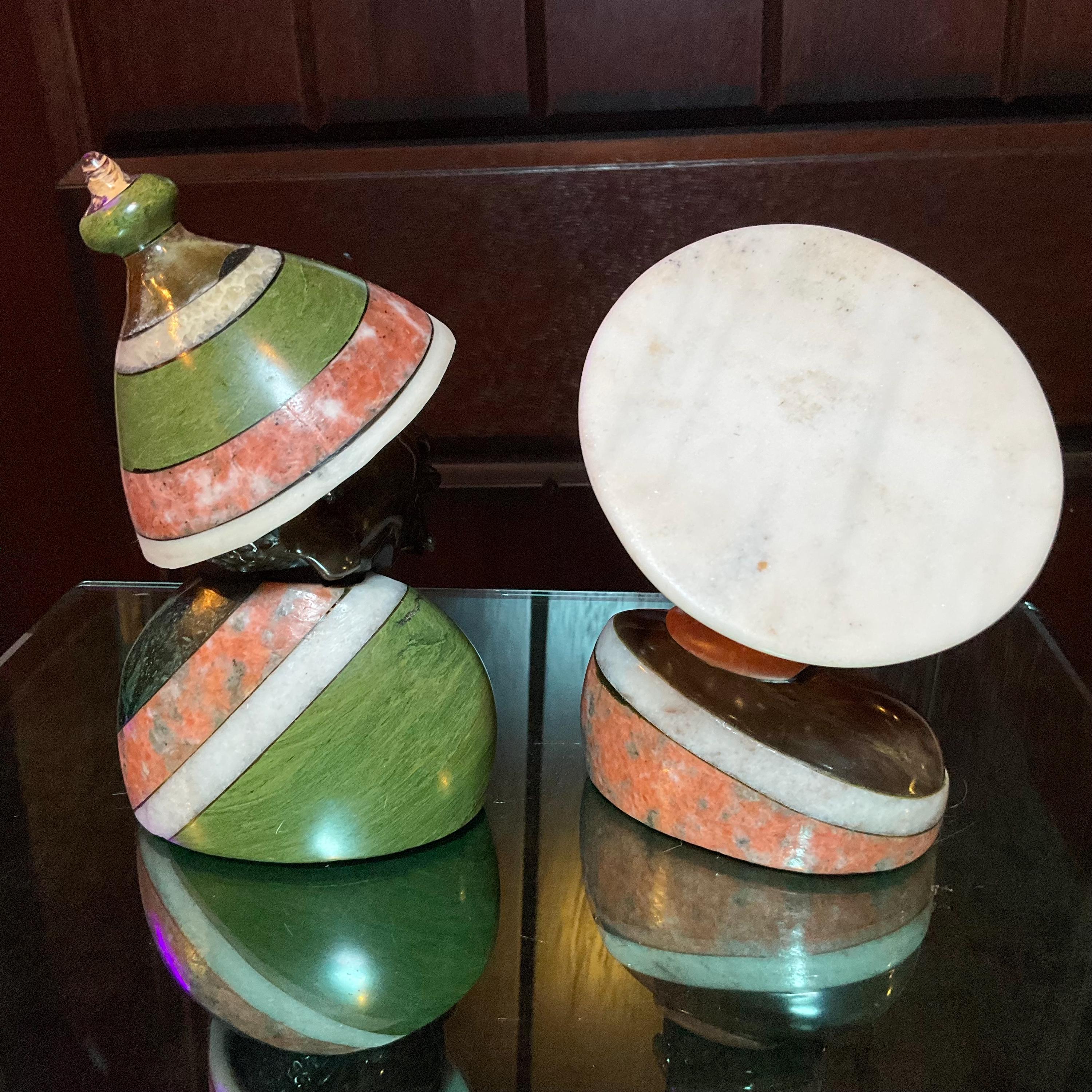 The beautifully layered stones are green Serpentine, orange Apatite, white Quartz Verdite and white Onyx so perfectly blended only a skilled Zimbabwean sculptor could create.